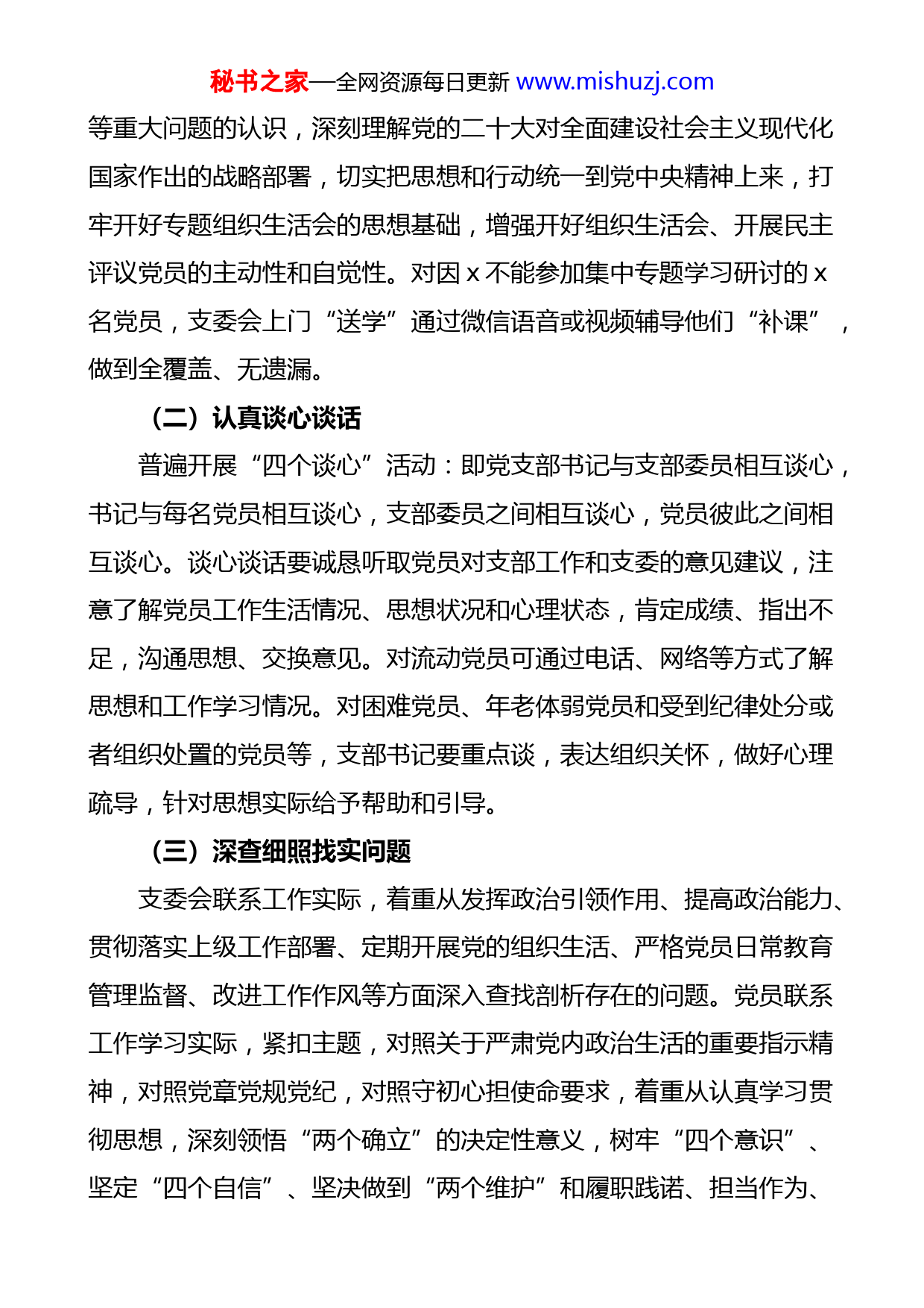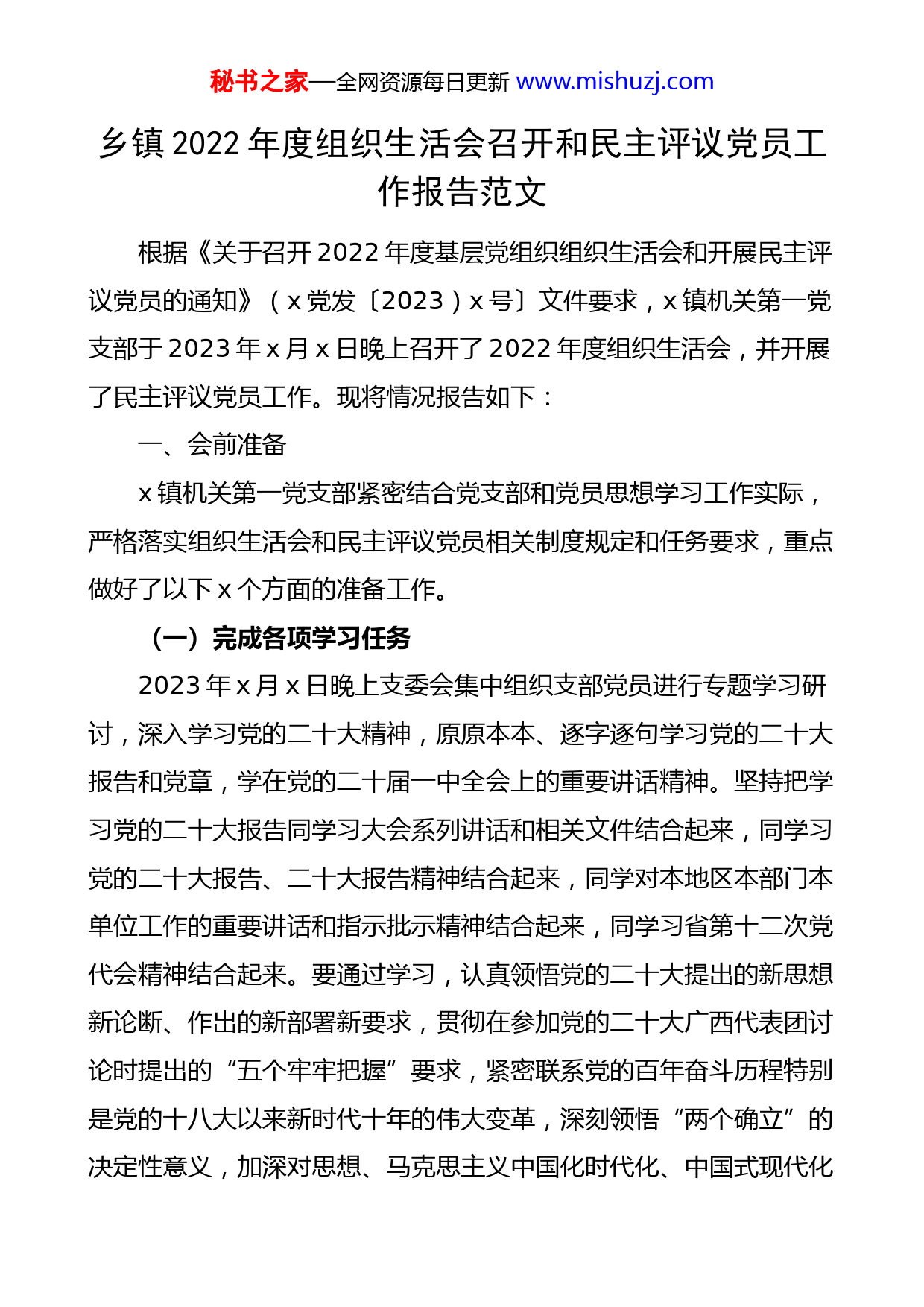 秘书之家—全网资源每日更新www.mishuzj.com乡镇2022年度组织生活会召开和民主评议党员工作报告范文根据《关于召开2022年度基层党组织组织生活会和开展民主评议党员的通知》(x党发〔2023)x号〕文件要求,x镇机关第一党支部于2023年x月x日晚上召开了2022年度组织生活会,并开展了民主评议党员工作。现将情况报告如下:一、会前准备x镇机关第一党支部紧密结合党支部和党员思想学习工作实际,严格落实组织生活会和民主评议党员相关制度规定和任务要求,重点做好了以下x个方面的准备工作。(一)完成各项学习任务2023年x月x日晚上支委会集中组织支部党员进行专题学习研讨,深入学习党的二十大精神,原原本本、逐字逐句学习党的二十大报告和党章,学在党的二十届一中全会上的重要讲话精神。坚持把学习党的二十大报告同学习大会系列讲话和相关文件结合起来,同学习党的二十大报告、二十大报告精神结合起来,同学对本地区本部门本单位工作的重要讲话和指示批示精神结合起来,同学习省第十二次党代会精神结合起来。要通过学习,认真领悟党的二十大提出的新思想新论断、作出的新部署新要求,贯彻在参加党的二十大广西代表团讨论时提出的“五个牢牢把握”要求,紧密联系党的百年奋斗历程特别是党的十八大以来新时代十年的伟大变革,深刻领悟“两个确立”的决定性意义,加深对思想、马克思主义中国化时代化、中国式现代化秘书之家—全网资源每日更新www.mishuzj.com等重大问题的认识,深刻理解党的二十大对全面建设社会主义现代化国家作出的战略部署,切实把思想和行动统一到党中央精神上来,打牢开好专题组织生活会的思想基础,增强开好组织生活会、开展民主评议党员的主动性和自觉性。对因x不能参加集中专题学习研讨的x名党员,支委会上门“送学”通过微信语音或视频辅导他们“补课”,做到全覆盖、无遗漏。(二)认真谈心谈话普遍开展“四个谈心”活动:即党支部书记与支部委员相互谈心,书记与每名党员相互谈心,支部委员之间相互谈心,党员彼此之间相互谈心。谈心谈话要诚恳听取党员对支部工作和支委的意见建议,注意了解党员工作生活情况、思想状况和心理状态,肯定成绩、指出不足,沟通思想、交换意见。对流动党员可通过电话、网络等方式了解思想和工作学习情况。对困难党员、年老体弱党员和受到纪律处分或者组织处置的党员等,支部书记要重点谈,表达组织关怀,做好心理疏导,针对思想实际给予帮助和引导。(三)深查细照找实问题支委会联系工作实际,着重从发挥政治引领作用、提高政治能力、贯彻落实上级工作部署、定期开展党的组织生活、严格党员日常教育管理监督、改进工作作风等方面深入查找剖析存在的问题。党员联系工作学习实际,紧扣主题,对照关于严肃党内政治生活的重要指示精神,对照党章党规党纪,对照守初心担使命要求,着重从认真学习贯彻思想,深刻领悟“两个确立”的决定性意义,树牢“四个意识”、坚定“四个自信”、坚决做到“两个维护”和履职践诺、担当作为、秘书之家—全网资源每日更新www.mishuzj.com真抓实干、遵规守纪等方面,客观总结个人在思想、工作、学习等方面的情况,找出差距和不足。二、开展批评和自我批评x镇机关第一党支部于2023年x月x日晚上召开党支部党员大会,党支部书记x同志代表党支部委员会向党员大会述职,报告一年来党支部工作,并请党员进行评议。党员采取个人自评、党员互评的方式,在会上开展批评和自我批评。党支部委员在会上结合个人自评、党员互评开展批评和自我批评。同志们的批评和自我批评联系具体人具体事,有什么问题就说什么问题,不讲空话套话,不搞一团和气,做到既能解决问题,又要团结同志,鼓励先进,推动形成学习先进、崇尚先进、争当先锋的良好氛围,起到了帮助个人进步,增强单位凝聚力、战斗力的良好效果。镇党委组织委员x同志以普通党员身份参加组织生活会,带头开展批评和自我批评。党支部书记x同志和党支部委员x同志、x同志、x同志在批评和自我批评中,起到了带头示范作用。在党员大会上,采取发放测评表的方式,按照镇党委确定的项目和内容,对党支部党员按照“优秀”、“合格”、“基本合格”、“不合格”进行了民主测评。三、民主评议组织评定党员大会后,支委会召开会议,综合分析党员日常表现,结合民主测评结果,实事求是地对每名党员提出评定意见。评定为“优秀”的党员x人,评定为“合格”的党员x人。民主评议党员测评结果见附件。秘书之家—全网资源每日更新www.mishuzj.com四、扎实开展整改落实针对查摆的评议出的问题,党支部委员会进行认真细致地梳理,列出了整改清单,明确整改事项和整改措施、整改时限。每位党员作出了整改承诺。整改清单和整改承诺在单位内公示,接受党员群众监督。x党支部将继续组织引导支部党员深刻认识“两个确立”的决定性意义,大力弘扬伟大建党精神,坚持自我革命,进一步增强“四个意识”、坚定“四个自信”、做到“两个维护”,把思想和行动统一到党中央重大决策部署上来,以优异成绩践行党的二十大精神。