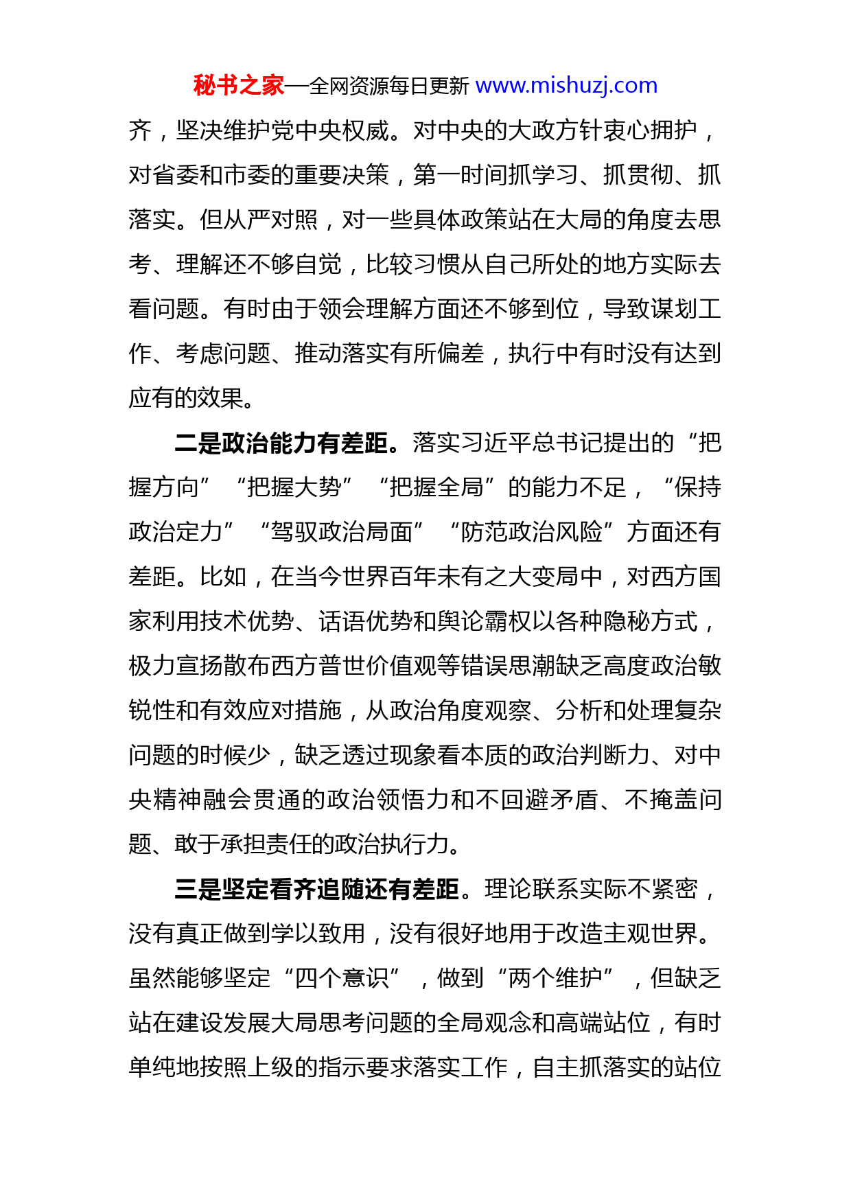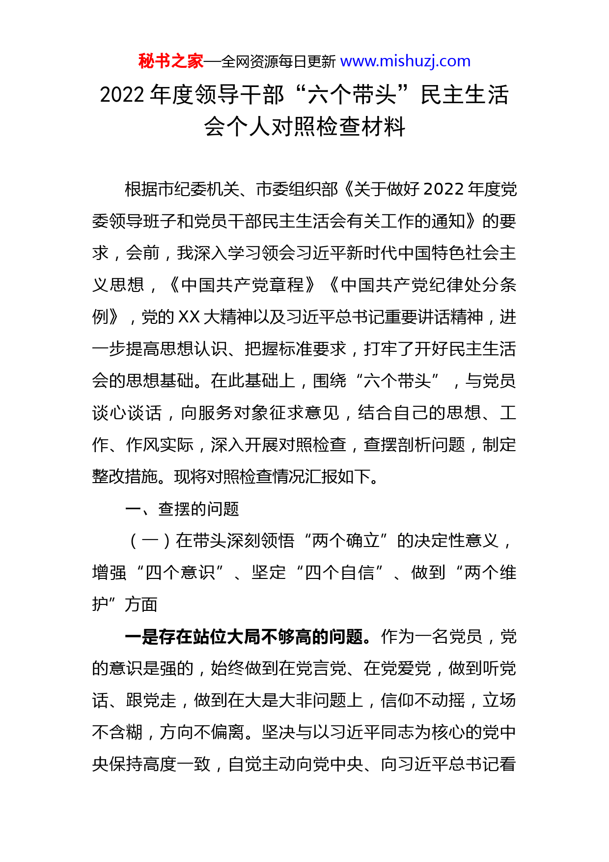 秘书之家—全网资源每日更新www.mishuzj.com2022年度领导干部“六个带头”民主生活会个人对照检查材料根据市纪委机关、市委组织部《关于做好2022年度党委领导班子和党员干部民主生活会有关工作的通知》的要求,会前,我深入学习领会习近平新时代中国特色社会主义思想,《中国共产党章程》《中国共产党纪律处分条例》,党的XX大精神以及习近平总书记重要讲话精神,进一步提高思想认识、把握标准要求,打牢了开好民主生活会的思想基础。在此基础上,围绕“六个带头”,与党员谈心谈话,向服务对象征求意见,结合自己的思想、工作、作风实际,深入开展对照检查,查摆剖析问题,制定整改措施。现将对照检查情况汇报如下。一、查摆的问题(一)在带头深刻领悟“两个确立”的决定性意义,增强“四个意识”、坚定“四个自信”、做到“两个维护”方面一是存在站位大局不够高的问题。作为一名党员,党的意识是强的,始终做到在党言党、在党爱党,做到听党话、跟党走,做到在大是大非问题上,信仰不动摇,立场不含糊,方向不偏离。坚决与以习近平同志为核心的党中央保持高度一致,自觉主动向党中央、向习近平总书记看秘书之家—全网资源每日更新www.mishuzj.com齐,坚决维护党中央权威。对中央的大政方针衷心拥护,对省委和市委的重要决策,第一时间抓学习、抓贯彻、抓落实。但从严对照,对一些具体政策站在大局的角度去思考、理解还不够自觉,比较习惯从自己所处的地方实际去看问题。有时由于领会理解方面还不够到位,导致谋划工作、考虑问题、推动落实有所偏差,执行中有时没有达到应有的效果。二是政治能力有差距。落实习近平总书记提出的“把握方向”“把握大势”“把握全局”的能力不足,“保持政治定力”“驾驭政治局面”“防范政治风险”方面还有差距。比如,在当今世界百年未有之大变局中,对西方国家利用技术优势、话语优势和舆论霸权以各种隐秘方式,极力宣扬散布西方普世价值观等错误思潮缺乏高度政治敏锐性和有效应对措施,从政治角度观察、分析和处理复杂问题的时候少,缺乏透过现象看本质的政治判断力、对中央精神融会贯通的政治领悟力和不回避矛盾、不掩盖问题、敢于承担责任的政治执行力。三是坚定看齐追随还有差距。理论联系实际不紧密,没有真正做到学以致用,没有很好地用于改造主观世界。虽然能够坚定“四个意识”,做到“两个维护”,但缺乏站在建设发展大局思考问题的全局观念和高端站位,有时单纯地按照上级的指示要求落实工作,自主抓落实的站位秘书之家—全网资源每日更新www.mishuzj.com不高、视野不宽,导致一些工作缺乏特色和亮点。(二)在带头用习近平新时代中国特色社会主义思想凝心铸魂方面一是工作标准有待提高。有时产生的新想法也只是停留于心动而无行动的状态,对一些时间紧、任务重、要求高的工作破题多,立题少,存在优质时达不到高效,高效中难以达到优质的情况。有时习惯于“等”,等工作部署,等红头文件,等外力推动,紧迫感、压力感和忧患意识不够强。比如XXX。三是敢于担当的勇气不足。面对改革路上的困难和矛盾,主动作为意识不够强。虽然在思想上能够认识到改革的重要性和紧迫性,但有时有等待上级指示批示,观望其他县区落实情况的心理,抓结合落实的力度还不够。在涉及经济领域的改革中,思路、目标、措施比较清晰,推进落实速度还不够快。二是学习不经常,不深入,学用结合不紧密。没有牢固树立终身学习的理念,日常学习坚持不经常,存在着重干轻学、以干代学、以批阅文件代替学习的现象。自学和摘抄学习笔记多,组织开展理论对谈、带头讲学和组织集中开展讨论少,对党的最新理论成果、业务知识系统学习研究不够,致使对发展形势把握不足,对民情认识的深度、高度不够,谋划发展站位不高,理念不新,视野不宽。秘书之家—全网资源每日更新www.mishuzj.com三是在习近平新时代中国特色社会主义思想深学、深悟上还有差距。没有持之以恒高标准抓学习,未真正做到抓常抓长、从严从实,导致学习原文多,结合实际悟不多,对党的最新理论成果止步于“学过了”。指导干部职工运用党的创新理论指导实践、推动工作的能力水平还有待提高,各个领域工作谋划上全局性、预见性、前瞻性不够。(三)在带头坚持和加强党的全面领导方面一是民主集中制的民主素养与专业涵养稍显不足。在提升民主素养与专业涵养过程中,存在急于求成的心态,没有认识到,提升民主集中制素养不是一蹴而就的,而是需要经历从“实践、认识、再实践、再认识”螺旋式的上升过程的,有时面对自己不能全面理解和把握民主集中制的精神实质、核心要义和实践要求时,缺乏应有的耐心,持续用力不足,导致思想自觉和行动自觉相对滞后。关于民主集中制的教育培训存在短板,如:在教育培训中,很少讲民主集中制作为一项专题进行培训,不能通过教育培训而厚植民主素养,把对民主集中制的抽象认知转变为具体实践,使一些对新的历史条件下要不要坚持这一制度存在着模糊认识。二是意识形态宣传教育方式滞后于时代发展。在开展宣传教育时,还往往采用“一人讲,众人听”的授课形秘书之家—全网资源每日更新www.mishuzj.com式,倾向于单向的灌输,话语表达过于生硬和教条,缺少用通俗易懂的
