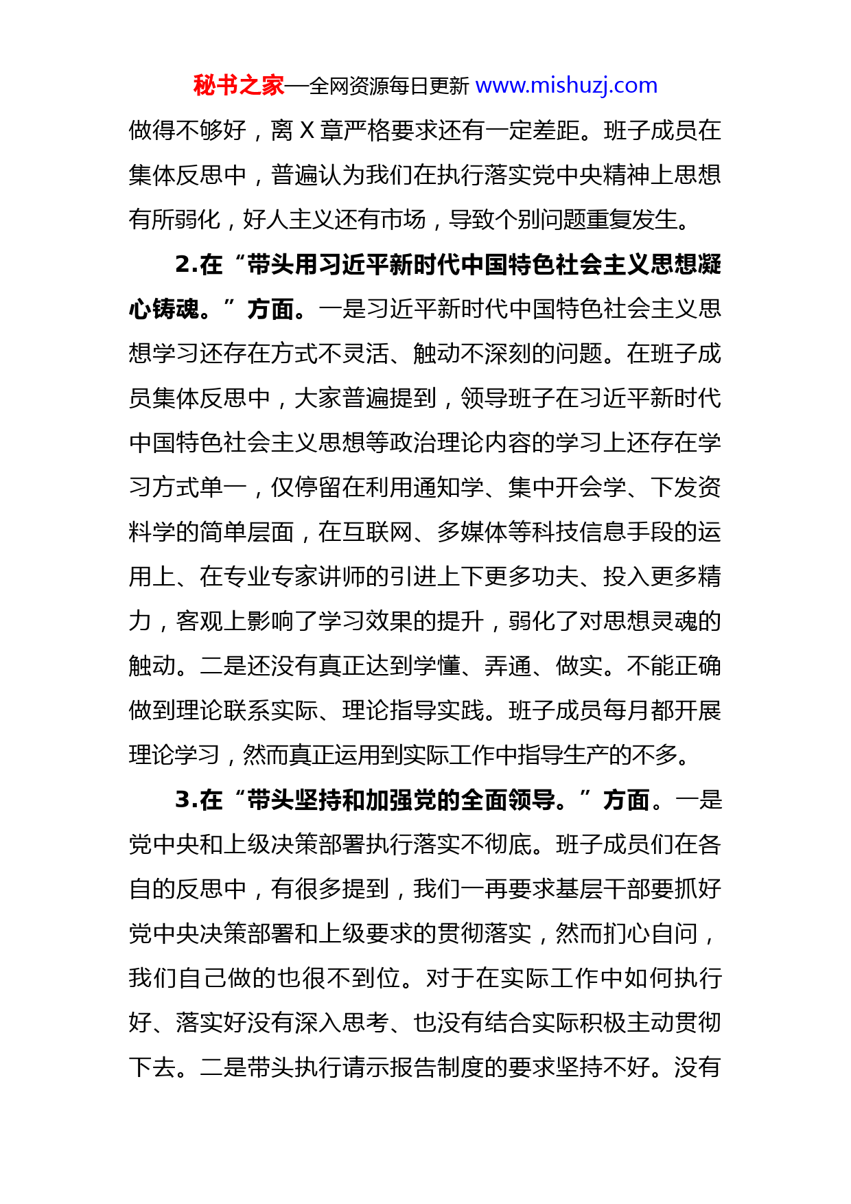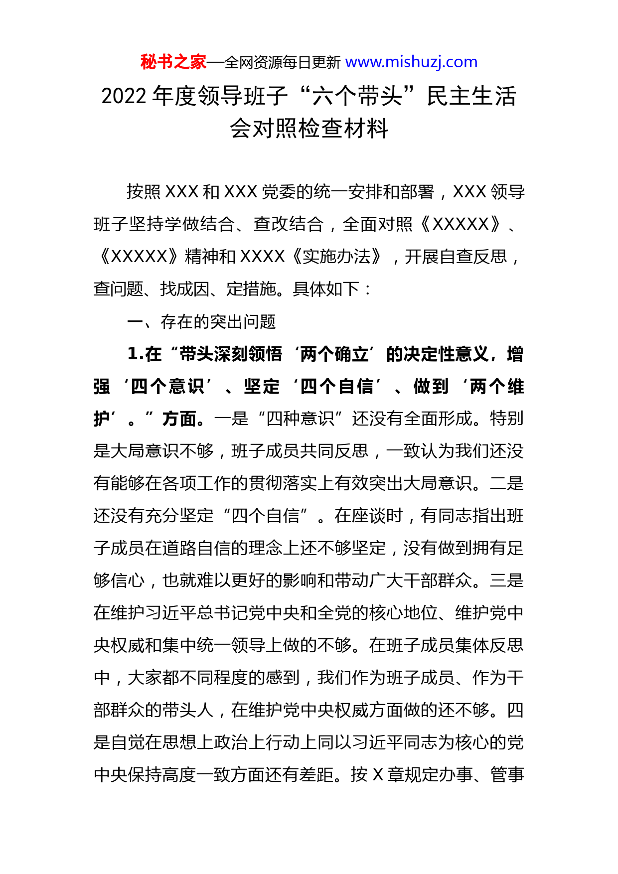 秘书之家—全网资源每日更新www.mishuzj.com2022年度领导班子“六个带头”民主生活会对照检查材料按照XXX和XXX党委的统一安排和部署,XXX领导班子坚持学做结合、查改结合,全面对照《XXXXX》、《XXXXX》精神和XXXX《实施办法》,开展自查反思,查问题、找成因、定措施。具体如下:一、存在的突出问题1.在“带头深刻领悟‘两个确立’的决定性意义,增强‘四个意识’、坚定‘四个自信’、做到‘两个维护’。”方面。一是“四种意识”还没有全面形成。特别是大局意识不够,班子成员共同反思,一致认为我们还没有能够在各项工作的贯彻落实上有效突出大局意识。二是还没有充分坚定“四个自信”。在座谈时,有同志指出班子成员在道路自信的理念上还不够坚定,没有做到拥有足够信心,也就难以更好的影响和带动广大干部群众。三是在维护习近平总书记党中央和全党的核心地位、维护党中央权威和集中统一领导上做的不够。在班子成员集体反思中,大家都不同程度的感到,我们作为班子成员、作为干部群众的带头人,在维护党中央权威方面做的还不够。四是自觉在思想上政治上行动上同以习近平同志为核心的党中央保持高度一致方面还有差距。按X章规定办事、管事秘书之家—全网资源每日更新www.mishuzj.com做得不够好,离X章严格要求还有一定差距。班子成员在集体反思中,普遍认为我们在执行落实党中央精神上思想有所弱化,好人主义还有市场,导致个别问题重复发生。2.在“带头用习近平新时代中国特色社会主义思想凝心铸魂。”方面。一是习近平新时代中国特色社会主义思想学习还存在方式不灵活、触动不深刻的问题。在班子成员集体反思中,大家普遍提到,领导班子在习近平新时代中国特色社会主义思想等政治理论内容的学习上还存在学习方式单一,仅停留在利用通知学、集中开会学、下发资料学的简单层面,在互联网、多媒体等科技信息手段的运用上、在专业专家讲师的引进上下更多功夫、投入更多精力,客观上影响了学习效果的提升,弱化了对思想灵魂的触动。二是还没有真正达到学懂、弄通、做实。不能正确做到理论联系实际、理论指导实践。班子成员每月都开展理论学习,然而真正运用到实际工作中指导生产的不多。3.在“带头坚持和加强党的全面领导。”方面。一是党中央和上级决策部署执行落实不彻底。班子成员们在各自的反思中,有很多提到,我们一再要求基层干部要抓好党中央决策部署和上级要求的贯彻落实,然而扪心自问,我们自己做的也很不到位。对于在实际工作中如何执行好、落实好没有深入思考、也没有结合实际积极主动贯彻下去。二是带头执行请示报告制度的要求坚持不好。没有秘书之家—全网资源每日更新www.mishuzj.com能够做到带头严格执行请示报告制度,对于哪些问题应该请示、哪些事项需要报告还存在模糊认识,正因为认识不清、界定不准,导致执行落实起来出现漏项、漏报问题。三是“三重一大”事项决策制度落实不严密。对一些不属于党政联席会议决策,可以通过办公会决定的事项内容,也召开党政联席会进行研究决策,占用了时间、降低了效率。4.在“带头坚持以人民为中心的发展思想,推动改革发展稳定。”方面。一是工作中的重大问题及时请示报告不及时。班子在集体反思中,有好几位成员都提到自己因为急于落实工作,对于一些自我感觉可以率先决定的问题,有时会事先拍板,然后才向上请示报告,没有能够充分落实好重大问题请示报告的具体程序和要求。二是临机处置突发情况事后及时报告制度落实不彻底。面对一些突发事件,有时对于一些自认为无关紧要的问题,只是进行了内部处置、处理和问责,觉得没有必要,就没有或者迟一步上报,细想起来,这与一些突发事件不上报、后上报,最终导致信息倒流是一个性质。5.在“带头发扬斗争精神,防范化解风险挑战。”方面。一是攻坚克难的主动性、积极性不强。存在畏难情绪和求稳怕乱的心理,面对改革转型的新形势、新变化、新要求,存有局限心理,思路不宽、探索不深,固守田园的秘书之家—全网资源每日更新www.mishuzj.com思维在班子层还不同程度存在。二是直面问题、直击矛盾的勇气和决心不够。缺少直面问题的担当意识和直击矛盾的坚定决心。在涉及到深化发展等重要工作上,不分管的班子成员有时会怕束缚了分管班子改革创新的思路,存在不发表意见,不发表言论,怕越位的现象,导致个别情况下集体决策走了形式,出台的一些政策不接地气,这也是多数班子成员在个人反思中点出的问题。通过反思,我们班子在工作上超前思考、主动介入的责任意识还不够,这也导致工作中人为的出现了结合部和推诿扯皮的问题。6.在“带头落实全面从严治党政治责任。”方面。一是没能够旗帜鲜明地批评和纠正所分管部门、领域的违规违纪言行。党中央要求要持续加大对违纪违规问题的纠查力度,但反思我们领导班子层,这一力度明显不够,也正是因为力度不够,才会出现“违规虚报差旅费变通使用”等问题。对于个别党员干部“打擦边球”的现象发现不及时,管理不严格,没有及时劝阻和发表意见。二是从严管党治党责任落实不到位,没能够严格执行党的干部政策,跑风漏气的问题没能全面查处。总觉得干部选拔任用已经很严谨了,管理岗位人员的竞聘