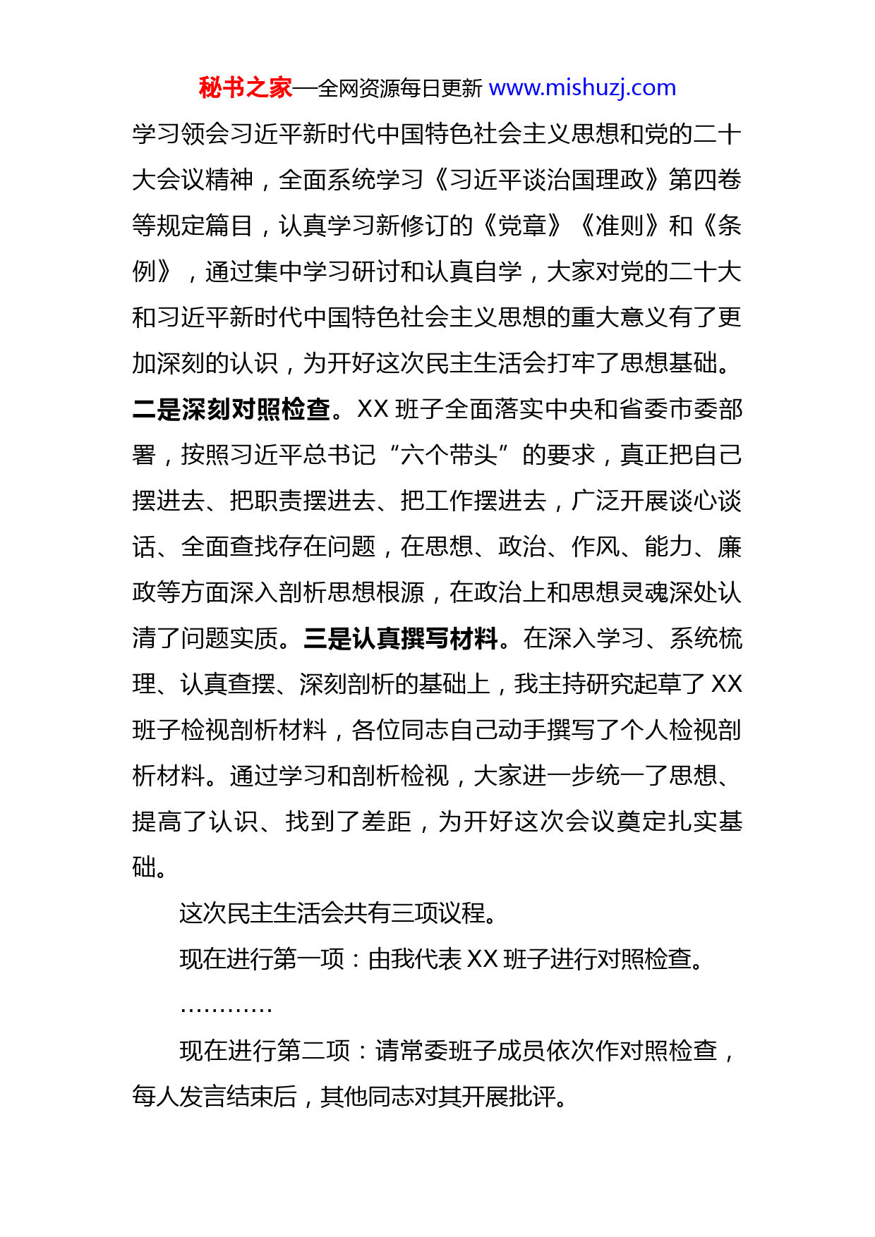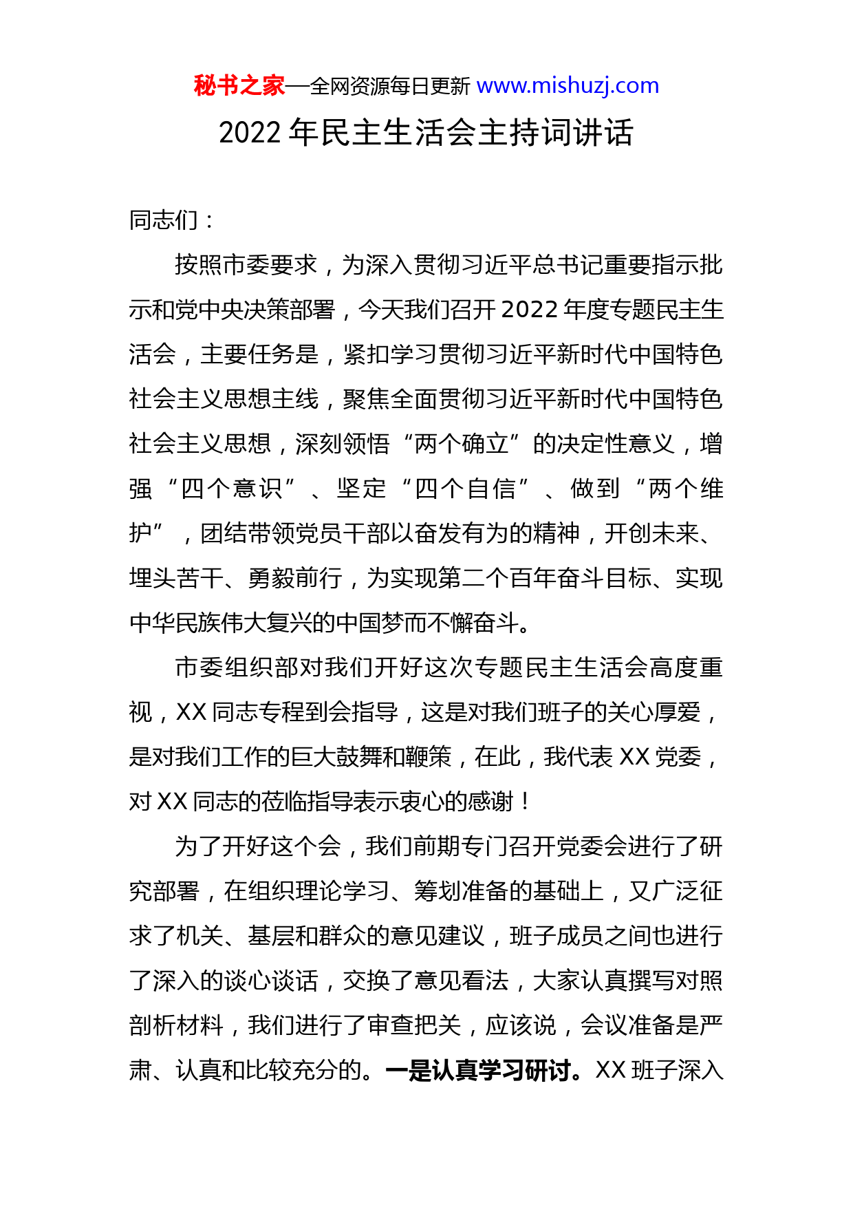 秘书之家—全网资源每日更新www.mishuzj.com2022年民主生活会主持词讲话同志们:按照市委要求,为深入贯彻习近平总书记重要指示批示和党中央决策部署,今天我们召开2022年度专题民主生活会,主要任务是,紧扣学习贯彻习近平新时代中国特色社会主义思想主线,聚焦全面贯彻习近平新时代中国特色社会主义思想,深刻领悟“两个确立”的决定性意义,增强“四个意识”、坚定“四个自信”、做到“两个维护”,团结带领党员干部以奋发有为的精神,开创未来、埋头苦干、勇毅前行,为实现第二个百年奋斗目标、实现中华民族伟大复兴的中国梦而不懈奋斗。市委组织部对我们开好这次专题民主生活会高度重视,XX同志专程到会指导,这是对我们班子的关心厚爱,是对我们工作的巨大鼓舞和鞭策,在此,我代表XX党委,对XX同志的莅临指导表示衷心的感谢!为了开好这个会,我们前期专门召开党委会进行了研究部署,在组织理论学习、筹划准备的基础上,又广泛征求了机关、基层和群众的意见建议,班子成员之间也进行了深入的谈心谈话,交换了意见看法,大家认真撰写对照剖析材料,我们进行了审查把关,应该说,会议准备是严肃、认真和比较充分的。一是认真学习研讨。XX班子深入秘书之家—全网资源每日更新www.mishuzj.com学习领会习近平新时代中国特色社会主义思想和党的二十大会议精神,全面系统学习《习近平谈治国理政》第四卷等规定篇目,认真学习新修订的《党章》《准则》和《条例》,通过集中学习研讨和认真自学,大家对党的二十大和习近平新时代中国特色社会主义思想的重大意义有了更加深刻的认识,为开好这次民主生活会打牢了思想基础。二是深刻对照检查。XX班子全面落实中央和省委市委部署,按照习近平总书记“六个带头”的要求,真正把自己摆进去、把职责摆进去、把工作摆进去,广泛开展谈心谈话、全面查找存在问题,在思想、政治、作风、能力、廉政等方面深入剖析思想根源,在政治上和思想灵魂深处认清了问题实质。三是认真撰写材料。在深入学习、系统梳理、认真查摆、深刻剖析的基础上,我主持研究起草了XX班子检视剖析材料,各位同志自己动手撰写了个人检视剖析材料。通过学习和剖析检视,大家进一步统一了思想、提高了认识、找到了差距,为开好这次会议奠定扎实基础。这次民主生活会共有三项议程。现在进行第一项:由我代表XX班子进行对照检查。…………现在进行第二项:请常委班子成员依次作对照检查,每人发言结束后,其他同志对其开展批评。秘书之家—全网资源每日更新www.mishuzj.com首先,我带头做个发言。……………………请各位同志对我进行批评。……………………下面,请XXX同志发言;……………………请各位同志对XXX同志进行批评。……………………下面,请XXX同志发言;……………………请各位同志对XXX同志进行批评。……………………下面,请XXX同志发言;……………………请各位同志对XXX同志进行批评。…………………下面,请XXX同志发言;…………请各位同志对XXX同志进行批评……………………现在进行第三项:请市委组织部XXX同志作点评讲话,大家欢迎!秘书之家—全网资源每日更新www.mishuzj.com…………刚才,各位常委同志都围绕主题,联系实际,正视问题、刀刃向内,查摆问题不躲不闪,剖析原因触及要害,整改措施切实可行,自我批评具体实在、入木三分,相互批评鞭辟入里、一针见血,见人见事见思想,既帮助了同志,又维护了团结,形成了互动交流的良好氛围,达到了统一思想、明确方向、凝聚力量的目的,进一步增强了“四个意识”,更加坚定自觉做到“两个维护”。总体上看,这次会议开得比较成功,达到了预期效果。XXX同志作了点评发言,对这次专题民主生活会给予了充分肯定,对XX班子的发言进行了客观点评,并就做好下一步工作提出了明确要求,体现了中央精神和省委市委要求,切合XX实际,具有很强的指导性和针对性,为我们深入学习贯彻习近平新时代中国特色社会主义思想,规范和严肃党内政治生活,全面整改存在问题提供了有力指导。同志们一定要认真学习领会,切实抓好贯彻落实。下面,我再讲五点意见。一、坚定理想信念,不断强化理论武装。习近平总书记强调,在学习理论上,干部要舍得花精力,全面系统学,及时跟进学,深入思考学,联系实际学。XXX擘画了全面建成社会主义现代化强国、以中国式现代化全面推进中华民族伟大复兴的宏伟蓝图,明确了新时代新征程党和秘书之家—全网资源每日更新www.mishuzj.com国家事业发展的目标任务。全面系统深入贯彻落实XXX精神,是当前和今后一个时期全党的首要政治任务。XX班子的同志要在全面学习、全面把握、全面落实XXX精神上带好头、作表率,不辱使命、不负众望,切实把思想和行动统一到XXX所作出的各项决策部署上来。各位常委同志要坚持把学习习近平新时代中国特色社会主义思想,特别是XXX精神作为首要政治任务,作为引路旗帜、政治信仰和精神支柱,作为统揽我们工作的政治纲领和行动指南,按照学懂弄通做实要求,紧密联系实际,坚持深入学、系统学、跟进学,带着信仰学,带着感情学,带着责任学,带着好的学风学,深学细悟,领会精髓要义,做到学有思、学有悟、学有成。要做好后半篇文章,不能只学不用,要把理论学习与开展调查研究、推动工作结合起来,深