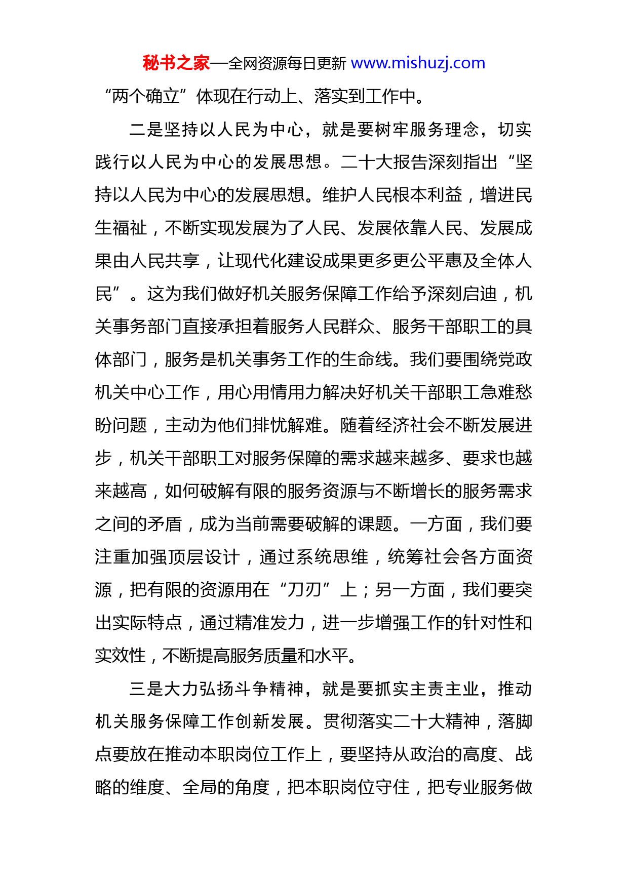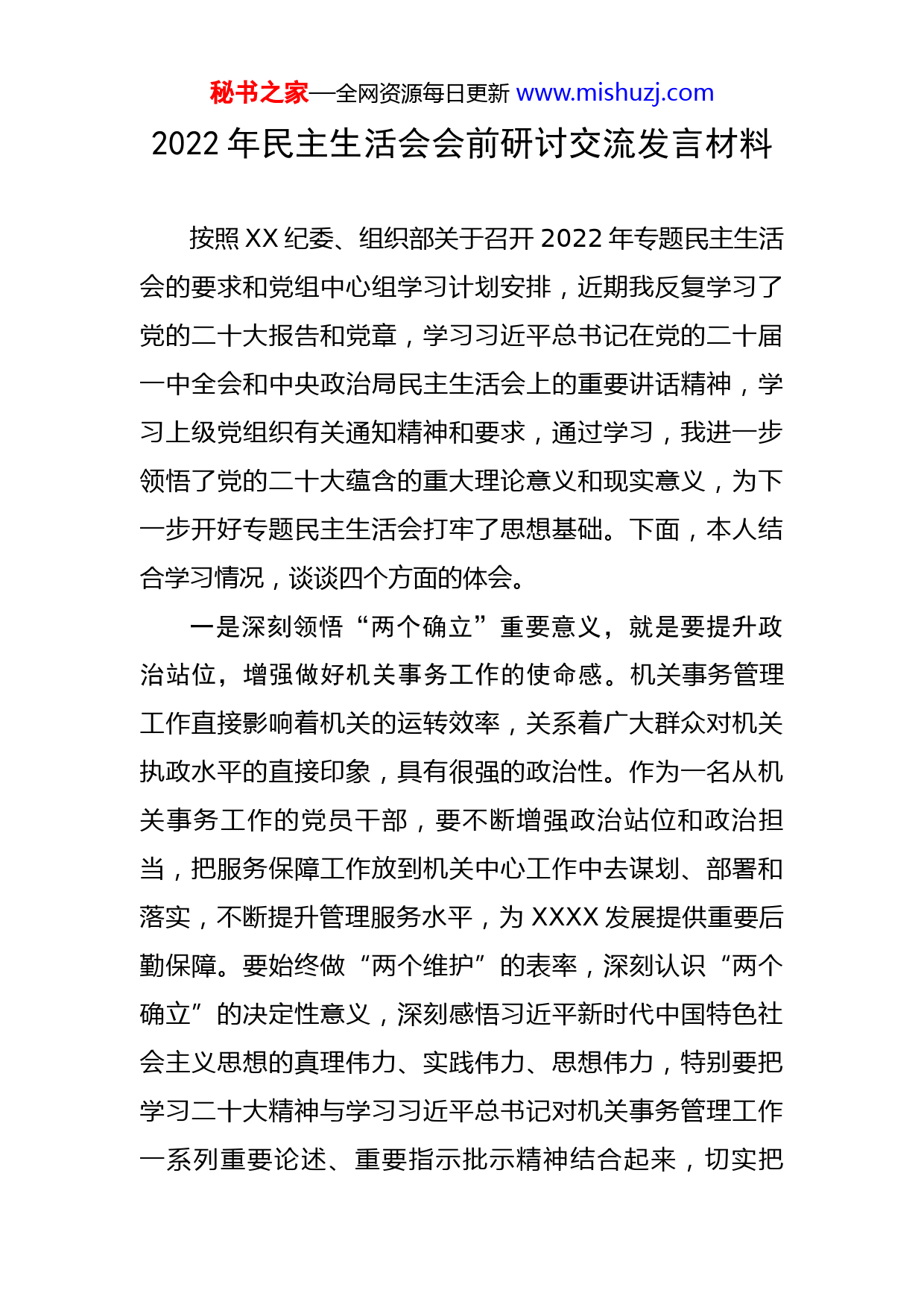 秘书之家—全网资源每日更新www.mishuzj.com2022年民主生活会会前研讨交流发言材料按照XX纪委、组织部关于召开2022年专题民主生活会的要求和党组中心组学习计划安排,近期我反复学习了党的二十大报告和党章,学习习近平总书记在党的二十届一中全会和中央政治局民主生活会上的重要讲话精神,学习上级党组织有关通知精神和要求,通过学习,我进一步领悟了党的二十大蕴含的重大理论意义和现实意义,为下一步开好专题民主生活会打牢了思想基础。下面,本人结合学习情况,谈谈四个方面的体会。一是深刻领悟“两个确立”重要意义,就是要提升政治站位,增强做好机关事务工作的使命感。机关事务管理工作直接影响着机关的运转效率,关系着广大群众对机关执政水平的直接印象,具有很强的政治性。作为一名从机关事务工作的党员干部,要不断增强政治站位和政治担当,把服务保障工作放到机关中心工作中去谋划、部署和落实,不断提升管理服务水平,为XXXX发展提供重要后勤保障。要始终做“两个维护”的表率,深刻认识“两个确立”的决定性意义,深刻感悟习近平新时代中国特色社会主义思想的真理伟力、实践伟力、思想伟力,特别要把学习二十大精神与学习习近平总书记对机关事务管理工作一系列重要论述、重要指示批示精神结合起来,切实把秘书之家—全网资源每日更新www.mishuzj.com“两个确立”体现在行动上、落实到工作中。二是坚持以人民为中心,就是要树牢服务理念,切实践行以人民为中心的发展思想。二十大报告深刻指出“坚持以人民为中心的发展思想。维护人民根本利益,增进民生福祉,不断实现发展为了人民、发展依靠人民、发展成果由人民共享,让现代化建设成果更多更公平惠及全体人民”。这为我们做好机关服务保障工作给予深刻启迪,机关事务部门直接承担着服务人民群众、服务干部职工的具体部门,服务是机关事务工作的生命线。我们要围绕党政机关中心工作,用心用情用力解决好机关干部职工急难愁盼问题,主动为他们排忧解难。随着经济社会不断发展进步,机关干部职工对服务保障的需求越来越多、要求也越来越高,如何破解有限的服务资源与不断增长的服务需求之间的矛盾,成为当前需要破解的课题。一方面,我们要注重加强顶层设计,通过系统思维,统筹社会各方面资源,把有限的资源用在“刀刃”上;另一方面,我们要突出实际特点,通过精准发力,进一步增强工作的针对性和实效性,不断提高服务质量和水平。三是大力弘扬斗争精神,就是要抓实主责主业,推动机关服务保障工作创新发展。贯彻落实二十大精神,落脚点要放在推动本职岗位工作上,要坚持从政治的高度、战略的维度、全局的角度,把本职岗位守住,把专业服务做秘书之家—全网资源每日更新www.mishuzj.com好,把主责主业抓牢,把学习的成效体现到管理提档、服务提质、保障提效上来。在强化政府采购管理方面,及时做好全年采购计划,严格执行经过批复的政府采购预算,增强采购的计划性,减少随意性,确保政府采购预算有效有序执行。在强化重要会议保障方面,强化系统性、协同性、科学性,加强各方面协调配合、完善全过程系统管理,提升会议实效和水平,特别注重当前疫情形势下的安全办会原则。在强化财务和资产管理方面,从严从紧编制和管理预算,严格控制一般性支出,优化财政支出结构,推进预算和绩效管理一体化;完善资产管理体系,及时开展清产核资工作,合理配置、有效使用、规范处置国有资产,推动行政事业性国有资产管理体质增效。在节约型机关建设方面,坚持以习近平生态文明思想为引领,提高公共机构能源资源利用效率,深入开展制止餐饮浪费、开展节水节能宣传、推动生活垃圾分类等各项工作,让机关节俭文化更加深入人心。四是落实全面从严治党责任,就是要坚守法纪底线,树立机关服务保障干部的清新形象。机关服务保障工作涉及人、财、物,必须要筑牢防腐思想防线,抓好纪律作风建设,真正做到心有所畏、言有所戒、行有所止,为推动机关服务保障工作创新发展提供坚强保障。我们要认真学习习近平总书记关于全面从严治党的重要指示批示精神,秘书之家—全网资源每日更新www.mishuzj.com认真对照机关风险防控点,聚焦重点领域、重点岗位和重点环节,强化对权力运行的监督制约,切实筑牢风险防控的坚固防线。强化制度约束,结合工作职能,逐步完善资产、资源、资金统筹和办公用房、公务用车、公务接待等具体措施,用制度来管人、管事、管权,确保各项机关事务工作在制度和法治轨道上有序运行。强化作风建设,我们要认真贯彻落实中央“过紧日子”的重要要求,坚决贯彻中央八项规定及其实施细则精神,切实防止“四风”问题反弹,营造求真务实、清正廉洁的清风正气,保持心境澄明、心力茁壮的清新形象。