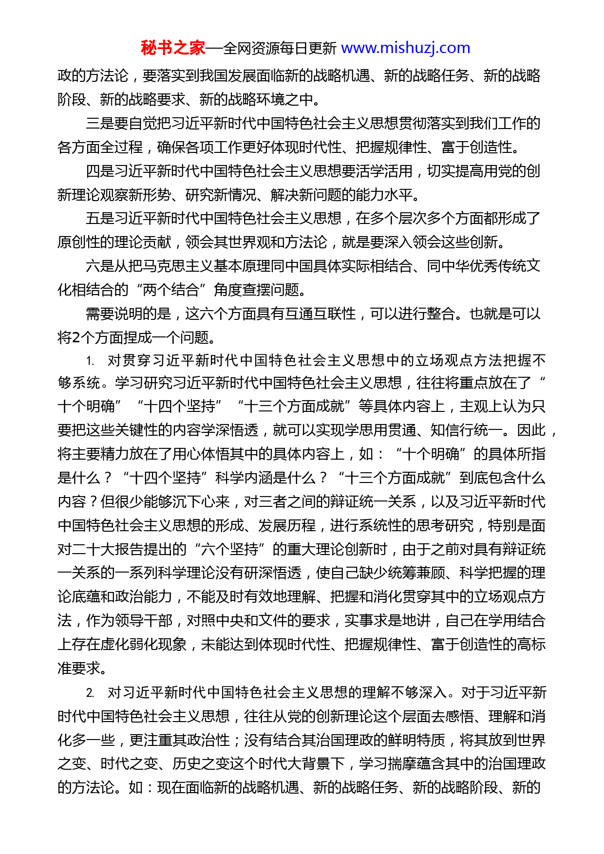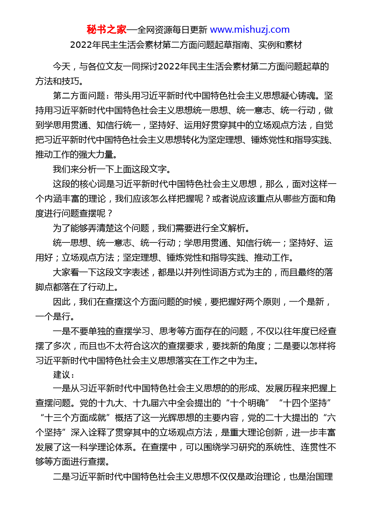 秘书之家—全网资源每日更新www.mishuzj.com2022年民主生活会素材第二方面问题起草指南、实例和素材今天,与各位文友一同探讨2022年民主生活会素材第二方面问题起草的方法和技巧。第二方面问题:带头用习近平新时代中国特色社会主义思想凝心铸魂。坚持用习近平新时代中国特色社会主义思想统一思想、统一意志、统一行动,做到学思用贯通、知信行统一,坚持好、运用好贯穿其中的立场观点方法,自觉把习近平新时代中国特色社会主义思想转化为坚定理想、锤炼党性和指导实践、推动工作的强大力量。我们来分析一下上面这段文字。这段的核心词是习近平新时代中国特色社会主义思想,那么,面对这样一个内涵丰富的理论,我们应该怎么样把握呢?或者说应该重点从哪些方面和角度进行问题查摆呢?为了能够弄清楚这个问题,我们需要进行全文解析。统一思想、统一意志、统一行动;学思用贯通、知信行统一;坚持好、运用好;立场观点方法;坚定理想、锤炼党性和指导实践、推动工作。大家看一下这段文字表述,都是以并列性词语方式为主的,而且最终的落脚点都落在了行动上。因此,我们在查摆这个方面问题的时候,要把握好两个原则,一个是新,一个是行。一是不要单独的查摆学习、思考等方面存在的问题,不仅以往年度已经查摆了多次,而且也不太符合这次的查摆要求,要找新的角度;二是要以怎样将习近平新时代中国特色社会主义思想落实在工作之中为主。建议:一是从习近平新时代中国特色社会主义思想的的形成、发展历程来把握上查摆问题。党的十九大、十九届六中全会提出的“十个明确”“十四个坚持”“十三个方面成就”概括了这一光辉思想的主要内容,党的二十大提出的“六个坚持”深入诠释了贯穿其中的立场观点方法,是重大理论创新,进一步丰富发展了这一科学理论体系。在查摆中,可以围绕学习研究的系统性、连贯性不够等方面进行查摆。二是习近平新时代中国特色社会主义思想不仅仅是政治理论,也是治国理秘书之家—全网资源每日更新www.mishuzj.com政的方法论,要落实到我国发展面临新的战略机遇、新的战略任务、新的战略阶段、新的战略要求、新的战略环境之中。三是要自觉把习近平新时代中国特色社会主义思想贯彻落实到我们工作的各方面全过程,确保各项工作更好体现时代性、把握规律性、富于创造性。四是习近平新时代中国特色社会主义思想要活学活用,切实提高用党的创新理论观察新形势、研究新情况、解决新问题的能力水平。五是习近平新时代中国特色社会主义思想,在多个层次多个方面都形成了原创性的理论贡献,领会其世界观和方法论,就是要深入领会这些创新。六是从把马克思主义基本原理同中国具体实际相结合、同中华优秀传统文化相结合的“两个结合”角度查摆问题。需要说明的是,这六个方面具有互通互联性,可以进行整合。也就是可以将2个方面捏成一个问题。1.对贯穿习近平新时代中国特色社会主义思想中的立场观点方法把握不够系统。学习研究习近平新时代中国特色社会主义思想,往往将重点放在了“十个明确”“十四个坚持”“十三个方面成就”等具体内容上,主观上认为只要把这些关键性的内容学深悟透,就可以实现学思用贯通、知信行统一。因此,将主要精力放在了用心体悟其中的具体内容上,如:“十个明确”的具体所指是什么?“十四个坚持”科学内涵是什么?“十三个方面成就”到底包含什么内容?但很少能够沉下心来,对三者之间的辩证统一关系,以及习近平新时代中国特色社会主义思想的形成、发展历程,进行系统性的思考研究,特别是面对二十大报告提出的“六个坚持”的重大理论创新时,由于之前对具有辩证统一关系的一系列科学理论没有研深悟透,使自己缺少统筹兼顾、科学把握的理论底蕴和政治能力,不能及时有效地理解、把握和消化贯穿其中的立场观点方法,作为领导干部,对照中央和文件的要求,实事求是地讲,自己在学用结合上存在虚化弱化现象,未能达到体现时代性、把握规律性、富于创造性的高标准要求。2.对习近平新时代中国特色社会主义思想的理解不够深入。对于习近平新时代中国特色社会主义思想,往往从党的创新理论这个层面去感悟、理解和消化多一些,更注重其政治性;没有结合其治国理政的鲜明特质,将其放到世界之变、时代之变、历史之变这个时代大背景下,学习揣摩蕴含其中的治国理政的方法论。如:现在面临新的战略机遇、新的战略任务、新的战略阶段、新的秘书之家—全网资源每日更新www.mishuzj.com战略要求、新的战略环境,适用于以往的一些执政理论和领导观点,已经不能满足新时代发展的需要,在面对如何转变发展方式、优化经济结构、转换增长动力等治国理政考验和重大执政命题时,时常感觉力不从心,就是因为自己对习近平新时代中国特色社会主义思想理解得不够深入,仅仅将其作为思想政治上的纲领性和方向性的“明灯”,而没有从中积极领悟和践行新时代治国理政的战略部署和策略方法,在用习近平新时代中国特色社会主义思想指导实践、推动工作时,没有把科学理论转化为认识世界和改造世界的强大物质力量,在用习近平新时代中国特色社会主义思想凝心铸魂方面,不够科学有效,作用也未能充分彰显。3.践行习近平新时代中国