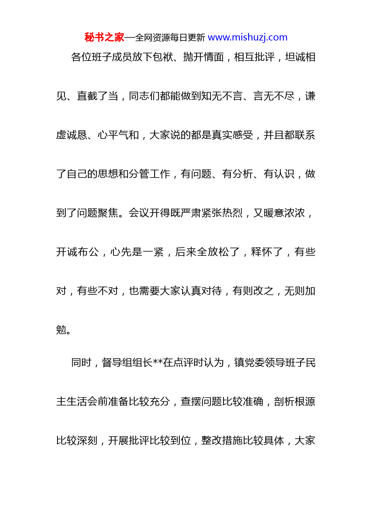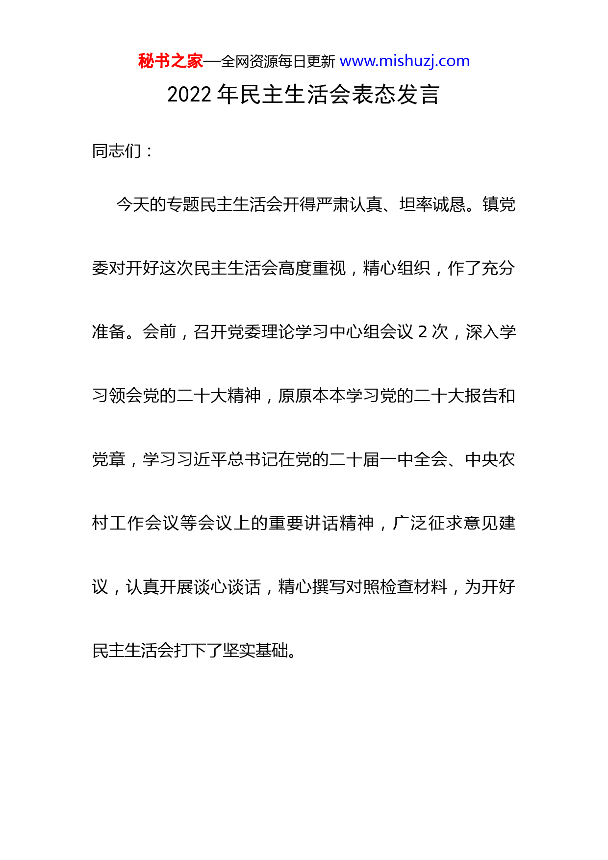 秘书之家—全网资源每日更新www.mishuzj.com2022年民主生活会表态发言同志们:今天的专题民主生活会开得严肃认真、坦率诚恳。镇党委对开好这次民主生活会高度重视,精心组织,作了充分准备。会前,召开党委理论学习中心组会议2次,深入学习领会党的二十大精神,原原本本学习党的二十大报告和党章,学习习近平总书记在党的二十届一中全会、中央农村工作会议等会议上的重要讲话精神,广泛征求意见建议,认真开展谈心谈话,精心撰写对照检查材料,为开好民主生活会打下了坚实基础。秘书之家—全网资源每日更新www.mishuzj.com各位班子成员放下包袱、抛开情面,相互批评,坦诚相见、直截了当,同志们都能做到知无不言、言无不尽,谦虚诚恳、心平气和,大家说的都是真实感受,并且都联系了自己的思想和分管工作,有问题、有分析、有认识,做到了问题聚焦。会议开得既严肃紧张热烈,又暖意浓浓,开诚布公,心先是一紧,后来全放松了,释怀了,有些对,有些不对,也需要大家认真对待,有则改之,无则加勉。同时,督导组组长在点评时认为,镇党委领导班子民主生活会前准备比较充分,查摆问题比较准确,剖析根源比较深刻,开展批评比较到位,整改措施比较具体,大家秘书之家—全网资源每日更新www.mishuzj.com在发言中既主动剖析自己,又开展相互批评,既坦诚相见,又直面问题,民主生活会开得比较成功,是一次高质量的民主生活会,符合县委的要求,实现了交流思想、统一认识、明确方向、振奋精神的目的。但是,也要看到存在的一些不足,比如,自我批评比较深刻,但批评他人有的同志还不到位,提出的意见辣味还不够,还说得还很原则,还很艺术等等,与党内生活的要求和群众的期盼还有一定的差距。对于这些问题,大家在会后还要认真改进,完善提高。下面,就巩固拓展这次民主生活会成果,进一步加强班子自身建设,我再强调几点意见。秘书之家—全网资源每日更新www.mishuzj.com一要以真诚的态度抓学习。要把加强政治理论学习作为首要政治任务,进一步完善机关学习制度,党建办公室要制定明确的学习计划和任务,通过集体学、参加培训、自学等多种形式,把学习真正落到实处。要把学习与改造主观世界结合起来,坚定理想信念,始终把思想和行动统一到中央、自治区党委、县委的部署上来,始终在思想上、政治上、行动上同以习近平同志为核心的党中央保持高度一致,始终把党的政治纪律、政治规矩摆在前面,自觉向党中央看齐,向习近平总书记看齐,向党的思想理论和路线方针政策看齐。进一步增强政治意识、大局意识、核心意识、看齐意识,坚定正确的政治方向,进一步创造风清秘书之家—全网资源每日更新www.mishuzj.com气正、勇于担当、大有作为的良好局面。要坚持学用结合、知行合一,充分把学习成效转化为能力的提升,不断增强创造性开展工作的能力,提高驾驭全局、应对复杂局面的能力。二要以务实的措施抓整改。专题民主生活会只是一个好的开端,发现问题、查找原因,归根结底是为了解决问题。我们将聚焦作风建设,拿出更实举措,及时跟进会后的整改落实,确保取得实效。一是解决问题要抓实。针对查摆出来的问题,不论是班子的还是个人的,都要列出问题清单,明确责任主体,完善整改措施,列出完成时限,实行整改销号制,不整改和整改不到位不予销号。特别是秘书之家—全网资源每日更新www.mishuzj.com对群众反映强烈的突出问题,要逐项研究,逐条制定措施,逐件抓整改。党建办公室要根据列出的问题清单,提醒督促相关方面按时限完成。二是开门整改要抓实。坚持敞开大门搞活动,整改落实得怎么样、问题解决得怎么样,一定要向干部群众公开,让干部群众看清楚,请大家来评判,接受监督,确保整改成效。三是完善机制要跟进。批评与自我批评没有休止符,唯有建立长效机制,才能让人有章可循,避免活动“一阵风”,让优良作风得到弘扬、让不良作风得到遏制,实现作风建设的制度化、规范化、常态化。秘书之家—全网资源每日更新www.mishuzj.com三要以担当的勇气抓民生。要把人民放在心中最高位置、把勤政为民作为不懈追求、把民生改善、农牧民增收致富达小康水平作为最大的责任来担当,抓好驻村工作队、联系点帮扶工作,切实把现有的好政策、好办法落到实处,就能增收致富,就能彻底改善民生。要坚持“两手抓、两不误、两促进”,紧紧围绕县委会议制定的一系列方针政策,不折不扣地抓好落实。要以创新助推乡村振兴。乡镇领导班子作为基层一线工作队伍,面对农村青壮年劳动力外出务工较多、撂荒地较多的现实问题,对如何盘活乡村资源,实现龙头企业带动、规模化经营、发展壮大村集体经济等方面广泛调研、深入思考、多做探索,开秘书之家—全网资源每日更新www.mishuzj.com创乡村振兴新局面。要凝心聚力,抢抓国家乡村振兴项目资金重点帮扶机遇,全面系统谋划,积极衔接争取,改善基础设施,推动产业发展,确保更多的项目资金在细巷落地见效,推动各项工作在全县争先进位、站在前列。四要以严明的纪律抓作风。要严格落实全面从严治党主体责任,练好“基本功”、种好“责任田”、守好“主阵地”,真正把提高党的建设质量的担子挑起来。要落实全面从严治党要求,加强领导班子和干部队伍建设,认真落实新时代党的组织路线和新时期好干部标准,要持