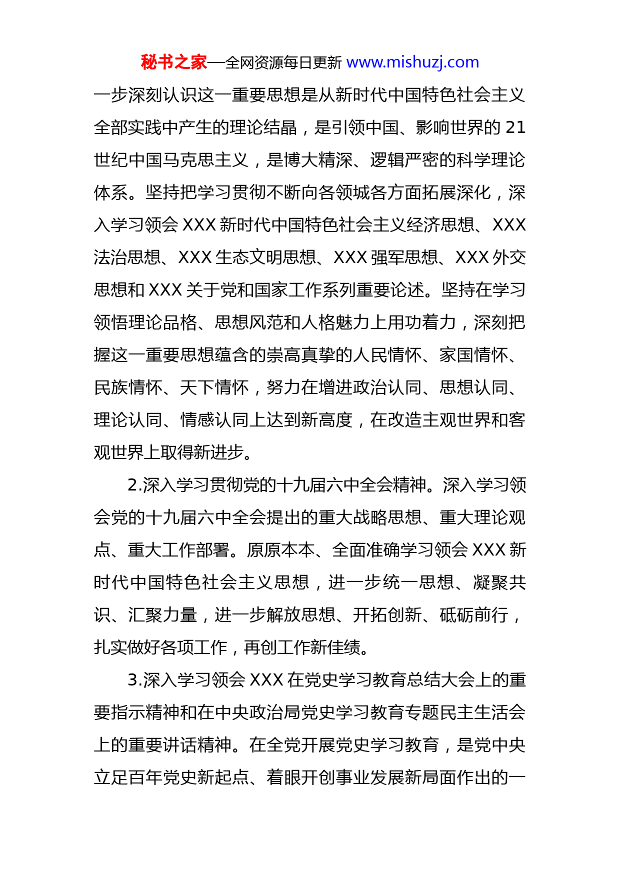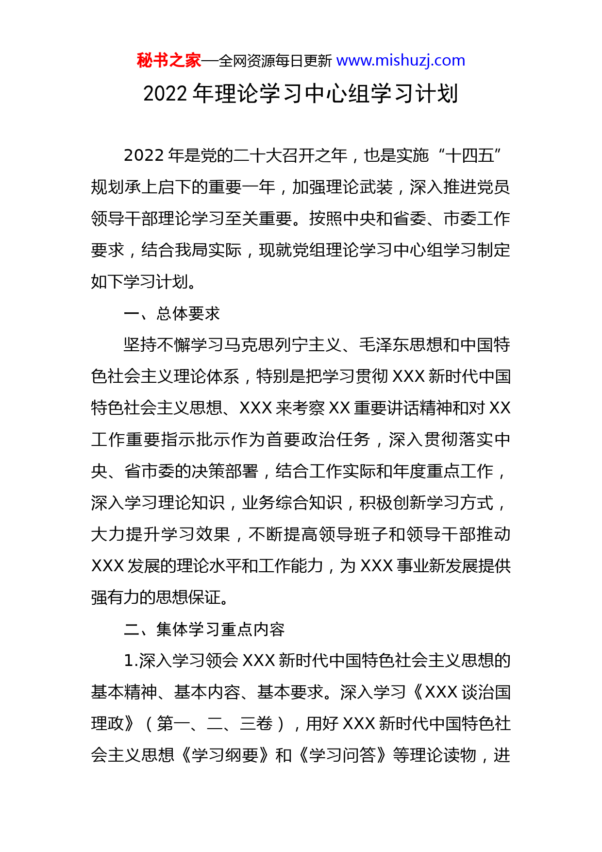 秘书之家—全网资源每日更新www.mishuzj.com2022年理论学习中心组学习计划2022年是党的二十大召开之年,也是实施“十四五”规划承上启下的重要一年,加强理论武装,深入推进党员领导干部理论学习至关重要。按照中央和省委、市委工作要求,结合我局实际,现就党组理论学习中心组学习制定如下学习计划。一、总体要求坚持不懈学习马克思列宁主义、毛泽东思想和中国特色社会主义理论体系,特别是把学习贯彻XXX新时代中国特色社会主义思想、XXX来考察XX重要讲话精神和对XX工作重要指示批示作为首要政治任务,深入贯彻落实中央、省市委的决策部署,结合工作实际和年度重点工作,深入学习理论知识,业务综合知识,积极创新学习方式,大力提升学习效果,不断提高领导班子和领导干部推动XXX发展的理论水平和工作能力,为XXX事业新发展提供强有力的思想保证。二、集体学习重点内容1.深入学习领会XXX新时代中国特色社会主义思想的基本精神、基本内容、基本要求。深入学习《XXX谈治国理政》(第一、二、三卷),用好XXX新时代中国特色社会主义思想《学习纲要》和《学习问答》等理论读物,进秘书之家—全网资源每日更新www.mishuzj.com一步深刻认识这一重要思想是从新时代中国特色社会主义全部实践中产生的理论结晶,是引领中国、影响世界的21世纪中国马克思主义,是博大精深、逻辑严密的科学理论体系。坚持把学习贯彻不断向各领城各方面拓展深化,深入学习领会XXX新时代中国特色社会主义经济思想、XXX法治思想、XXX生态文明思想、XXX强军思想、XXX外交思想和XXX关于党和国家工作系列重要论述。坚持在学习领悟理论品格、思想风范和人格魅力上用功着力,深刻把握这一重要思想蕴含的崇高真挚的人民情怀、家国情怀、民族情怀、天下情怀,努力在增进政治认同、思想认同、理论认同、情感认同上达到新高度,在改造主观世界和客观世界上取得新进步。2.深入学习贯彻党的十九届六中全会精神。深入学习领会党的十九届六中全会提出的重大战略思想、重大理论观点、重大工作部署。原原本本、全面准确学习领会XXX新时代中国特色社会主义思想,进一步统一思想、凝聚共识、汇聚力量,进一步解放思想、开拓创新、砥砺前行,扎实做好各项工作,再创工作新佳绩。3.深入学习领会XXX在党史学习教育总结大会上的重要指示精神和在中央政治局党史学习教育专题民主生活会上的重要讲话精神。在全党开展党史学习教育,是党中央立足百年党史新起点、着眼开创事业发展新局面作出的一秘书之家—全网资源每日更新www.mishuzj.com项重大战略决策。深刻领会党史学习教育的重大成果、宝贵经验,把党史学习教育成果转化为全面加强党的建设、全面建设社会主义现代化国家的强大力量。做到学史明理、学史增信、学史崇德、学史力行,学党史、悟思想、办实事、开新局,更加自觉地从党的历史中汲取开拓前进的智慧和力量。4.深入学习领会党的二十大精神。党的二十大是我们党进入全面建设社会主义现代化国家、进军第二个百年奋斗目标新征程的重要时刻召开的一次十分重要的代表大会,是党和国家政治生活中的一件大事。要全面准确学习领会党的二十大精神,认真研读党的二十大文件,深刻理解党的二十大提出的一系列重大理论观点、重大工作部署,自觉把思想和行动统一到讲话精神和二十大决策部署上来。5.深入学习领会XXX法治思想。学好用好《论坚持全面依法治国》一书,深刻认识XXX法治思想从历史和现实相贯通、国际和国内相关联、理论和实际相结合上回答了新时代为什么实行全面依法治国、怎样实行全面依法治国等一系列重大问题,是顺应实现中华民族伟大复兴时代要求应运而生的重大理论创新成果,是马克思主义法治理论中国化最新成果,是XXX新时代中国特色社会主义思想的重要组成部分,是全面依法治国的根本遵循和行动指南,坚持吃透基本精神、把握核心要义、明确工作要求,切实秘书之家—全网资源每日更新www.mishuzj.com把XXX法治思想贯彻落实到推进经济社会发展的全过程。6.深入学习领会XXX关于意识形态工作的重要论述。学好用好《论党的宣传思想工作》《XXX关于网络强国论述摘编》等书籍,深入学习XXX关于宗教工作的重要论述,深刻认识马克思主义是社会主义意识形态的旗帜和灵魂,必须始终坚持马克思主义在意识形态领域指导地位的根本制度,自觉坚定主心骨、把准定盘星,筑牢共同思想基础,凝聚强大精神动力;紧盯党的二十大前后等重要时间节点,加强意识形态领域形势分析研判,树立底线思维,防范重大政治安全和意识形态风险。做细做实思想政治工作,坚持开展经常性谈心谈话、定期交流思想,进一步规范党员干部工作时间内外、网上网下言行,不断提高党员干部的政治敏锐性和政治鉴别力,始终保持政治定力和政治清醒;深入贯彻落实《党委(党组)意识形态工作责任制实施办法》,强化各级党委主体责任,牢牢掌握意识形态工作领导权和话语权。7.深入学习领会XXX关于发扬斗争精神、防范风险挑战的重要论述。学好用好《XXX关于防范风险挑战、应对突发事件论述摘编》等书籍,深刻认识坚持斗争、不懈斗争,在斗争中前进是中国共产党人的本色,越是前景光明,越是要增强忧患意识、防范风险挑战,勇于进行具有许多新的历史特