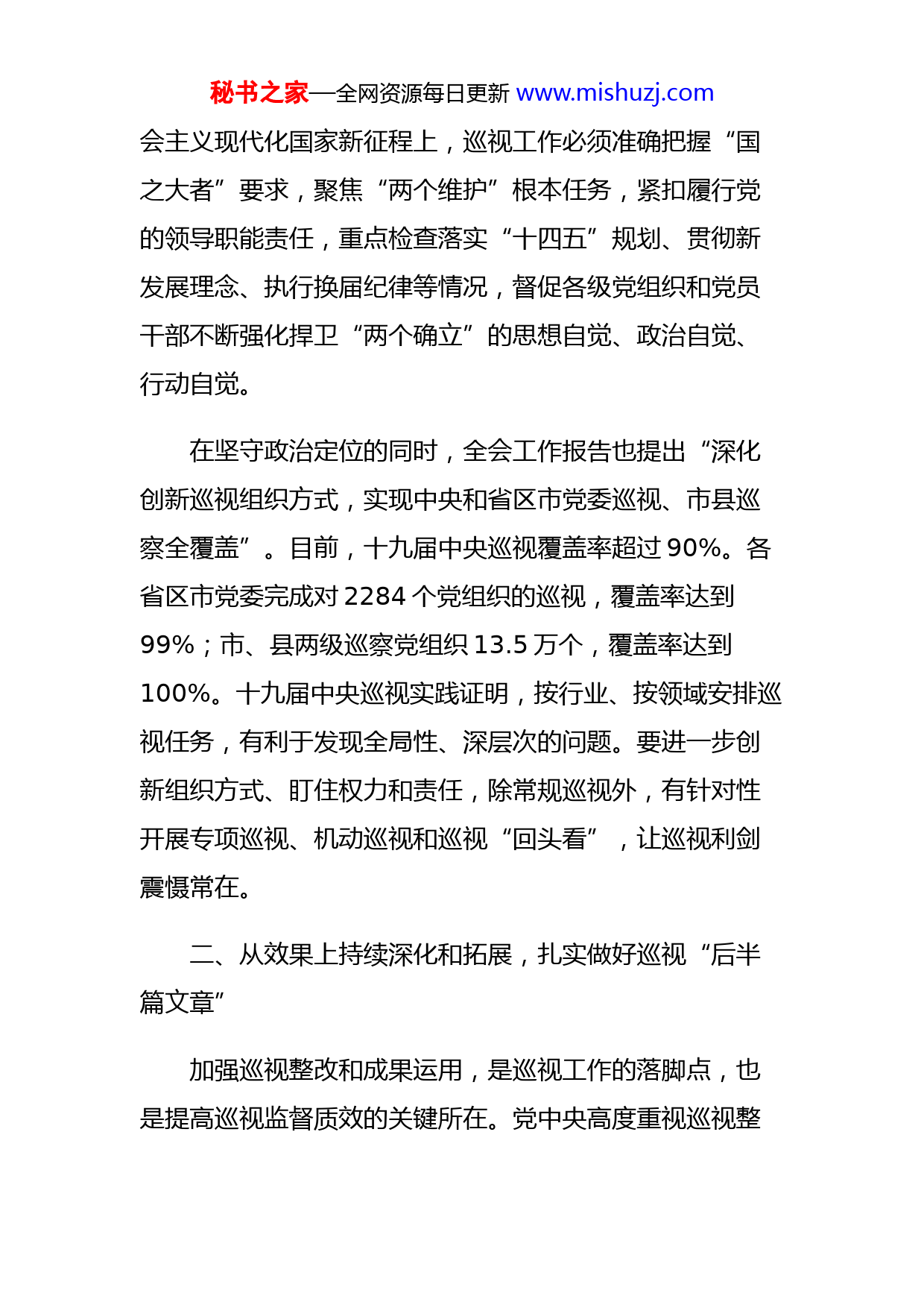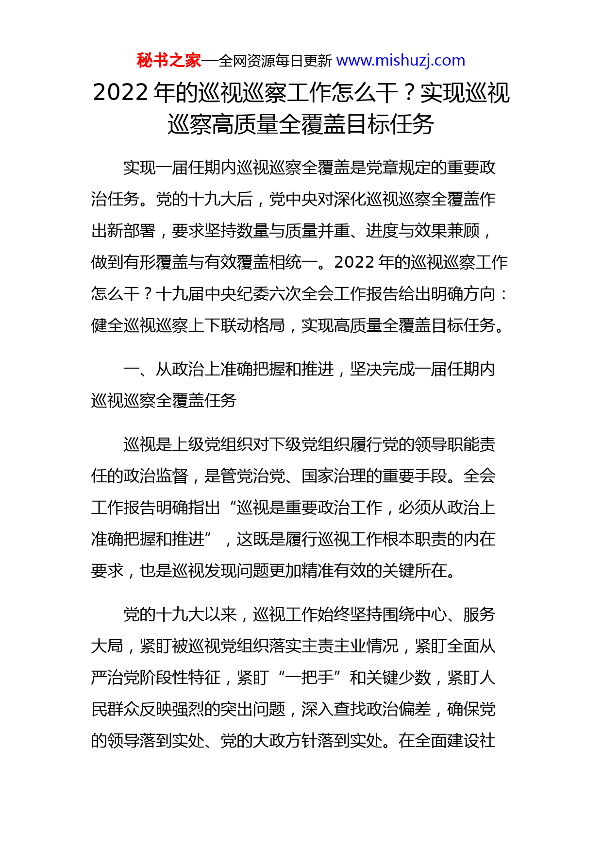秘书之家—全网资源每日更新www.mishuzj.com2022年的巡视巡察工作怎么干?实现巡视巡察高质量全覆盖目标任务实现一届任期内巡视巡察全覆盖是党章规定的重要政治任务。党的十九大后,党中央对深化巡视巡察全覆盖作出新部署,要求坚持数量与质量并重、进度与效果兼顾,做到有形覆盖与有效覆盖相统一。2022年的巡视巡察工作怎么干?十九届中央纪委六次全会工作报告给出明确方向:健全巡视巡察上下联动格局,实现高质量全覆盖目标任务。一、从政治上准确把握和推进,坚决完成一届任期内巡视巡察全覆盖任务巡视是上级党组织对下级党组织履行党的领导职能责任的政治监督,是管党治党、国家治理的重要手段。全会工作报告明确指出“巡视是重要政治工作,必须从政治上准确把握和推进”,这既是履行巡视工作根本职责的内在要求,也是巡视发现问题更加精准有效的关键所在。党的十九大以来,巡视工作始终坚持围绕中心、服务大局,紧盯被巡视党组织落实主责主业情况,紧盯全面从严治党阶段性特征,紧盯“一把手”和关键少数,紧盯人民群众反映强烈的突出问题,深入查找政治偏差,确保党的领导落到实处、党的大政方针落到实处。在全面建设社秘书之家—全网资源每日更新www.mishuzj.com会主义现代化国家新征程上,巡视工作必须准确把握“国之大者”要求,聚焦“两个维护”根本任务,紧扣履行党的领导职能责任,重点检查落实“十四五”规划、贯彻新发展理念、执行换届纪律等情况,督促各级党组织和党员干部不断强化捍卫“两个确立”的思想自觉、政治自觉、行动自觉。在坚守政治定位的同时,全会工作报告也提出“深化创新巡视组织方式,实现中央和省区市党委巡视、市县巡察全覆盖”。目前,十九届中央巡视覆盖率超过90%。各省区市党委完成对2284个党组织的巡视,覆盖率达到99%;市、县两级巡察党组织13.5万个,覆盖率达到100%。十九届中央巡视实践证明,按行业、按领域安排巡视任务,有利于发现全局性、深层次的问题。要进一步创新组织方式、盯住权力和责任,除常规巡视外,有针对性开展专项巡视、机动巡视和巡视“回头看”,让巡视利剑震慑常在。二、从效果上持续深化和拓展,扎实做好巡视“后半篇文章”加强巡视整改和成果运用,是巡视工作的落脚点,也是提高巡视监督质效的关键所在。党中央高度重视巡视整秘书之家—全网资源每日更新www.mishuzj.com改和成果运用,十九届中央纪委历次全会对巡视整改持续作出部署,六次全会工作报告再次强调“推动落实党委(党组)整改主体责任,发挥纪检监察机关、组织部门、巡视机构在整改中的职能作用,强化日常监督和专项检查,督促做好巡视整改‘后半篇文章’”,呼应了2021年12月中央办公厅印发的《关于加强巡视整改和成果运用的意见》,必将进一步推动巡视整改走深走实。从实践看,党的十九大以来,中央巡视工作突出巡视整改和成果运用,推动被巡视党组织落实巡视整改主体责任,明确纪检监察机关、组织部门承担巡视整改日常监督责任,发挥巡视工作领导小组办公室统筹协调、跟踪督促、汇总分析作用,促进巡视整改落实和巡视成果运用,取得明显成效。但要清醒看到,不同层级、不同领域在落实巡视整改、用好巡视成果方面还存在不平衡、不充分问题。持续做好巡视整改工作,就是要坚持效果导向,树立正确的监督政绩观,充分调动发现问题和整改解决问题“两个积极性”,依靠被巡视党组织开展工作,做到同题共答、同向发力,做到监督、整改、治理一体推进,实现政治效果、纪法效果与社会效果有机统一。届末之年,深入抓好十九届中央巡视整改工作意义非凡,正如全会工作报告所强调的“统筹解决新发现的问题和以往巡视整改不秘书之家—全网资源每日更新www.mishuzj.com到位的问题”,新上任的领导干部,不仅要接过权力,也要接下问题整改,把整改融入日常工作、融入深化改革、融入全面从严治党、融入班子队伍建设,强化巡视成果综合运用,以巡促改、以巡促建、以巡促治,决不允许“新官不理旧账”。三、从格局上不断健全和完善,发挥巡视巡察系统优势和综合监督作用党的十九大以来巡视工作深化发展的一个突出特点,是加强巡视巡察上下联动、与其他监督贯通融合。经过这些年不断实践和完善,中央、省、市、县四级巡视巡察工作体系已经正式建立,系统作用和组织优势开始彰显,但上下联动和贯通融合是篇大文章,现在还只是起步。对照《关于加强巡视巡察上下联动的意见》等制度顶层设计,很多新部署新要求还需要在今后一个时期持续抓好贯彻落实。着眼于整体推动全国巡视巡察工作高质量发展的实际需要,着力于构建上下联动、横向贯通的工作格局,六次全会工作报告提出“完善巡视巡察上下联动机制,层层压实责任,发挥巡视巡察系统优势和综合监督作用”的工作部署,并提出了“指导省区市加强对新一届党委巡视工作秘书之家—全网资源每日更新www.mishuzj.com研究谋划,深化对中央单位内部巡视工作分类指导,推动提升对村(社区)巡察实效”等一系列实招。巡视是全面从严治党的利剑,是党委(党组)履行全面监督职责的直接抓手。换届后,新一届党委(党组)巡视巡察工作即将启动。各级党组织从一开始就要对照党中央关于巡视工作的决策部署,把高质量作为价值理念、目标