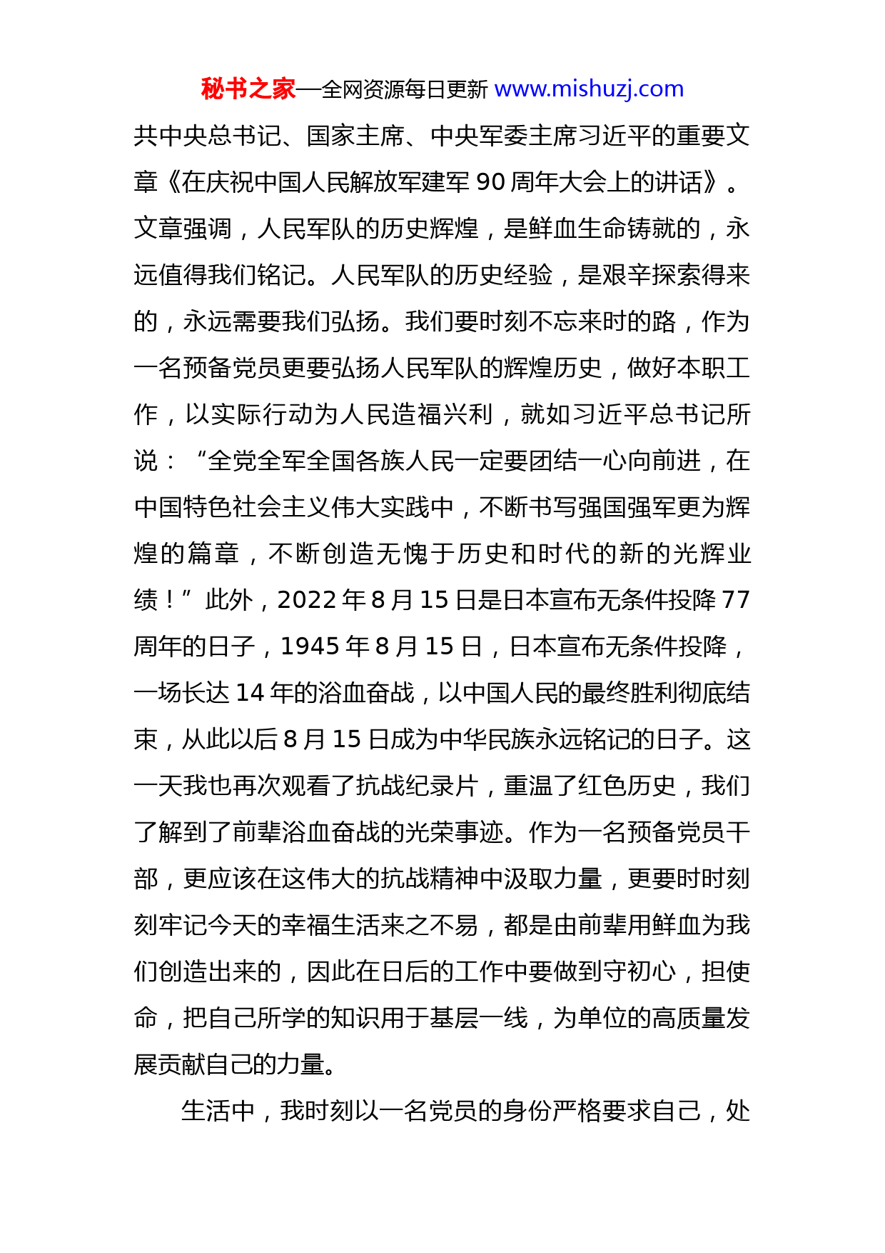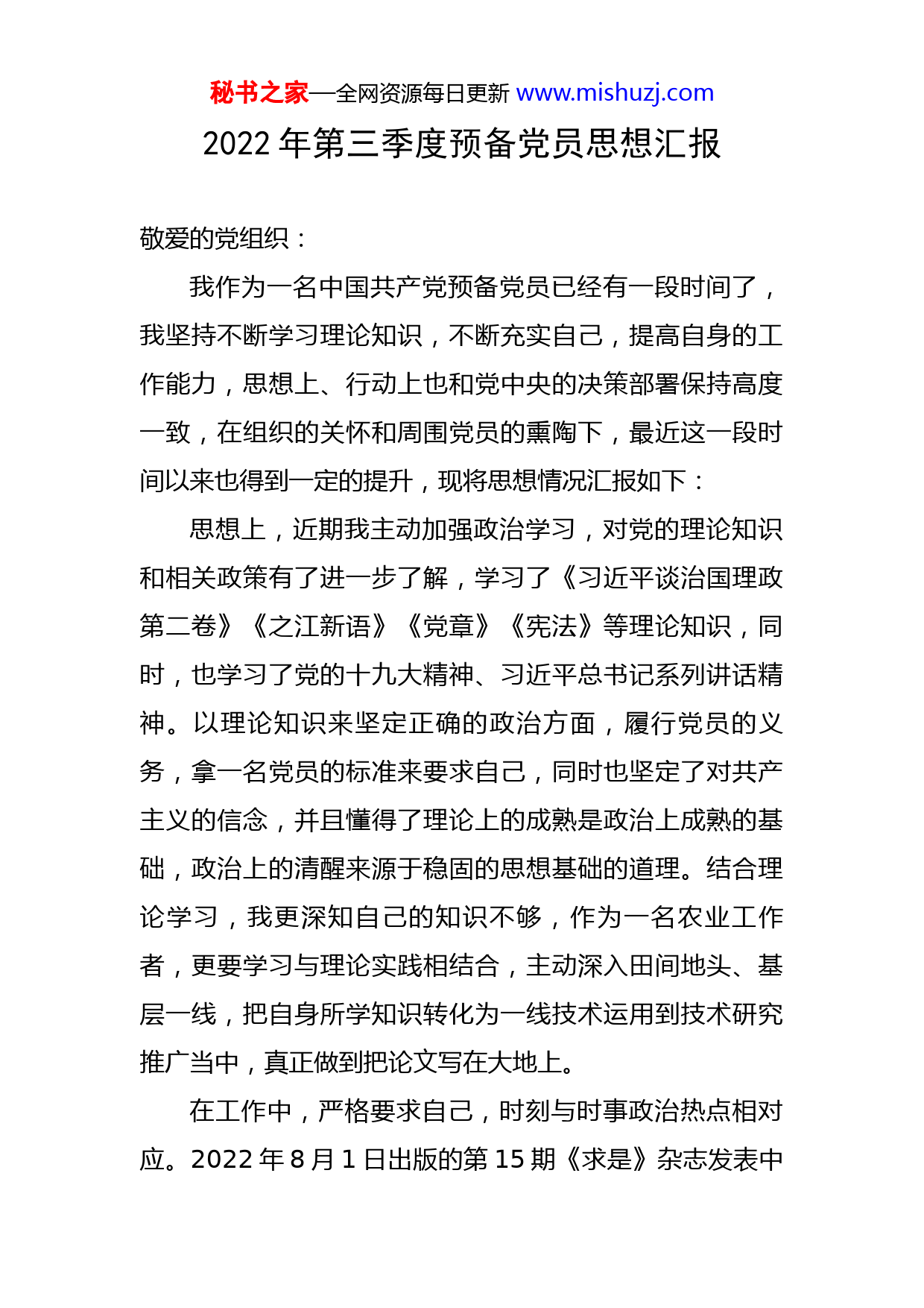 秘书之家—全网资源每日更新www.mishuzj.com2022年第三季度预备党员思想汇报敬爱的党组织:我作为一名中国共产党预备党员已经有一段时间了,我坚持不断学习理论知识,不断充实自己,提高自身的工作能力,思想上、行动上也和党中央的决策部署保持高度一致,在组织的关怀和周围党员的熏陶下,最近这一段时间以来也得到一定的提升,现将思想情况汇报如下:思想上,近期我主动加强政治学习,对党的理论知识和相关政策有了进一步了解,学习了《习近平谈治国理政第二卷》《之江新语》《党章》《宪法》等理论知识,同时,也学习了党的十九大精神、习近平总书记系列讲话精神。以理论知识来坚定正确的政治方面,履行党员的义务,拿一名党员的标准来要求自己,同时也坚定了对共产主义的信念,并且懂得了理论上的成熟是政治上成熟的基础,政治上的清醒来源于稳固的思想基础的道理。结合理论学习,我更深知自己的知识不够,作为一名农业工作者,更要学习与理论实践相结合,主动深入田间地头、基层一线,把自身所学知识转化为一线技术运用到技术研究推广当中,真正做到把论文写在大地上。在工作中,严格要求自己,时刻与时事政治热点相对应。2022年8月1日出版的第15期《求是》杂志发表中秘书之家—全网资源每日更新www.mishuzj.com共中央总书记、国家主席、中央军委主席习近平的重要文章《在庆祝中国人民解放军建军90周年大会上的讲话》。文章强调,人民军队的历史辉煌,是鲜血生命铸就的,永远值得我们铭记。人民军队的历史经验,是艰辛探索得来的,永远需要我们弘扬。我们要时刻不忘来时的路,作为一名预备党员更要弘扬人民军队的辉煌历史,做好本职工作,以实际行动为人民造福兴利,就如习近平总书记所说:“全党全军全国各族人民一定要团结一心向前进,在中国特色社会主义伟大实践中,不断书写强国强军更为辉煌的篇章,不断创造无愧于历史和时代的新的光辉业绩!”此外,2022年8月15日是日本宣布无条件投降77周年的日子,1945年8月15日,日本宣布无条件投降,一场长达14年的浴血奋战,以中国人民的最终胜利彻底结束,从此以后8月15日成为中华民族永远铭记的日子。这一天我也再次观看了抗战纪录片,重温了红色历史,我们了解到了前辈浴血奋战的光荣事迹。作为一名预备党员干部,更应该在这伟大的抗战精神中汲取力量,更要时时刻刻牢记今天的幸福生活来之不易,都是由前辈用鲜血为我们创造出来的,因此在日后的工作中要做到守初心,担使命,把自己所学的知识用于基层一线,为单位的高质量发展贡献自己的力量。生活中,我时刻以一名党员的身份严格要求自己,处秘书之家—全网资源每日更新www.mishuzj.com处以一名党员的标准来衡量自己的言行,从身边小事做起,培养自己良好的生活习惯和道德修养。我注意从平时做起,从小事做起,不怕苦不怕累,脚踏实地,认真工作,经常向老党员和同事学习经验、交流心得。面对问题严格要求自己,对待工作找目标、找路径、找问题、找差距,正视短板,励志在工作岗位上奉献自己的力量。努力做到乐于助人,为他人排忧解难,努力做好一名预备党员的模范带头作用。同时,积极宣传党的思想、理论以及方针路线,坚持正确的原则与立场,并鼓励思想上进的同志积极向党组织靠拢。以上便是我最近一段时间的思想、工作上的汇报。我深知自己还有许多不足之处,比如在理论上缺少实践,专业能力有待加强,做事也缺乏耐心。我将调整状态,以饱满的热情去改掉自身的不足。做一名预备党员,把自己的一切献给党,这是我一生的目标,我愿意接受党组织对自己的进一步考察和考验。我在提出申请转正成为中共正式党员的同时,我也表示:不管个人愿望能否如期实现,我都不会放松自己对党的追求,都不会放弃严以律己、埋头苦干的行为准则与工作作风。请党组织相信我,在今后的路程中,我一定会时刻牢记共产党员的职责,更加严格地要求自己,更加出色地完成组织上交给的各项任务,处处起到共产党员的先锋模范秘书之家—全网资源每日更新www.mishuzj.com作用。此致敬礼!