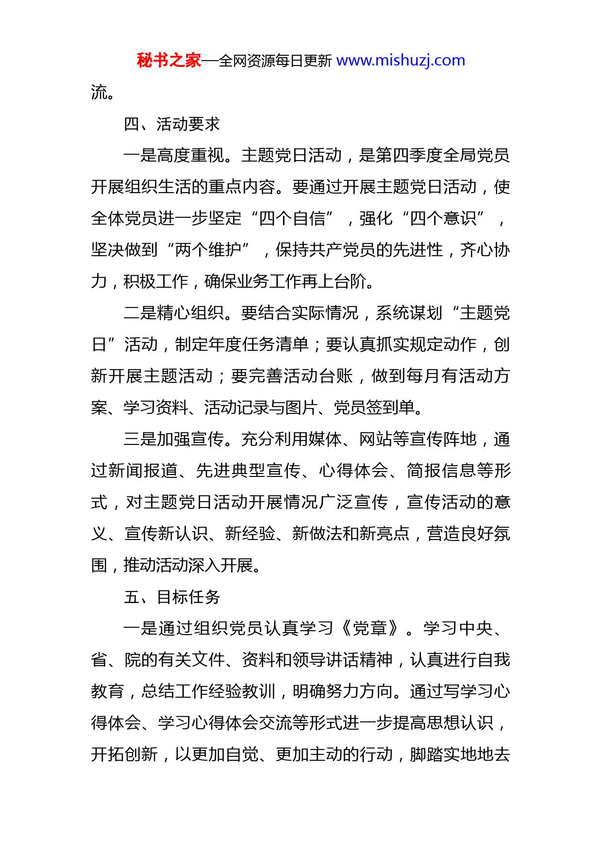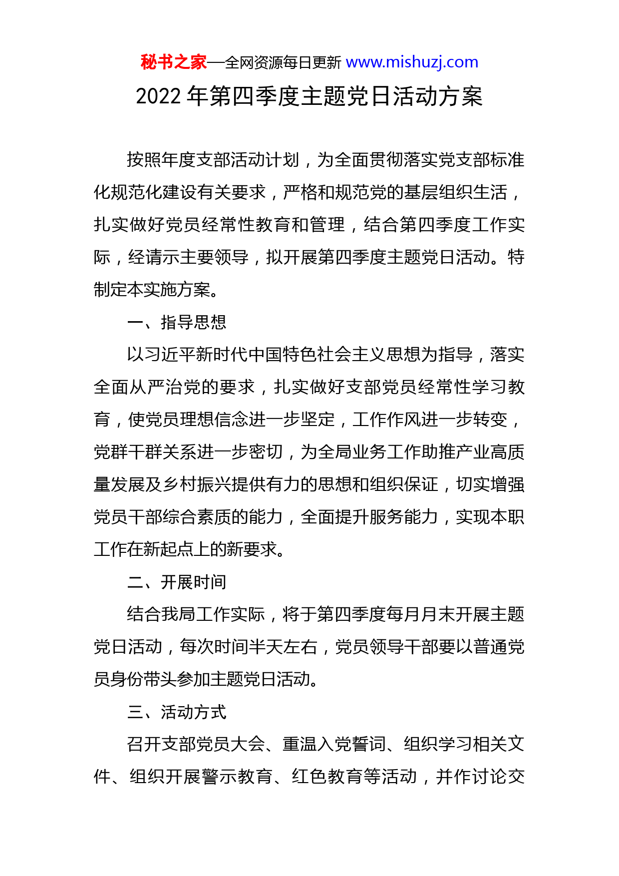 秘书之家—全网资源每日更新www.mishuzj.com2022年第四季度主题党日活动方案按照年度支部活动计划,为全面贯彻落实党支部标准化规范化建设有关要求,严格和规范党的基层组织生活,扎实做好党员经常性教育和管理,结合第四季度工作实际,经请示主要领导,拟开展第四季度主题党日活动。特制定本实施方案。一、指导思想以习近平新时代中国特色社会主义思想为指导,落实全面从严治党的要求,扎实做好支部党员经常性学习教育,使党员理想信念进一步坚定,工作作风进一步转变,党群干群关系进一步密切,为全局业务工作助推产业高质量发展及乡村振兴提供有力的思想和组织保证,切实增强党员干部综合素质的能力,全面提升服务能力,实现本职工作在新起点上的新要求。二、开展时间结合我局工作实际,将于第四季度每月月末开展主题党日活动,每次时间半天左右,党员领导干部要以普通党员身份带头参加主题党日活动。三、活动方式召开支部党员大会、重温入党誓词、组织学习相关文件、组织开展警示教育、红色教育等活动,并作讨论交秘书之家—全网资源每日更新www.mishuzj.com流。四、活动要求一是高度重视。主题党日活动,是第四季度全局党员开展组织生活的重点内容。要通过开展主题党日活动,使全体党员进一步坚定“四个自信”,强化“四个意识”,坚决做到“两个维护”,保持共产党员的先进性,齐心协力,积极工作,确保业务工作再上台阶。二是精心组织。要结合实际情况,系统谋划“主题党日”活动,制定年度任务清单;要认真抓实规定动作,创新开展主题活动;要完善活动台账,做到每月有活动方案、学习资料、活动记录与图片、党员签到单。三是加强宣传。充分利用媒体、网站等宣传阵地,通过新闻报道、先进典型宣传、心得体会、简报信息等形式,对主题党日活动开展情况广泛宣传,宣传活动的意义、宣传新认识、新经验、新做法和新亮点,营造良好氛围,推动活动深入开展。五、目标任务一是通过组织党员认真学习《党章》。学习中央、省、院的有关文件、资料和领导讲话精神,认真进行自我教育,总结工作经验教训,明确努力方向。通过写学习心得体会、学习心得体会交流等形式进一步提高思想认识,开拓创新,以更加自觉、更加主动的行动,脚踏实地地去秘书之家—全网资源每日更新www.mishuzj.com努力工作。二是通过组织开展警示教育活动。进一步理解领会加强政治建设和作风建设的重要意义,树牢政治意识,组织学习《中国共产党纪律处分条例》《中国共产党廉洁自律准则》《中国共产党党内监督条例》《中国共产党问责条例》,切实增强严格遵守廉洁纪律的思想自觉、政治自觉和行动自觉。三是开展交流发言讨论。与会党员以党的政治建设为统领,着力深化理论武装,自觉提高政治站位,树牢“四个意识”,增强忧患意识,严格自身要求,结合学习和工作实际开展交流讨论。六、活动内容1.重温入党誓词。全体党员列队面向党旗,由领誓人逐句领读誓词,全体党员齐声跟读,领誓人原则上由党支部书记担任。2.组织学习。一是学习党章党规等相关。重点学习《中国共产党章程》《党内政治生活准则》等,引导党员在思想上强化身份意识,自觉履行党员义务,严格遵守党的政治纪律和政治规矩,时刻保持思想自觉、行动自觉,深刻领会党章修订的重大意义和重要内容,更加自觉地学习党章、遵守党章、贯彻党章、维护党章,做合格党员、当干事先锋。二是学习习近平新时代中国特色社会主义新思秘书之家—全网资源每日更新www.mishuzj.com想、习近平谈治国理政,以新思想武装全局党员干部头脑,提高党性认识。三是学习上级重要会议及重要文件精神,加强思想和行动统一,更加扎实地把中央、省委、市委和县委的各项决策部署要求落到实处。3.交纳党费。全体党员要交纳每月党费,由支部委员统一收缴,如实填写党费证,并做好党费公示。4.过好组织生活。把开展”主题党日”与落实”三会一课”、组织生活会、民主评议党员等基本制度融合起来,时刻保持思想自觉、行动自觉。党支部在完成规定动作基础上,可结合单位重点工作,丰富活动形式,或请先进典型上党课,或组织党员到红色教育基地、党建示范点等进行现场教学,或开展技能比武等活动,着力提升主题党日活动效果。