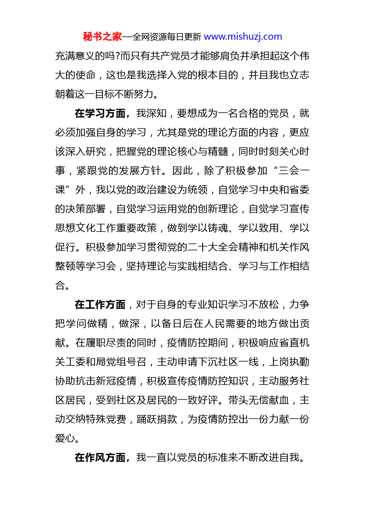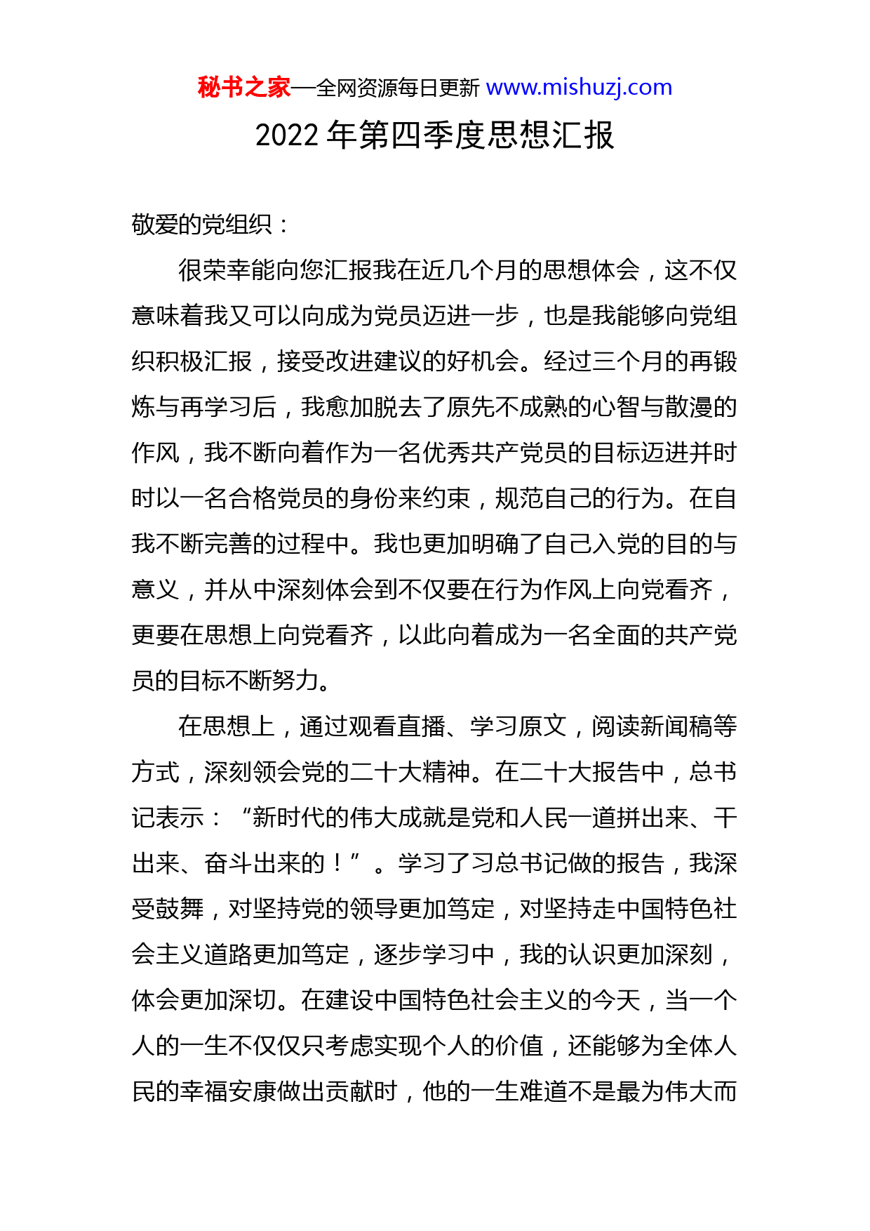 秘书之家—全网资源每日更新www.mishuzj.com2022年第四季度思想汇报敬爱的党组织:很荣幸能向您汇报我在近几个月的思想体会,这不仅意味着我又可以向成为党员迈进一步,也是我能够向党组织积极汇报,接受改进建议的好机会。经过三个月的再锻炼与再学习后,我愈加脱去了原先不成熟的心智与散漫的作风,我不断向着作为一名优秀共产党员的目标迈进并时时以一名合格党员的身份来约束,规范自己的行为。在自我不断完善的过程中。我也更加明确了自己入党的目的与意义,并从中深刻体会到不仅要在行为作风上向党看齐,更要在思想上向党看齐,以此向着成为一名全面的共产党员的目标不断努力。在思想上,通过观看直播、学习原文,阅读新闻稿等方式,深刻领会党的二十大精神。在二十大报告中,总书记表示:“新时代的伟大成就是党和人民一道拼出来、干出来、奋斗出来的!”。学习了习总书记做的报告,我深受鼓舞,对坚持党的领导更加笃定,对坚持走中国特色社会主义道路更加笃定,逐步学习中,我的认识更加深刻,体会更加深切。在建设中国特色社会主义的今天,当一个人的一生不仅仅只考虑实现个人的价值,还能够为全体人民的幸福安康做出贡献时,他的一生难道不是最为伟大而秘书之家—全网资源每日更新www.mishuzj.com充满意义的吗?而只有共产党员才能够肩负并承担起这个伟大的使命,这也是我选择入党的根本目的,并且我也立志朝着这一目标不断努力。在学习方面,我深知,要想成为一名合格的党员,就必须加强自身的学习,尤其是党的理论方面的内容,更应该深入研究,把握党的理论核心与精髓,同时时刻关心时事,紧跟党的发展方针。因此,除了积极参加“三会一课”外,我以党的政治建设为统领,自觉学习中央和省委的决策部署,自觉学习运用党的创新理论,自觉学习宣传思想文化工作重要政策,做到学以铸魂、学以致用、学以促行。积极参加学习贯彻党的二十大全会精神和机关作风整顿等学习会,坚持理论与实践相结合、学习与工作相结合。在工作方面,对于自身的专业知识学习不放松,力争把学问做精,做深,以备日后在人民需要的地方做出贡献。在履职尽责的同时,疫情防控期间,积极响应省直机关工委和局党组号召,主动申请下沉社区一线,上岗执勤协助抗击新冠疫情,积极宣传疫情防控知识,主动服务社区居民,受到社区及居民的一致好评。带头无偿献血,主动交纳特殊党费,踊跃捐款,为疫情防控出一份力献一份爱心。在作风方面,我一直以党员的标准来不断改进自我。秘书之家—全网资源每日更新www.mishuzj.com共产党人是党性人、个性人和社会人的结合体,要能够为了集体利益牺牲个人的局部的利益,有团结协作,顾全大局的精神。坚持抓好理论武装,注重自我改造,自觉做到政治上不说糊涂话、不做出格的事。在处世为人上,坚持做到自严、自律、自尊、自爱、慎独、慎微、慎始、慎终,时刻提醒自己无职无权时不奢望、手中有权时不张狂,既保持向上向善的良知,又坚持处事为人的理性。在处理工作关系上,注意摆正自己的位置,做到宽容待人、宽厚用人,公正办事、公平处事,尽心尽力为大家办好事、办实事。近段时期在取得一定进步的同时,还有许多方面仍然需要改进:一是虽然不断规范自己向党员看齐,却缺乏有效长久的毅力,在有些时候,存在暂时的松懈与茫然。二是在对党的理论学习方面仍远远不够,对党的理论研究仍有待加强。三是在业务方面,我仍然有很大潜力,需要我在今后投入更多的精力,并掌握科学的学习方法,让自己成为一个用专业知识武装头脑的人。在今后的继续发展中,我感到一定要时刻以一名党员的标准来衡量自己,以一名党员的条件严格要求自己,在周围同志当中时时处处体现出先锋模范作用,只有这样才能有资格加入这个光荣而先进的组织。请党支部继续培养和考察我,我将会以实际行动来接受党组织的挑选,积极秘书之家—全网资源每日更新www.mishuzj.com主动地为人民服务,为经济发展和社会进步做出贡献,争取早日成为一名正式合格的共产党员。此致。敬礼!汇报人:xxx20xx年x月x日