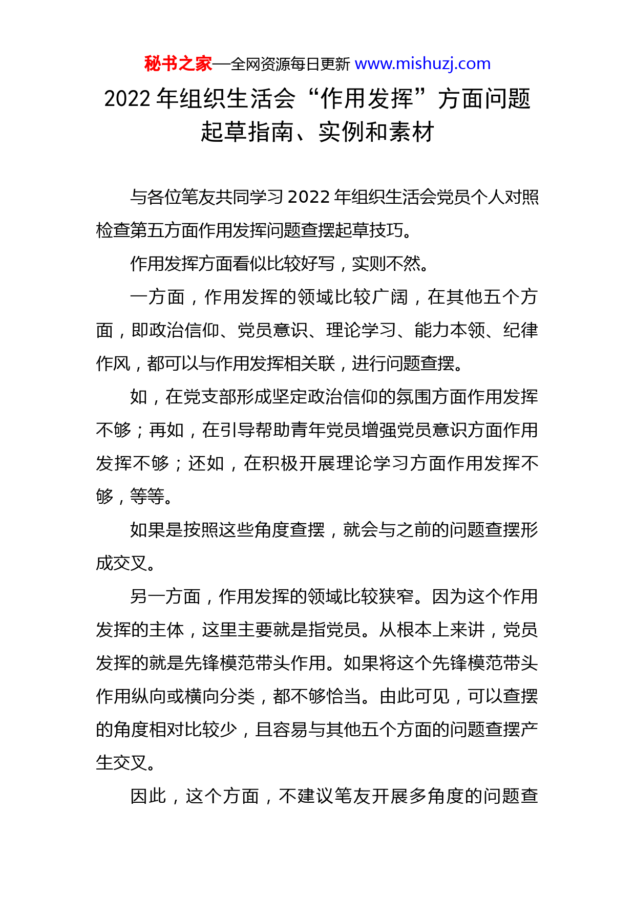秘书之家—全网资源每日更新www.mishuzj.com2022年组织生活会“作用发挥”方面问题起草指南、实例和素材与各位笔友共同学习2022年组织生活会党员个人对照检查第五方面作用发挥问题查摆起草技巧。作用发挥方面看似比较好写,实则不然。一方面,作用发挥的领域比较广阔,在其他五个方面,即政治信仰、党员意识、理论学习、能力本领、纪律作风,都可以与作用发挥相关联,进行问题查摆。如,在党支部形成坚定政治信仰的氛围方面作用发挥不够;再如,在引导帮助青年党员增强党员意识方面作用发挥不够;还如,在积极开展理论学习方面作用发挥不够,等等。如果是按照这些角度查摆,就会与之前的问题查摆形成交叉。另一方面,作用发挥的领域比较狭窄。因为这个作用发挥的主体,这里主要就是指党员。从根本上来讲,党员发挥的就是先锋模范带头作用。如果将这个先锋模范带头作用纵向或横向分类,都不够恰当。由此可见,可以查摆的角度相对比较少,且容易与其他五个方面的问题查摆产生交叉。因此,这个方面,不建议笔友开展多角度的问题查秘书之家—全网资源每日更新www.mishuzj.com摆。如果是支部书记或委员,可以从职务的角度出发,进行问题查摆,不容易产生交叉的问题。这里,笔友提供几个角度,供各位笔友参考。举例:1.对自身作用发挥的重要性认识不足。有时认为自己只是一名普通党员,只要做好本职工作就可以了,在想问题、促团结、优服务的过程中,没有从在生产、工作、学习和社会生活中发挥党员先锋模范带头作用的层面出发,时刻绷紧自己是党的形象代言人这根弦,有时在思想和行动上,存在“慢人一拍”的问题,作用发挥不够到位。践行“一党员一面旗”的政治要求不够严实,对自身的素质、意识、言行的自我检视不够及时和深入,自己党员的良好形象在日常工作和生活中体现得不够明显。面对日复一日的平凡工作,有时心生懈怠,认为平凡的工作没有成就感,忽略了党和国家不平凡的事业、伟大的功绩,都凝聚着基层党员平凡的工作成果,对自身作用发挥缺乏认同感。2.党员“传帮带”作用发挥不够到位。自己作为老党员,有时只顾提升自身的党性修养,对青年党员关注度不够,未能有效发挥出老党员的“传帮带”作用。特别是在开展党性分析、党性体检和党性教育的过程中,对于青年党员在言行和工作中的缺点,缺少帮助他们了解、改正错秘书之家—全网资源每日更新www.mishuzj.com误的思想自觉和行动自觉,对于他们身上存在的苗头性、倾向性的问题,有时担心批评过重会影响他们的身心和成长,就没有从党性原则、党性修养、党性锻炼的层面上,严肃认真地开展谈心谈话,提建议往往蜻蜓点水,点到为止,使一些青年党员未能及时改正自身的不足。作用发挥方面素材,共8条。1.在基层,党员作为党的形象代言人,其言行举止都时刻代表着中国共产党的形象,基层党员是与人民群众在日常生活中直接接触的,尤其是在企业,更多党员是在基层班组中,无论工作生活都是与人民群众距离最近的,是人民群众对中国共产党的最直接的印象,人民群众对中国共产党的基本认识、印象、看法等首先来自于基层党员。2.正所谓“一党员一面旗”,因此基层党员的素质、意识、言行等,都影响到这面旗帜是否能真正树立起来。3.“空谈误国实干兴邦”,基层党员一定要立足自身岗位,不断提升技能水平,干实事,有作为。基层党员身处平凡的岗位,真正把自己的工作做实做好了,就是在平凡的工作中成就不平凡的事业。工作是日复一日年复一年的,存在很多重复,坚持做好肯定是很难的,但这也正是对每位党员的考验。4.作为合格党员,必须迎难而上,勇为人先,成为企业攻坚克难的标兵。在实际工作中,支部应融合中心任务,秘书之家—全网资源每日更新www.mishuzj.com创新开展一些攻关项目,让党员带头攻关,敢啃硬骨头,比如一些关键的生产难点、工艺指标、管理问题等,既能焕发党员的党性,又能培养党员解决难题的能力,发挥先锋模范作用。5.党员意识是根本,根本在恒党员意识是共产党员思想觉悟和党性修养的集中表现,是共产党员思想上的“身份证”和精神上的标志,是共产党员的立身之本,“两学一做”学习教育把强化党员意识作为重要的着力点之一,唤醒沉睡的党员意识。6.“四讲四有”要入心。讲政治、有信念,做到心中有党;讲规矩、有纪律,做到心中有戒;讲道德、有品行,做到心中有德;讲奉献、有作为,做到心中有责。我们要特别注意“心中”二字“,四讲四有”是在“心中”的,绝不是挂在嘴上的。“四讲四有”是新时期做合格共产党员的标准,既然是标准,作为党员一定要入脑、入心、入骨髓,才能真正践行标准,做真正的合格共产党员。心中有标准,就能时刻给党员以警醒,党员意识自然就能得到提升。7.定期开展党性分析、党性体检和党性教育,让党员思想“不掉线”,使党员成为研究院高质量发展的红色引擎。8.坚持用身边榜样教育。感染身边人,通过树立标杆人秘书之家—全网资源每日更新www.mishuzj.com物、宣传标杆事迹、发挥标杆作用等措施,激发党员干部的创造性和工作热情,推动研究院高质量发展。