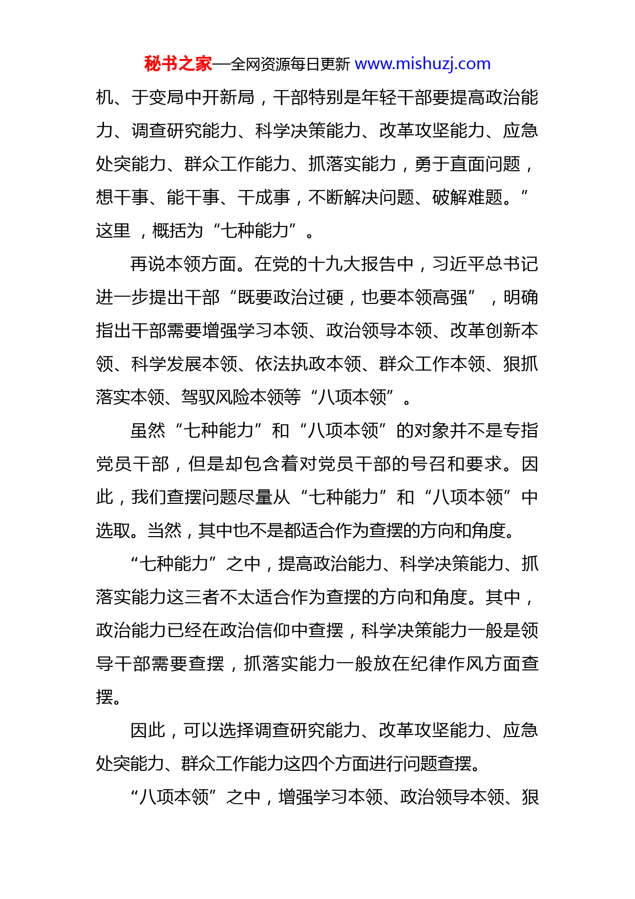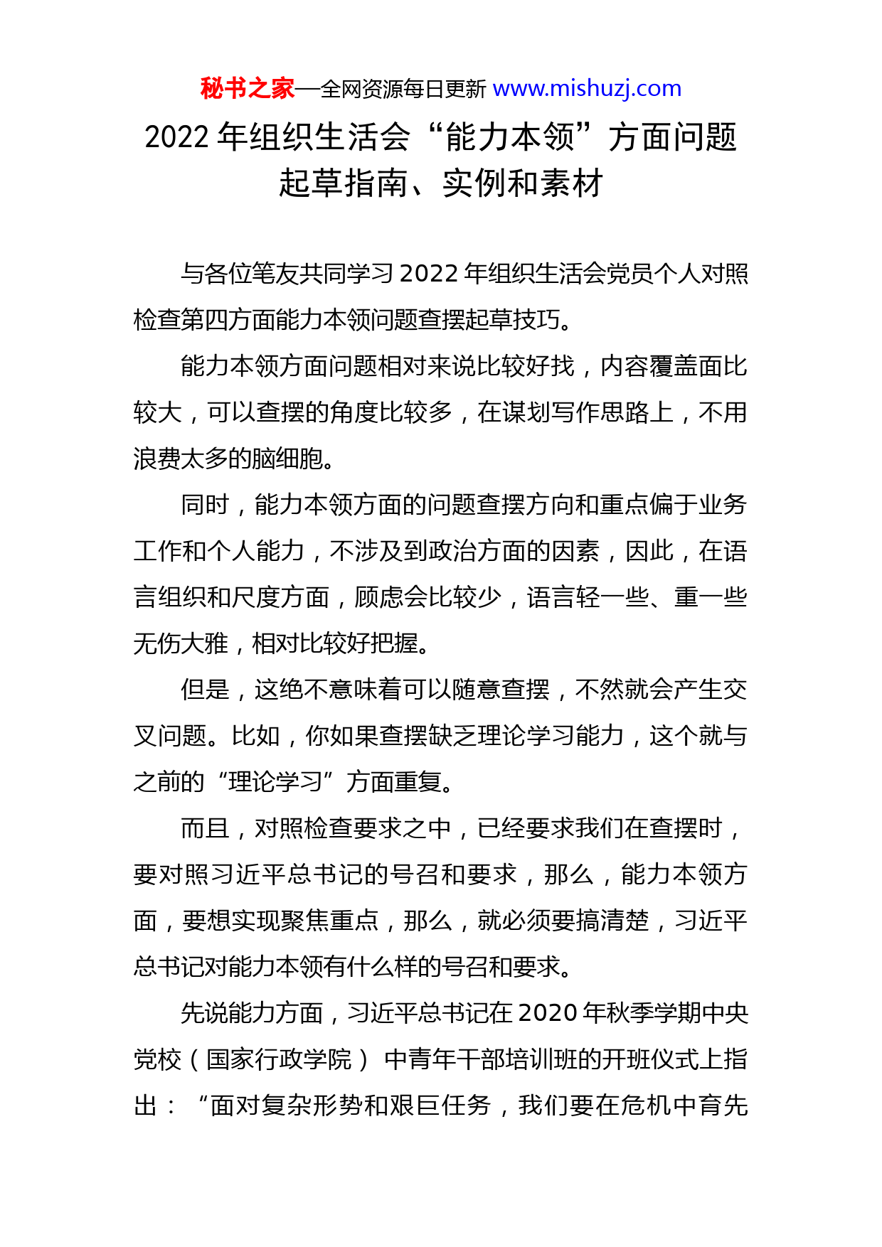 秘书之家—全网资源每日更新www.mishuzj.com2022年组织生活会“能力本领”方面问题起草指南、实例和素材与各位笔友共同学习2022年组织生活会党员个人对照检查第四方面能力本领问题查摆起草技巧。能力本领方面问题相对来说比较好找,内容覆盖面比较大,可以查摆的角度比较多,在谋划写作思路上,不用浪费太多的脑细胞。同时,能力本领方面的问题查摆方向和重点偏于业务工作和个人能力,不涉及到政治方面的因素,因此,在语言组织和尺度方面,顾虑会比较少,语言轻一些、重一些无伤大雅,相对比较好把握。但是,这绝不意味着可以随意查摆,不然就会产生交叉问题。比如,你如果查摆缺乏理论学习能力,这个就与之前的“理论学习”方面重复。而且,对照检查要求之中,已经要求我们在查摆时,要对照习近平总书记的号召和要求,那么,能力本领方面,要想实现聚焦重点,那么,就必须要搞清楚,习近平总书记对能力本领有什么样的号召和要求。先说能力方面,习近平总书记在2020年秋季学期中央党校(国家行政学院)中青年干部培训班的开班仪式上指出:“面对复杂形势和艰巨任务,我们要在危机中育先秘书之家—全网资源每日更新www.mishuzj.com机、于变局中开新局,干部特别是年轻干部要提高政治能力、调查研究能力、科学决策能力、改革攻坚能力、应急处突能力、群众工作能力、抓落实能力,勇于直面问题,想干事、能干事、干成事,不断解决问题、破解难题。”这里,概括为“七种能力”。再说本领方面。在党的十九大报告中,习近平总书记进一步提出干部“既要政治过硬,也要本领高强”,明确指出干部需要增强学习本领、政治领导本领、改革创新本领、科学发展本领、依法执政本领、群众工作本领、狠抓落实本领、驾驭风险本领等“八项本领”。虽然“七种能力”和“八项本领”的对象并不是专指党员干部,但是却包含着对党员干部的号召和要求。因此,我们查摆问题尽量从“七种能力”和“八项本领”中选取。当然,其中也不是都适合作为查摆的方向和角度。“七种能力”之中,提高政治能力、科学决策能力、抓落实能力这三者不太适合作为查摆的方向和角度。其中,政治能力已经在政治信仰中查摆,科学决策能力一般是领导干部需要查摆,抓落实能力一般放在纪律作风方面查摆。因此,可以选择调查研究能力、改革攻坚能力、应急处突能力、群众工作能力这四个方面进行问题查摆。“八项本领”之中,增强学习本领、政治领导本领、狠秘书之家—全网资源每日更新www.mishuzj.com抓落实本领这五者不太适合作为查摆的方向和角度。其中,学习本领在理论学习中进行了查摆,政治领导本领一般是领导干部查摆,抓落实的本领一般放在纪律作风方面查摆,因此,可以选择改革创新本领、科学发展本领、依法执政本领、群众工作本领、驾驭风险本领等“八项本领”。其中,依法执行这个方面,大多只涉及到行政执法部门,且这个角度问题尺度不太好把握,建议不将其作为问题查摆的方面。综上,我们可以从调查研究能力、改革攻坚能力、应急处突能力、群众工作能力、改革创新本领、科学发展本领、群众工作本领、驾驭风险本领共8个角度进行问题查摆。通过合并同类项,最终保留调查研究、改革创新、群众工作、应急处突、驾驭风险、科学发展共6个角度进行问题查摆。当然,这是将能力本领从横向进行了分类,也可以从纵向以逻辑的形式进行分类查摆问题。如距离提高“七种能力”和“八项本领”的要求有差距等。举例:1.距离提高“七种能力”和“八项本领”的要求有差距。未能将提高自身的“七种能力”和“八项本领”作为政治要求和政治责任,认为学习仅仅是自己的事情,本领大小也不仅仅是自己的事情,没有站在党和国家事业发展秘书之家—全网资源每日更新www.mishuzj.com的大事情的高度,放在国家治理现代化的大局和进程中把握和践行,责任感不够强,热情度不够高,方法不够多,有时只注重提高其中的一种能力或一项本领,未能将其融会贯通,找出共同提高的规律和方法,全方位锤炼自身各方面能力不够科学有效,自己的工作本领与岗位职责没有达到完全匹配,实事求是地讲,自身的能力本领没有很好地适应中国式现代化建设的需要。2.调查研究不够有效。调查研究的方法不够科学,目的性和针对性不强,坚持问题导向不足,缺少把一件事、一个问题打破沙锅问到底、问清楚的“较真”精神,对一些问题和事物内在的本质和规律把握不全面、不精准、不到位,拿出的解决问题的路径和办法不够丰富和有效。调研方式不够“接地气”,未能充分凝聚人民群众的智慧和力量;对发现的问题分析研究不够深入,没有及时将调研成果上升为决策部署,转化为具体措施。如,聚焦省市县高度重视、社会高度关注、群众反映强烈的重大问题进行了调研,在调研成果转换时,没有将加强顶层设计和坚持问计于民统一起来,提出的决策建议不够科学有效。3.改革攻坚的意识和能力不强。政治站位不够高,未能将视野放在进入新发展阶段,贯彻新发展理念,构建新发展格局,需要解决的问题会越来越多样、越来越复杂的角度,看待改革攻坚的重要性、紧迫性和必要性,“国之大秘书之家—全网资源每日更新www.mishuzj.com者”意识不足,缺少主动融入的意识。对于推进中国式现代化建设缺少