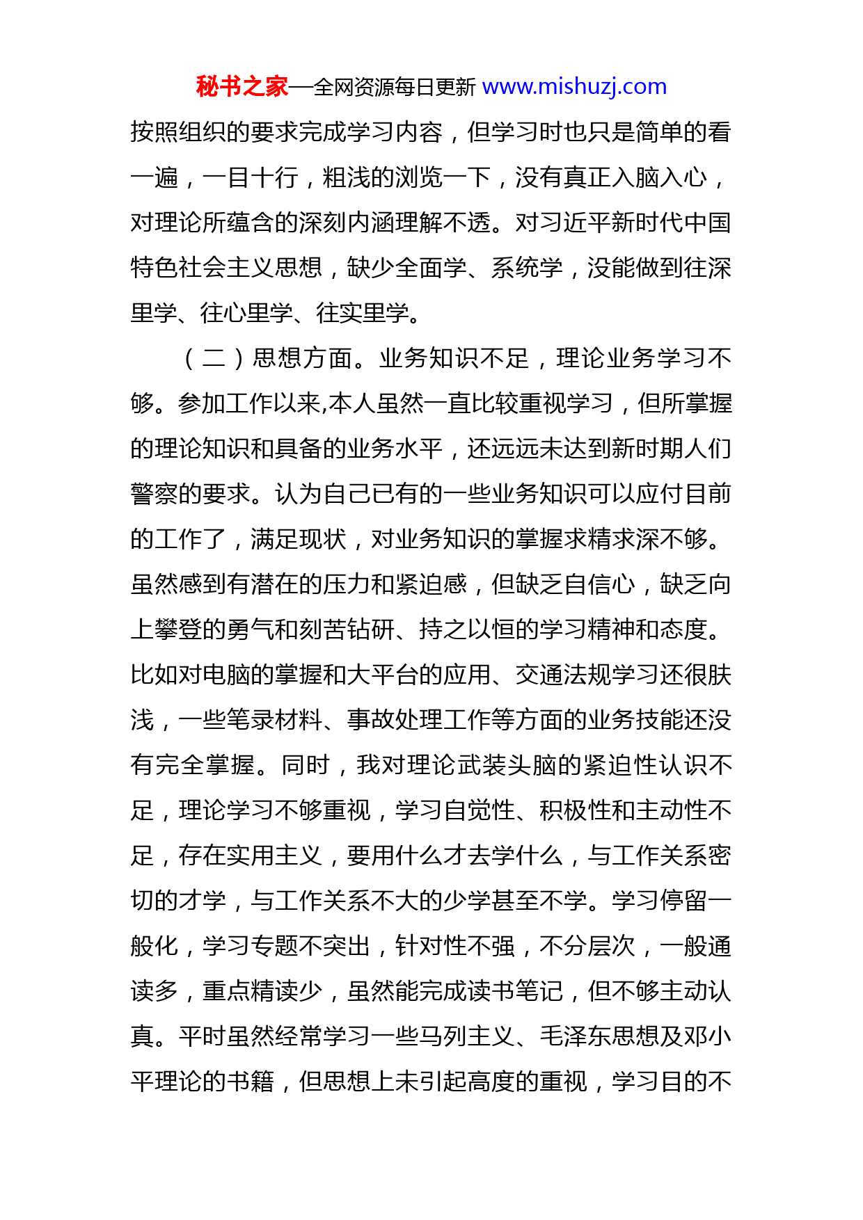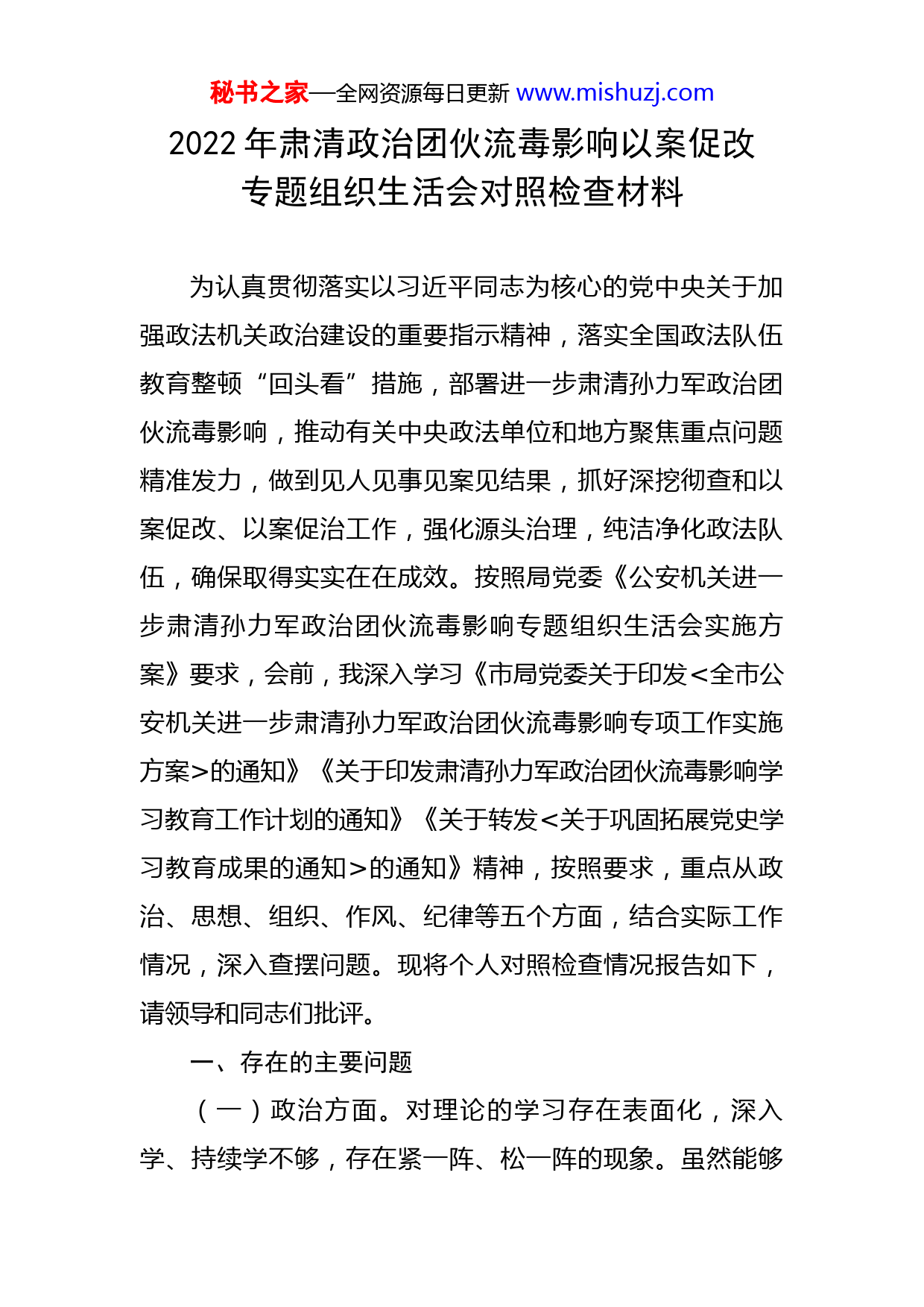 秘书之家—全网资源每日更新www.mishuzj.com2022年肃清政治团伙流毒影响以案促改专题组织生活会对照检查材料为认真贯彻落实以习近平同志为核心的党中央关于加强政法机关政治建设的重要指示精神,落实全国政法队伍教育整顿“回头看”措施,部署进一步肃清孙力军政治团伙流毒影响,推动有关中央政法单位和地方聚焦重点问题精准发力,做到见人见事见案见结果,抓好深挖彻查和以案促改、以案促治工作,强化源头治理,纯洁净化政法队伍,确保取得实实在在成效。按照局党委《公安机关进一步肃清孙力军政治团伙流毒影响专题组织生活会实施方案》要求,会前,我深入学习《市局党委关于印发<全市公安机关进一步肃清孙力军政治团伙流毒影响专项工作实施方案>的通知》《关于印发肃清孙力军政治团伙流毒影响学习教育工作计划的通知》《关于转发<关于巩固拓展党史学习教育成果的通知>的通知》精神,按照要求,重点从政治、思想、组织、作风、纪律等五个方面,结合实际工作情况,深入查摆问题。现将个人对照检查情况报告如下,请领导和同志们批评。一、存在的主要问题(一)政治方面。对理论的学习存在表面化,深入学、持续学不够,存在紧一阵、松一阵的现象。虽然能够秘书之家—全网资源每日更新www.mishuzj.com按照组织的要求完成学习内容,但学习时也只是简单的看一遍,一目十行,粗浅的浏览一下,没有真正入脑入心,对理论所蕴含的深刻内涵理解不透。对习近平新时代中国特色社会主义思想,缺少全面学、系统学,没能做到往深里学、往心里学、往实里学。(二)思想方面。业务知识不足,理论业务学习不够。参加工作以来,本人虽然一直比较重视学习,但所掌握的理论知识和具备的业务水平,还远远未达到新时期人们警察的要求。认为自己已有的一些业务知识可以应付目前的工作了,满足现状,对业务知识的掌握求精求深不够。虽然感到有潜在的压力和紧迫感,但缺乏自信心,缺乏向上攀登的勇气和刻苦钻研、持之以恒的学习精神和态度。比如对电脑的掌握和大平台的应用、交通法规学习还很肤浅,一些笔录材料、事故处理工作等方面的业务技能还没有完全掌握。同时,我对理论武装头脑的紧迫性认识不足,理论学习不够重视,学习自觉性、积极性和主动性不足,存在实用主义,要用什么才去学什么,与工作关系密切的才学,与工作关系不大的少学甚至不学。学习停留一般化,学习专题不突出,针对性不强,不分层次,一般通读多,重点精读少,虽然能完成读书笔记,但不够主动认真。平时虽然经常学习一些马列主义、毛泽东思想及邓小平理论的书籍,但思想上未引起高度的重视,学习目的不秘书之家—全网资源每日更新www.mishuzj.com够明确,学习时缺乏思考,只从字面上理解,使自己的理论知识与实际脱钩,理论联系实际不够,学用脱节,运用理论指导实践的意识不强,没有充分把理论和实践有机联系起来,运用马克思主义的立场、观点、方法来分析和解决问题、指导工作、提高工作水平。(三)组织方面。在落实中央、省、市、县委的重大思路和重大决策中,坚定不移,有持之以恒抓落实的决心和勇气。但是有存在落实方法上办法不多,思路不宽,缺少创新意识的问题。表现在工作上,满足于机械完成任务,不求高标准、高质量,思想上总认为,机关人员缺乏,能够完成任务就不错了。满足于工作平平常常、按部就班,导致出现工作落实上有不到位、缺位的现象。有的干部不注重法律法规知识学习靠老资本,靠经验处理一些问题。(四)作风方面。工作作风不够扎实,开拓创新意识不够,领导艺术有待进一步提高。本人以前往往是领导安排什么工作就干什么,临时性的工作和活动较多,主动考虑工作还有欠缺,对自己的工作缺乏系统的考虑和研究;在处理领导与同志们的关系方面,为顾及面子往往自我批评多一些,忽视对同志的批评,存在“老好人”思想;埋头干工作多,主动向领导汇报工作和思想少;与同志们谈心交流不够,谈思想、交流业务较少。表现在:对待工作秘书之家—全网资源每日更新www.mishuzj.com有时报有应付了事的态度,没有做到脚踏实地,总想在工作中找到捷径,最好不要花费太多的精力就可以把事情做好。有时由于私心作怪,存在“多做多错,少做少错,不做不错”的态度,除了自己必需完成的以外,可以不做的就不做,省得惹祸上身。(五)纪律方面。为人民服务宗旨意识不够牢固。没有把为人民服务作为最高的价值标准和人生追求。认为共产党人要为人民服务,但不可能全心全意,更不会是最高的价值标准和人生追求,认为自己虽然是一名共产党员,但能力有限,职位有限,只能过一种平平静静、平平安安、平平淡淡的日子,只能是既没有大作为,也不会轰轰烈烈。政治思想认识不能紧跟形势的要求。每次除了参加上级和单位组织的学习外,只是看文件,连报纸,电视新闻等也很少顾及,更谈不上学习政治理论书籍。因而,世界观的改造也就不能及时与党的理论要求相结合,存在的私心杂念也就不能及时清除。因此,在工作生活中虽然与民警职工们有一定感情,但亲民爱民的思想树立得并不牢固。不能始终与群众心贴心,做到心里装着群众,凡事想着群众,工作依靠群众,一切为了群众,做群众的贴心人。不能牢记权力只能用来为人民谋利益,绝不能变成谋取个人和小团体利益的工具,