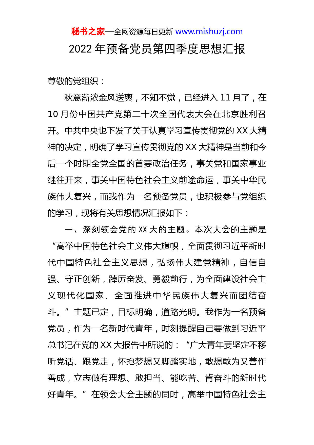 秘书之家—全网资源每日更新www.mishuzj.com2022年预备党员第四季度思想汇报尊敬的党组织:秋意渐浓金风送爽,不知不觉,已经进入11月了,在10月份中国共产党第二十次全国代表大会在北京胜利召开。中共中央也下发了关于认真学习宣传贯彻党的XX大精神的决定,明确了学习宣传贯彻党的XX大精神是当前和今后一个时期全党全国的首要政治任务,事关党和国家事业继往开来,事关中国特色社会主义前途命运,事关中华民族伟大复兴,而我作为一名预备党员,也积极参与党组织的学习,现将有关思想情况汇报如下:一、深刻领会党的XX大的主题。本次大会的主题是“高举中国特色社会主义伟大旗帜,全面贯彻习近平新时代中国特色社会主义思想,弘扬伟大建党精神,自信自强、守正创新,踔厉奋发、勇毅前行,为全面建设社会主义现代化国家、全面推进中华民族伟大复兴而团结奋斗。”主题已定,目标明确,道路光明。我作为一名预备党员,作为一名新时代青年,时刻提醒自己要做到习近平总书记在党的XX大报告中所说的:“广大青年要坚定不移听党话、跟党走,怀抱梦想又脚踏实地,敢想敢为又善作善成,立志做有理想、敢担当、能吃苦、肯奋斗的新时代好青年。”在领会大会主题的同时,高举中国特色社会主秘书之家—全网资源每日更新www.mishuzj.com义伟大旗帜,坚定社会主义道路,以自强不息、锐意进取的精神状态,在工作上要以高质量严格要求自己,在作风中要以高标准要求自己,把学习党的XX大主题精神运用到实践当中去,为全面建设社会主义现代化国家、全面推进中华民族伟大复兴贡献自己的力量。二、要牢牢把握过去5年工作和新时代10年伟大变革的重大意义。在党的XX大报告中指出“党的十八大召开10年来,我们经历了对党和人民事业具有重大现实意义和深远历史意义的三件大事:一是迎来中国共产党成立一百周年,二是中国特色社会主义进入新时代,三是完成脱贫攻坚、全面建成小康社会的历史任务,实现第一个百年奋斗目标。”我有幸成为这三件大事的见证者、经历者。作为服务在基层一线的技术推广人员,我深刻明白在这过程中我们每一个人都付出了勤劳与汗水,在脱贫攻坚时期我们奋战在基层一线,与时间与气候在战斗,无时无刻都在想如何才能技术推广出去,让产量提升、群众收益。而现在我们摆脱了贫困正朝着全面乡村振兴前进,这一切都是在以习近平同志为核心的党中央坚强领导下、在习近平新时代中国特色社会主义思想指引下全党全国各族人民团结奋斗取得的。三、坚持知行合一,努力创造xx工作新局面。作为年轻干部,年轻就是资本,年轻就该去闯,我们的青春只有秘书之家—全网资源每日更新www.mishuzj.com一次,只有将我们的青春融入单位的发展事业中,不懈奋斗,创造佳绩,才对得住单位、党组织给予我们的机会。在平时生活工作中,我也时刻已一名党员身份自觉从自身做起,从点滴做起,做好每一份业务工作,服务好每一位来访人员,用自己的行动为单位的蓬勃发展添砖加瓦,为党的XX大献礼。此外,我也将继续深入学习贯彻党的XX大精神,充分发挥我们所在支部的人才优势和共产党人勇于自我革命的精神,将坚定信念,以高度的政治自觉性和责任担当将工作重心聚焦到服务和保障人民群众,牢记“江山就是人民、人民就是江山”,牢记“国之大者”以求真务实的态度苦干实干,紧紧围绕单位定下总目标,助力单位高质量发展,为乡村振兴努力而奋斗。做一名预备党员,在以后的工作和生活中,我会将先进的知识理论同自身的发展联系起来,自觉地用先进理论来指导行动,踏踏实实做事做人,我将以党员的标准严格要求自己,以更高的立意全身心的投入到工作中;必将以更纯净的思想境界不断深入学习,不断改进工作方法和思想方法,积极进取、持之以恒,转变作风,苦干实干,认认真真工作。主动靠拢党组织,以实际行动来争取早日入党。也请党组织相信我,在今后的路程中,我一定会时刻牢记共产党员的职责,更加严格地要求自己,更加出色地完成组织上交给的各项任务,处处起到共产党员的先锋模秘书之家—全网资源每日更新www.mishuzj.com范作用。此致敬礼!