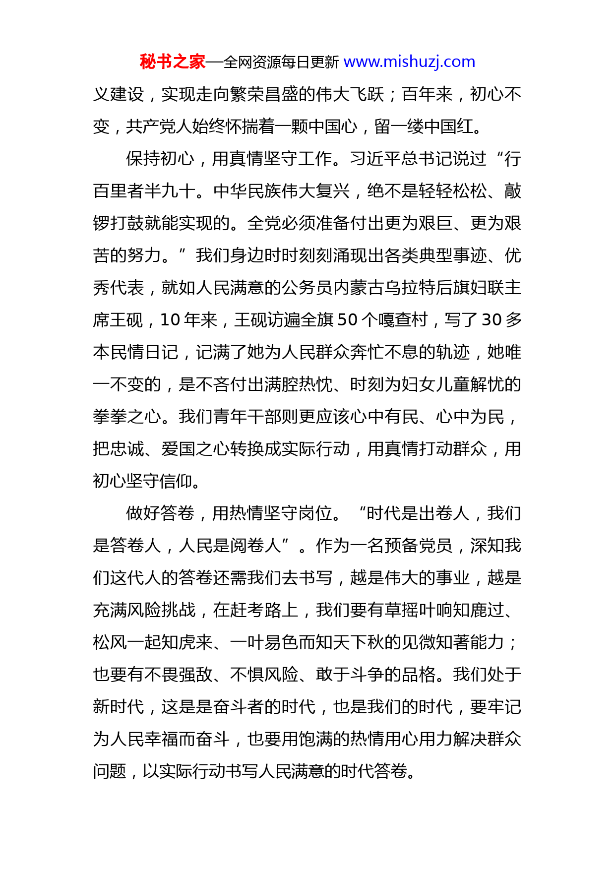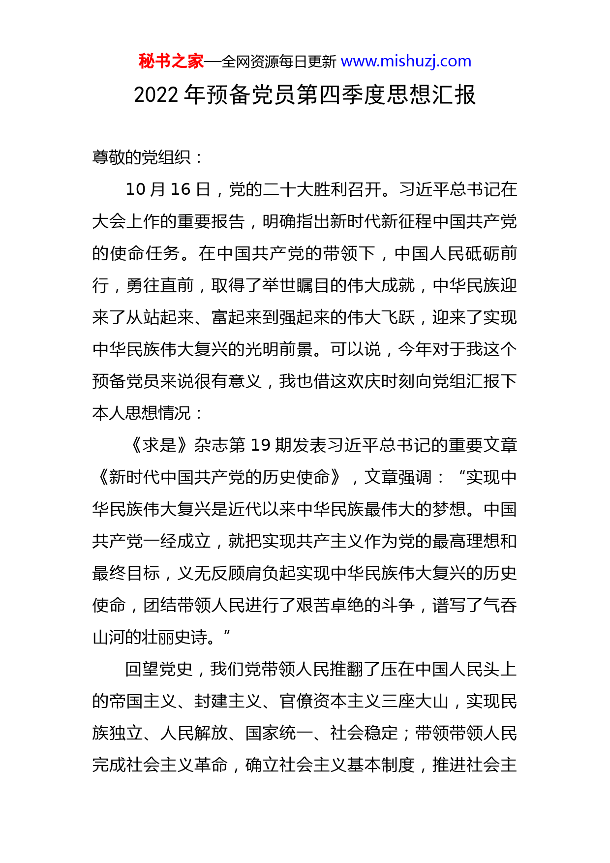 秘书之家—全网资源每日更新www.mishuzj.com2022年预备党员第四季度思想汇报尊敬的党组织:10月16日,党的二十大胜利召开。习近平总书记在大会上作的重要报告,明确指出新时代新征程中国共产党的使命任务。在中国共产党的带领下,中国人民砥砺前行,勇往直前,取得了举世瞩目的伟大成就,中华民族迎来了从站起来、富起来到强起来的伟大飞跃,迎来了实现中华民族伟大复兴的光明前景。可以说,今年对于我这个预备党员来说很有意义,我也借这欢庆时刻向党组汇报下本人思想情况:《求是》杂志第19期发表习近平总书记的重要文章《新时代中国共产党的历史使命》,文章强调:“实现中华民族伟大复兴是近代以来中华民族最伟大的梦想。中国共产党一经成立,就把实现共产主义作为党的最高理想和最终目标,义无反顾肩负起实现中华民族伟大复兴的历史使命,团结带领人民进行了艰苦卓绝的斗争,谱写了气吞山河的壮丽史诗。”回望党史,我们党带领人民推翻了压在中国人民头上的帝国主义、封建主义、官僚资本主义三座大山,实现民族独立、人民解放、国家统一、社会稳定;带领带领人民完成社会主义革命,确立社会主义基本制度,推进社会主秘书之家—全网资源每日更新www.mishuzj.com义建设,实现走向繁荣昌盛的伟大飞跃;百年来,初心不变,共产党人始终怀揣着一颗中国心,留一缕中国红。保持初心,用真情坚守工作。习近平总书记说过“行百里者半九十。中华民族伟大复兴,绝不是轻轻松松、敲锣打鼓就能实现的。全党必须准备付出更为艰巨、更为艰苦的努力。”我们身边时时刻刻涌现出各类典型事迹、优秀代表,就如人民满意的公务员内蒙古乌拉特后旗妇联主席王砚,10年来,王砚访遍全旗50个嘎查村,写了30多本民情日记,记满了她为人民群众奔忙不息的轨迹,她唯一不变的,是不吝付出满腔热忱、时刻为妇女儿童解忧的拳拳之心。我们青年干部则更应该心中有民、心中为民,把忠诚、爱国之心转换成实际行动,用真情打动群众,用初心坚守信仰。做好答卷,用热情坚守岗位。“时代是出卷人,我们是答卷人,人民是阅卷人”。作为一名预备党员,深知我们这代人的答卷还需我们去书写,越是伟大的事业,越是充满风险挑战,在赶考路上,我们要有草摇叶响知鹿过、松风一起知虎来、一叶易色而知天下秋的见微知著能力;也要有不畏强敌、不惧风险、敢于斗争的品格。我们处于新时代,这是是奋斗者的时代,也是我们的时代,要牢记为人民幸福而奋斗,也要用饱满的热情用心用力解决群众问题,以实际行动书写人民满意的时代答卷。秘书之家—全网资源每日更新www.mishuzj.com增强本领,用激情干好事业。水不激不跃,人不激不奋。黑格尔曾说过“没有激情,世界上任何伟大的事业都不会成功”。干事创业不能缺少激情,作为年轻干部更是不能失去激情。工作中时常会抱有“多干不如少干”、“领导叫做啥就做啥”的心态,心里会有几分浮躁、懒散,不思进取,这样的工作无法做成成绩,也有愧于我们这份事业。我们要转变作风,增强本领,干好事业,党和国家给了我们新时代,我们要时刻保持强烈的进取心、事业心,把工作激情转化为一种内在动力,立足本岗位,不断学习,要有一颗“不进则退”的心,要时刻提醒自己“不积跬步,无以至千里;不积小流,无以成江海”,激发自己的干事创业激情,加强自己的作风建设,从而锻炼真本领,做出真业绩。作为一名预备党员,我愿意进一步接受党组织和单位同事们对我的进一步考察和考验。我也一定会时刻牢记作为共产党员的职责,将在工作、生活中以更高的准则严格地要求自己,努力以出色地完成组织上交给的各项任务,争取早日成为一名正式党员。我也深知自己还有许多不足之处,但我将调整状态,以饱满的热情去改掉自身的不足,用真情、热情、激情去做好本职工作,也时刻牢记使命责任,撸起袖子加油干,争做合格党员。