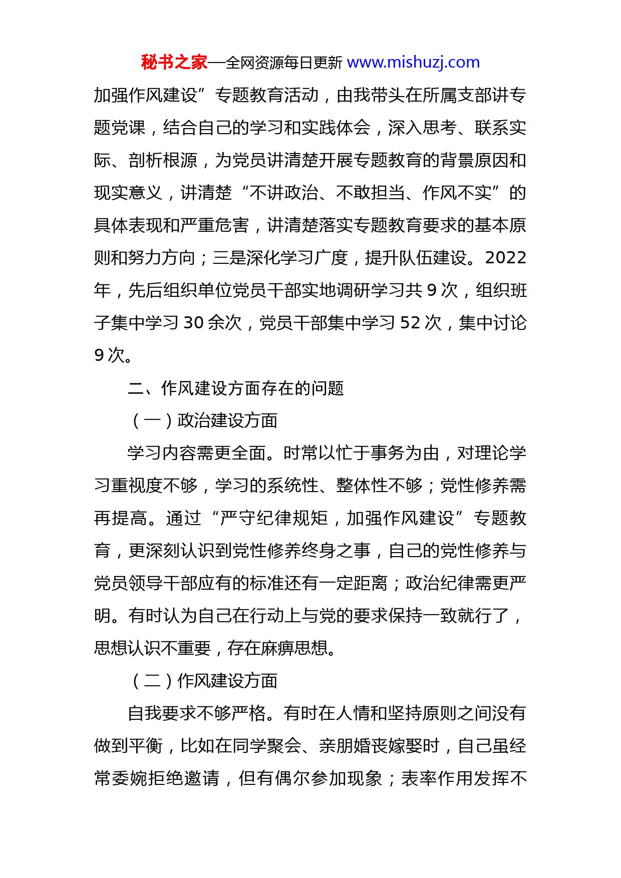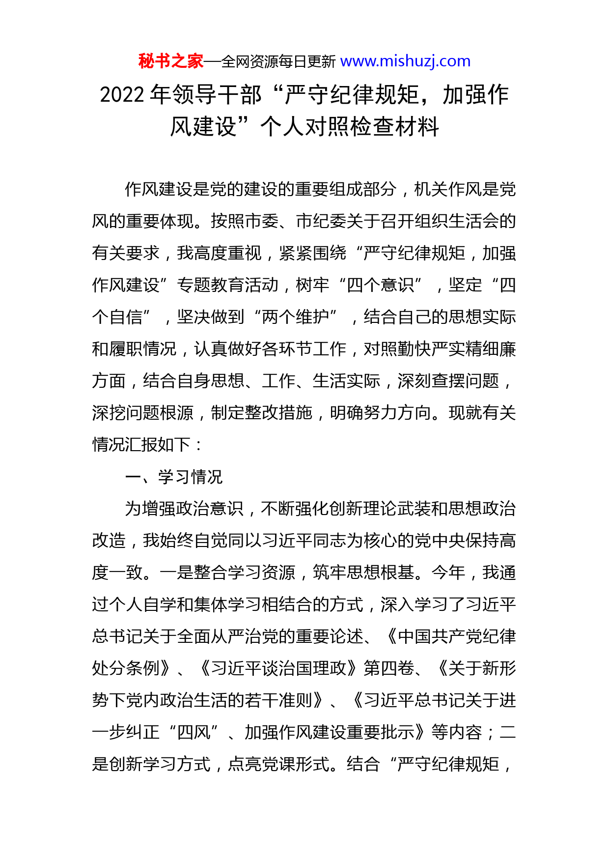秘书之家—全网资源每日更新www.mishuzj.com2022年领导干部“严守纪律规矩,加强作风建设”个人对照检查材料作风建设是党的建设的重要组成部分,机关作风是党风的重要体现。按照市委、市纪委关于召开组织生活会的有关要求,我高度重视,紧紧围绕“严守纪律规矩,加强作风建设”专题教育活动,树牢“四个意识”,坚定“四个自信”,坚决做到“两个维护”,结合自己的思想实际和履职情况,认真做好各环节工作,对照勤快严实精细廉方面,结合自身思想、工作、生活实际,深刻查摆问题,深挖问题根源,制定整改措施,明确努力方向。现就有关情况汇报如下:一、学习情况为增强政治意识,不断强化创新理论武装和思想政治改造,我始终自觉同以习近平同志为核心的党中央保持高度一致。一是整合学习资源,筑牢思想根基。今年,我通过个人自学和集体学习相结合的方式,深入学习了习近平总书记关于全面从严治党的重要论述、《中国共产党纪律处分条例》、《习近平谈治国理政》第四卷、《关于新形势下党内政治生活的若干准则》、《习近平总书记关于进一步纠正“四风”、加强作风建设重要批示》等内容;二是创新学习方式,点亮党课形式。结合“严守纪律规矩,秘书之家—全网资源每日更新www.mishuzj.com加强作风建设”专题教育活动,由我带头在所属支部讲专题党课,结合自己的学习和实践体会,深入思考、联系实际、剖析根源,为党员讲清楚开展专题教育的背景原因和现实意义,讲清楚“不讲政治、不敢担当、作风不实”的具体表现和严重危害,讲清楚落实专题教育要求的基本原则和努力方向;三是深化学习广度,提升队伍建设。2022年,先后组织单位党员干部实地调研学习共9次,组织班子集中学习30余次,党员干部集中学习52次,集中讨论9次。二、作风建设方面存在的问题(一)政治建设方面学习内容需更全面。时常以忙于事务为由,对理论学习重视度不够,学习的系统性、整体性不够;党性修养需再提高。通过“严守纪律规矩,加强作风建设”专题教育,更深刻认识到党性修养终身之事,自己的党性修养与党员领导干部应有的标准还有一定距离;政治纪律需更严明。有时认为自己在行动上与党的要求保持一致就行了,思想认识不重要,存在麻痹思想。(二)作风建设方面自我要求不够严格。有时在人情和坚持原则之间没有做到平衡,比如在同学聚会、亲朋婚丧嫁娶时,自己虽经常委婉拒绝邀请,但有偶尔参加现象;表率作用发挥不秘书之家—全网资源每日更新www.mishuzj.com强。在深入基层调研方面做得还不够,目前为止仍未将所有基层调研完毕,对第一手资料的掌握不全面;作风纪律深化不足。虽然能较好落实中央八项规定精神,但以上率下的作用没有充分发挥,对“四风”隐身变形、花样翻新等问题,抵触不够、批评不够、反击不够。(三)担当负责方面督促落实力度不够。在抓工作时安排布置多,但具体落实做得不够好,习惯于会议安排、文件落实,存在“坐班指挥、电话摇控”的现象;主动担当意识不强。如在断头路打通工作中一开始还存在等、靠思想,直到市上擂台赛开完后才进一步投入工作,虽然如期完成任务但也造成一定的负面影响。(四)落实面从严治党责任方面主体责任落实不深。目前落实党风廉政建设责任制的主要模式是开开会、讲讲课、表表态、提提要求,工作方法较为单一,效果不理想;压力层层传导不足。个别基层党支部书记工作缺乏主动性,过于依赖党工委,不能积极行动。比如,工作部署会之后,个别支部搞“慢动作”,导致支部学习工作开展情况参差不齐。三、产生问题的原因分析针对查找出的问题,我进行了认真反思,产生这些问题和不足,主要有以下四点:秘书之家—全网资源每日更新www.mishuzj.com(一)理想信念不坚定。“学而不思则惘,思而不学则怠”,一方面自己缺乏学习的主动性和自觉性,存在重业务学习、轻政治学习的现象,理论学习蜻蜓点水,只求一知半解。另一方面,没有深入基层、联系群众、深入实际调查和研究,没有及时发现工作中存在的问题,参谋助手作用没有发挥。正是由于自己没有养成深入学习和调查研究的工作习惯,思想理论水平和精神境界止步不前,世界观、人生观、价值观这个“总开关”出现了偏差,理想信念的坚定性、一贯性就出现问题了。(二)党性修养不高。总觉得自己工作多年,受益于领导的培养,党性修养比较坚定,抵制“四风”的抗体比较强,加之工作的具体性,放松了主观世界改造,见微知著的敏锐性下降了,锤炼党性修养的意识降低了,对作风方面的一些小毛病警惕性不高了。由于在思想上给自己定位的标准不高,经常用事务性工作代替了党性锻炼,自我提升的动力少了,靠经验、吃老本的意识重了,政治素养和党性修养止步不前,缺乏了敢闯敢干的精气神。(三)宗旨意识淡化。没有牢固树立为民服务的宗旨意识,密切联系群众不够,在业务工作中,没有做到对比办事群众换位思考,没有自觉地把群众对我们的满意度作为检验工作成效的最高标准。特别是在社会价值多元的复杂形势下,群众诉求也逐渐多元化,“权为民所用,情为秘书之家—全网资源每日更新www.mishuzj.com民所系,利为民所谋”的观念没有真正内化于心,这也是自己存在问题的根本原因。(四)自我要求不严。在思想深处总认为细枝末节无关大局,小打小闹无妨大节