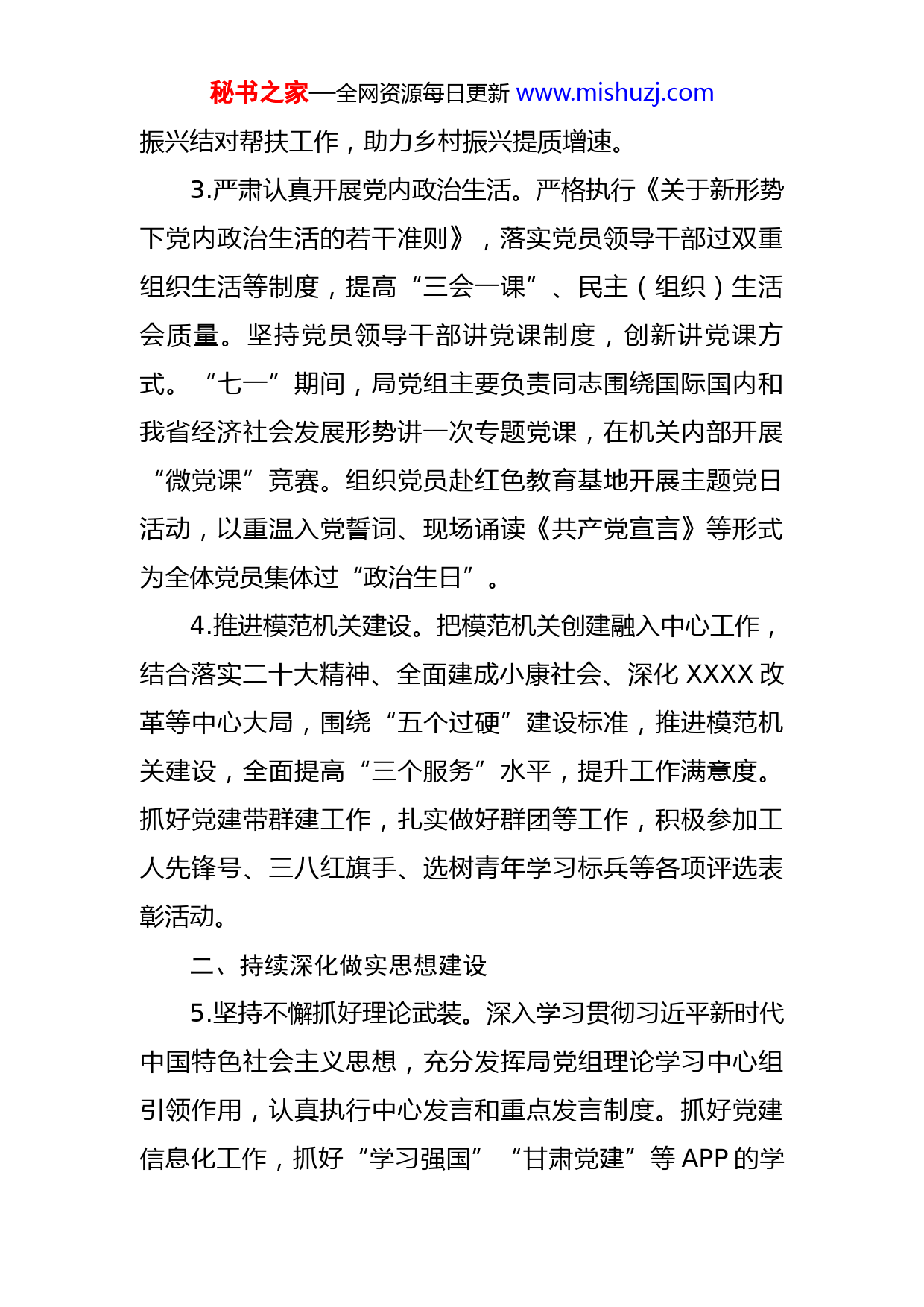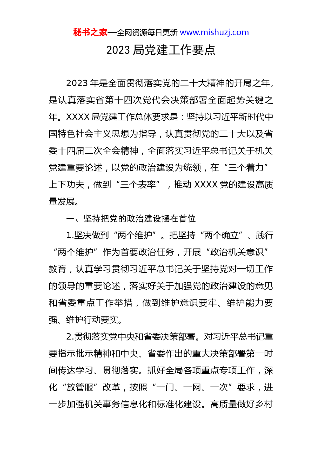 秘书之家—全网资源每日更新www.mishuzj.com2023局党建工作要点2023年是全面贯彻落实党的二十大精神的开局之年,是认真落实省第十四次党代会决策部署全面起势关键之年。XXXX局党建工作总体要求是:坚持以习近平新时代中国特色社会主义思想为指导,认真贯彻党的二十大以及省委十四届二次全会精神,全面落实习近平总书记关于机关党建重要论述,以党的政治建设为统领,在“三个着力”上下功夫,做到“三个表率”,推动XXXX党的建设高质量发展。一、坚持把党的政治建设摆在首位1.坚决做到“两个维护”。把坚持“两个确立”、践行“两个维护”作为首要政治任务,开展“政治机关意识”教育,认真学习贯彻习近平总书记关于坚持党对一切工作的领导的重要论述,落实好关于加强党的政治建设的意见和省委重点工作举措,做到维护意识要牢、维护能力要强、维护行动要实。2.贯彻落实党中央和省委决策部署。对习近平总书记重要指示批示精神和中央、省委作出的重大决策部署第一时间传达学习、贯彻落实。抓好全局各项重点专项工作,深化“放管服”改革,按照“一门、一网、一次”要求,进一步加强机关事务信息化和标准化建设。高质量做好乡村秘书之家—全网资源每日更新www.mishuzj.com振兴结对帮扶工作,助力乡村振兴提质增速。3.严肃认真开展党内政治生活。严格执行《关于新形势下党内政治生活的若干准则》,落实党员领导干部过双重组织生活等制度,提高“三会一课”、民主(组织)生活会质量。坚持党员领导干部讲党课制度,创新讲党课方式。“七一”期间,局党组主要负责同志围绕国际国内和我省经济社会发展形势讲一次专题党课,在机关内部开展“微党课”竞赛。组织党员赴红色教育基地开展主题党日活动,以重温入党誓词、现场诵读《共产党宣言》等形式为全体党员集体过“政治生日”。4.推进模范机关建设。把模范机关创建融入中心工作,结合落实二十大精神、全面建成小康社会、深化XXXX改革等中心大局,围绕“五个过硬”建设标准,推进模范机关建设,全面提高“三个服务”水平,提升工作满意度。抓好党建带群建工作,扎实做好群团等工作,积极参加工人先锋号、三八红旗手、选树青年学习标兵等各项评选表彰活动。二、持续深化做实思想建设5.坚持不懈抓好理论武装。深入学习贯彻习近平新时代中国特色社会主义思想,充分发挥局党组理论学习中心组引领作用,认真执行中心发言和重点发言制度。抓好党建信息化工作,抓好“学习强国”“甘肃党建”等APP的学秘书之家—全网资源每日更新www.mishuzj.com习使用,引导督促全体党员坚持持续学习党的大政方针、党章党纪党规,做到应知应会。定期发布理论学习要点提示,对各基层党组织的学习重点内容进行统一部署。结合每季度效能督导、基层党组织组织生活会、年度党组织书记抓基层党建述职评议考核等,重点围绕学时制度执行、教育培训责任落实、教育培训针对性和有效性等进行督查,并将党员教育培训考核结果作为党组织和党员评先评优的重要依据。6.强化理想信念教育。持续抓好党的二十大会精神学习宣传贯彻工作,制定好学习宣传贯彻方案,采取个人自学、集中学习、座谈交流、专题研讨等方式,组织开展内容丰富、形式多样的学习宣传教育活动,引导党员干部学原文、悟原理、知原义,学深悟透做实党的二十大精神。要全面学习习近平总书记大会系列重要讲话和相关文件精神,并同学习党的十八大报告、党的十九大报告精神结合起来,提升学习的系统性,拓展学习的深度和广度。坚持请进来与走出去相结合,举办好辅导报告会,组织好干部培训和轮训。在XXXX公众号开设专栏,及时报道相关工作的新进展新成效,为学习宣传贯彻党的二十大精神营造浓厚氛围。7.抓牢抓实意识形态工作。严格落实《省管局党组落实意识形态工作责任制实施细则》,加强对局网站、微博微秘书之家—全网资源每日更新www.mishuzj.com信及安徽机关事务杂志等阵地建设和管理,积极稳妥做好重大突发事件和热点敏感问题的舆论引导。开展干部职工思想状况调研,扎实做好思想政治工作。三、全面加强基层党组织建设8.推动基层党组织全面进步全面过硬。认真落实《中国共产党支部工作条例(试行)》和《中国共产党党和国家机关基层组织工作条例》,实施党支部书记能力提升工程,坚持机关党委扩大会制度,以会代训,进一步提高党支部书记抓党务工作能力和水平。组织开展基层党建工作调研,通过召开党员代表座谈会、走访基层党员等方式,总结特色做法,收集整理意见建议,补短板强弱项。积极参加“党员争当先锋、党支部争做战斗堡垒、创建模范机关”活动,努力形成党建工作品牌,推动基层党支部梯次迈进、整体提升。9.严格党员教育管理监督。制定《党员教育培训工作总体安排》和《2023年度党员教育培训计划》,并认真贯彻执行。通过佩戴党员徽章、设立党费集中交纳日、创建党员先锋岗、规范党员民主评议等措施,引导党员增强党员意识、发挥主体作用。大力选树先进典型,开展表彰活动,强化示范引领作用。推动基层党组织加强对党员特别是党员领导干部的日常监督,发挥党支部在选人用人中的监督作用。秘书之家—全网资源每日更新www.mishuzj.com10.强化党务干部队伍建设。举办局党务干