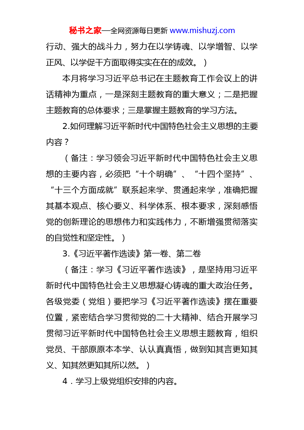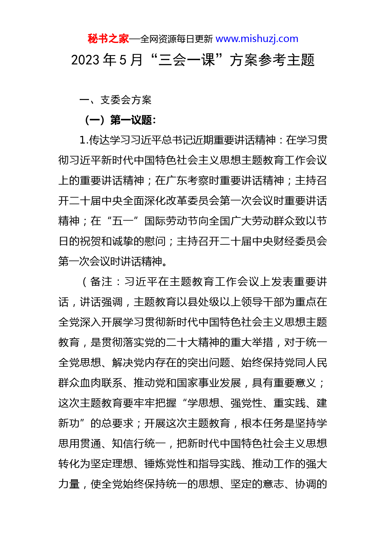 秘书之家—全网资源每日更新www.mishuzj.com2023年5月“三会一课”方案参考主题一、支委会方案(一)第一议题:1.传达学习习近平总书记近期重要讲话精神:在学习贯彻习近平新时代中国特色社会主义思想主题教育工作会议上的重要讲话精神;在广东考察时重要讲话精神;主持召开二十届中央全面深化改革委员会第一次会议时重要讲话精神;在“五一”国际劳动节向全国广大劳动群众致以节日的祝贺和诚挚的慰问;主持召开二十届中央财经委员会第一次会议时讲话精神。(备注:习近平在主题教育工作会议上发表重要讲话,讲话强调,主题教育以县处级以上领导干部为重点在全党深入开展学习贯彻新时代中国特色社会主义思想主题教育,是贯彻落实党的二十大精神的重大举措,对于统一全党思想、解决党内存在的突出问题、始终保持党同人民群众血肉联系、推动党和国家事业发展,具有重要意义;这次主题教育要牢牢把握“学思想、强党性、重实践、建新功”的总要求;开展这次主题教育,根本任务是坚持学思用贯通、知信行统一,把新时代中国特色社会主义思想转化为坚定理想、锤炼党性和指导实践、推动工作的强大力量,使全党始终保持统一的思想、坚定的意志、协调的秘书之家—全网资源每日更新www.mishuzj.com行动、强大的战斗力,努力在以学铸魂、以学增智、以学正风、以学促干方面取得实实在在的成效。)本月将学习习近平总书记在主题教育工作会议上的讲话精神为重点,一是深刻主题教育的重大意义;二是把握主题教育的总体要求;三是掌握主题教育的学习方法。2.如何理解习近平新时代中国特色社会主义思想的主要内容?(备注:学习领会习近平新时代中国特色社会主义思想的主要内容,必须把“十个明确”、“十四个坚持”、“十三个方面成就”联系起来学、贯通起来学,准确把握其基本观点、核心要义、科学体系、根本要求,深刻感悟党的创新理论的思想伟力和实践伟力,不断增强贯彻落实的自觉性和坚定性。)3.《习近平著作选读》第一卷、第二卷(备注:学习《习近平著作选读》,是坚持用习近平新时代中国特色社会主义思想凝心铸魂的重大政治任务。各级党委(党组)要把学习《习近平著作选读》摆在重要位置,紧密结合学习贯彻党的二十大精神、结合开展学习贯彻习近平新时代中国特色社会主义思想主题教育,组织党员、干部原原本本学、认认真真悟,做到知其言更知其义、知其然更知其所以然。)4.学习上级党组织安排的内容。秘书之家—全网资源每日更新www.mishuzj.com(二)第一行动:《求是》杂志发表习近平总书记重要文章《在学习贯彻习近平新时代中国特色社会主义思想主题教育工作会议上的讲话》(备注:文章强调,要切实加强对主题教育的领导。这次主题教育是一件事关全局的大事,时间紧、任务重、要求高。各级党委(党组)要高度重视,精心组织实施,确保圆满完成主题教育各项任务。第一,明确领导责任。第二,强化督促指导。第三,注重统筹兼顾。第四,加强宣传引导。强国建设、民族复兴的宏伟目标令人鼓舞、催人奋进,我们这一代共产党人使命光荣、责任重大。要以这次主题教育为契机,加强党的创新理论武装,不断提高全党马克思主义水平,不断提高党的执政能力和领导水平,为奋进新征程凝心聚力,踔厉奋发、勇毅前行,为全面建设社会主义现代化国家、全面推进中华民族伟大复兴而团结奋斗!)(三)党内事务1.确定本月主题党日(党员大会)方案;2.安排布置主题教育相关事宜。(备注:学习贯彻习近平新时代中国特色社会主义思想主题教育是党的二十大提出的重要任务。主题教育已全面开启,各支部要按指导组要求开展好主题教育相关工作:一是学习制定书目,组织开展好学习研讨;二是精心秘书之家—全网资源每日更新www.mishuzj.com制定调查研究方案;三是与指导做好沟通,按要求开展好相关学习活动。)二、主题党日(党员大会)(一)第一议题活动主题:传达学习贯彻习近平新时代中国特色社会主义思想主题教育方案参加人员:全体党员会议内容:根据X委对主题教育的安排布置,拟定支部主题教育方案,对主题教育重点任务进行安排布置1.传达中央及省委主题教育工作会议精神2.宣读X支部主题教育工作方案3.对本主题教育重点工作进行安排布置(二)第一行动:学习宣传贯彻党的二十大精神活,奋进新征程活动动目标:重温入党誓词,接受深刻的党性教育和思想洗礼1.到X教育基地,共同追忆红色历史,传承红色革命基因,弘扬伟大建党精神;深入学习贯彻党的二十大精神和习近平新时代中国特色社会主义思想,深刻领悟中国共产党人精神谱系的丰富内涵和时代意义。2.通过回顾革命历史、参观十八大以来的成就、二十大精神,激励全体党员不忘初心、牢记使命,为推进中华民秘书之家—全网资源每日更新www.mishuzj.com族伟大复兴事业现代化不懈奋斗。3.重温入党誓词,引导党员干部牢记初心使命、强化实干担当,坚守岗位、勇于奉献,奋发进取、主动作为,以更加昂扬的奋斗姿态开启新征程,为各项工作任务再立新功、再创佳绩。(通过开展主题党日活动,以实际行动宣传好、贯彻好党的二十大精神,引导带动广大党员干部认真经受思想淬炼、精神洗礼,进一步筑牢信仰之基、补足精神之钙、把稳思想之舵。坚持不懈用习近平新时代中国特色社会主义思想凝