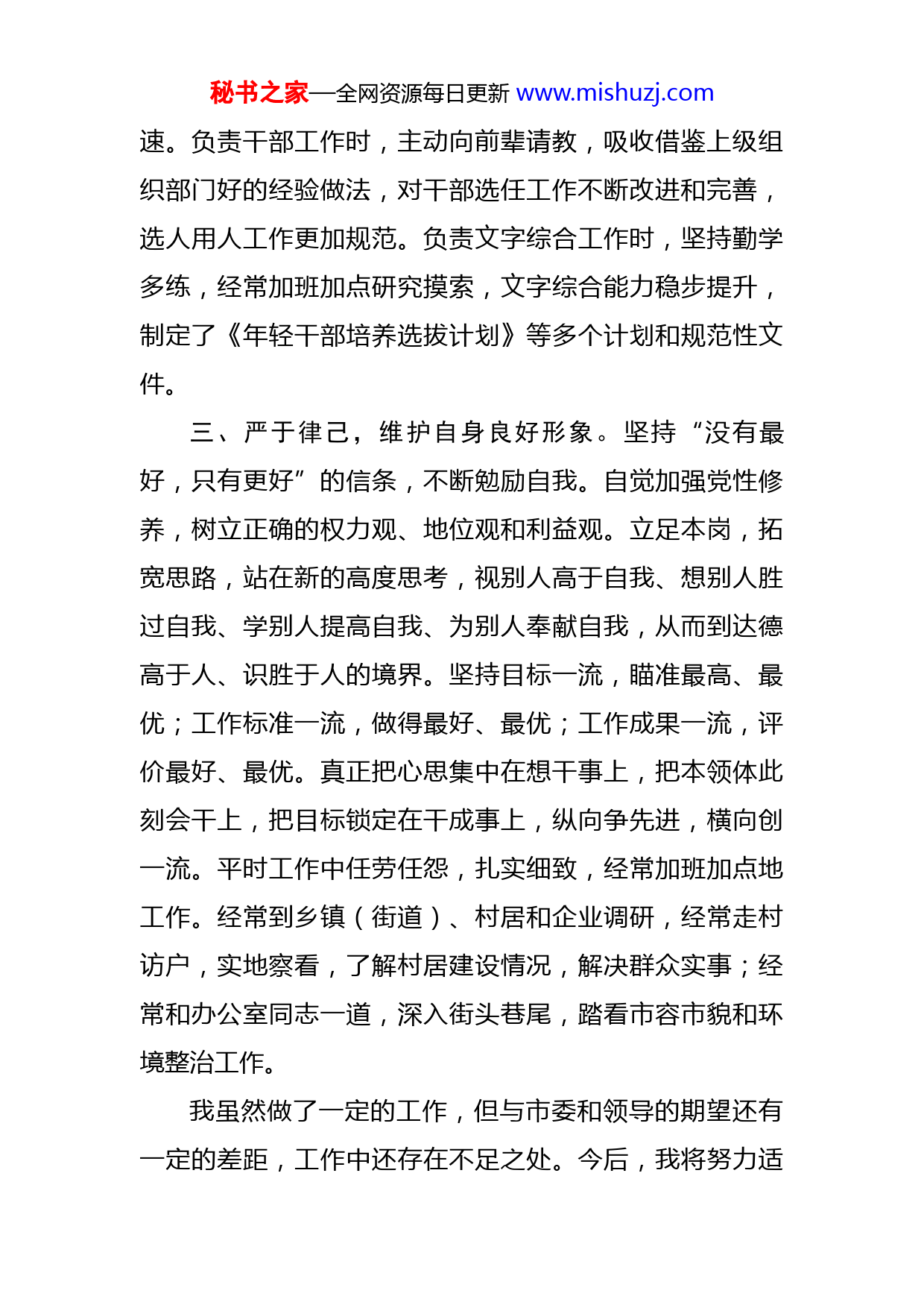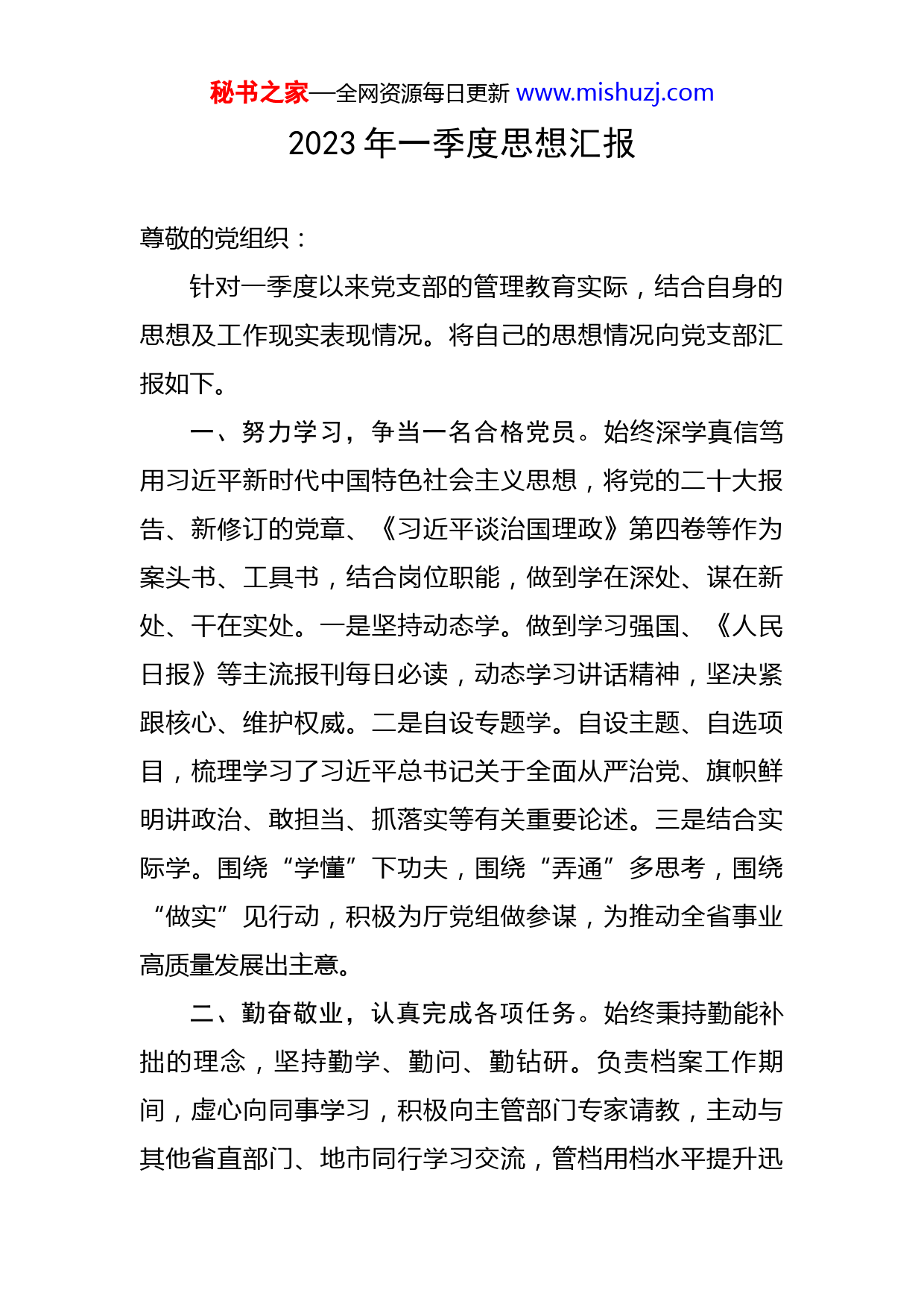秘书之家—全网资源每日更新www.mishuzj.com2023年一季度思想汇报尊敬的党组织:针对一季度以来党支部的管理教育实际,结合自身的思想及工作现实表现情况。将自己的思想情况向党支部汇报如下。一、努力学习,争当一名合格党员。始终深学真信笃用习近平新时代中国特色社会主义思想,将党的二十大报告、新修订的党章、《习近平谈治国理政》第四卷等作为案头书、工具书,结合岗位职能,做到学在深处、谋在新处、干在实处。一是坚持动态学。做到学习强国、《人民日报》等主流报刊每日必读,动态学习讲话精神,坚决紧跟核心、维护权威。二是自设专题学。自设主题、自选项目,梳理学习了习近平总书记关于全面从严治党、旗帜鲜明讲政治、敢担当、抓落实等有关重要论述。三是结合实际学。围绕“学懂”下功夫,围绕“弄通”多思考,围绕“做实”见行动,积极为厅党组做参谋,为推动全省事业高质量发展出主意。二、勤奋敬业,认真完成各项任务。始终秉持勤能补拙的理念,坚持勤学、勤问、勤钻研。负责档案工作期间,虚心向同事学习,积极向主管部门专家请教,主动与其他省直部门、地市同行学习交流,管档用档水平提升迅秘书之家—全网资源每日更新www.mishuzj.com速。负责干部工作时,主动向前辈请教,吸收借鉴上级组织部门好的经验做法,对干部选任工作不断改进和完善,选人用人工作更加规范。负责文字综合工作时,坚持勤学多练,经常加班加点研究摸索,文字综合能力稳步提升,制定了《年轻干部培养选拔计划》等多个计划和规范性文件。三、严于律己,维护自身良好形象。坚持“没有最好,只有更好”的信条,不断勉励自我。自觉加强党性修养,树立正确的权力观、地位观和利益观。立足本岗,拓宽思路,站在新的高度思考,视别人高于自我、想别人胜过自我、学别人提高自我、为别人奉献自我,从而到达德高于人、识胜于人的境界。坚持目标一流,瞄准最高、最优;工作标准一流,做得最好、最优;工作成果一流,评价最好、最优。真正把心思集中在想干事上,把本领体此刻会干上,把目标锁定在干成事上,纵向争先进,横向创一流。平时工作中任劳任怨,扎实细致,经常加班加点地工作。经常到乡镇(街道)、村居和企业调研,经常走村访户,实地察看,了解村居建设情况,解决群众实事;经常和办公室同志一道,深入街头巷尾,踏看市容市貌和环境整治工作。我虽然做了一定的工作,但与市委和领导的期望还有一定的差距,工作中还存在不足之处。今后,我将努力适秘书之家—全网资源每日更新www.mishuzj.com应新形势和新任务的要求,不断加强自身修养,努力提高个人素质,积极主动地完成市委和领导交办的各项工作任务。同时,不断加强自身廉政建设,牢筑思想防线,努力做到“三个坚持”。一是坚持理论学习,不断完善和提高自己,确保高质量地履行好各项职责。二是坚持服务宗旨,正确行使自己的职责。三是坚持执行制度,要以这次述职述廉为动力,更加严格地要求自己,虚心接受领导和同志们的批评、建议,加强学习,不断完善知识结构,提高业务水平,增强服务意识,切实做好本职工作。以上是我个人近期的思想情况汇报及下步努力的方向。如有不足之处,请领导和同志们给予批评指正。此致。敬礼!汇报人:XXXX年XX月XX日