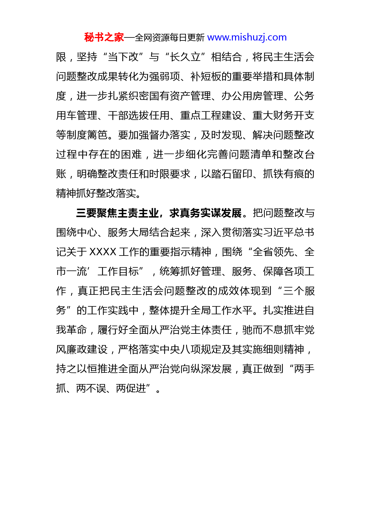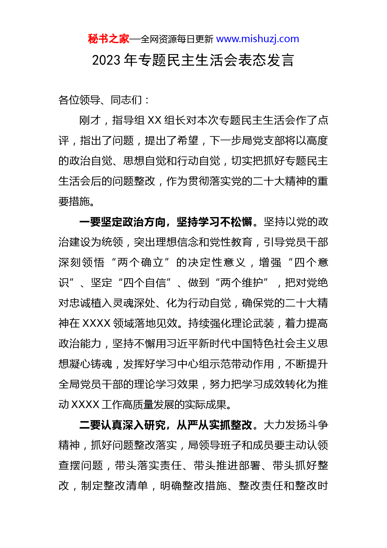 秘书之家—全网资源每日更新www.mishuzj.com2023年专题民主生活会表态发言各位领导、同志们:刚才,指导组XX组长对本次专题民主生活会作了点评,指出了问题,提出了希望,下一步局党支部将以高度的政治自觉、思想自觉和行动自觉,切实把抓好专题民主生活会后的问题整改,作为贯彻落实党的二十大精神的重要措施。一要坚定政治方向,坚持学习不松懈。坚持以党的政治建设为统领,突出理想信念和党性教育,引导党员干部深刻领悟“两个确立”的决定性意义,增强“四个意识”、坚定“四个自信”、做到“两个维护”,把对党绝对忠诚植入灵魂深处、化为行动自觉,确保党的二十大精神在XXXX领域落地见效。持续强化理论武装,着力提高政治能力,坚持不懈用习近平新时代中国特色社会主义思想凝心铸魂,发挥好学习中心组示范带动作用,不断提升全局党员干部的理论学习效果,努力把学习成效转化为推动XXXX工作高质量发展的实际成果。二要认真深入研究,从严从实抓整改。大力发扬斗争精神,抓好问题整改落实,局领导班子和成员要主动认领查摆问题,带头落实责任、带头推进部署、带头抓好整改,制定整改清单,明确整改措施、整改责任和整改时秘书之家—全网资源每日更新www.mishuzj.com限,坚持“当下改”与“长久立”相结合,将民主生活会问题整改成果转化为强弱项、补短板的重要举措和具体制度,进一步扎紧织密国有资产管理、办公用房管理、公务用车管理、干部选拔任用、重点工程建设、重大财务开支等制度篱笆。要加强督办落实,及时发现、解决问题整改过程中存在的困难,进一步细化完善问题清单和整改台账,明确整改责任和时限要求,以踏石留印、抓铁有痕的精神抓好整改落实。三要聚焦主责主业,求真务实谋发展。把问题整改与围绕中心、服务大局结合起来,深入贯彻落实习近平总书记关于XXXX工作的重要指示精神,围绕“全省领先、全市一流’工作目标”,统筹抓好管理、服务、保障各项工作,真正把民主生活会问题整改的成效体现到“三个服务”的工作实践中,整体提升全局工作水平。扎实推进自我革命,履行好全面从严治党主体责任,驰而不息抓牢党风廉政建设,严格落实中央八项规定及其实施细则精神,持之以恒推进全面从严治党向纵深发展,真正做到“两手抓、两不误、两促进”。