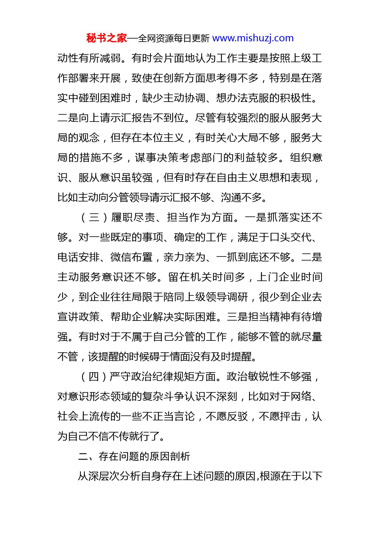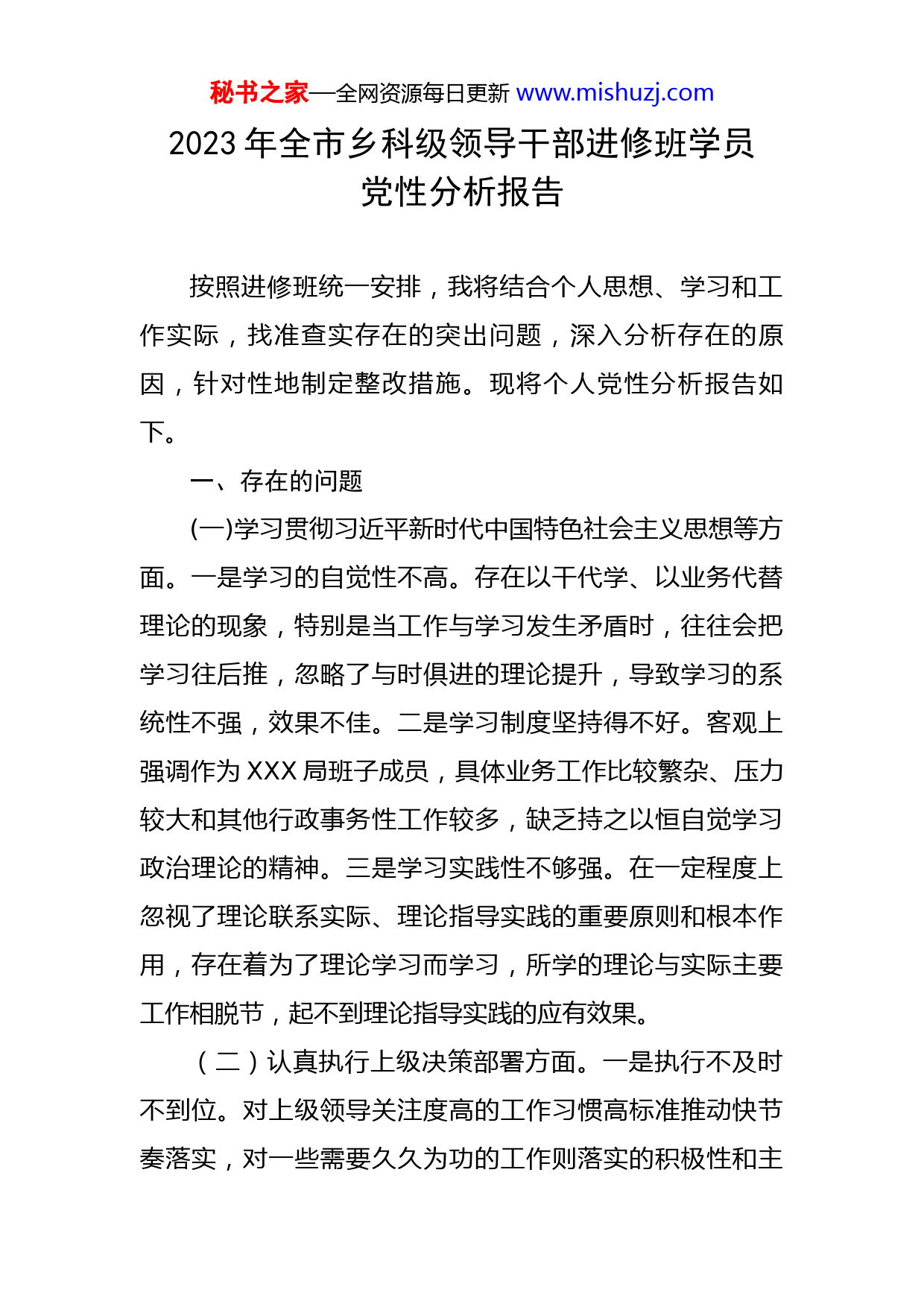 秘书之家—全网资源每日更新www.mishuzj.com2023年全市乡科级领导干部进修班学员党性分析报告按照进修班统一安排,我将结合个人思想、学习和工作实际,找准查实存在的突出问题,深入分析存在的原因,针对性地制定整改措施。现将个人党性分析报告如下。一、存在的问题(一)学习贯彻习近平新时代中国特色社会主义思想等方面。一是学习的自觉性不高。存在以干代学、以业务代替理论的现象,特别是当工作与学习发生矛盾时,往往会把学习往后推,忽略了与时俱进的理论提升,导致学习的系统性不强,效果不佳。二是学习制度坚持得不好。客观上强调作为XXX局班子成员,具体业务工作比较繁杂、压力较大和其他行政事务性工作较多,缺乏持之以恒自觉学习政治理论的精神。三是学习实践性不够强。在一定程度上忽视了理论联系实际、理论指导实践的重要原则和根本作用,存在着为了理论学习而学习,所学的理论与实际主要工作相脱节,起不到理论指导实践的应有效果。(二)认真执行上级决策部署方面。一是执行不及时不到位。对上级领导关注度高的工作习惯高标准推动快节奏落实,对一些需要久久为功的工作则落实的积极性和主秘书之家—全网资源每日更新www.mishuzj.com动性有所减弱。有时会片面地认为工作主要是按照上级工作部署来开展,致使在创新方面思考得不多,特别是在落实中碰到困难时,缺少主动协调、想办法克服的积极性。二是向上请示汇报告不到位。尽管有较强烈的服从服务大局的观念,但存在本位主义,有时关心大局不够,服务大局的措施不多,谋事决策考虑部门的利益较多。组织意识、服从意识虽较强,但有时存在自由主义思想和表现,比如主动向分管领导请示汇报不够、沟通不多。(三)履职尽责、担当作为方面。一是抓落实还不够。对一些既定的事项、确定的工作,满足于口头交代、电话安排、微信布置,亲力亲为、一抓到底还不够。二是主动服务意识还不够。留在机关时间多,上门企业时间少,到企业往往局限于陪同上级领导调研,很少到企业去宣讲政策、帮助企业解决实际困难。三是担当精神有待增强。有时对于不属于自己分管的工作,能够不管的就尽量不管,该提醒的时候碍于情面没有及时提醒。(四)严守政治纪律规矩方面。政治敏锐性不够强,对意识形态领域的复杂斗争认识不深刻,比如对于网络、社会上流传的一些不正当言论,不愿反驳,不愿抨击,认为自己不信不传就行了。二、存在问题的原因剖析从深层次分析自身存在上述问题的原因,根源在于以下秘书之家—全网资源每日更新www.mishuzj.com四个方面:(一)党性锤炼频率不够。面对新形势新变化和艰巨繁重的工作任务,缺少更加坚定的理论自信。没有持续地加强政治理论学习,放松了对党性锻炼的要求和保持党员先进性、纯洁性的追求。究其根本,主要是把政治理论学习当成了“软指标”,静不下心,抓得不紧,以干代学,放松了对理论的再学习、对理想的再坚定、对革命意志的再锤炼。(二)服务宗旨意识弱化。有时总认为,只要树立了共产主义理想信念和全心全意为人民服务的宗旨意识就行了,没有深刻认识到牢记理想信念和宗旨意识是党员的精神支柱和奋斗目标,没有将宗旨意识内化于灵魂深处、体现于工作实践中,导致为民服务的公仆意识淡化,未切实做到为群众所想,急群众所急。“一切为了群众、一切依靠群众”的群众观点需要进一步增强,“从群众中来、到群众中去”的群众路线需要进一步贯彻。(三)干事创业劲头不足。作为年轻人,被生活、家庭、工作等方方面面的事情所扰,干事创业、奋发有为的劲头和积极性有所淡化,再上新台阶的精气神不足,工作积极性、主动性、创造性不够。没有很好地进行调查研究,对于如何破解难题拿出的实招、硬招还不多。(四)纪律规矩有所放松。有时会产生纪律松懈、观念淡秘书之家—全网资源每日更新www.mishuzj.com化的情况,对底线红线问题强调的多,对小节细节问题提醒的少,有时候碍于情面,担心说多了伤和气、影响团结,驰而不息严作风的韧劲不够坚决。三、主要的整改措施下一步,将坚持问题导向、立行立改,针对查摆出来的问题,逐一制定措施,认真抓好整改。(一)加强理论学习。学懂弄通做实习近平新时代中国特色社会主义思想,把握正确政治方向,提高政治能力,坚持联系实际学、带着问题学、及时跟进学,以思想自觉引领行动自觉,最终把学习成果体现在推动XXX区科技工作上来。(二)勇于担当创新。国务院对国家高新区的要求是打造创新驱动示范区和高质量发展先行区。XXX区肩负着打造全市创新高地的重任。接下来,将围绕XXX区科技工作“XXXX”思路,坚持一切为了发展、一切为了人民,开拓思想、勤于思考、勇于担当,增强工作的主动性和预见性,不折不扣地抓好各级党委决策部署的贯彻落实。(三)强化工作作风。争取今年对XXX区内的重点企业、重大科创平台实现全覆盖走访调研,摸清家底,强化高企、科小培育,坚持联系点制度,多接触群众,多掌握实情,多宣讲政策,切实帮助企业解决困难。在抓工作、破难题上,发扬“钉钉子”精神,对照党工委工作要点,秘书之家—全网资源每日更新www.mishuzj.com一件一件细化工作措施,提出解决办法,落实到责任人。(四)坚守政治规矩。无论在工作中,还是生活中,始终遵守党的政治纪律、组