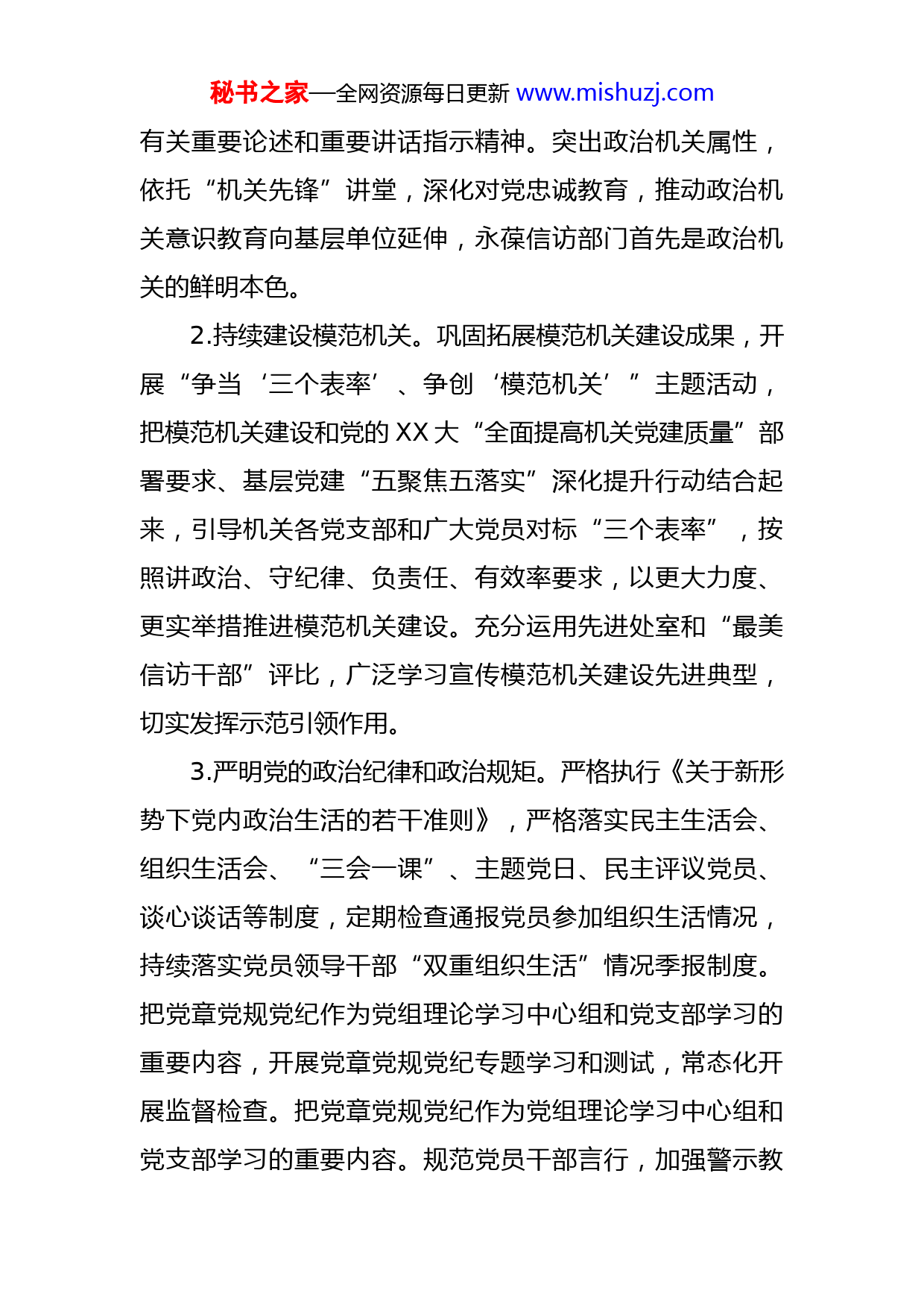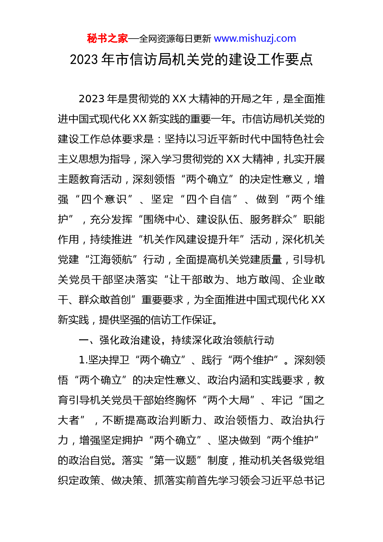 秘书之家—全网资源每日更新www.mishuzj.com2023年市信访局机关党的建设工作要点2023年是贯彻党的XX大精神的开局之年,是全面推进中国式现代化XX新实践的重要一年。市信访局机关党的建设工作总体要求是:坚持以习近平新时代中国特色社会主义思想为指导,深入学习贯彻党的XX大精神,扎实开展主题教育活动,深刻领悟“两个确立”的决定性意义,增强“四个意识”、坚定“四个自信”、做到“两个维护”,充分发挥“围绕中心、建设队伍、服务群众”职能作用,持续推进“机关作风建设提升年”活动,深化机关党建“江海领航”行动,全面提高机关党建质量,引导机关党员干部坚决落实“让干部敢为、地方敢闯、企业敢干、群众敢首创”重要要求,为全面推进中国式现代化XX新实践,提供坚强的信访工作保证。一、强化政治建设,持续深化政治领航行动1.坚决捍卫“两个确立”、践行“两个维护”。深刻领悟“两个确立”的决定性意义、政治内涵和实践要求,教育引导机关党员干部始终胸怀“两个大局”、牢记“国之大者”,不断提高政治判断力、政治领悟力、政治执行力,增强坚定拥护“两个确立”、坚决做到“两个维护”的政治自觉。落实“第一议题”制度,推动机关各级党组织定政策、做决策、抓落实前首先学习领会习近平总书记秘书之家—全网资源每日更新www.mishuzj.com有关重要论述和重要讲话指示精神。突出政治机关属性,依托“机关先锋”讲堂,深化对党忠诚教育,推动政治机关意识教育向基层单位延伸,永葆信访部门首先是政治机关的鲜明本色。2.持续建设模范机关。巩固拓展模范机关建设成果,开展“争当‘三个表率’、争创‘模范机关’”主题活动,把模范机关建设和党的XX大“全面提高机关党建质量”部署要求、基层党建“五聚焦五落实”深化提升行动结合起来,引导机关各党支部和广大党员对标“三个表率”,按照讲政治、守纪律、负责任、有效率要求,以更大力度、更实举措推进模范机关建设。充分运用先进处室和“最美信访干部”评比,广泛学习宣传模范机关建设先进典型,切实发挥示范引领作用。3.严明党的政治纪律和政治规矩。严格执行《关于新形势下党内政治生活的若干准则》,严格落实民主生活会、组织生活会、“三会一课”、主题党日、民主评议党员、谈心谈话等制度,定期检查通报党员参加组织生活情况,持续落实党员领导干部“双重组织生活”情况季报制度。把党章党规党纪作为党组理论学习中心组和党支部学习的重要内容,开展党章党规党纪专题学习和测试,常态化开展监督检查。把党章党规党纪作为党组理论学习中心组和党支部学习的重要内容。规范党员干部言行,加强警示教秘书之家—全网资源每日更新www.mishuzj.com育,对违反党的纪律规矩的言行坚决批评纠正,问题严重的严肃处理。二、强化理论武装,持续深化思想领航行动4.坚持以习近平新时代中国特色社会主义思想武装头脑。紧跟党的理论创新步伐,深入学习习近平新时代中国特色社会主义思想和习近平总书记关于加强和改进人民信访工作的重要思想,持续抓好理论学习,引导广大党员更加自觉地统一思想、统一意志、统一行动。组织人员参加市级机关理论宣讲骨干培训,用好“XX机关党建e学堂”平台,开展研究学习、交流讨论、知识竞赛,用党的创新理论凝心铸魂。深化机关精神文明建设,开展社会主义核心价值观宣传教育,积极参加“踔厉向未来”首届机关文化节。学习宣传习近平法治思想,推进法治型机关建设,引导党员干部尊法敬法、遵章守纪。5.深入学习宣传贯彻党的XX大精神。组织党员干部原原本本学习党的XX大报告和党章,做到学思用贯通、知信行统一。开展党的XX大精神知识竞赛、理论宣讲比赛,积极开展宣讲活动,切实把党员干部的思想和行动统一到党的XX大精神上来,推动党员干部奋进新征程、建功新时代。按照中央及省、市委统一部署,以习近平新时代中国特色社会主义思想为指导,以学习贯彻党的XX大精神为主线,以学好用实习近平总书记关于加强和改进人民信访工秘书之家—全网资源每日更新www.mishuzj.com作的重要思想为抓手,扎实开展主题教育,注重统筹结合,丰富教育内容,确保主题教育取得实实在在成效。6.压实意识形态工作责任。坚定不移做好新形势下意识形态工作,完善意识形态责任清单,把意识形态工作责任制落实到加强党的建设各项工作中,与中心工作同部署、同落实、同考核。把握重大时间节点,开展党员思想动态调查,科学分析研判意识形态、网络意识形态领域情况,积极稳妥处置风险隐患。机关党委每年向党组专题汇报意识形态工作不少于2次。突出抓好网络意识形态安全,强化“三微一端”使用和管理。完善意识形态监测机制,常态化开展机关党员思想动态调查,及时分析研判,有针对性地做好思想政治工作。用好“学习强国”、XX机关党建网、XX机关党建微信公众号等平台阵地,牢牢掌握意识形态工作主动权。三、强化组织建设,持续深化筑基领航行动7.强化机关组织建设。坚持大抓基层的鲜明导向,严格履行党章赋予的各项职责,开展机关党建标准化、规范化建设,把机关基层党组织建设成为有效实现党的领导的坚强战斗堡垒。抓实机关党支部工作考核评价,年底前完成机关党委按期换届。扎实开展组织生活会和