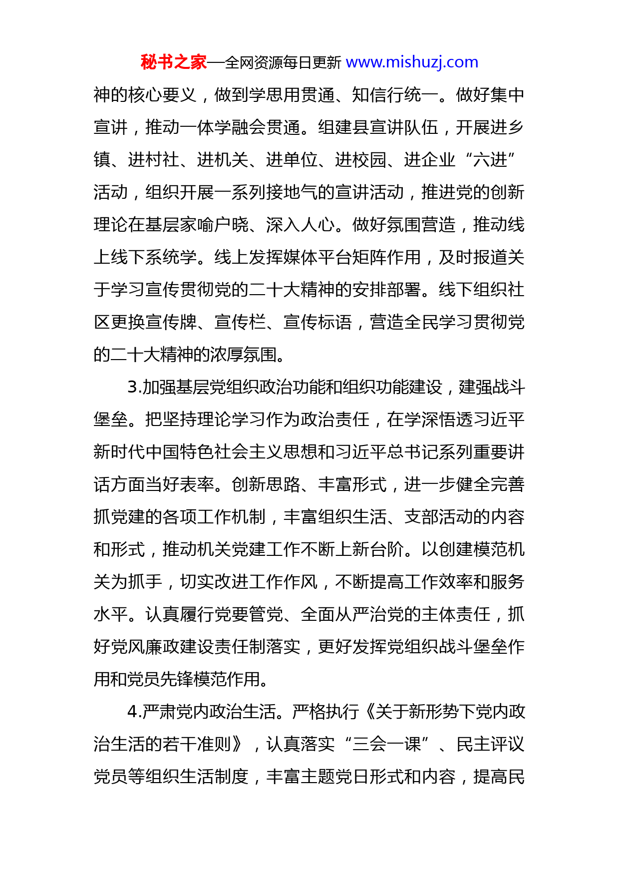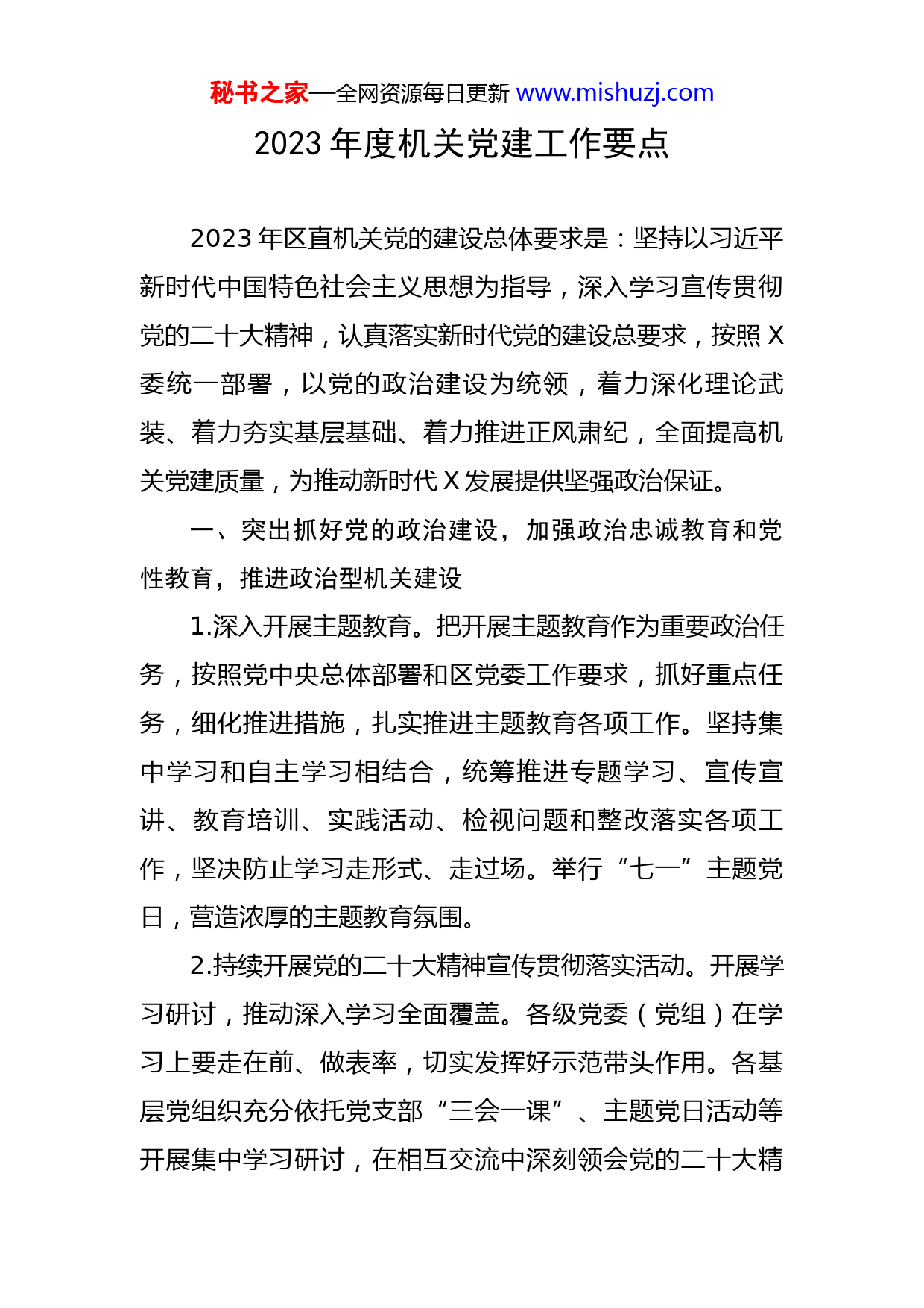 秘书之家—全网资源每日更新www.mishuzj.com2023年度机关党建工作要点2023年区直机关党的建设总体要求是:坚持以习近平新时代中国特色社会主义思想为指导,深入学习宣传贯彻党的二十大精神,认真落实新时代党的建设总要求,按照X委统一部署,以党的政治建设为统领,着力深化理论武装、着力夯实基层基础、着力推进正风肃纪,全面提高机关党建质量,为推动新时代X发展提供坚强政治保证。一、突出抓好党的政治建设,加强政治忠诚教育和党性教育,推进政治型机关建设1.深入开展主题教育。把开展主题教育作为重要政治任务,按照党中央总体部署和区党委工作要求,抓好重点任务,细化推进措施,扎实推进主题教育各项工作。坚持集中学习和自主学习相结合,统筹推进专题学习、宣传宣讲、教育培训、实践活动、检视问题和整改落实各项工作,坚决防止学习走形式、走过场。举行“七一”主题党日,营造浓厚的主题教育氛围。2.持续开展党的二十大精神宣传贯彻落实活动。开展学习研讨,推动深入学习全面覆盖。各级党委(党组)在学习上要走在前、做表率,切实发挥好示范带头作用。各基层党组织充分依托党支部“三会一课”、主题党日活动等开展集中学习研讨,在相互交流中深刻领会党的二十大精秘书之家—全网资源每日更新www.mishuzj.com神的核心要义,做到学思用贯通、知信行统一。做好集中宣讲,推动一体学融会贯通。组建县宣讲队伍,开展进乡镇、进村社、进机关、进单位、进校园、进企业“六进”活动,组织开展一系列接地气的宣讲活动,推进党的创新理论在基层家喻户晓、深入人心。做好氛围营造,推动线上线下系统学。线上发挥媒体平台矩阵作用,及时报道关于学习宣传贯彻党的二十大精神的安排部署。线下组织社区更换宣传牌、宣传栏、宣传标语,营造全民学习贯彻党的二十大精神的浓厚氛围。3.加强基层党组织政治功能和组织功能建设,建强战斗堡垒。把坚持理论学习作为政治责任,在学深悟透习近平新时代中国特色社会主义思想和习近平总书记系列重要讲话方面当好表率。创新思路、丰富形式,进一步健全完善抓党建的各项工作机制,丰富组织生活、支部活动的内容和形式,推动机关党建工作不断上新台阶。以创建模范机关为抓手,切实改进工作作风,不断提高工作效率和服务水平。认真履行党要管党、全面从严治党的主体责任,抓好党风廉政建设责任制落实,更好发挥党组织战斗堡垒作用和党员先锋模范作用。4.严肃党内政治生活。严格执行《关于新形势下党内政治生活的若干准则》,认真落实“三会一课”、民主评议党员等组织生活制度,丰富主题党日形式和内容,提高民秘书之家—全网资源每日更新www.mishuzj.com主生活会、组织生活会质量,不断增强党内政治生活的政治性时代性原则性战斗性。突出党性锻炼,结合党员思想工作实际,党组织书记、党员领导干部带头讲党课。5.加强意识形态工作和思想政治工作。认真落实意识形态工作责任制,加强对部门所属报刊、图书、网站、微平台等意识形态阵地的管理,严格论坛、讲座、报告会、研讨会等报批程序,积极做好舆论引导,有效防控意识形态风险。机关党委及时分析解决党员思想问题,定期向区直机关工委和党组(党委)汇报思想政治工作情况,提出改进意见建议。党支部要做好经常性思想政治工作,落实谈心谈话制度,做到“六个必谈”。二、强化党建引领服务中心大局,发挥以党建促发展作用,推进服务型和实干型机关建设6.开展基层党建工作“品牌示范、全域提升”创建活动。把创建党建品牌作为加强基层党建工作的有力抓手,积极主动开展党建品牌创建,认真探索新形势下加强基层党建工作的有效途径,着力破解基层党建工作中存在的重点难点堵点问题。开展“为民惠企争模范”行动,从信访事项、惠企事项、为民服务和能力提升四个方面制定任务清单,针对性开展为民办实事、为企优环境、争做先进模范等各类行动。对标对表区党委、政府中心工作,主动谋划、靠前服务、推进落实。秘书之家—全网资源每日更新www.mishuzj.com7.积极主动服务基层。实施“党建强、业务强,机关带系统、系统带基层”的“双强双带”工程,切实发挥机关示范带头作用,进一步把工作重心下移、资源下倾、力量下沉。严格落实领导干部基层联系点、领导班子成员党支部联系点、机关党组织和在职党员“双报到、双报告”制度,深入开展下基层、结对帮扶、“送政策、送技术、送服务”等活动,带动各级党组织自觉围绕中心、服务大局。8.真心真情服务群众。深化拓展“下基层、察民情、解民忧、暖民心”实践活动,着力解决群众“急难愁盼”问题。健全完善群众诉求办理机制,搭建党员、干部服务群众平台,组织机关党员、干部到社区、企业、农村驻点工作一周,不断提升做群众工作的能力。强化服务窗口建设,全面实施“戴党员徽章、亮党员身份”行动,设置党员先锋岗、划定党员责任区,树好机关“第一窗口”形象。9.促进党建业务融合。聚焦“融入中心抓党建,抓好党建促发展”主题主线,在思想认识上辩证处理好党建工作与业务工作的关系,实现党建工作与业务工作有机结合;抓住重点对象,压紧压实各级党组织的主体责任,着力强化党组织书记第一责任、班子成员“一岗双责”的工作职责,确
