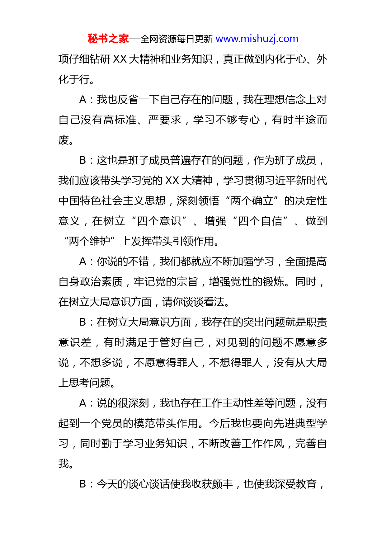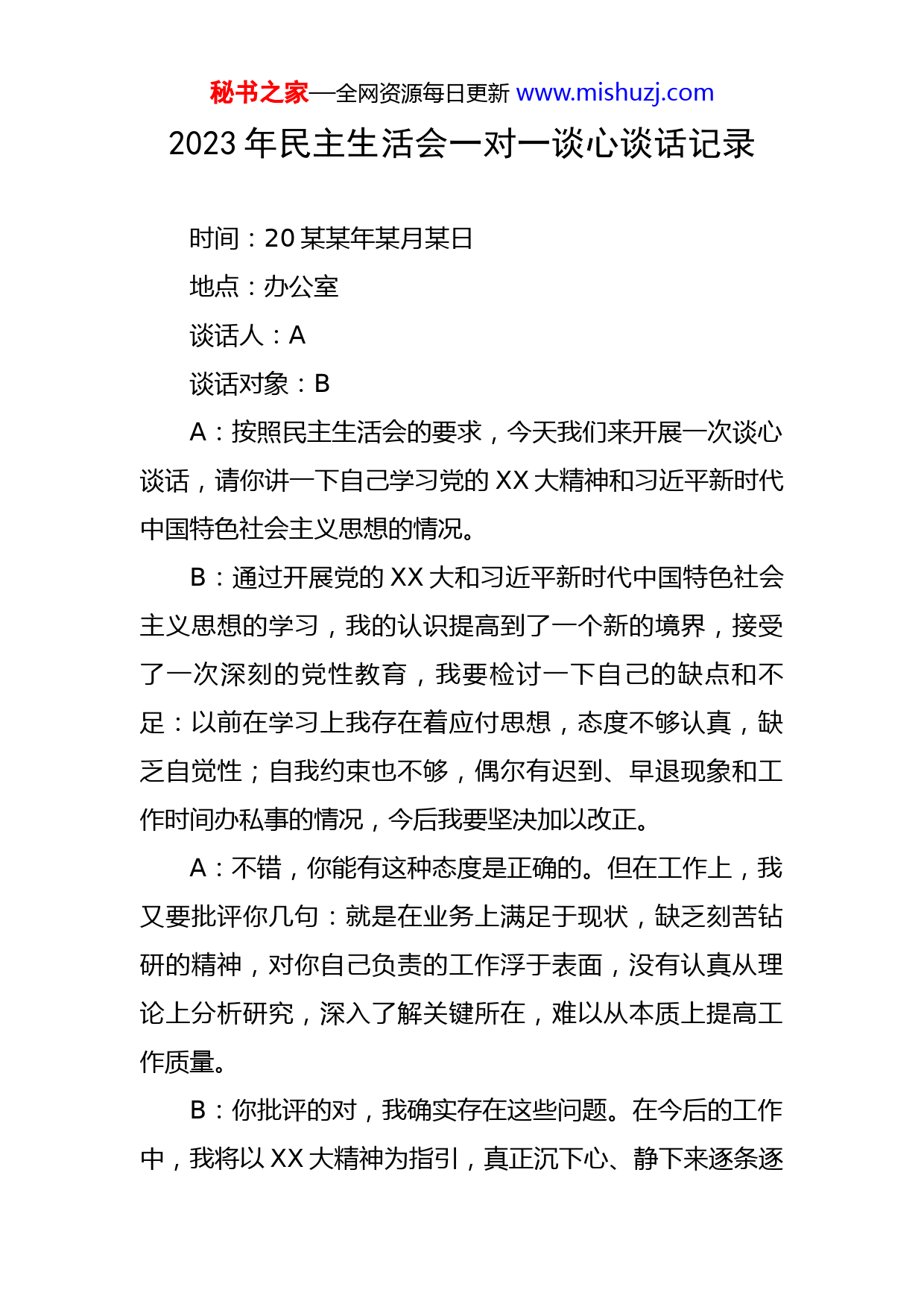 秘书之家—全网资源每日更新www.mishuzj.com2023年民主生活会一对一谈心谈话记录时间:20某某年某月某日地点:办公室谈话人:A谈话对象:BA:按照民主生活会的要求,今天我们来开展一次谈心谈话,请你讲一下自己学习党的XX大精神和习近平新时代中国特色社会主义思想的情况。B:通过开展党的XX大和习近平新时代中国特色社会主义思想的学习,我的认识提高到了一个新的境界,接受了一次深刻的党性教育,我要检讨一下自己的缺点和不足:以前在学习上我存在着应付思想,态度不够认真,缺乏自觉性;自我约束也不够,偶尔有迟到、早退现象和工作时间办私事的情况,今后我要坚决加以改正。A:不错,你能有这种态度是正确的。但在工作上,我又要批评你几句:就是在业务上满足于现状,缺乏刻苦钻研的精神,对你自己负责的工作浮于表面,没有认真从理论上分析研究,深入了解关键所在,难以从本质上提高工作质量。B:你批评的对,我确实存在这些问题。在今后的工作中,我将以XX大精神为指引,真正沉下心、静下来逐条逐秘书之家—全网资源每日更新www.mishuzj.com项仔细钻研XX大精神和业务知识,真正做到内化于心、外化于行。A:我也反省一下自己存在的问题,我在理想信念上对自己没有高标准、严要求,学习不够专心,有时半途而废。B:这也是班子成员普遍存在的问题,作为班子成员,我们应该带头学习党的XX大精神,学习贯彻习近平新时代中国特色社会主义思想,深刻领悟“两个确立”的决定性意义,在树立“四个意识”、增强“四个自信”、做到“两个维护”上发挥带头引领作用。A:你说的不错,我们都就应不断加强学习,全面提高自身政治素质,牢记党的宗旨,增强党性的锻炼。同时,在树立大局意识方面,请你谈谈看法。B:在树立大局意识方面,我存在的突出问题就是职责意识差,有时满足于管好自己,对见到的问题不愿意多说,不想多说,不愿意得罪人,不想得罪人,没有从大局上思考问题。A:说的很深刻,我也存在工作主动性差等问题,没有起到一个党员的模范带头作用。今后我也要向先进典型学习,同时勤于学习业务知识,不断改善工作作风,完善自我。B:今天的谈心谈话使我收获颇丰,也使我深受教育,秘书之家—全网资源每日更新www.mishuzj.com在今后的工作中,我将认真学习党的XX大和习近平新时代中国特色社会主义思想,真正做到知行合一、学以致用。A:很好,刚才讨论的大多是自己的缺点和不足,其实你平时的思想和工作表现都是不错的,能够遵守纪律,作风正派,工作勤恳,为某某事业作出了应有的贡献。B:感谢领导的肯定,今后我将倍加努力,不辜负组织和领导的信任。秘书之家—全网资源每日更新www.mishuzj.com时间:20某某年某月某日地点:某某办公室谈话人:A谈话对象:BA:党员谈心活动开好民主生活会的重要一环,我们必须从思想上重视。今天我以一名普通党员的身份和你一起交流思想、聊聊天,请不要拘束,工作、学习、生活各方面都可以谈。B:好的。通过近期对党的XX大精神和习近平新时代中国特色社会主义思想的学习,我深刻认识到了“两个确立”的决定性意义,提高了政治站位,增强了“四个意识”,自觉在思想上、政治上、行动上同党中央保持高度一致。A:不错,学习贯彻党的XX大精神将是接下来政治理论学习的重中之重,希望我们都能重视起来,说到这里,我要检讨一下自己在理论学习方面的不足,虽然每月都组织大家进行理论学习,然而我真正运用到实际工作中的不多,导致实际工作的站位不高、全局性不够。我也将在今后的工作中注重知行合一、学以致用。B:我深受启发,反思看来,我对党的XX大精神的学习还不够全面系统,把握还不够精准到位,在静下心、坐下来、钻进去方面做的还不够,思想认识主观感性的多、秘书之家—全网资源每日更新www.mishuzj.com点状和碎片化的多,完整系统的理论学习不够,深刻准确的理论领会不够,没有完全做到入脑入心。我也将在今后的学习工作中加以改进。A:党的XX大精神立意深远、内涵丰富,在以后的学习中我们共同监督,共同进步。接下来请你谈谈在坚持以人民为中心的发展思想方面自己有什么看法。B:我在贯彻落实以人民为中心的发展思想方面还不到位,在处理分管工作时与人民群众的根本利益结合不够紧密,对群众反映的难点热点问题,拓思路、出点子还不够。A:反省的比较深刻,习近平总书记在党的XX大报告中明确了前进道路上必须牢牢把握的“五个重大原则”,其中一个原则就是“坚持以人民为中心的发展思想”。我们在工作中要紧紧抓住人民最关心最直接最现实的利益问题,坚持尽力而为、量力而行,深入群众、深入基层,采取更多惠民生、暖民心举措,着力解决好人民群众急难愁盼问题。B:你分析的很深刻,我在工作中有时会淡忘了我们党为人民谋幸福、为民族谋复兴的初心和使命,摆不正自己与群众的位置,未能时时事事都以人民为中心,在接下来的工作中,我将回归到群众路线中来,在用实际行动回答好“从哪里来、往哪里去”这个基本命题。秘书之家—全网资源每日更新www.mishuzj.comA:今天的谈话比较深刻,我也收获颇丰,这次民主生活会是党的XX大召开后的第一次民主生活会,是深入学习贯彻党的XX大精神的重要举措,我们务必要重视,深刻剖析自己在“六个带头”方面存在的问题,认真详尽写好个人的剖析材料,争取让民主生活会