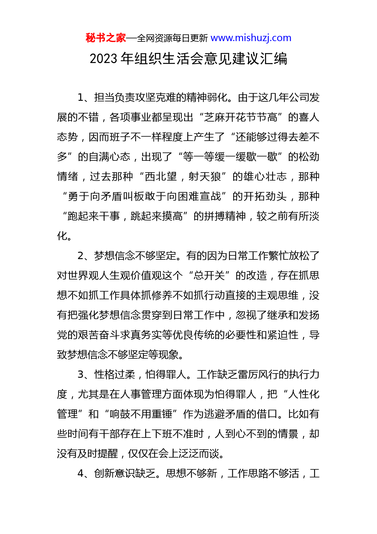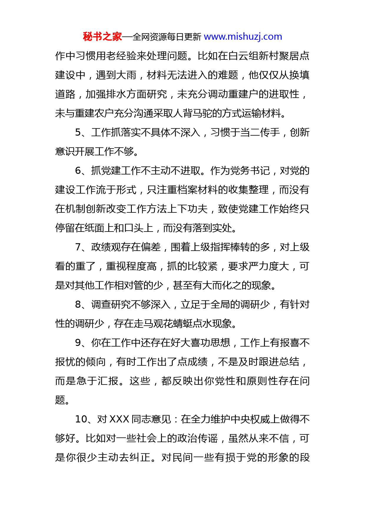 秘书之家—全网资源每日更新www.mishuzj.com2023年组织生活会意见建议汇编1、担当负责攻坚克难的精神弱化。由于这几年公司发展的不错,各项事业都呈现出“芝麻开花节节高”的喜人态势,因而班子不一样程度上产生了“还能够过得去差不多”的自满心态,出现了“等一等缓一缓歇一歇”的松劲情绪,过去那种“西北望,射天狼”的雄心壮志,那种“勇于向矛盾叫板敢于向困难宣战”的开拓劲头,那种“跑起来干事,跳起来摸高”的拼搏精神,较之前有所淡化。2、梦想信念不够坚定。有的因为日常工作繁忙放松了对世界观人生观价值观这个“总开关”的改造,存在抓思想不如抓工作具体抓修养不如抓行动直接的主观思维,没有把强化梦想信念贯穿到日常工作中,忽视了继承和发扬党的艰苦奋斗求真务实等优良传统的必要性和紧迫性,导致梦想信念不够坚定等现象。3、性格过柔,怕得罪人。工作缺乏雷厉风行的执行力度,尤其是在人事管理方面体现为怕得罪人,把“人性化管理”和“响鼓不用重锤”作为逃避矛盾的借口。比如有些时间有干部存在上下班不准时,人到心不到的情景,却没有及时提醒,仅仅在会上泛泛而谈。4、创新意识缺乏。思想不够新,工作思路不够活,工秘书之家—全网资源每日更新www.mishuzj.com作中习惯用老经验来处理问题。比如在白云组新村聚居点建设中,遇到大雨,材料无法进入的难题,他仅仅从换填道路,加强排水方面研究,未充分调动重建户的进取性,未与重建农户充分沟通采取人背马驼的方式运输材料。5、工作抓落实不具体不深入,习惯于当二传手,创新意识开展工作不够。6、抓党建工作不主动不进取。作为党务书记,对党的建设工作流于形式,只注重档案材料的收集整理,而没有在机制创新改变工作方法上下功夫,致使党建工作始终只停留在纸面上和口头上,而没有落到实处。7、政绩观存在偏差,围着上级指挥棒转的多,对上级看的重了,重视程度高,抓的比较紧,要求严力度大,可是对其他工作相对管的少,甚至有大而化之的现象。8、调查研究不够深入,立足于全局的调研少,有针对性的调研少,存在走马观花蜻蜓点水现象。9、你在工作中还存在好大喜功思想,工作上有报喜不报忧的倾向,有时工作出了点成绩,不是及时跟进总结,而是急于汇报。这些,都反映出你党性和原则性存在问题。10、对XXX同志意见:在全力维护中央权威上做得不够好。比如对一些社会上的政治传谣,虽然从来不信,可是你很少主动去纠正。对民间一些有损于党的形象的段秘书之家—全网资源每日更新www.mishuzj.com子,你也没能很好地制止。11、党政信息报送采用少。作为党政办工作人员,又同时担任过宣传干事工作,党政信息报送及采用状况一般,去年,为提高街道基层反映采用率,安排过晓燕同志调训学习,调训期间加了多分,但调训回来,就很少主动写基层反映了,甚至安排布置的题目也不能按时完成。12、工作上存在懒政拖拉现象。组织工作时赵新年同志的主要工作,可是他对党支部工作没有以前用心,期望他以后能多用点心思,持续党员队伍的纯洁性,党员带头党支部带头将社区建设更好。13、工作效率不高。由于汪能丰同志是本届新上任的同志,工作方法上有待提高,期望以后能统筹兼顾,提升工作效率。14、吃苦精神和进取精神不强,表此刻工作安逸现状,缺乏工作活力,只求过得去不求过得硬,认为自我已年过岁,对自我要求不高了,满足于完成任务,有等退休的思想,这个问题聚焦到“四风”问题上就是典型的享乐主义的表现。15、作为副书记,在实际工作中把自我等同于普通班子成员,发挥带头作用不够,实际上是工作标准不高的表现。平时只忙于自我分管的工作,主动帮忙县委书记谋划秘书之家—全网资源每日更新www.mishuzj.com大事出谋划策还有欠妥,还缺乏分忧意识担当精神。16、郑xx同志的意见:进取意识不够彰显。想问题做工作受惯性思维束缚,经常是以前怎样做就怎样做,别人怎样做就怎样做,进取意识不强,突破动力不足,存在船到码头车到站的思想。17、性格太直白,有时候个性表现的太张扬,有时与个人身份组织形象有点不相称。18、工作质量不高。主要表现:一是在工作上缺乏思考谋划,工作方式方法简单,工作只求过得去,不求高质量;二是在文字材料写作上不认真思考,对上级精神吃得不够透,生搬硬套别人的东西,有时甚至要打字室打字员在网上下载摘抄,影响材料质量。19、班子成员与普通干部职工谈心交心少,沟通协调差。各办公室工作忙闲不均,相互配合不够,有时相互推诿,出现中梗阻,安排任务讲条件,干工作消极畏难,工作疲踏,效率不高,存在工作部署多,督促检查少,致使不少工作有布置无动作,有要求无效果。班子成员包括我自我在内都存在不愿与部分同志谈心的现象,认为与这些人谈了也是白谈,起不到任何效果,导致与这部分干部间的距离越来越大。总的来说就是在与干部沟通方面本事太差。20、工作不实落实不力。去年的我社区办公楼建设,秘书之家—全网资源每日更新www.mishuzj.com在质量上是过关的,可是在工程安全问题上,工作不到位,比如说安全帽佩戴问题,并没有严格按照制度进行,对个别不戴安全帽的同志也是睁一只眼闭一只眼。21、工作作风不扎实,工作要求不够高。比如在工作中有时接到上级的任务时,首先想到的是如何尽快完成,而不是怎样做