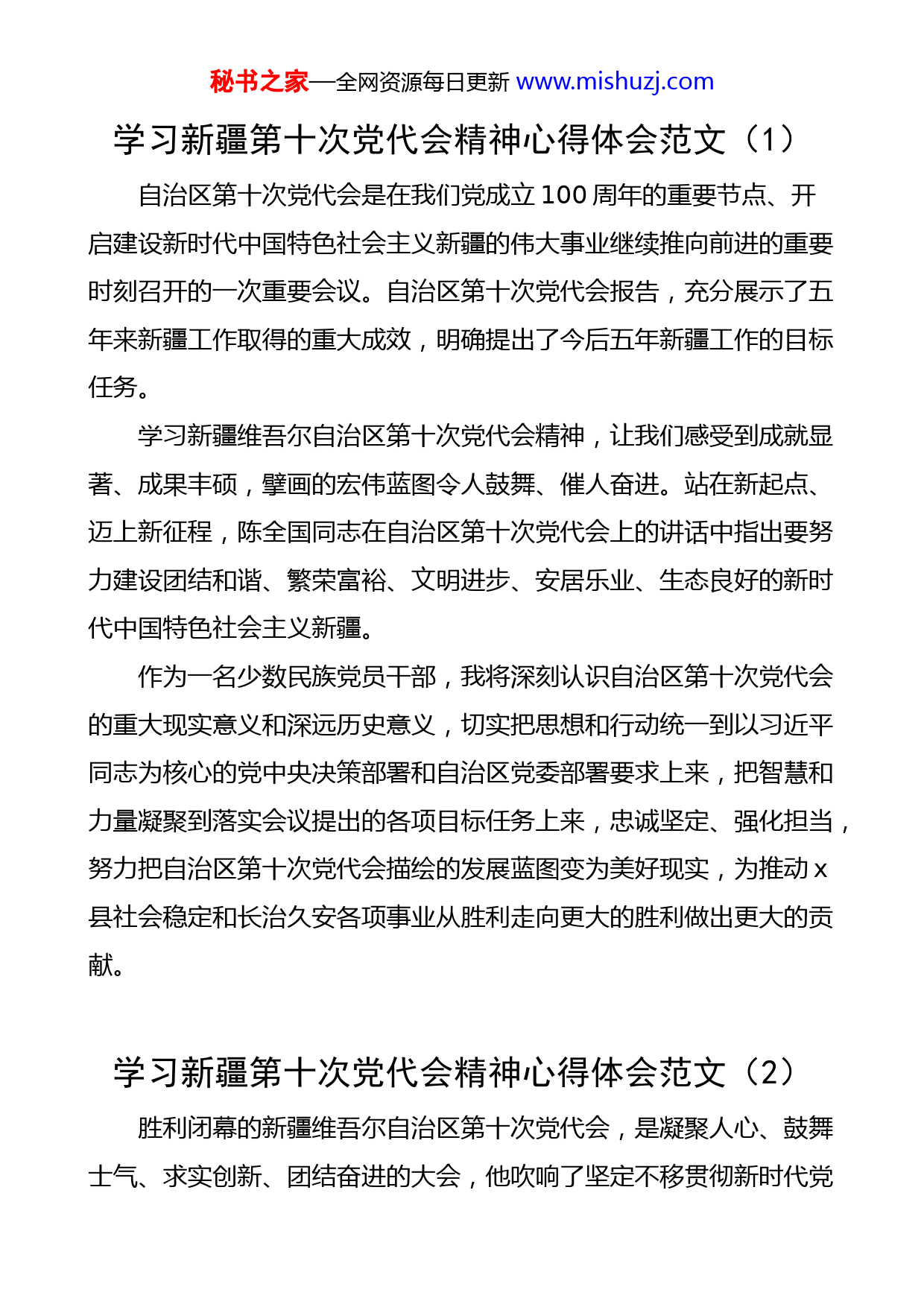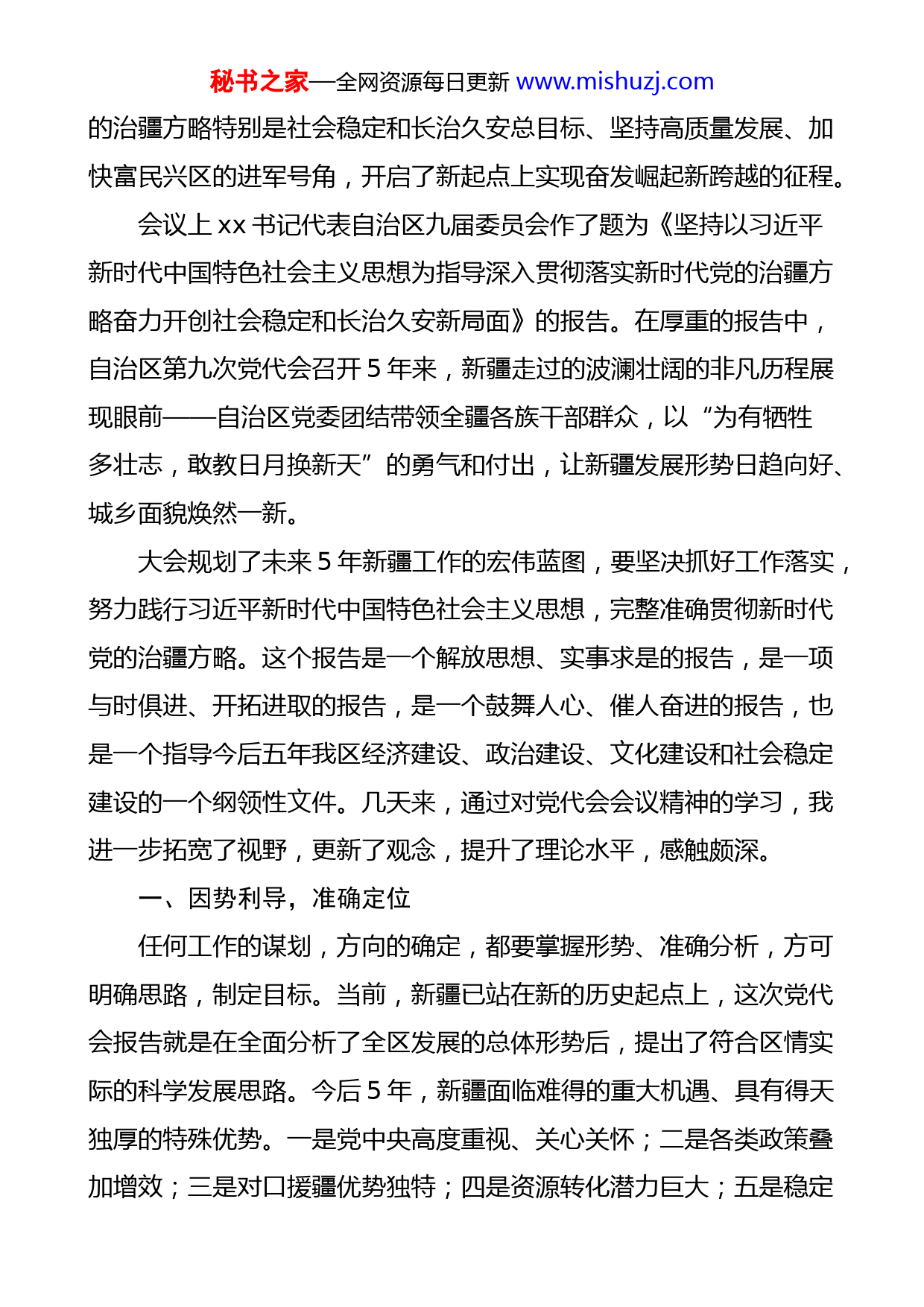 秘书之家—全网资源每日更新www.mishuzj.com学习新疆第十次党代会精神心得体会范文(1)自治区第十次党代会是在我们党成立100周年的重要节点、开启建设新时代中国特色社会主义新疆的伟大事业继续推向前进的重要时刻召开的一次重要会议。自治区第十次党代会报告,充分展示了五年来新疆工作取得的重大成效,明确提出了今后五年新疆工作的目标任务。学习新疆维吾尔自治区第十次党代会精神,让我们感受到成就显著、成果丰硕,擘画的宏伟蓝图令人鼓舞、催人奋进。站在新起点、迈上新征程,陈全国同志在自治区第十次党代会上的讲话中指出要努力建设团结和谐、繁荣富裕、文明进步、安居乐业、生态良好的新时代中国特色社会主义新疆。作为一名少数民族党员干部,我将深刻认识自治区第十次党代会的重大现实意义和深远历史意义,切实把思想和行动统一到以习近平同志为核心的党中央决策部署和自治区党委部署要求上来,把智慧和力量凝聚到落实会议提出的各项目标任务上来,忠诚坚定、强化担当,努力把自治区第十次党代会描绘的发展蓝图变为美好现实,为推动x县社会稳定和长治久安各项事业从胜利走向更大的胜利做出更大的贡献。学习新疆第十次党代会精神心得体会范文(2)胜利闭幕的新疆维吾尔自治区第十次党代会,是凝聚人心、鼓舞士气、求实创新、团结奋进的大会,他吹响了坚定不移贯彻新时代党秘书之家—全网资源每日更新www.mishuzj.com的治疆方略特别是社会稳定和长治久安总目标、坚持高质量发展、加快富民兴区的进军号角,开启了新起点上实现奋发崛起新跨越的征程。会议上xx书记代表自治区九届委员会作了题为《坚持以习近平新时代中国特色社会主义思想为指导深入贯彻落实新时代党的治疆方略奋力开创社会稳定和长治久安新局面》的报告。在厚重的报告中,自治区第九次党代会召开5年来,新疆走过的波澜壮阔的非凡历程展现眼前——自治区党委团结带领全疆各族干部群众,以“为有牺牲多壮志,敢教日月换新天”的勇气和付出,让新疆发展形势日趋向好、城乡面貌焕然一新。大会规划了未来5年新疆工作的宏伟蓝图,要坚决抓好工作落实,努力践行习近平新时代中国特色社会主义思想,完整准确贯彻新时代党的治疆方略。这个报告是一个解放思想、实事求是的报告,是一项与时俱进、开拓进取的报告,是一个鼓舞人心、催人奋进的报告,也是一个指导今后五年我区经济建设、政治建设、文化建设和社会稳定建设的一个纲领性文件。几天来,通过对党代会会议精神的学习,我进一步拓宽了视野,更新了观念,提升了理论水平,感触颇深。一、因势利导,准确定位任何工作的谋划,方向的确定,都要掌握形势、准确分析,方可明确思路,制定目标。当前,新疆已站在新的历史起点上,这次党代会报告就是在全面分析了全区发展的总体形势后,提出了符合区情实际的科学发展思路。今后5年,新疆面临难得的重大机遇、具有得天独厚的特殊优势。一是党中央高度重视、关心关怀;二是各类政策叠加增效;三是对口援疆优势独特;四是资源转化潜力巨大;五是稳定秘书之家—全网资源每日更新www.mishuzj.com红利充分释放;六是民心人心极大凝聚。自治区第十次党代会报告中,明确提出新疆迎来令人振奋的“六大机遇”。每一个“机遇”都让人热血沸腾,都预示着新疆未来发展的前景。对我区来说,是一个孕育着新的重大变化的五年,是抢抓机遇,助推高质量发展,也是我们必须倍加珍惜并牢牢抓住的、属于新疆的重要战略机遇期。所以在今后的工作中,我们要树立“紧抓机遇,埋头实干”的工作精神,在工作中定位好自己。二、理念科学,与时俱进报告突出以科学发展观统领全局,立意高远,从报告的主题到主线,从立论到指导思想,到工作目标,到发展战略和工作任务及举措都体现出科学发展观统领的特点,可以说,这是一个最科学的报告,也是一个最符合发展规律的报告。同时这次党代会报告不但具有理论性,更具有实践性和科学性,所以我们在工作中时刻牢记自己作为一名共产党员的使命观,在工作中勤勤恳恳,与时俱进,充分发挥党员模范带头作用,把智慧和力量凝聚到大会确定的目标任务上来,锤炼好作风,展现新作为。三、鼓舞人心,催人奋进报告勾画了自治区五年的发展蓝图,充分阐述了所面临的形势和发展机遇,非常鼓舞人心,对新疆的未来充满了期待和憧憬,催人奋发向上,同时更感觉责任重大,进一步增强了做好本职工作的责任感和使命感。作为基层的一名党员干部,要牢牢把握好新的发展机遇,立足自身职责,明确工作思路,创新工作举措,适应高质量发展要求,秘书之家—全网资源每日更新www.mishuzj.com在工作实践中认真加以落实。要做到这些,我认为必须强化以下“四个意识”:一是强化大局意识。就是要在工作中善于把握发展大局,这是创造性地做好本职工作的根本要求和重要保证。要胸有全局,找准第十次党代会精神和我们工作实际的结合点,深刻理解和把握党代会所确定的全区每个阶段重点工作和发展大局,一切工作都要服从服务于自治区发展。并认清发展形势,因势利导,掌握工作的主动权。只有在这样才能保持正确的工作方向。二是强化学习意识。是适应新形势的需要,只有加强学习,不断提高,才能更好的把握大局,才能全面落实这次党代