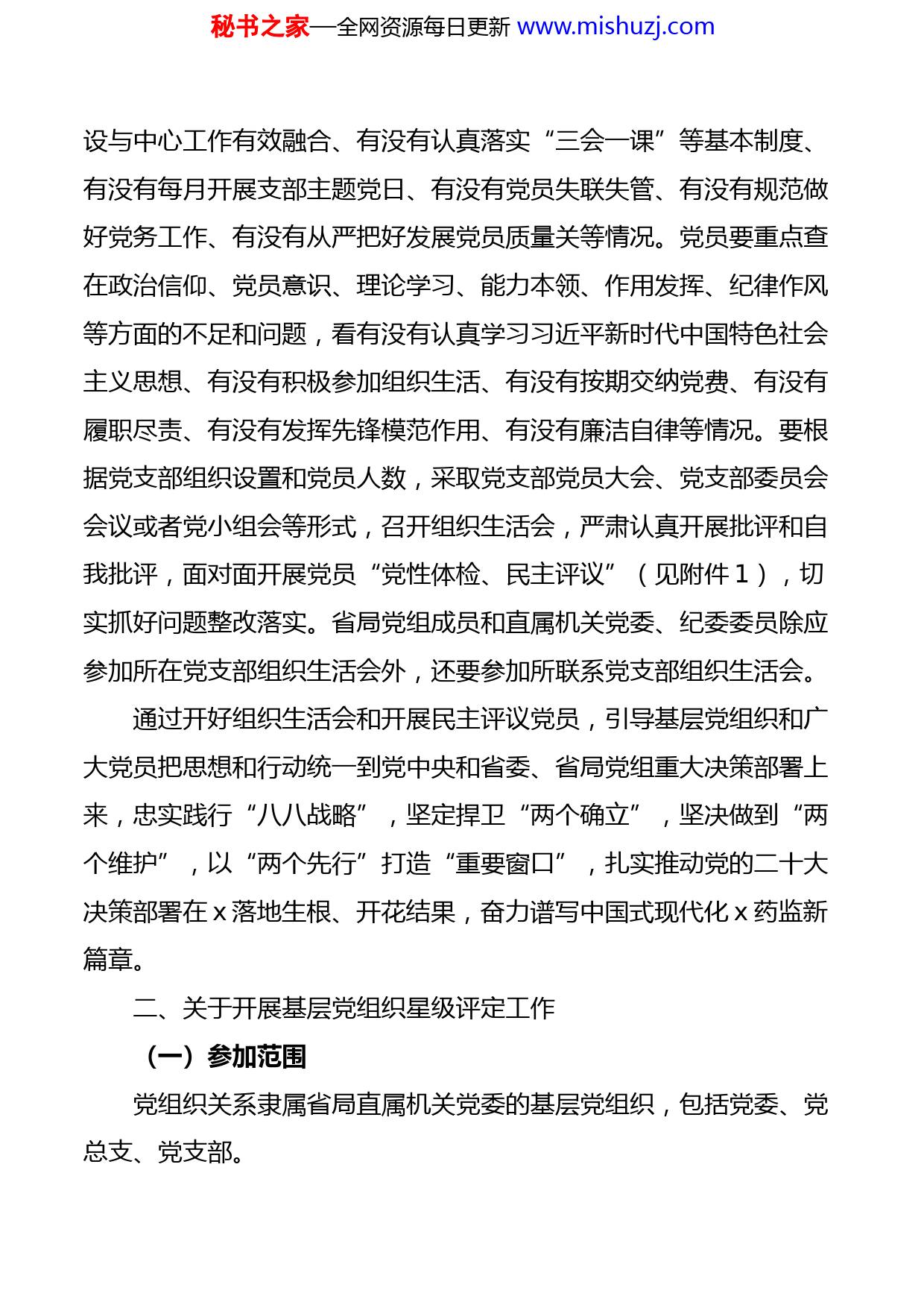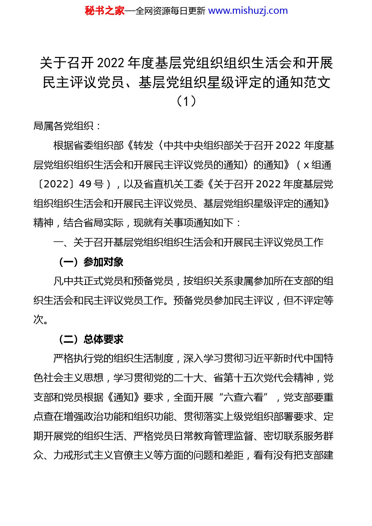 秘书之家—全网资源每日更新www.mishuzj.com关于召开2022年度基层党组织组织生活会和开展民主评议党员、基层党组织星级评定的通知范文(1)局属各党组织:根据省委组织部《转发〈中共中央组织部关于召开2022年度基层党组织组织生活会和开展民主评议党员的通知〉的通知》(x组通〔2022〕49号),以及省直机关工委《关于召开2022年度基层党组织组织生活会和开展民主评议党员、基层党组织星级评定的通知》精神,结合省局实际,现就有关事项通知如下:一、关于召开基层党组织组织生活会和开展民主评议党员工作(一)参加对象凡中共正式党员和预备党员,按组织关系隶属参加所在支部的组织生活会和民主评议党员工作。预备党员参加民主评议,但不评定等次。(二)总体要求严格执行党的组织生活制度,深入学习贯彻习近平新时代中国特色社会主义思想,学习贯彻党的二十大、省第十五次党代会精神,党支部和党员根据《通知》要求,全面开展“六查六看”,党支部要重点查在增强政治功能和组织功能、贯彻落实上级党组织部署要求、定期开展党的组织生活、严格党员日常教育管理监督、密切联系服务群众、力戒形式主义官僚主义等方面的问题和差距,看有没有把支部建秘书之家—全网资源每日更新www.mishuzj.com设与中心工作有效融合、有没有认真落实“三会一课”等基本制度、有没有每月开展支部主题党日、有没有党员失联失管、有没有规范做好党务工作、有没有从严把好发展党员质量关等情况。党员要重点查在政治信仰、党员意识、理论学习、能力本领、作用发挥、纪律作风等方面的不足和问题,看有没有认真学习习近平新时代中国特色社会主义思想、有没有积极参加组织生活、有没有按期交纳党费、有没有履职尽责、有没有发挥先锋模范作用、有没有廉洁自律等情况。要根据党支部组织设置和党员人数,采取党支部党员大会、党支部委员会会议或者党小组会等形式,召开组织生活会,严肃认真开展批评和自我批评,面对面开展党员“党性体检、民主评议”(见附件1),切实抓好问题整改落实。省局党组成员和直属机关党委、纪委委员除应参加所在党支部组织生活会外,还要参加所联系党支部组织生活会。通过开好组织生活会和开展民主评议党员,引导基层党组织和广大党员把思想和行动统一到党中央和省委、省局党组重大决策部署上来,忠实践行“八八战略”,坚定捍卫“两个确立”,坚决做到“两个维护”,以“两个先行”打造“重要窗口”,扎实推动党的二十大决策部署在x落地生根、开花结果,奋力谱写中国式现代化x药监新篇章。二、关于开展基层党组织星级评定工作(一)参加范围党组织关系隶属省局直属机关党委的基层党组织,包括党委、党总支、党支部。秘书之家—全网资源每日更新www.mishuzj.com(二)主要内容局属各党组织要按照要求,结合实际细化基层党组织评价标准。通过组织党员群众测评、广泛听取意见等,结合年度党建工作考核,确定基层党组织星级等次。五星级党组织比例原则上不超过15%。根据《关于全面实行底线管理深化推进后进基层党组织整顿转化工作的通知》(x直委发〔2018〕18号)要求,凡出现底线管理标准中的十条情形的,应视情节评定为二星、一星或无星级党组织。对二星级及以下的后进基层党组织要研究制定整转措施,列出问题清单、整改清单和责任清单,明确责任人和整转时限,落实领导联系帮扶制度,推进整转提升,推动全面进步全面过硬。三、工作要求召开组织生活会和开展民主评议党员、基层党组织星级评定等工作,是严肃党内政治生活、严格党员教育管理监督、提升基层党组织组织力的重要措施。各级党组织要高度重视、认真组织、加强督导,严格工作要求,规范工作程序,切实保证质量。要坚决防止和纠正形式主义官僚主义,不要求党支部搞工作方案、总结报告等材料,不要求党员撰写个人发言材料,以好的作风确保工作实效。如需表彰优秀共产党员、优秀党务工作者和先进基层党组织,可在上述工作基础上,按《中国共产党x省委员会党内功勋荣誉表彰实施细则》执行。请局属各党组织于2023年3月15日前,将开展民主评议党员和基层党组织星级评定工作有关情况和统计表,通过报省局直属机关秘书之家—全网资源每日更新www.mishuzj.com党委,并将结果通过“红色根脉强基系统”“x里机关党建工作台—支部工作在线”“省局党务在线”录入。联系人:x,联系电话:xx附件:1.党员党性体检评议表2.2022年度民主评议党员情况统计表3.2022年度基层党组织星级评定结果汇总表附件1党员党性体检评议表党组织名称(盖章):年月日序号党员姓名评价情况优秀合格基本合格不合格注:请按照党员理想信念、政治纪律、组织纪律、宗旨意识、模范带头、履行义务等方面表现进行综合评议,评为“优秀”等次的一般不超过党员总数的三分之一。附件22022年度民主评议党员情况统计表填报单位:填表人:联系电话:填表时间:年月日党员总数(人参加民主评议优秀党员数基本合格党员不合格党员数不合格党员作出整改承诺限期改正劝退(人除名(人秘书之家—全网资源每日更新www.mishuzj.com)党员数(人)(人)数(人)(人)错误(人)))党员数(人)注:请于2023年3月15日前报送省局直属机关党委。附件32022年度基层党组织星级评定结果汇总表填报单位:填