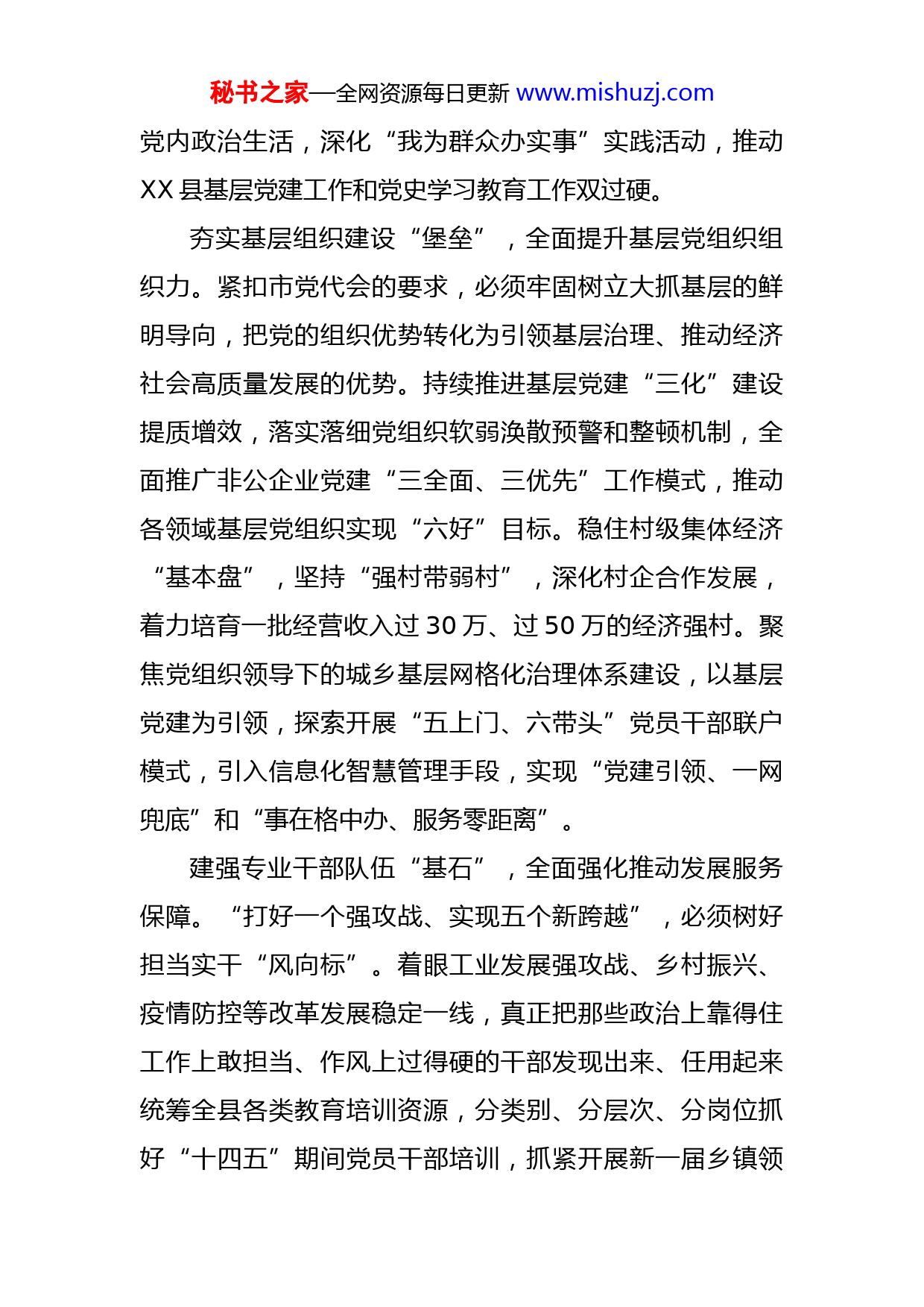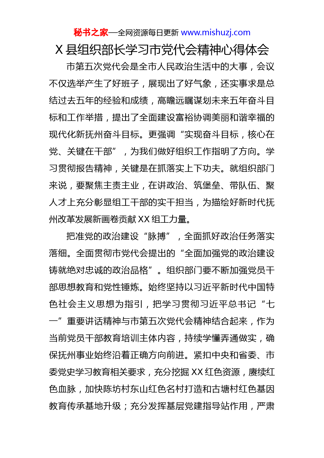 秘书之家—全网资源每日更新www.mishuzj.comX县组织部长学习市党代会精神心得体会市第五次党代会是全市人民政治生活中的大事,会议不仅选举产生了好班子,展现出了好气象,还实事求是总结过去五年的经验和成绩,高瞻远瞩谋划未来五年奋斗目标和工作举措,提出了全面建设富裕协调美丽和谐幸福的现代化新抚州奋斗目标。更强调“实现奋斗目标,核心在党、关键在干部”,为我们做好组织工作指明了方向。学习贯彻报告精神,关键是在抓落实上下功夫。就组织部门来说,要聚焦主责主业,在讲政治、筑堡垒、带队伍、聚人才上充分彰显组工干部的实干担当,为描绘好新时代抚州改革发展新画卷贡献XX组工力量。把准党的政治建设“脉搏”,全面抓好政治任务落实落细。全面贯彻市党代会提出的“全面加强党的政治建设铸就绝对忠诚的政治品格”。组织部门要不断加强党员干部思想教育和党性锤炼。始终坚持以习近平新时代中国特色社会主义思想为指引,把学习贯彻习近平总书记“七一”重要讲话精神与市第五次党代会精神结合起来,作为当前党员干部教育培训主体内容,持续学懂弄通做实,确保抚州事业始终沿着正确方向前进。紧扣中央和省委、市委党史学习教育相关要求,充分挖掘XX红色资源,赓续红色血脉,加快陈坊村东山红色名村打造和古塘村红色基因教育传承基地升级;充分发挥基层党建指导站作用,严肃秘书之家—全网资源每日更新www.mishuzj.com党内政治生活,深化“我为群众办实事”实践活动,推动XX县基层党建工作和党史学习教育工作双过硬。夯实基层组织建设“堡垒”,全面提升基层党组织组织力。紧扣市党代会的要求,必须牢固树立大抓基层的鲜明导向,把党的组织优势转化为引领基层治理、推动经济社会高质量发展的优势。持续推进基层党建“三化”建设提质增效,落实落细党组织软弱涣散预警和整顿机制,全面推广非公企业党建“三全面、三优先”工作模式,推动各领域基层党组织实现“六好”目标。稳住村级集体经济“基本盘”,坚持“强村带弱村”,深化村企合作发展,着力培育一批经营收入过30万、过50万的经济强村。聚焦党组织领导下的城乡基层网格化治理体系建设,以基层党建为引领,探索开展“五上门、六带头”党员干部联户模式,引入信息化智慧管理手段,实现“党建引领、一网兜底”和“事在格中办、服务零距离”。建强专业干部队伍“基石”,全面强化推动发展服务保障。“打好一个强攻战、实现五个新跨越”,必须树好担当实干“风向标”。着眼工业发展强攻战、乡村振兴、疫情防控等改革发展稳定一线,真正把那些政治上靠得住工作上敢担当、作风上过得硬的干部发现出来、任用起来统筹全县各类教育培训资源,分类别、分层次、分岗位抓好“十四五”期间党员干部培训,抓紧开展新一届乡镇领秘书之家—全网资源每日更新www.mishuzj.com导班子轮训,着力提高干部队伍的履职能力;做好年轻干部的“选种育苗”工作,确保全县发展后备力量持续充足注重严管厚爱,深入推进绩效考核评价改革,用好用活职级晋升政策,完善激励机制和容错纠错机制,切实为基层减负,汇聚担当作为正能量。深耕人才引用育留“沃土”,全面激发创新创造活力动力。认真贯彻落实中央人才工作会议重要精神及市党代会提出的“大力实施人才强市和科技强市战略”要求,组织部门要充分发挥好“牵头抓总”作用。坚持“党管人才”,深化体制机制改革,加快高新区管理体制改革,以“最多跑一次”改革为牵引,打通服务人才“最后一公里”闭环。常态开展“双返双创”“三请三回”等活动,加快引导XX籍人才总部回迁。积极申报创建省级支持服务人才创新创业示范基地,围绕输变电、电子信息、麻鸡、蔬菜等重点产业,加快推进“双一工程”和“两高”建设加强与高校、科研院所、智库的合作,深化“三院两镇一中心”建设。启动新一届县管突出贡献人才、拔尖人才、优秀农村实用人才评选表彰活动,加快建设新一批院士楼和人才公寓,加大人才关怀、宣传和政治吸纳力度,推动形成“尊才、爱才、敬才、用才”的良好局面。