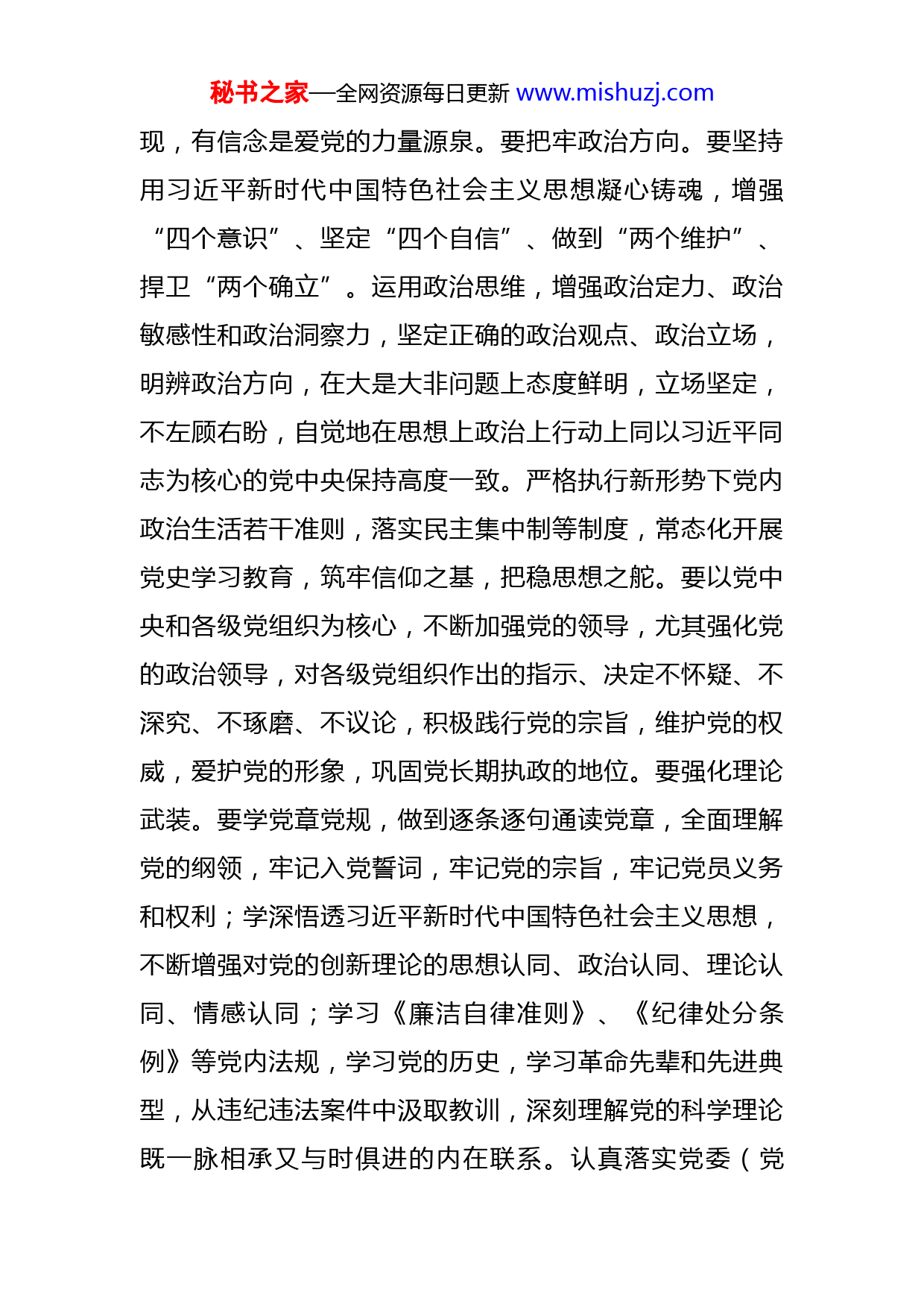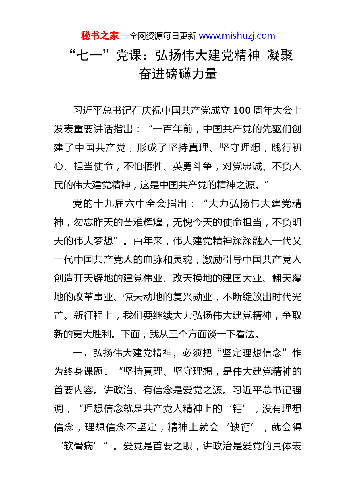 秘书之家—全网资源每日更新www.mishuzj.com“七一”党课:弘扬伟大建党精神凝聚奋进磅礴力量习近平总书记在庆祝中国共产党成立100周年大会上发表重要讲话指出:“一百年前,中国共产党的先驱们创建了中国共产党,形成了坚持真理、坚守理想,践行初心、担当使命,不怕牺牲、英勇斗争,对党忠诚、不负人民的伟大建党精神,这是中国共产党的精神之源。”党的十九届六中全会指出:“大力弘扬伟大建党精神,勿忘昨天的苦难辉煌,无愧今天的使命担当,不负明天的伟大梦想”。百年来,伟大建党精神深深融入一代又一代中国共产党人的血脉和灵魂,激励引导中国共产党人创造开天辟地的建党伟业、改天换地的建国大业、翻天覆地的改革事业、惊天动地的复兴勋业,不断绽放出时代光芒。新征程上,我们要继续大力弘扬伟大建党精神,争取新的更大胜利。下面,我从三个方面谈一下看法。一、弘扬伟大建党精神,必须把“坚定理想信念”作为终身课题。“坚持真理、坚守理想,是伟大建党精神的首要内容。讲政治、有信念是爱党之源。习近平总书记强调,“理想信念就是共产党人精神上的‘钙’,没有理想信念,理想信念不坚定,精神上就会‘缺钙’,就会得‘软骨病’”。爱党是首要之职,讲政治是爱党的具体表秘书之家—全网资源每日更新www.mishuzj.com现,有信念是爱党的力量源泉。要把牢政治方向。要坚持用习近平新时代中国特色社会主义思想凝心铸魂,增强“四个意识”、坚定“四个自信”、做到“两个维护”、捍卫“两个确立”。运用政治思维,增强政治定力、政治敏感性和政治洞察力,坚定正确的政治观点、政治立场,明辨政治方向,在大是大非问题上态度鲜明,立场坚定,不左顾右盼,自觉地在思想上政治上行动上同以习近平同志为核心的党中央保持高度一致。严格执行新形势下党内政治生活若干准则,落实民主集中制等制度,常态化开展党史学习教育,筑牢信仰之基,把稳思想之舵。要以党中央和各级党组织为核心,不断加强党的领导,尤其强化党的政治领导,对各级党组织作出的指示、决定不怀疑、不深究、不琢磨、不议论,积极践行党的宗旨,维护党的权威,爱护党的形象,巩固党长期执政的地位。要强化理论武装。要学党章党规,做到逐条逐句通读党章,全面理解党的纲领,牢记入党誓词,牢记党的宗旨,牢记党员义务和权利;学深悟透习近平新时代中国特色社会主义思想,不断增强对党的创新理论的思想认同、政治认同、理论认同、情感认同;学习《廉洁自律准则》、《纪律处分条例》等党内法规,学习党的历史,学习革命先辈和先进典型,从违纪违法案件中汲取教训,深刻理解党的科学理论既一脉相承又与时俱进的内在联系。认真落实党委(党秘书之家—全网资源每日更新www.mishuzj.com组)理论学习中心组学习规则,扎实推进学习型领导班子建设,及时学习习近平总书记最新重要讲话和重要指示批示精神,坚持不懈用党的创新理论武装头脑、指导实践。要巩固思想阵地。要向党中央看齐,向党的路线方针政策看齐,以党的意志为意志,以党的旗帜为旗帜,以党的方向为方向,坚决拥护党的主张,贯彻党的决议,执行党的部署,遵守党的纪律和规矩,紧跟党走,不走歪路,不走邪路,做政治上的明白人,成为党的忠诚卫士。要牢牢把握正确舆论导向,深化媒体融合发展,唱响主旋律,激发正能量,凝聚起同频共振的磅礴力量,以实现中国梦为奋斗目标,着眼于整个国家、整个民族,服从服务于中心工作,将个人理想与民族复兴的宏愿结合起来,志存高远,凝心聚力,奋发有为。二、弘扬伟大建党精神,必须把“践行初心使命”作为终身课题。“践行初心、担当使命”是伟大建党精神的重要内容,展现我们党的强大政治优势。成为一名党员是光荣的,其荣光之处不在于党员政治身份如何显耀,而在于党员应有舍己为公的奉献精神,在于党员在平凡的岗位上做出不平凡的业绩。树牢党员意识,要牢固树立在党为党意识,将自己所有的言行举止以是否符乎党员条件、是否符乎党员标准为参照,凡不符合党员身份的话不说,凡影响党的形象的事不做,立足岗位,扎根基层,一心一意秘书之家—全网资源每日更新www.mishuzj.com为党工作,聚精会神为党发展,把自己毕生的精力和生命都奉献给党,鞠躬尽瘁,死而后已。坚守为公情怀。满怀天下为公的思想,培育公而忘私的牺牲精神,要舍得牺牲自己的业余时间,舍得牺牲自己的爱好兴趣,静得下心,俯得下身,无私无畏、默默无闻地勤奋工作,始终保持干事创业、开拓进取的精气神,平常时候看得出来,关键时刻冲得上去,发扬不干好、不干出成绩就誓不罢休的韧劲,把各项具体的工作抓紧抓好、抓出成效,达到“能干事、想干事、会干事、干成事、不出事”的要求。践行为民宗旨。树牢民本观念,忠实践行全心全意为人民服务宗旨,始终坚持群众路线,密切联系群众,摒弃“官本位”陈腐思想,舍得放下架子,把百姓当衣食父母,自觉到群众中去,与群众打成一片,把群众所盼的事一件件抓好落实,把群众所想的事一桩桩变为现实,让群众真切地感受党的阳光雨露,增强党在群众中的威信。三、弘扬伟大建党精神,必须把“勇于自我革命”作为终身课题。勇于自我革命是中国共产党区别于其他政党的显著标志。无规矩不成方圆,纪律是稳压器,是压舱石,是规范行为的底线。没有
