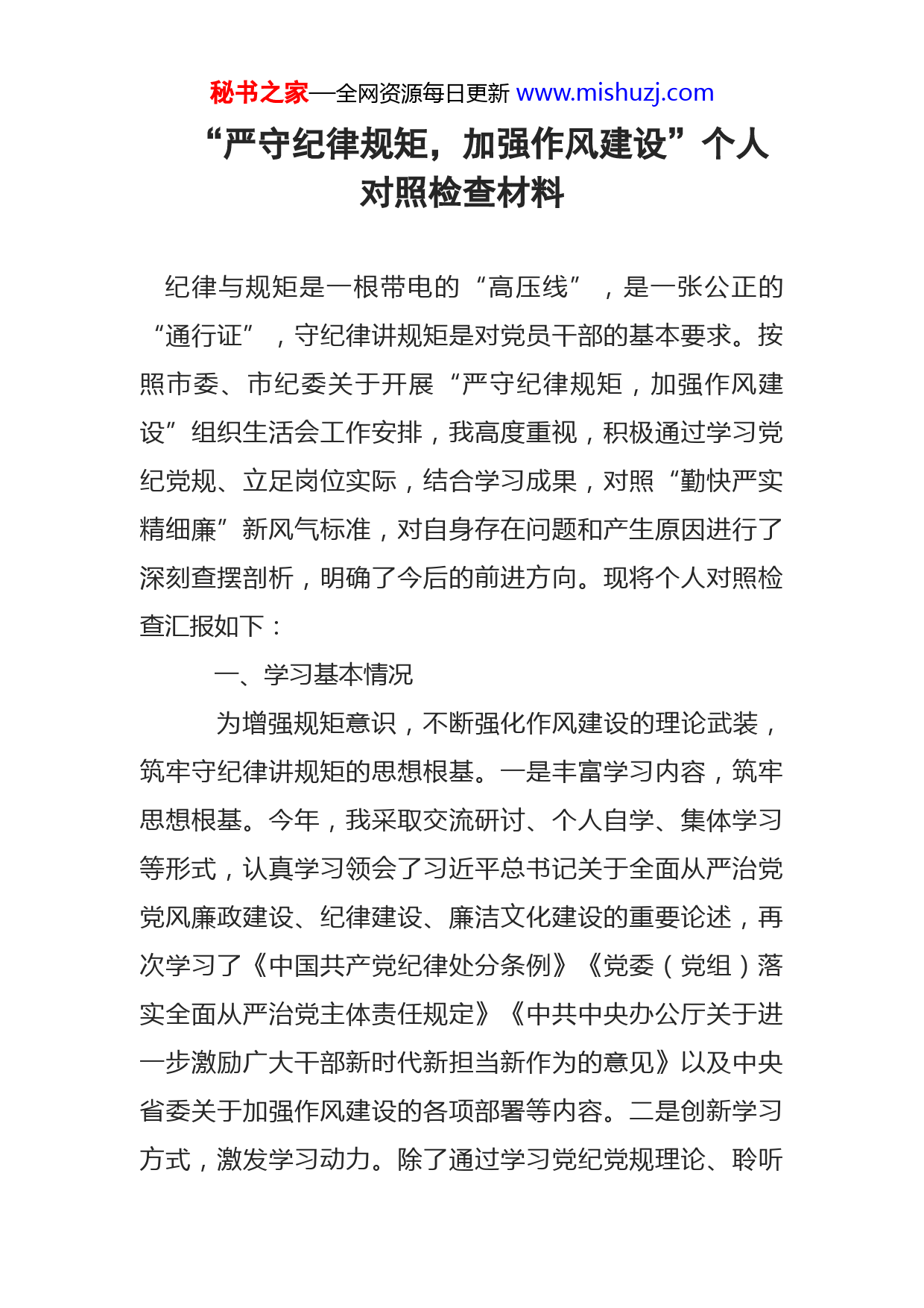 秘书之家—全网资源每日更新www.mishuzj.com“严守纪律规矩,加强作风建设”个人对照检查材料纪律与规矩是一根带电的“高压线”,是一张公正的“通行证”,守纪律讲规矩是对党员干部的基本要求。按照市委、市纪委关于开展“严守纪律规矩,加强作风建设”组织生活会工作安排,我高度重视,积极通过学习党纪党规、立足岗位实际,结合学习成果,对照“勤快严实精细廉”新风气标准,对自身存在问题和产生原因进行了深刻查摆剖析,明确了今后的前进方向。现将个人对照检查汇报如下:一、学习基本情况为增强规矩意识,不断强化作风建设的理论武装,筑牢守纪律讲规矩的思想根基。一是丰富学习内容,筑牢思想根基。今年,我采取交流研讨、个人自学、集体学习等形式,认真学习领会了习近平总书记关于全面从严治党党风廉政建设、纪律建设、廉洁文化建设的重要论述,再次学习了《中国共产党纪律处分条例》《党委(党组)落实全面从严治党主体责任规定》《中共中央办公厅关于进一步激励广大干部新时代新担当新作为的意见》以及中央省委关于加强作风建设的各项部署等内容。二是创新学习方式,激发学习动力。除了通过学习党纪党规理论、聆听秘书之家—全网资源每日更新www.mishuzj.com专题党课、参加知识测试、观看警示教育片等方式,创新党小组成员交流学习制度,通过小组会交流学习补齐短板弱项,强化理论武装,坚定理想信念,提高廉洁自律意识自觉抵制腐败、远离腐败,筑牢本次组织生活会的思想根基,严守政治纪律和政治规矩。三是深化学习广度,提升队伍建设。将业务知识学习纳入理论学习范畴,开展业务知识培训,专业领域讲座,2022年,先后组织单位党员干部实地调研学习共9次,组织班子集中学习30余次,党员干部集中学习52次,集中讨论9次,邀请党校老师讲党课3次。二、查摆的问题通过全面查摆、系统梳理、深刻反思,从以下五个方面查找了主要问题:(一)规矩意识方面一是党规党纪理论学习不够,党性修养还需提高,对理论学习的重视不高,经常以日常业务工作繁忙为由,忽略参加党小组会议。理论学习多数停留在读原文看原著上,没有结合工作实际进行深入思考和系统领会。二是学习的主动性、积极性也有待增强,党中央召开重要工作会议、发布重要理论时学的多,日常学的少;上级部署学习任务时学的多,自主学的少。(二)作风建设方面秘书之家—全网资源每日更新www.mishuzj.com一是严实作风待于进一步加强。在上级文件部署和交办工作多时,疲于应付,以致有的工作存在以会议落实会议、以文件落实文件现象,虽然每项工作都进行了部署安排,缺乏亲自督办督促,只依靠科室和基层抓好落实,以致部分工作任务的完成效果不佳。二是统筹大局意识不强。没有科学处理好分管工作与单位整体工作的关系,对分管科室的工作就关注多一些,其他科室的工作就很少过问。三是形式主义有抬头倾向。特别在履行路长制、治污减霾巡查等工作时,没有能够认真坚持,有时只是拍拍照片,发发美篇,流于形式,没有真正的入脑入心,落实效果,有时只求过的去,不求过的硬。(三)担当负责方面一是攻坚克难毅力有待加强。对上级的决策部署都能态度坚决落实,但行动不够迅速,落实不够全面,效果不够理想,特别是在落实中碰到困难时,积极主动协调、想办法克服的少。在解决基层反映的疑难问题上解决方法不多,路子不活,措施不力。二是争先创优的意识不高。借口工作头绪多、工作经验少,对分管的科室和工作,存在标准不高、要求不严、创新不足等问题。如:在分管的党建工作方面,只求日常工作不出问题,大体上过得去就行了,有几个点能经得起检查就行了,没有深入思考、系统梳理使工作出彩出亮点。秘书之家—全网资源每日更新www.mishuzj.com(四)全面从严治党方面一是自身要求还不是很严。对照合格党员的标准,自己在工作中还有作风不实的现实,汇报思想不够经常,在街道机关支部的建设上投入精力不够,抓的不经常。二是干部管理不严。因分管事情较多,平时把时间和精力放都放在了抓业务工作上,与干部之间沟通交流少,对同志的思想动态了解少;工作要求的多,教方法的少;没有很好地发挥每名党员干部的主观能动性,特别是在对老同志的管理、教育和作用的发挥上方法不多,效果不实。(五)廉洁自律方面能严格执行廉洁自律准则,坚决反对特权思想和特权现象,带头落实中央八项规定和实施办法精神。但在执行各项纪律上还不够严格,对干部监督教育还需加强。艰苦奋斗精神、自律意识有待进一步提高。三、产生问题的原因剖析(一)理想信念和宗旨意识在具体行动上的体现不足一是没有把理论学习放在更重要的位置,对党规党纪的理解认识比较肤浅,缺乏对理论的系统性研究和深刻理解;二是学习的知识不全面,缺乏广度和深度。理论学习有时走形式主义,常把工作当成硬任务,学习变成软任务,缺乏学习的主动性和自觉性。三是把理论转化为实践秘书之家—全网资源每日更新www.mishuzj.com用理想信念和宗旨意识约束自己的具体行动不能一时一刻地一以贯之,没有体现在每一句话、每一件事、每一项工作上,存在对党的理论知识和相关要求的学习理解存在挂在嘴上、记在心里而行动上体现不足、坚持不好的问题。(二)缺乏攻坚破难的魄力随着各项工作任务的不