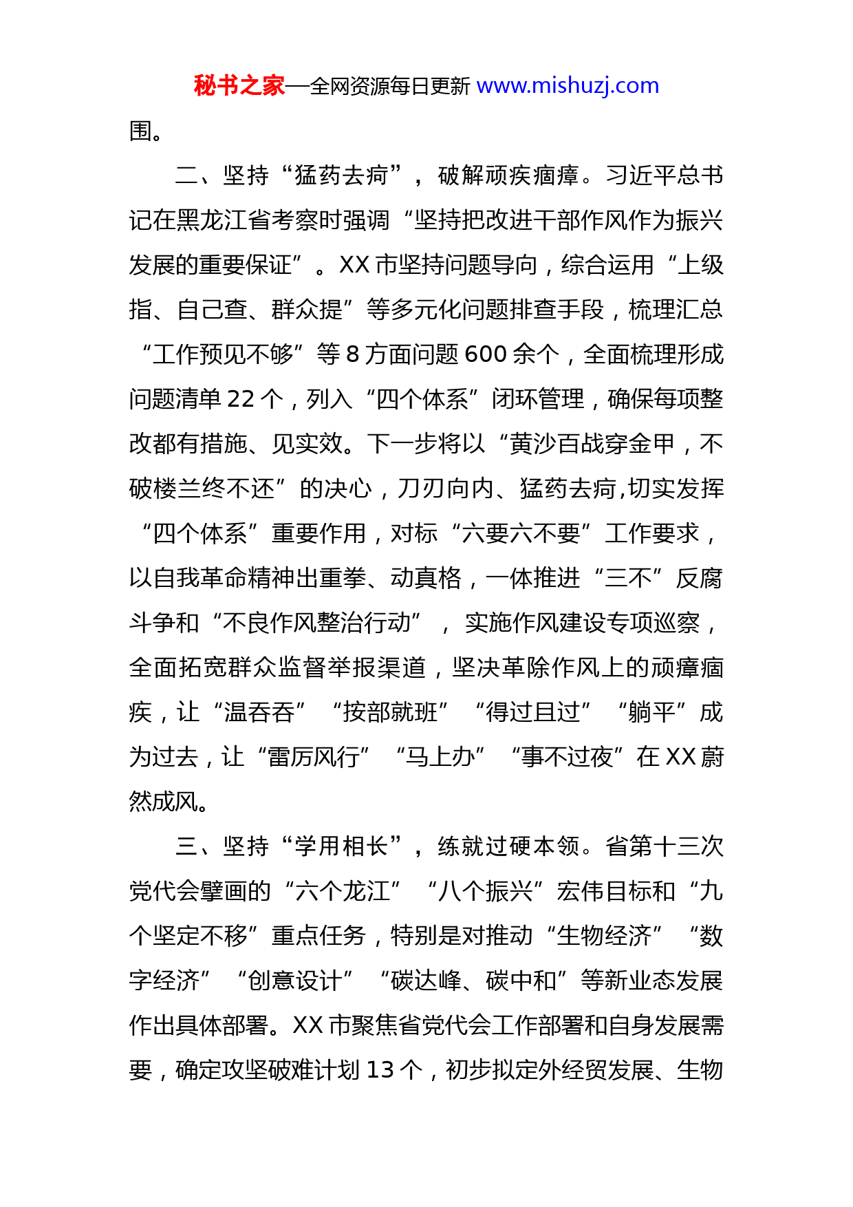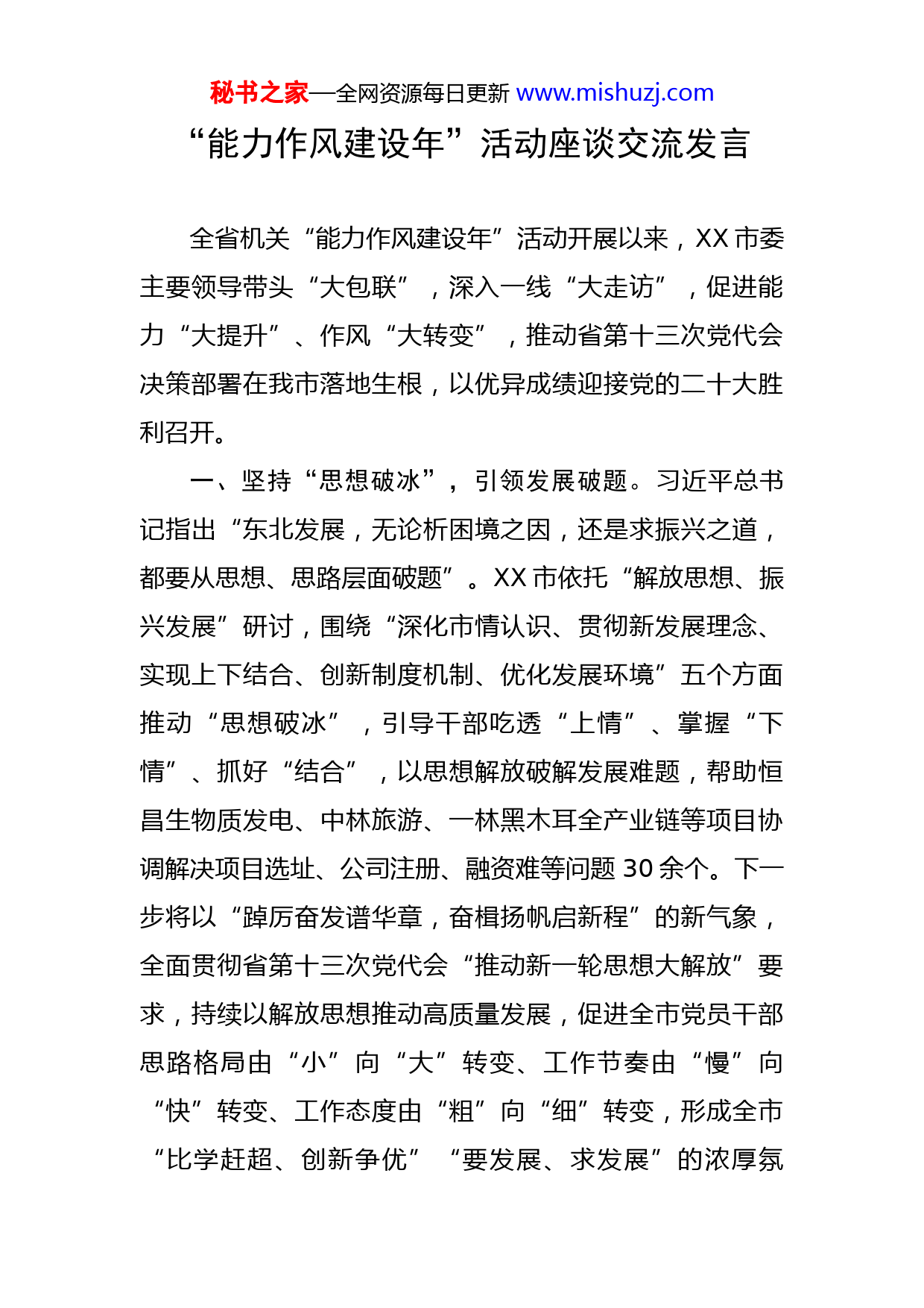 秘书之家—全网资源每日更新www.mishuzj.com“能力作风建设年”活动座谈交流发言全省机关“能力作风建设年”活动开展以来,XX市委主要领导带头“大包联”,深入一线“大走访”,促进能力“大提升”、作风“大转变”,推动省第十三次党代会决策部署在我市落地生根,以优异成绩迎接党的二十大胜利召开。一、坚持“思想破冰”,引领发展破题。习近平总书记指出“东北发展,无论析困境之因,还是求振兴之道,都要从思想、思路层面破题”。XX市依托“解放思想、振兴发展”研讨,围绕“深化市情认识、贯彻新发展理念、实现上下结合、创新制度机制、优化发展环境”五个方面推动“思想破冰”,引导干部吃透“上情”、掌握“下情”、抓好“结合”,以思想解放破解发展难题,帮助恒昌生物质发电、中林旅游、一林黑木耳全产业链等项目协调解决项目选址、公司注册、融资难等问题30余个。下一步将以“踔厉奋发谱华章,奋楫扬帆启新程”的新气象,全面贯彻省第十三次党代会“推动新一轮思想大解放”要求,持续以解放思想推动高质量发展,促进全市党员干部思路格局由“小”向“大”转变、工作节奏由“慢”向“快”转变、工作态度由“粗”向“细”转变,形成全市“比学赶超、创新争优”“要发展、求发展”的浓厚氛秘书之家—全网资源每日更新www.mishuzj.com围。二、坚持“猛药去疴”,破解顽疾痼瘴。习近平总书记在黑龙江省考察时强调“坚持把改进干部作风作为振兴发展的重要保证”。XX市坚持问题导向,综合运用“上级指、自己查、群众提”等多元化问题排查手段,梳理汇总“工作预见不够”等8方面问题600余个,全面梳理形成问题清单22个,列入“四个体系”闭环管理,确保每项整改都有措施、见实效。下一步将以“黄沙百战穿金甲,不破楼兰终不还”的决心,刀刃向内、猛药去疴,切实发挥“四个体系”重要作用,对标“六要六不要”工作要求,以自我革命精神出重拳、动真格,一体推进“三不”反腐斗争和“不良作风整治行动”,实施作风建设专项巡察,全面拓宽群众监督举报渠道,坚决革除作风上的顽瘴痼疾,让“温吞吞”“按部就班”“得过且过”“躺平”成为过去,让“雷厉风行”“马上办”“事不过夜”在XX蔚然成风。三、坚持“学用相长”,练就过硬本领。省第十三次党代会擘画的“六个龙江”“八个振兴”宏伟目标和“九个坚定不移”重点任务,特别是对推动“生物经济”“数字经济”“创意设计”“碳达峰、碳中和”等新业态发展作出具体部署。XX市聚焦省党代会工作部署和自身发展需要,确定攻坚破难计划13个,初步拟定外经贸发展、生物秘书之家—全网资源每日更新www.mishuzj.com经济、黑木耳产业、东北虎豹国家公园等方面学习课程20余节,引领全市上下全面学习对俄经贸、跨境物流、低碳经济等领域新产业新技术新知识。下一步将秉持“以讲促学、以学促知、以知促行、知行合一”理念,在学习上下一番真功夫、实功夫、苦功夫,坚持把跟进学习习近平总书记最新重要讲话重要指示批示精神作为常委会“第一议题”,组织开展学理论、学讲话、学政策、学业务、学科技知识“五学”活动,实施“干部专业化能力提升工程”,每月举办一次“业务大讲堂”。同时,围绕疫情防控、乡村振兴、项目建设、招商引资、基层治理等重点工作,安排干部挂职锻炼,让干部在实践淬炼中经风雨、长才干。四、坚持“正向激励”,鼓励担当作为。习近平总书记强调,“既要把‘严’的主基调长期坚持下去,又要善于做到‘三个区分开来’;既要合乎民心民意,又要激励干部担当作为”。省第十三次党代会提出“进一步激励干部担当作为”“最大限度激发广大干部干事创业积极性主动性”,进一步明确了正向激励的基调。活动开展以来,XX市先后提拔重用10名作风优、能力强、能干事、敢担当的干部,以鲜明的用人导向激励干部队伍勇担当、谋发展。在XX电视台开辟《加强机关能力作风建设、助力XX全面振兴发展》报道专栏,宣传先进典型和经验做法秘书之家—全网资源每日更新www.mishuzj.com18期,以鲜明的舆论导向鼓舞全市上下优作风、争先进。下一步将树立“用一贤人则群贤毕至,见贤思齐就蔚然成风”的鲜明导向,实施“正向引领激励行动”,注重在政治上关心,落实好职务与职级并行制度,强化干事创业用人导向;注重在精神上激励,及时发现和表彰各条战线涌现出来的先进典型,示范带动各界学习;注重在心理上关怀,切实帮助干部疏通情绪、缓解压力,激励领导班子和党员干部一心一意谋发展、心无旁骛抓落实,始终保持昂扬向上的精神状态和干事激情。能力作风建设没有“休止符”、只有“进行曲”。XX市将以责无旁贷的使命担当、抓铁有痕的实劲韧劲,推动全市机关“能力作风建设年”活动走深走实,努力在新的赶考之路上考出优异成绩、交出高分答卷,推动中央决策部署和省委、市委工作要求在XX落地生根、开花结果。