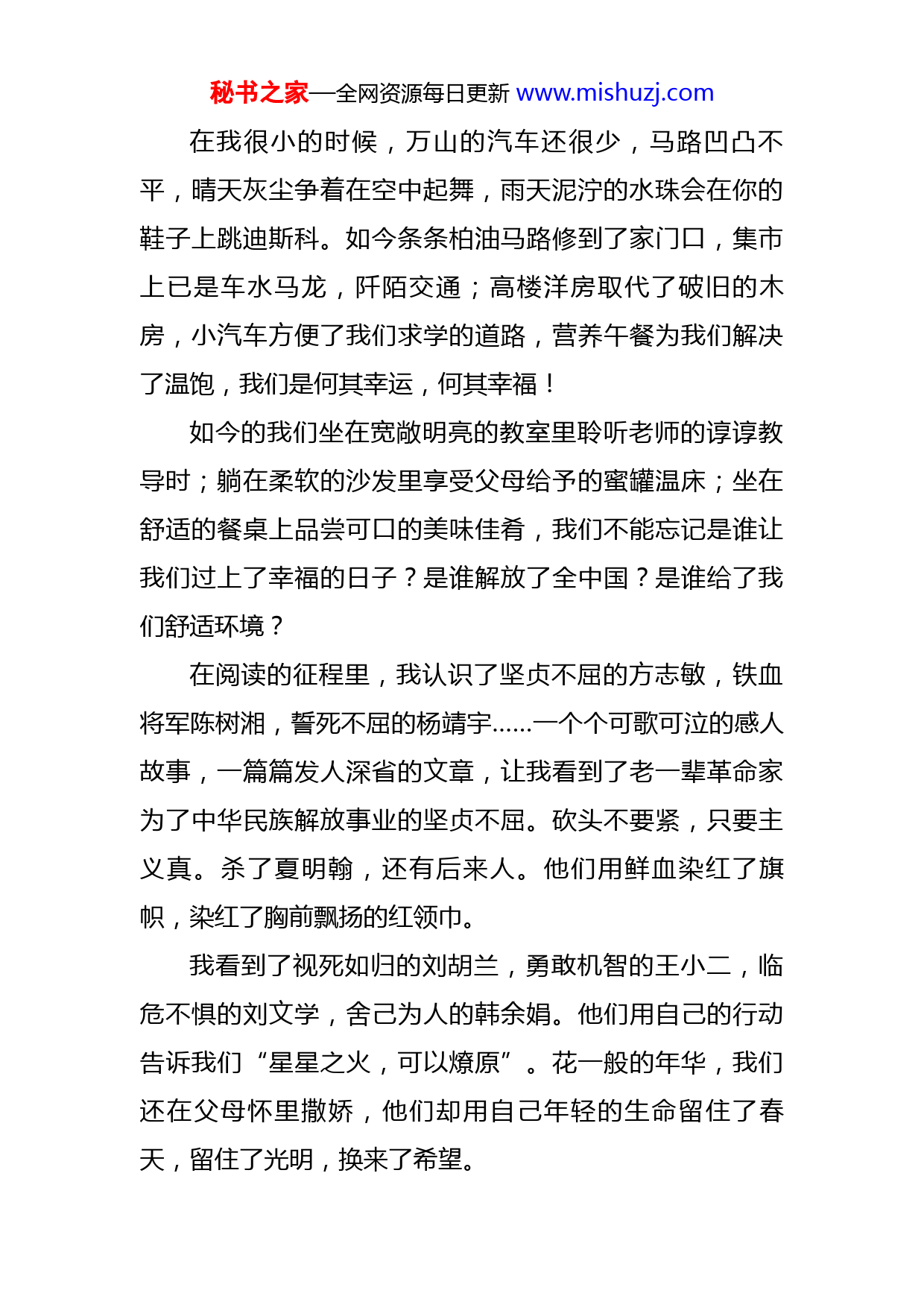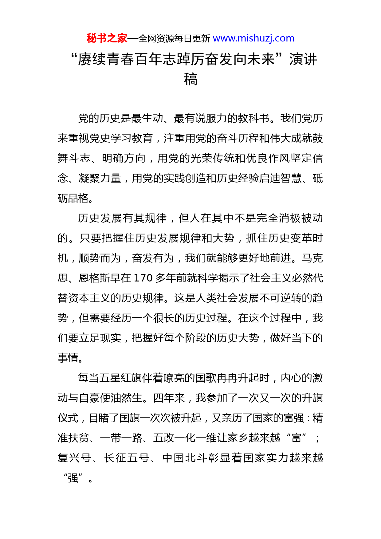 秘书之家—全网资源每日更新www.mishuzj.com“赓续青春百年志踔厉奋发向未来”演讲稿党的历史是最生动、最有说服力的教科书。我们党历来重视党史学习教育,注重用党的奋斗历程和伟大成就鼓舞斗志、明确方向,用党的光荣传统和优良作风坚定信念、凝聚力量,用党的实践创造和历史经验启迪智慧、砥砺品格。历史发展有其规律,但人在其中不是完全消极被动的。只要把握住历史发展规律和大势,抓住历史变革时机,顺势而为,奋发有为,我们就能够更好地前进。马克思、恩格斯早在170多年前就科学揭示了社会主义必然代替资本主义的历史规律。这是人类社会发展不可逆转的趋势,但需要经历一个很长的历史过程。在这个过程中,我们要立足现实,把握好每个阶段的历史大势,做好当下的事情。每当五星红旗伴着嘹亮的国歌冉冉升起时,内心的激动与自豪便油然生。四年来,我参加了一次又一次的升旗仪式,目睹了国旗一次次被升起,又亲历了国家的富强∶精准扶贫、一带一路、五改一化一维让家乡越来越“富”;复兴号、长征五号、中国北斗彰显着国家实力越来越“强”。秘书之家—全网资源每日更新www.mishuzj.com在我很小的时候,万山的汽车还很少,马路凹凸不平,晴天灰尘争着在空中起舞,雨天泥泞的水珠会在你的鞋子上跳迪斯科。如今条条柏油马路修到了家门口,集市上已是车水马龙,阡陌交通;高楼洋房取代了破旧的木房,小汽车方便了我们求学的道路,营养午餐为我们解决了温饱,我们是何其幸运,何其幸福!如今的我们坐在宽敞明亮的教室里聆听老师的谆谆教导时;躺在柔软的沙发里享受父母给予的蜜罐温床;坐在舒适的餐桌上品尝可口的美味佳肴,我们不能忘记是谁让我们过上了幸福的日子?是谁解放了全中国?是谁给了我们舒适环境?在阅读的征程里,我认识了坚贞不屈的方志敏,铁血将军陈树湘,誓死不屈的杨靖宇……一个个可歌可泣的感人故事,一篇篇发人深省的文章,让我看到了老一辈革命家为了中华民族解放事业的坚贞不屈。砍头不要紧,只要主义真。杀了夏明翰,还有后来人。他们用鲜血染红了旗帜,染红了胸前飘扬的红领巾。我看到了视死如归的刘胡兰,勇敢机智的王小二,临危不惧的刘文学,舍己为人的韩余娟。他们用自己的行动告诉我们“星星之火,可以燎原”。花一般的年华,我们还在父母怀里撒娇,他们却用自己年轻的生命留住了春天,留住了光明,换来了希望。秘书之家—全网资源每日更新www.mishuzj.com看到这里我不觉红了眼眶,我们的幸福都是烈士们用鲜血换来的,我们还有什么理由让自己止步不前。想到自己冬天窝在暖暖的被窝里起不来时,会抱怨外面太冷,上学太早;每每回家看见练习卷时,会抱怨作业太多,学习太苦;父母让我搭把手时我会抱怨干活太累……这些苦,这些累跟这些革命先烈比起来,那又算得了什么?如果现在连这么点事也坚持不了,克服不了,那还谈什么建设祖国,报效祖国。如今的我们在党的关怀下成长,有充足的食物、温暖的衣服、先进的科技,苦难的生活已经离我们而去,但我们不能忘记中国曾经历百年屈辱的历史和成千上万中华儿女屈辱的泪水。当看到国之重器上天入海,探索苍穹;当看到超级工程攻坚克难,刷新纪录;当看到中国智慧走出国门,惊叹世界我都为自己是一名中国人感到无比骄傲。我们要铭记习爷爷在十九大说的一句话∶青年兴则国家兴,青年强则国家强,成长路上,总会遭遇困境,但是那些奋斗中的砥砺,会凝聚成我们人生的财富。我们党来自人民,党的根基和血脉在人民。为人民而生,因人民而兴,始终同人民在一起,为人民利益而奋斗,是我们党立党兴党强党的根本出发点和落脚点。我们要尊重社会发展规律和尊重人民历史主体地位的一致性、秘书之家—全网资源每日更新www.mishuzj.com为崇高理想奋斗和为最广大人民谋利益的一致性、完成党的各项工作和实现人民利益的一致性,永不脱离群众,坚持人民至上,为民谋福利。现在的和平年代不需要我们去流血、去牺牲,我们要做的,是在中国共产党的领导下,紧跟时代步伐,努力学习,增长知识,为早日实现中华民族的伟大复兴而奋斗!