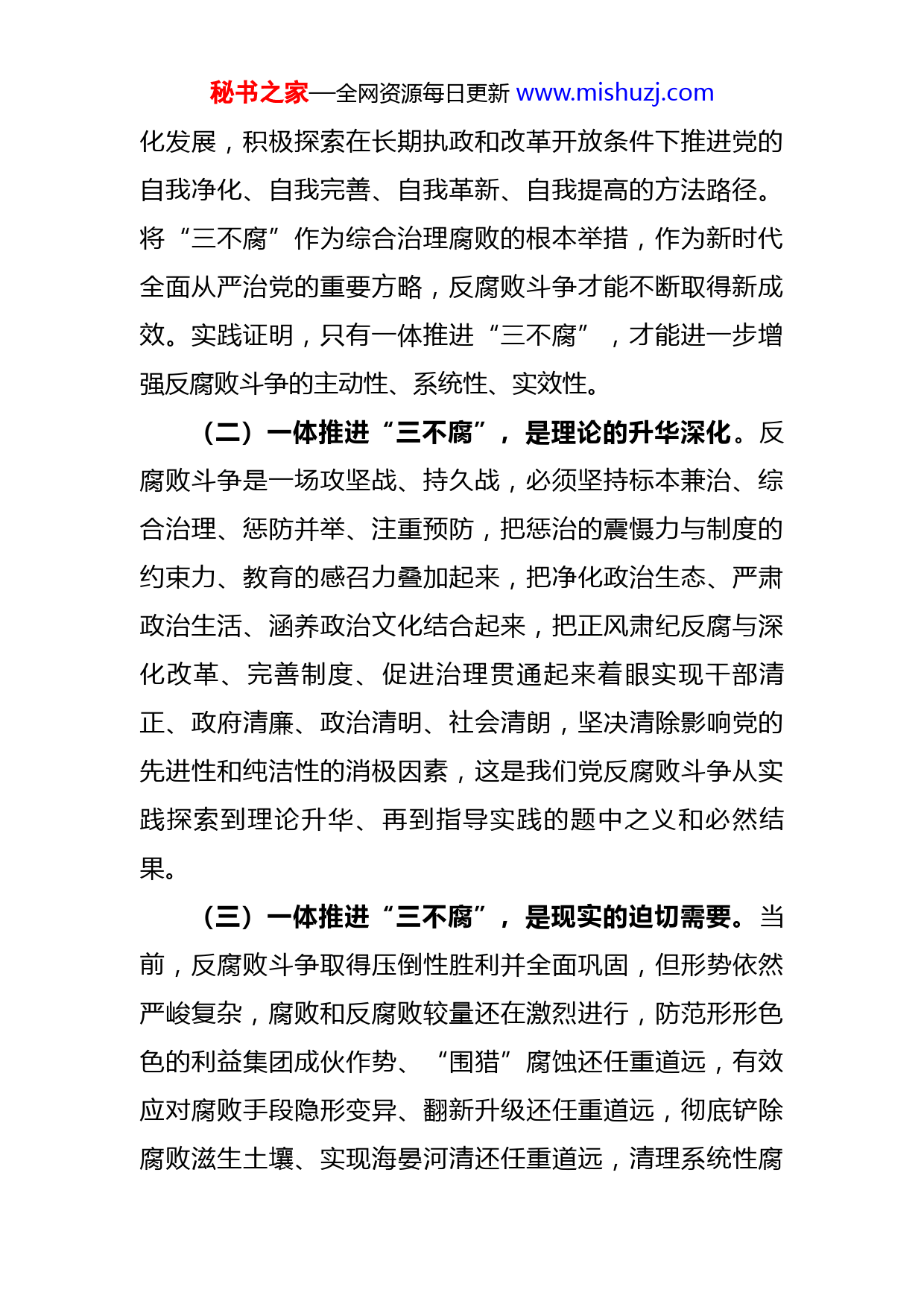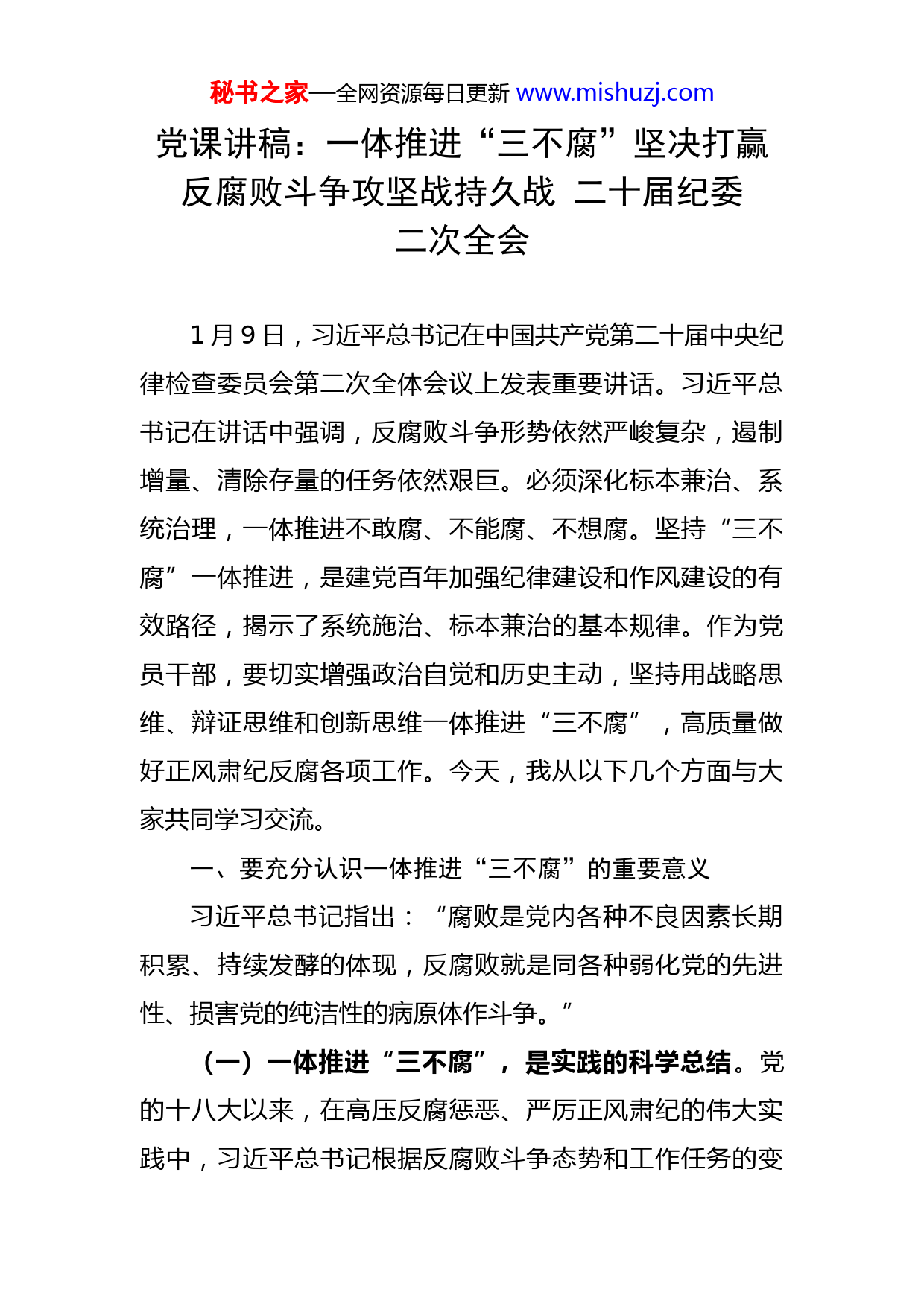 秘书之家—全网资源每日更新www.mishuzj.com党课讲稿:一体推进“三不腐”坚决打赢反腐败斗争攻坚战持久战二十届纪委二次全会1月9日,习近平总书记在中国共产党第二十届中央纪律检查委员会第二次全体会议上发表重要讲话。习近平总书记在讲话中强调,反腐败斗争形势依然严峻复杂,遏制增量、清除存量的任务依然艰巨。必须深化标本兼治、系统治理,一体推进不敢腐、不能腐、不想腐。坚持“三不腐”一体推进,是建党百年加强纪律建设和作风建设的有效路径,揭示了系统施治、标本兼治的基本规律。作为党员干部,要切实增强政治自觉和历史主动,坚持用战略思维、辩证思维和创新思维一体推进“三不腐”,高质量做好正风肃纪反腐各项工作。今天,我从以下几个方面与大家共同学习交流。一、要充分认识一体推进“三不腐”的重要意义习近平总书记指出:“腐败是党内各种不良因素长期积累、持续发酵的体现,反腐败就是同各种弱化党的先进性、损害党的纯洁性的病原体作斗争。”(一)一体推进“三不腐”,是实践的科学总结。党的十八大以来,在高压反腐惩恶、严厉正风肃纪的伟大实践中,习近平总书记根据反腐败斗争态势和工作任务的变秘书之家—全网资源每日更新www.mishuzj.com化发展,积极探索在长期执政和改革开放条件下推进党的自我净化、自我完善、自我革新、自我提高的方法路径。将“三不腐”作为综合治理腐败的根本举措,作为新时代全面从严治党的重要方略,反腐败斗争才能不断取得新成效。实践证明,只有一体推进“三不腐”,才能进一步增强反腐败斗争的主动性、系统性、实效性。(二)一体推进“三不腐”,是理论的升华深化。反腐败斗争是一场攻坚战、持久战,必须坚持标本兼治、综合治理、惩防并举、注重预防,把惩治的震慑力与制度的约束力、教育的感召力叠加起来,把净化政治生态、严肃政治生活、涵养政治文化结合起来,把正风肃纪反腐与深化改革、完善制度、促进治理贯通起来着眼实现干部清正、政府清廉、政治清明、社会清朗,坚决清除影响党的先进性和纯洁性的消极因素,这是我们党反腐败斗争从实践探索到理论升华、再到指导实践的题中之义和必然结果。(三)一体推进“三不腐”,是现实的迫切需要。当前,反腐败斗争取得压倒性胜利并全面巩固,但形势依然严峻复杂,腐败和反腐败较量还在激烈进行,防范形形色色的利益集团成伙作势、“围猎”腐蚀还任重道远,有效应对腐败手段隐形变异、翻新升级还任重道远,彻底铲除腐败滋生土壤、实现海晏河清还任重道远,清理系统性腐秘书之家—全网资源每日更新www.mishuzj.com败、化解风险隐患还任重道远。必须始终保持正视问题的勇气和刀刃向内的坚定,坚决割除毒瘤、清除毒源、肃清流毒,以党永不变质确保红色江山永不变色。二、准确把握一体推进“三不腐”的内在联系一体推进“三不腐”中,“不敢”“不能”“不想”,既各有侧重,又相辅相成,是一个相互融合、交互作用的整体,必须统筹于全面从严治党和反腐败斗争的具体实践之中。(一)“不敢腐”是前提,重在惩治和震慑。只有严厉惩治,一旦腐败就会付出惨重代价,才能让意欲腐败者不敢越雷池半步,为“不能”“不想”创造条件。“不敢腐”的实质就是保持惩治腐败高压态势,提高腐败案件查处概率,降低腐败收益和违法成本之间的比率,倒逼干部正确对待权力、谨慎使用权力、不敢滥用权力。(二)“不能腐”是保障,重在制约和监督。“不能腐”解决的是腐败机会问题,只有强化监督制约、扎紧制度笼子,才能让胆敢腐败者无机可乘,巩固“不敢”“不想”的成果。“不能腐”的实质就是从源头抓起,对党的十八大以来惩治腐败的生动实践进行系统总结和深入剖析,加强反腐败体制机制创新和制度建设,对“不敢腐”划出红线,对“不想腐”提出倡导,为“不敢腐”、“不想腐”提供有力支撑。秘书之家—全网资源每日更新www.mishuzj.com(三)“不想腐”是防线,重在教育和自律。“不想腐”是根本,指的是认知、觉悟、文化。解决腐败问题的根本,就是要把坚定理想信念作为党的思想建设的首要任务,解决好世界观、人生观、价值观这个“总开关”问题。“不想腐”的实质就是要强化对党员干部和公职人员的教育引导,告诫他们:“公款姓公,一分一厘都不能乱花;公权为民,一丝一毫都不能私用”。筑牢“不想腐”的思想基础,建立拒腐防变的精神防线,为“不敢腐”、“不能腐”构筑起坚固思想堤坝。三、要积极推动一体推进“三不腐”同向发力反腐败必须永远吹冲锋号。新征程上,我们必须坚持以党的二十大精神为指引,始终发扬彻底的自我革命精神,一刻不停推进反腐败斗争,坚持不敢腐、不能腐、不想腐一体推进,同时发力、同向发力、综合发力,坚决清除一切侵蚀党的健康肌体的病毒,确保党永远不变质、不变色、不变味。(一)要在提高政治站位上着力。反腐败根本目的在于保持党的性质宗旨不变,提高党的执政能力,为中华民族伟大复兴奠定坚实的政治基础。坚持“三不腐”一体推进,必须胸怀“国之大者”。着眼党和国家工作全局,将一体推进“三不腐”纳入中国特色社会主义制度和国家治理体系,放在党的建设总体布局中去思考谋划。始终以国秘书之家—全网资源每日更新www.mishuzj.com家政治