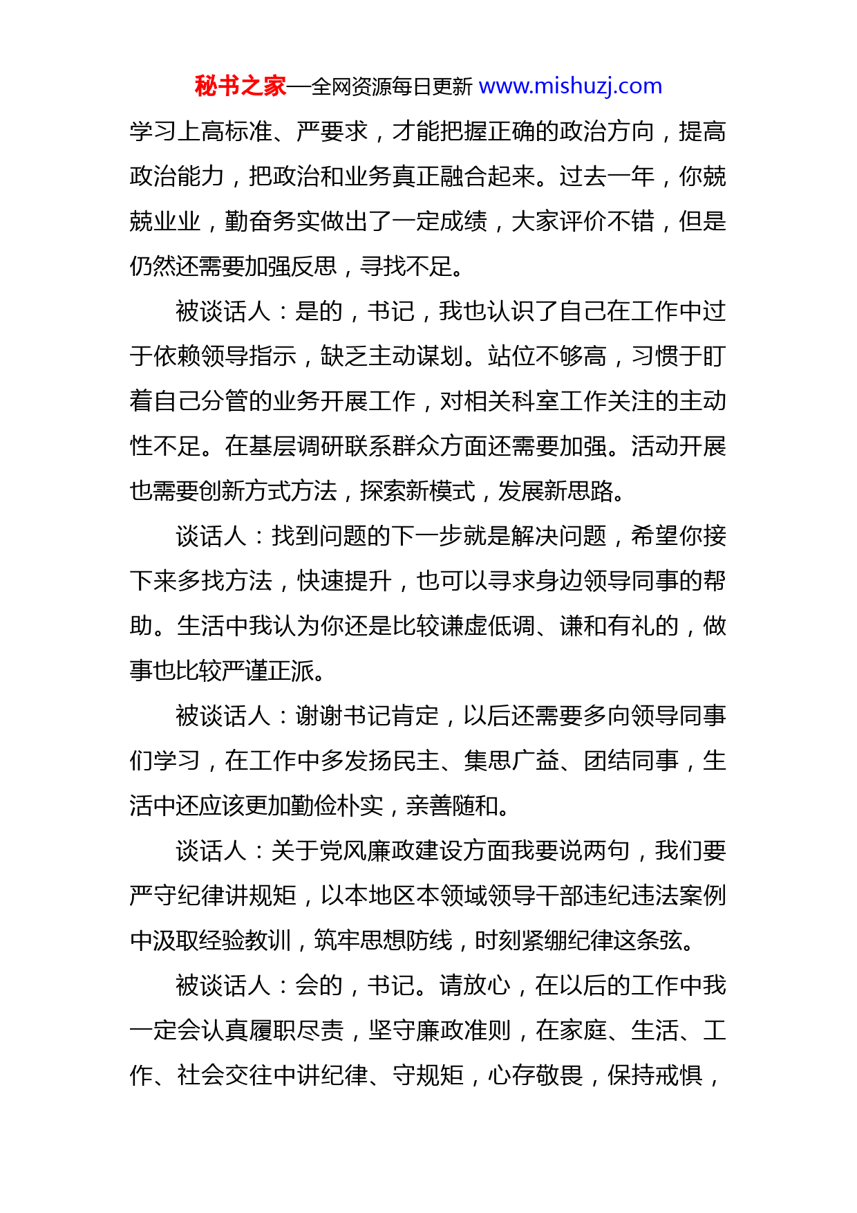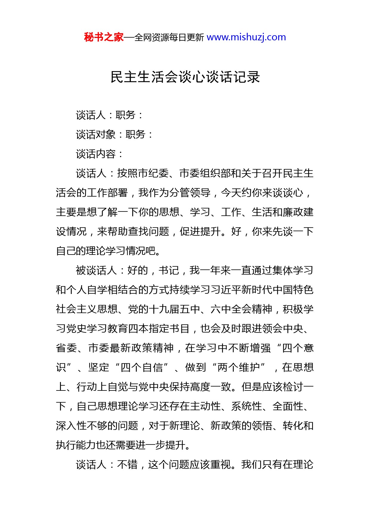 秘书之家—全网资源每日更新www.mishuzj.com民主生活会谈心谈话记录谈话人:职务:谈话对象:职务:谈话内容:谈话人:按照市纪委、市委组织部和关于召开民主生活会的工作部署,我作为分管领导,今天约你来谈谈心,主要是想了解一下你的思想、学习、工作、生活和廉政建设情况,来帮助查找问题,促进提升。好,你来先谈一下自己的理论学习情况吧。被谈话人:好的,书记,我一年来一直通过集体学习和个人自学相结合的方式持续学习习近平新时代中国特色社会主义思想、党的十九届五中、六中全会精神,积极学习党史学习教育四本指定书目,也会及时跟进领会中央、省委、市委最新政策精神,在学习中不断增强“四个意识”、坚定“四个自信”、做到“两个维护”,在思想上、行动上自觉与党中央保持高度一致。但是应该检讨一下,自己思想理论学习还存在主动性、系统性、全面性、深入性不够的问题,对于新理论、新政策的领悟、转化和执行能力也还需要进一步提升。谈话人:不错,这个问题应该重视。我们只有在理论秘书之家—全网资源每日更新www.mishuzj.com学习上高标准、严要求,才能把握正确的政治方向,提高政治能力,把政治和业务真正融合起来。过去一年,你兢兢业业,勤奋务实做出了一定成绩,大家评价不错,但是仍然还需要加强反思,寻找不足。被谈话人:是的,书记,我也认识了自己在工作中过于依赖领导指示,缺乏主动谋划。站位不够高,习惯于盯着自己分管的业务开展工作,对相关科室工作关注的主动性不足。在基层调研联系群众方面还需要加强。活动开展也需要创新方式方法,探索新模式,发展新思路。谈话人:找到问题的下一步就是解决问题,希望你接下来多找方法,快速提升,也可以寻求身边领导同事的帮助。生活中我认为你还是比较谦虚低调、谦和有礼的,做事也比较严谨正派。被谈话人:谢谢书记肯定,以后还需要多向领导同事们学习,在工作中多发扬民主、集思广益、团结同事,生活中还应该更加勤俭朴实,亲善随和。谈话人:关于党风廉政建设方面我要说两句,我们要严守纪律讲规矩,以本地区本领域领导干部违纪违法案例中汲取经验教训,筑牢思想防线,时刻紧绷纪律这条弦。被谈话人:会的,书记。请放心,在以后的工作中我一定会认真履职尽责,坚守廉政准则,在家庭、生活、工作、社会交往中讲纪律、守规矩,心存敬畏,保持戒惧,秘书之家—全网资源每日更新www.mishuzj.com牢记初心使命,坚守清廉底线。谈话人:好,今天咱们的谈话到此结束,希望针对发现的问题抓紧整改,再接再厉,把工作推向新的高度。被谈话人:好的,谢谢书记的悉心指导。秘书之家—全网资源每日更新www.mishuzj.com机关支部书记与新进单位普通党员谈心谈话谈话内容:谈话人:xx同志好,最近工作、学习和生活等各方面都还好吧?被谈话人:书记好,最近工作比较忙,自己也经常加班,总体都还好吧。谈话人:辛苦了!我有几次下班的时候看到你还在加班。最近主要在处理哪些工作,有没有什么困难?被谈话人:刚入司时间不久,业务上还不熟悉。一边在做自己岗位上的工作,一边也在协助同事做一些常规工作。最近总公司上线了一个新系统,我还在学习。主要的问题就是感觉自己要学习的东西有很多,但是时间不够用,上班时间要处理各种紧急的事情,只能下班再静下心来学习总结。有时候感觉自己心态有些着急,遇到麻烦的事情心理非常紧张,怕出错,有时候紧张的晚上都睡不好。谈话人:嗯,理解!你自己有没有考虑过该如何处理这些棘手的问题?有没有总结过啊?被谈话人:我觉得自己心态有点慌,没有制定好完整的适合自己的学习计划,工作上也没有区分轻重缓急,所秘书之家—全网资源每日更新www.mishuzj.com以经常手忙脚乱,犯一些低级错误。另外,希望领导同事能在工作方法和技巧上多给我一些指导帮助,那样我会进步的更快一些。谈话人:你刚才讲的非常好!自己意识到了问题,也分析了原因,既有自身需要改进的地方,也有需要领导和同事需要帮助的地方。刚入司的新员工有许多需要学习的东西,这是正常现象。自己先制定一个学习计划,每天也要有一个工作计划,按照轻重缓急排列好,先做紧急的,再做不紧急的。工作中要忙而不乱,遇到问题需要帮助及时告知同事或领导。虽然刚进入公司,但你刚才讲的一句话非常到位,要想静下心来把事情做好有时候确实要适当牺牲一点业余时间,八小时之外我们可以多去做一些工作上的深度思考,思考和总结是提升工作技能的最好方法。你刚才讲到的关于工作辅导的问题,我会反馈给相关领导,希望进一步完善师徒制,在新员工培养上加强力度。被谈话人:谢谢书记的关心!谈话人:进入公司这段时间以来,对咱们支部党员的总体评价怎么样?被谈话人:坦白说,我觉得咱们支部党员包括我在内,在先锋模范带头作用发挥上表现得不够好,比如公司有活动得时候我们没有积极参加,公司需要安排志愿者落实防疫工作得时候我们没有第一个站出来报名参加。另秘书之家—全网资源每日更新www.mishuzj.com外,我觉得有些同志在服务基层同事的态度上需要进一步改进,要注意沟通交流的方式方法。最后,我觉得机关部门每个岗位都应该整理一些能够帮助基层同事提高工作效率的使用手册或方法,这样更加实用。建议咱们的党员锋领指数指标再完善一些,这样才能充分调动党