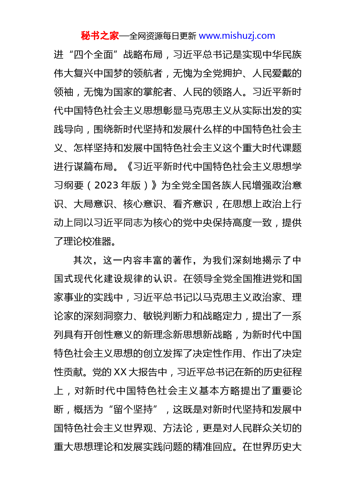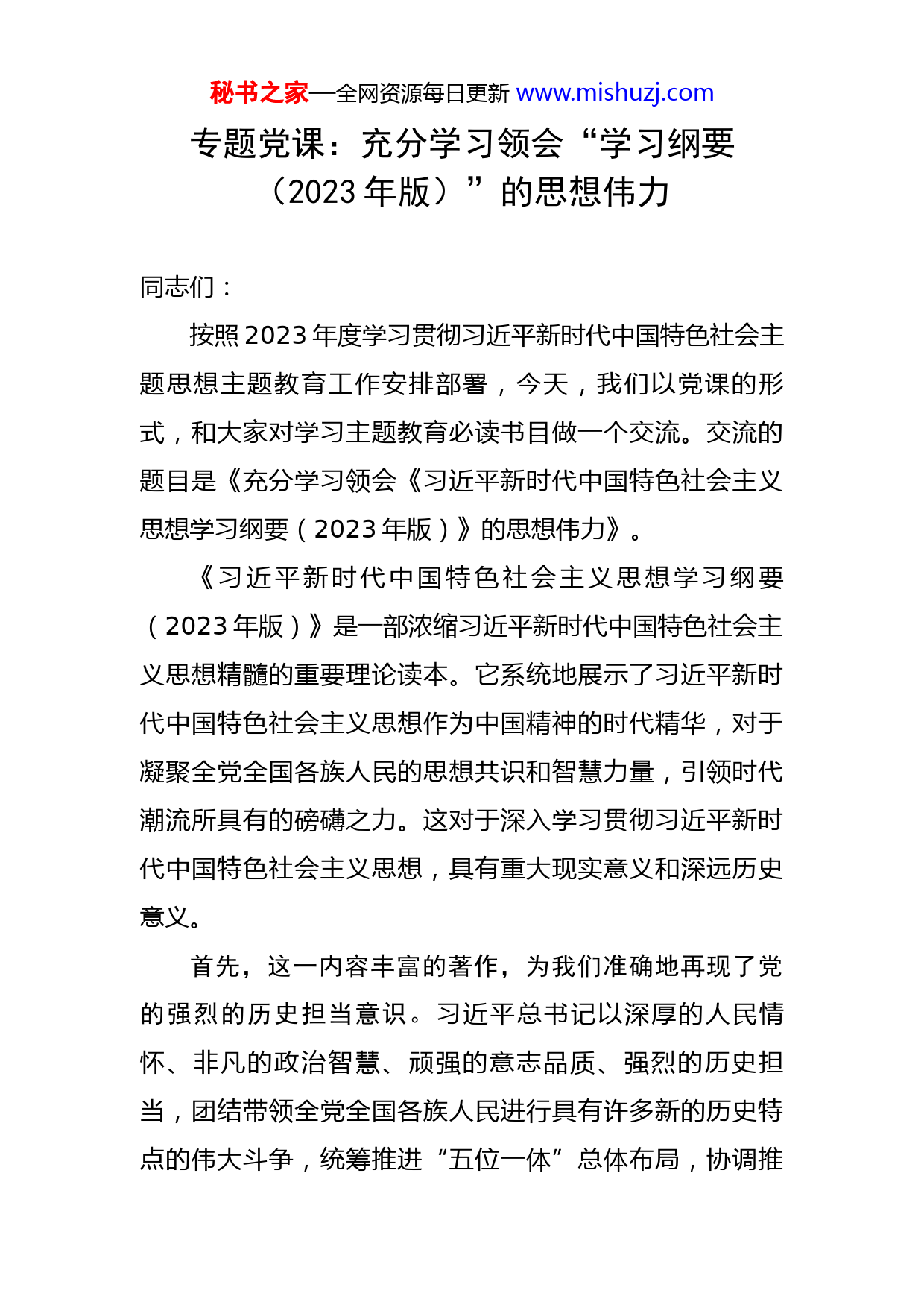 秘书之家—全网资源每日更新www.mishuzj.com专题党课:充分学习领会“学习纲要(2023年版)”的思想伟力同志们:按照2023年度学习贯彻习近平新时代中国特色社会主题思想主题教育工作安排部署,今天,我们以党课的形式,和大家对学习主题教育必读书目做一个交流。交流的题目是《充分学习领会《习近平新时代中国特色社会主义思想学习纲要(2023年版)》的思想伟力》。《习近平新时代中国特色社会主义思想学习纲要(2023年版)》是一部浓缩习近平新时代中国特色社会主义思想精髓的重要理论读本。它系统地展示了习近平新时代中国特色社会主义思想作为中国精神的时代精华,对于凝聚全党全国各族人民的思想共识和智慧力量,引领时代潮流所具有的磅礴之力。这对于深入学习贯彻习近平新时代中国特色社会主义思想,具有重大现实意义和深远历史意义。首先,这一内容丰富的著作,为我们准确地再现了党的强烈的历史担当意识。习近平总书记以深厚的人民情怀、非凡的政治智慧、顽强的意志品质、强烈的历史担当,团结带领全党全国各族人民进行具有许多新的历史特点的伟大斗争,统筹推进“五位一体”总体布局,协调推秘书之家—全网资源每日更新www.mishuzj.com进“四个全面”战略布局,习近平总书记是实现中华民族伟大复兴中国梦的领航者,无愧为全党拥护、人民爱戴的领袖,无愧为国家的掌舵者、人民的领路人。习近平新时代中国特色社会主义思想彰显马克思主义从实际出发的实践导向,围绕新时代坚持和发展什么样的中国特色社会主义、怎样坚持和发展中国特色社会主义这个重大时代课题进行谋篇布局。《习近平新时代中国特色社会主义思想学习纲要(2023年版)》为全党全国各族人民增强政治意识、大局意识、核心意识、看齐意识,在思想上政治上行动上同以习近平同志为核心的党中央保持高度一致,提供了理论校准器。其次,这一内容丰富的著作,为我们深刻地揭示了中国式现代化建设规律的认识。在领导全党全国推进党和国家事业的实践中,习近平总书记以马克思主义政治家、理论家的深刻洞察力、敏锐判断力和战略定力,提出了一系列具有开创性意义的新理念新思想新战略,为新时代中国特色社会主义思想的创立发挥了决定性作用、作出了决定性贡献。党的XX大报告中,习近平总书记在新的历史征程上,对新时代中国特色社会主义基本方略提出了重要论断,概括为“留个坚持”,这既是对新时代坚持和发展中国特色社会主义世界观、方法论,更是对人民群众关切的重大思想理论和发展实践问题的精准回应。在世界历史大秘书之家—全网资源每日更新www.mishuzj.com变革大调整时期,习近平新时代中国特色社会主义思想直面困难矛盾和风险挑战,提出破解难题、推进事业发展的新理念新思想新战略,对社会主义现代化建设规律作出了全新的探索。再次,这一内容丰富的著作,为我们提出了新时期接续奋斗实现伟大复兴中国梦的具体实践要求。中国特色社会主义是改革开放以来党的全部理论和实践的主题,对坚持和发展什么样的中国特色社会主义,习近平总书记强调中国特色社会主义是既坚持科学社会主义基本原则,又具有鲜明实践特色、理论特色、民族特色、时代特色的社会主义,是根植于中国大地、反映中国人民意愿、适应中国和时代发展进步要求的社会主义。这一理论的核心是坚持党的领导、坚持人民立场、坚持问题导向、坚定“四个自信”。习近平新时代中国特色社会主义思想以坚定的理论自觉和丰厚的思想准备,科学地回答了我们这个时代的一系列重大理论和现实问题,是我们必须长期坚持的指导思想。最后,这一内容丰富的著作,为我们极大地丰富了国家治理体系和治理能力现代化的事件路径。习近平新时代中国特色社会主义思想表明,中国特色社会主义最本质的特征是中国共产党领导,中国特色社会主义制度的最大优势是中国共产党领导,党是最高政治领导力量,按照新时秘书之家—全网资源每日更新www.mishuzj.com代党的建设总要求,突出了政治建设在党的建设中的重要地位。同时,习近平新时代中国特色社会主义思想站在人类发展前沿引领时代潮流,积极探索关系人类前途命运的重大问题。这一思想注重从全球视野审视世界和中国,关注世界和平与发展,关注人类前途与未来,建设持久和平、普遍安全、共同繁荣、开放包容、清洁美丽的世界,对人类社会发展规律的认识达到新高度。习近平新时代中国特色社会主义思想所提出的构建人类命运共同体、推进“一带一路”建设等新理念新措施,为解决人类问题贡献的治理方案,巧妙地将中国智慧和人类理想融为一体,为人类文明延续发展、为各国共创美好未来,贡献了中国智慧和中国方案,为审视人类发展道路的多样性、为人类文明进步带来新启示,为应对全球挑战、解决人类问题提供了全新选择。同志们,思想是行动的先导。《习近平新时代中国特色社会主义思想学习纲要(2023年版)》充分彰显了习近平新时代中国特色社会主义思想博大精深的内容,展现了中国精神的时代精华,我们要以高度的政治自觉和历史自觉抓好理论学习,不断开创工作新局面。