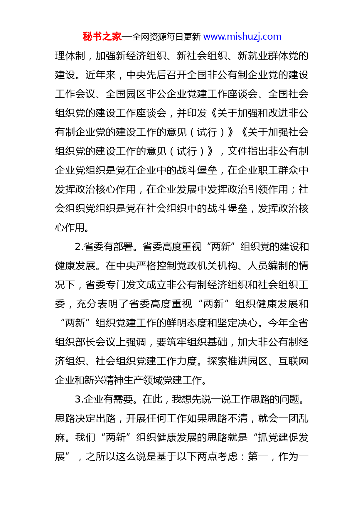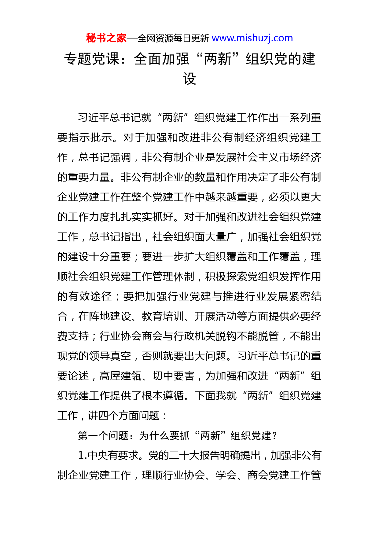 秘书之家—全网资源每日更新www.mishuzj.com专题党课:全面加强“两新”组织党的建设习近平总书记就“两新”组织党建工作作出一系列重要指示批示。对于加强和改进非公有制经济组织党建工作,总书记强调,非公有制企业是发展社会主义市场经济的重要力量。非公有制企业的数量和作用决定了非公有制企业党建工作在整个党建工作中越来越重要,必须以更大的工作力度扎扎实实抓好。对于加强和改进社会组织党建工作,总书记指出,社会组织面大量广,加强社会组织党的建设十分重要;要进一步扩大组织覆盖和工作覆盖,理顺社会组织党建工作管理体制,积极探索党组织发挥作用的有效途径;要把加强行业党建与推进行业发展紧密结合,在阵地建设、教育培训、开展活动等方面提供必要经费支持;行业协会商会与行政机关脱钩不能脱管,不能出现党的领导真空,否则就要出大问题。习近平总书记的重要论述,高屋建瓴、切中要害,为加强和改进“两新”组织党建工作提供了根本遵循。下面我就“两新”组织党建工作,讲四个方面问题:第一个问题:为什么要抓“两新”组织党建?1.中央有要求。党的二十大报告明确提出,加强非公有制企业党建工作,理顺行业协会、学会、商会党建工作管秘书之家—全网资源每日更新www.mishuzj.com理体制,加强新经济组织、新社会组织、新就业群体党的建设。近年来,中央先后召开全国非公有制企业党的建设工作会议、全国园区非公企业党建工作座谈会、全国社会组织党的建设工作座谈会,并印发《关于加强和改进非公有制企业党的建设工作的意见(试行)》《关于加强社会组织党的建设工作的意见(试行)》,文件指出非公有制企业党组织是党在企业中的战斗堡垒,在企业职工群众中发挥政治核心作用,在企业发展中发挥政治引领作用;社会组织党组织是党在社会组织中的战斗堡垒,发挥政治核心作用。2.省委有部署。省委高度重视“两新”组织党的建设和健康发展。在中央严格控制党政机关机构、人员编制的情况下,省委专门发文成立非公有制经济组织和社会组织工委,充分表明了省委高度重视“两新”组织健康发展和“两新”组织党建工作的鲜明态度和坚定决心。今年全省组织部长会议上强调,要筑牢组织基础,加大非公有制经济组织、社会组织党建工作力度。探索推进园区、互联网企业和新兴精神生产领域党建工作。3.企业有需要。在此,我想先说一说工作思路的问题。思路决定出路,开展任何工作如果思路不清,就会一团乱麻。我们“两新”组织健康发展的思路就是“抓党建促发展”,之所以这么说是基于以下两点考虑:第一,作为一秘书之家—全网资源每日更新www.mishuzj.com个企业,不管是国企,还是私企,都是社会主义市场经济的产物,在社会主义市场经济的背景之下,企业发展壮大离不开党的路线方针政策的指导;我们常说党的改革开放政策让企业得道快速的发展,以习近平同志为核心的党中央提出全面深化改革又一次吹来了非公企业发展的春风,所以说党的力量是企业发展的原动力。第二,要把企业做大做强,关键在于调动人积极性,调动积极性就离不开思想政治工作,就离不开宣传发动员工。谈到这里我们首先想到的就是中国共产党,放眼整个世界最善于做思想政治工作、最善于宣传发动群众的就是中国共产党,这是已经被历史所证明的。我们都知道共产党的宗旨是“全心全意为人民服务”,两新组织建立党组织、加强了党的建设,做思想政治工作、宣传发动工作就有了依托,就能够更好的解决员工们关心的难点热点问题,就能够顺理成章的增强员工的向心力和企业的凝聚力。第二个问题:“两新”组织党建工作要抓什么?1.抓巩固提升。前段时间我们集中精力开展了攻坚行动,实现了“两新”组织党的组织和党的工作全覆盖,同时从全县范围内选派了223名“两新”组织党建工作指导员。组织建起来了,人员派下去了,但并不意味我们的工作搞到位了。建党组织、派党建指导员只是我们加强“两新”组织党的领导的基础和第一步。下一步我们的招商护秘书之家—全网资源每日更新www.mishuzj.com商单位、行业主管部门要对两新组织党建工作的指导,防止出现组织边建边散的现象。2.抓队伍建设。目前“两新”组织党建工作的困难之一是党员数量少,甚至有的党员还不愿“亮身份”。针对这一问题可以从以下方面解决:一是举办人才交流会、用工信息发布会、专场招聘会等方式,把党员引进到企业就业;二是开展“党员找组织、组织找党员、党员找党员”的“三找”活动,动员党员主动亮明身份;三是做好发展党员工作。继续抓好“两新”组织入党积极分子培养和发展党员工作,积极稳妥把经营骨干、技术骨干、管理骨干、高知识层次人员、企业业主培养成党员,在这里要做出特别说明的是,功能型的党支部不能发展党员;四是提高企业党员素质。通过广泛开展党章、公司法的学习教育,着力解决部分身份意识不强、“雇佣”思想较重、奉献精神不够等突出问题,引导广大党员自觉发挥先锋模范作用。3.抓活动开展。规范开展党内组织生活,严格落实“支部主题党日”活动,对于功能型党组织,可以在七一、十一、党的重要会议召开等关键时间节点开展活动。为了增强非公企业党建工作活力,要不断创新载体,丰富内涵。比如,可以开展