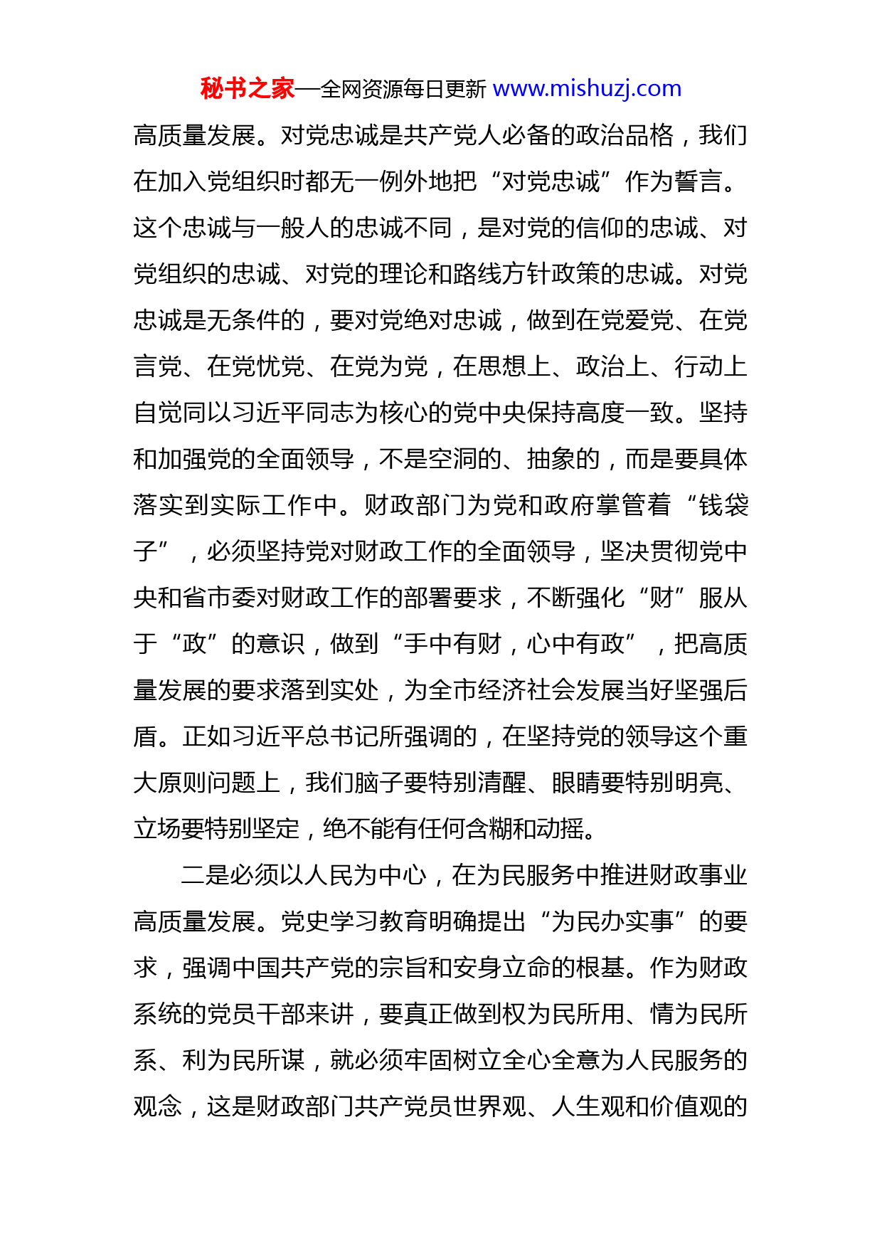 秘书之家—全网资源每日更新www.mishuzj.com专题党课:握紧历史“接力棒”跑出财政“新征程”同志们:今年下半年,中国共产党将召开第二十次全国代表大会,这是我们党进入全面建设社会主义现代化国家、向第二个百年奋斗目标进军新征程的重要时刻召开的一次十分重要的代表大会,是党和国家政治生活中的一件大事。根据市委工作安排,今天,我来向同志们讲一堂题为“握紧历史‘接力棒’跑出财政‘新征程’”的专题党课,和大家一起回顾光辉历史、坚定初心使命、激发干事活力。一、追忆百年党史,深刻感悟共产党人的初心使命从1921年到2022年,中国共产党走过了整整一百多年的历程。这是用鲜血、汗水、泪水、勇气、智慧、力量写就的历程;是苦难中铸就辉煌、挫折后毅然奋起、探索中收获成功、失误后拨乱反正、转折中开创新局、奋斗后赢得未来的历程。争取民族独立、人民解放和实现国家富强、人民幸福,是中国共产党百年历史的主题和主线。百年党史积累的丰富经验,对做好新时期财政部门各项工作具有现实的指导意义和深远影响,我觉得在工作中要坚持以下几点:一是必须坚持党的领导,在对党忠诚中推进财政事业秘书之家—全网资源每日更新www.mishuzj.com高质量发展。对党忠诚是共产党人必备的政治品格,我们在加入党组织时都无一例外地把“对党忠诚”作为誓言。这个忠诚与一般人的忠诚不同,是对党的信仰的忠诚、对党组织的忠诚、对党的理论和路线方针政策的忠诚。对党忠诚是无条件的,要对党绝对忠诚,做到在党爱党、在党言党、在党忧党、在党为党,在思想上、政治上、行动上自觉同以习近平同志为核心的党中央保持高度一致。坚持和加强党的全面领导,不是空洞的、抽象的,而是要具体落实到实际工作中。财政部门为党和政府掌管着“钱袋子”,必须坚持党对财政工作的全面领导,坚决贯彻党中央和省市委对财政工作的部署要求,不断强化“财”服从于“政”的意识,做到“手中有财,心中有政”,把高质量发展的要求落到实处,为全市经济社会发展当好坚强后盾。正如习近平总书记所强调的,在坚持党的领导这个重大原则问题上,我们脑子要特别清醒、眼睛要特别明亮、立场要特别坚定,绝不能有任何含糊和动摇。二是必须以人民为中心,在为民服务中推进财政事业高质量发展。党史学习教育明确提出“为民办实事”的要求,强调中国共产党的宗旨和安身立命的根基。作为财政系统的党员干部来讲,要真正做到权为民所用、情为民所系、利为民所谋,就必须牢固树立全心全意为人民服务的观念,这是财政部门共产党员世界观、人生观和价值观的秘书之家—全网资源每日更新www.mishuzj.com具体体现,是解决为谁掌权、为谁服务问题的基本前提。财政党员干部的基本职责就是要为人民当好家、理好财,满足社会公共需要。我们的一举一动、一言一行、一收一支,人民群众看在眼里,记在心上。我们的每一项具体工作都直接、间接地同人民群众的利益休戚相关。财政工作做得好不好,从大的方面来说,将直接影响社会事业发展甚至社会稳定;从小的方面来说,将影响财政部门在人民群众心目中的形象,因此,财政部门每一位同志无论在制定政策、安排资金,还是在具体业务的办理过程中,都要把维护和实现好人民群众的根本利益放在首位,让财政改革发展成果更多、更公平惠及全市人民,让全市人民有更多的获得感、幸福感。三是必须勇于攻坚克难,在改革创新中推进财政事业高质量发展。习近平总书记指出:“改革开放是决定当代中国命运的关键一招,也是决定实现‘两个一百年’奋斗目标、实现中华民族伟大复兴的关键一招。”改革开放四十多年来,从开启新时期到跨入新世纪,从站上新起点到进入新时代,我们党始终解放思想、实事求是,大胆地试、勇敢地干,极大改变了中国的面貌、中华民族的面貌、中国人民的面貌、中国共产党的面貌。改革开放已成为当代中国最鲜明的特色、当代中国共产党人最鲜明的品格。党的十八届三中全会把财税体制改革提升到了“完善秘书之家—全网资源每日更新www.mishuzj.com和发展中国特色社会主义制度,推进国家治理体系和治理能力现代化”的战略高度,并赋予了“国家治理的基础和重要支柱”的特殊定位,明确提出要深化财税体制改革、建立现代财政制度。党的十九大报告中再次强调:“加快建立现代财政制度,建立全面规范透明、标准科学、约束有力的预算制度,全面实施绩效管理。”新时期,推进财税改革面临的任务依然艰巨而繁重,我们要继续对照全面深化改革的各项要求,知难而进、迎难而上,在预算管理、专项资金管理、政府债务管理、国资国企管理等重点工作上多推出一些更有针对性、实效性的改革举措,及时提炼总结好经验、好做法,不断把财政管理改革推向深入。二、追忆百年党史,躬身践行共产党人的职责担当一代人有一代人的长征路,一代人有一代人的使命担当。百年党史镌刻着奋斗的辉煌,也指示着未来的方向。历史的接力棒已经交到了我们手中,作为财政系统党员干部,必须从党史中汲取前行的智慧和营养,攻坚克难、砥砺奋进,为开创更加美好的明天贡献更大的财政力量。一是从百年党史中感悟思想伟力,当好践行初心使命的表率。习近平总书记指出,我们党之所以能够经