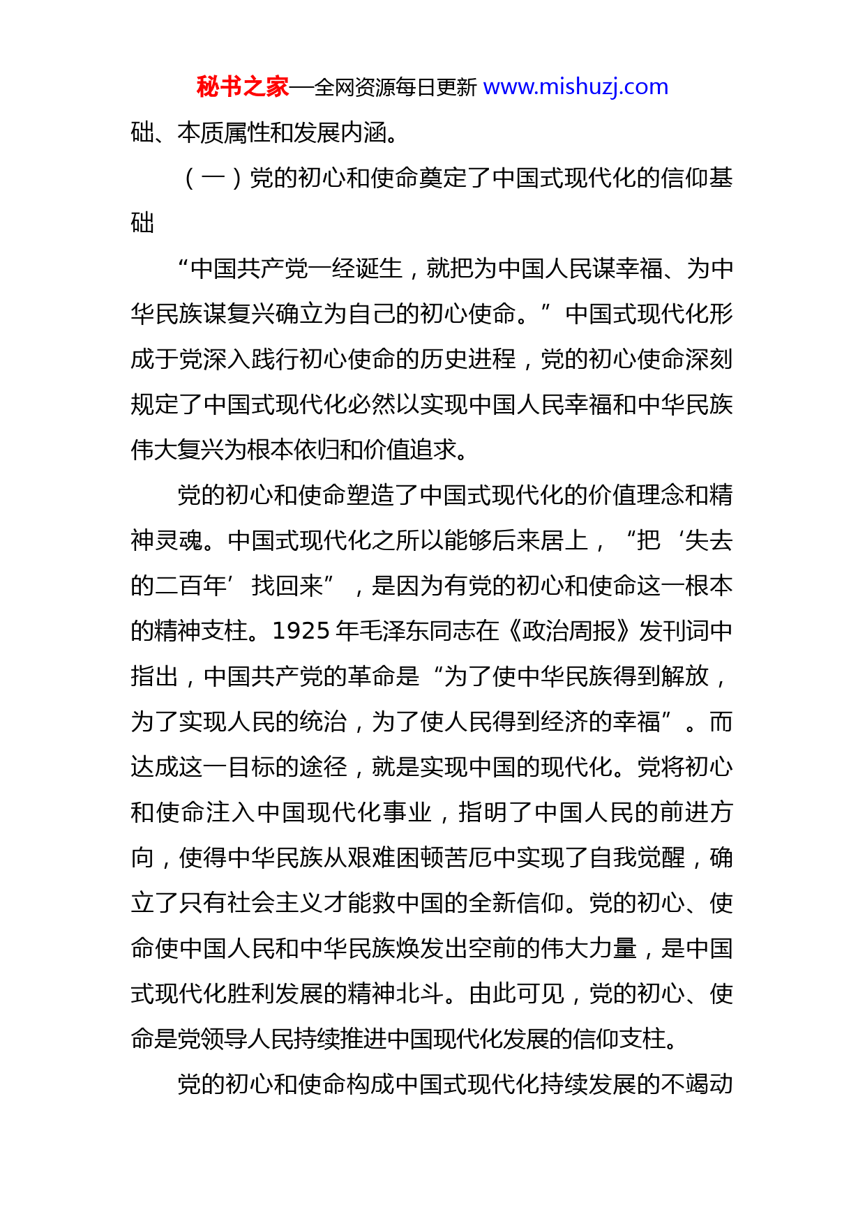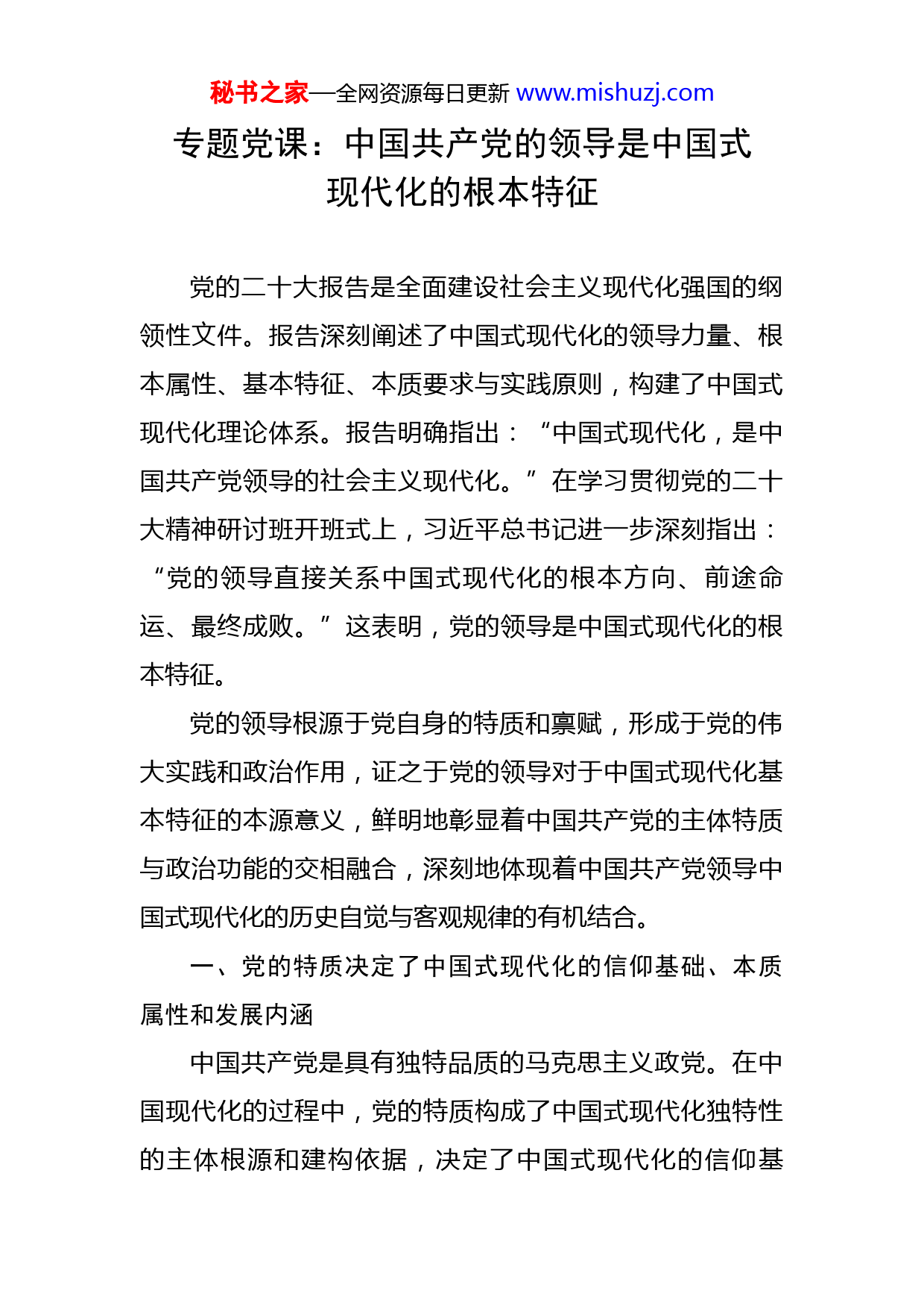 秘书之家—全网资源每日更新www.mishuzj.com专题党课:中国共产党的领导是中国式现代化的根本特征党的二十大报告是全面建设社会主义现代化强国的纲领性文件。报告深刻阐述了中国式现代化的领导力量、根本属性、基本特征、本质要求与实践原则,构建了中国式现代化理论体系。报告明确指出:“中国式现代化,是中国共产党领导的社会主义现代化。”在学习贯彻党的二十大精神研讨班开班式上,习近平总书记进一步深刻指出:“党的领导直接关系中国式现代化的根本方向、前途命运、最终成败。”这表明,党的领导是中国式现代化的根本特征。党的领导根源于党自身的特质和禀赋,形成于党的伟大实践和政治作用,证之于党的领导对于中国式现代化基本特征的本源意义,鲜明地彰显着中国共产党的主体特质与政治功能的交相融合,深刻地体现着中国共产党领导中国式现代化的历史自觉与客观规律的有机结合。一、党的特质决定了中国式现代化的信仰基础、本质属性和发展内涵中国共产党是具有独特品质的马克思主义政党。在中国现代化的过程中,党的特质构成了中国式现代化独特性的主体根源和建构依据,决定了中国式现代化的信仰基秘书之家—全网资源每日更新www.mishuzj.com础、本质属性和发展内涵。(一)党的初心和使命奠定了中国式现代化的信仰基础“中国共产党一经诞生,就把为中国人民谋幸福、为中华民族谋复兴确立为自己的初心使命。”中国式现代化形成于党深入践行初心使命的历史进程,党的初心使命深刻规定了中国式现代化必然以实现中国人民幸福和中华民族伟大复兴为根本依归和价值追求。党的初心和使命塑造了中国式现代化的价值理念和精神灵魂。中国式现代化之所以能够后来居上,“把‘失去的二百年’找回来”,是因为有党的初心和使命这一根本的精神支柱。1925年毛泽东同志在《政治周报》发刊词中指出,中国共产党的革命是“为了使中华民族得到解放,为了实现人民的统治,为了使人民得到经济的幸福”。而达成这一目标的途径,就是实现中国的现代化。党将初心和使命注入中国现代化事业,指明了中国人民的前进方向,使得中华民族从艰难困顿苦厄中实现了自我觉醒,确立了只有社会主义才能救中国的全新信仰。党的初心、使命使中国人民和中华民族焕发出空前的伟大力量,是中国式现代化胜利发展的精神北斗。由此可见,党的初心、使命是党领导人民持续推进中国现代化发展的信仰支柱。党的初心和使命构成中国式现代化持续发展的不竭动秘书之家—全网资源每日更新www.mishuzj.com力和导航灯塔。中国共产党是马克思主义使命型政党,党的初心、使命造就了党强烈的主体意识和舍我其谁的责任担当,激发起中国人民的历史主动精神,驱动着现代化发展。百余年来,中国共产党团结带领人民进行了艰苦卓绝、百折不挠的浴血奋斗,战胜了无数艰难险阻,取得现代化的重大进展。在新时代,面对百年未有之大变局,党团结带领人民有效应对严峻复杂的国际形势和接踵而至的巨大风险挑战,使中国式现代化取得历史性成就。历史和实践表明,正是党的初心、使命照亮了中国式现代化的发展前景,淬炼了中国人民自强自立的品格意志,凝聚起中国式现代化发展的磅礴力量。(二)党的性质和宗旨规定了中国式现代化的本质属性中国共产党是中国工人阶级、中国人民和中华民族的先锋队,全心全意为人民服务是党的宀匕宗旨。中国共产党的性质和宗旨,决定了中国式现代化的根本任务是解放和发展社会生产力。党的性质和宗旨要求深刻把握中国社会基本矛盾,准确把握社会主要矛盾,始终以解放和发展社会生产力为根本出发点,自觉调整生产关系,促进现代化发展。中国式现代化的发展动能和逻辑线路,本质上是党的性质和宗旨在现代化建设中的实际体现。进入新时代,随着中国社会主要矛盾的变化,解决发秘书之家—全网资源每日更新www.mishuzj.com展不平衡不充分的问题,成为进一步解放和发展社会生产力的中心课题。以高质量发展促进共同富裕,促进效率与公平的均衡实现,成为新时期中国式现代化发展的新要求。因此,党的性质与宗旨,要求中国式现代化坚持以解放和发展生产力为目标取向,通过完善社会主义基本经济制度,不断化解经济社会发展中的结构性矛盾,释放和激活经济社会的发展潜力和创造潜能,持续促进社会生产力的发展。中国共产党的性质和宗旨,决定了中国式现代化是社会主义的现代化。中国式现代化的实践经验表明,“只有社会主义才能救中国,只有中国特色社会主义才能发展中国”⑴,只有新时代中国特色社会主义才能强盛中国。中国式现代化本质上是中国特色社会主义现代化的实践体现。中国特色社会主义规定了中国式现代化的根本方向和本质属性,是中国式现代化区别于其他现代化的鲜明标识。中国共产党的性质和宗旨,决定了中国式现代化是全体人民的现代化。党“始终代表最广大人民根本利益,与人民休戚与共、生死相依,没有任何自己特殊的利益,从来不代表任何利益集团、任何权势团体、任何特权阶层的利益”。中国共产党的人民利益代表属性,决定了中国式现代化始终坚持以人民为中心,坚持“发展为了人民,发秘书之家—全网资源每日更新www.mishuzj.com展依靠人民,发展成果由人民共享”冈