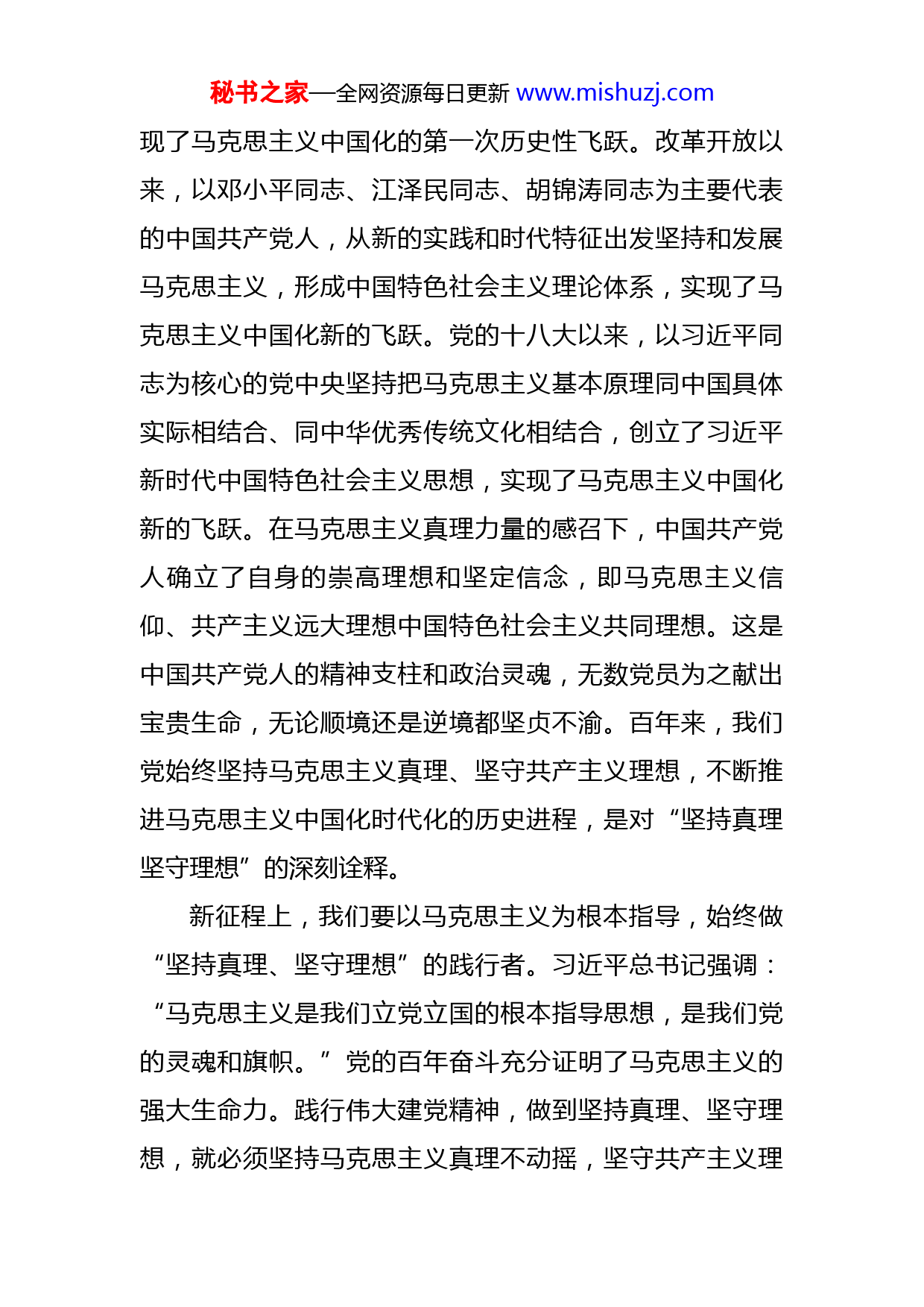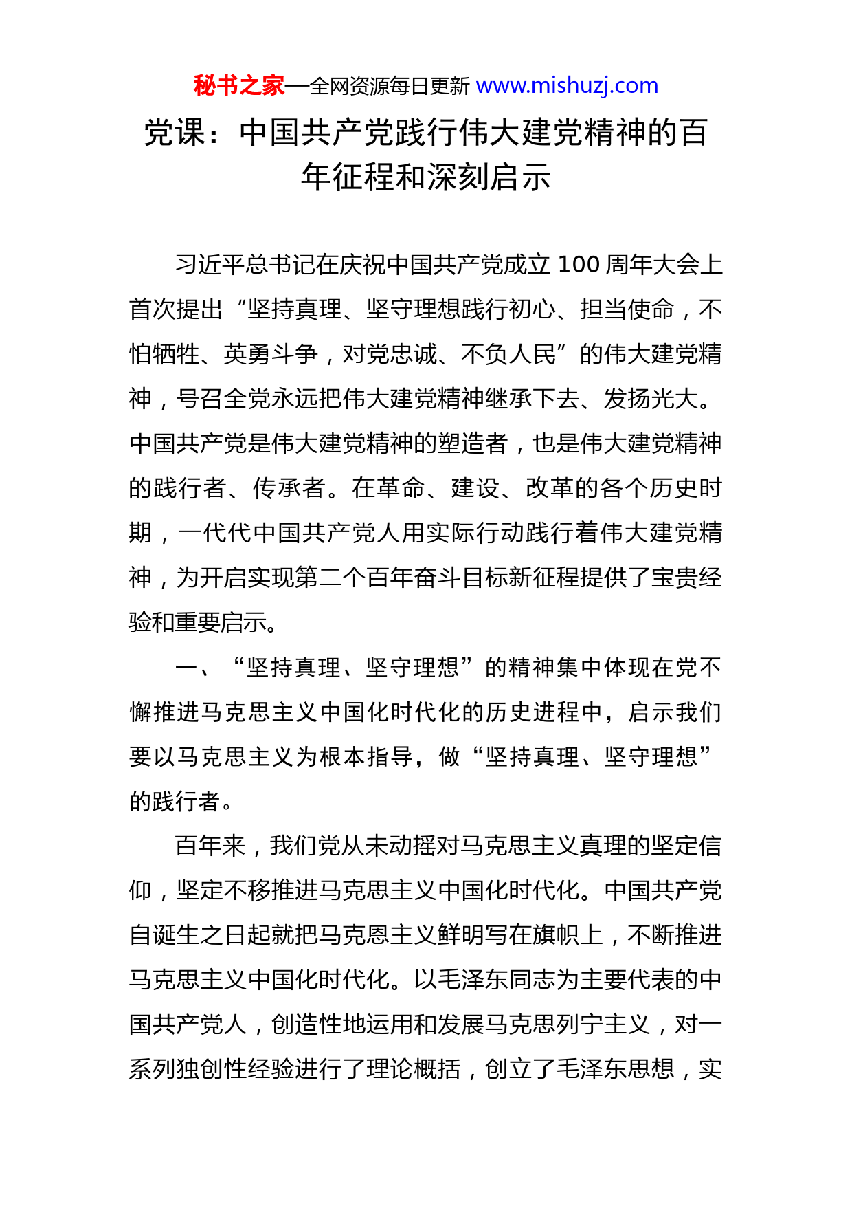 秘书之家—全网资源每日更新www.mishuzj.com党课:中国共产党践行伟大建党精神的百年征程和深刻启示习近平总书记在庆祝中国共产党成立100周年大会上首次提出“坚持真理、坚守理想践行初心、担当使命,不怕牺牲、英勇斗争,对党忠诚、不负人民”的伟大建党精神,号召全党永远把伟大建党精神继承下去、发扬光大。中国共产党是伟大建党精神的塑造者,也是伟大建党精神的践行者、传承者。在革命、建设、改革的各个历史时期,一代代中国共产党人用实际行动践行着伟大建党精神,为开启实现第二个百年奋斗目标新征程提供了宝贵经验和重要启示。一、“坚持真理、坚守理想”的精神集中体现在党不懈推进马克思主义中国化时代化的历史进程中,启示我们要以马克思主义为根本指导,做“坚持真理、坚守理想”的践行者。百年来,我们党从未动摇对马克思主义真理的坚定信仰,坚定不移推进马克思主义中国化时代化。中国共产党自诞生之日起就把马克恩主义鲜明写在旗帜上,不断推进马克思主义中国化时代化。以毛泽东同志为主要代表的中国共产党人,创造性地运用和发展马克思列宁主义,对一系列独创性经验进行了理论概括,创立了毛泽东思想,实秘书之家—全网资源每日更新www.mishuzj.com现了马克思主义中国化的第一次历史性飞跃。改革开放以来,以邓小平同志、江泽民同志、胡锦涛同志为主要代表的中国共产党人,从新的实践和时代特征出发坚持和发展马克思主义,形成中国特色社会主义理论体系,实现了马克思主义中国化新的飞跃。党的十八大以来,以习近平同志为核心的党中央坚持把马克思主义基本原理同中国具体实际相结合、同中华优秀传统文化相结合,创立了习近平新时代中国特色社会主义思想,实现了马克思主义中国化新的飞跃。在马克思主义真理力量的感召下,中国共产党人确立了自身的崇高理想和坚定信念,即马克思主义信仰、共产主义远大理想中国特色社会主义共同理想。这是中国共产党人的精神支柱和政治灵魂,无数党员为之献出宝贵生命,无论顺境还是逆境都坚贞不渝。百年来,我们党始终坚持马克思主义真理、坚守共产主义理想,不断推进马克思主义中国化时代化的历史进程,是对“坚持真理坚守理想”的深刻诠释。新征程上,我们要以马克思主义为根本指导,始终做“坚持真理、坚守理想”的践行者。习近平总书记强调:“马克思主义是我们立党立国的根本指导思想,是我们党的灵魂和旗帜。”党的百年奋斗充分证明了马克思主义的强大生命力。践行伟大建党精神,做到坚持真理、坚守理想,就必须坚持马克思主义真理不动摇,坚守共产主义理秘书之家—全网资源每日更新www.mishuzj.com想不动摇。理论上清醒,理想信念才能坚定。只有深刻掌握了马克思主义立场、观点、方法,才能扎牢坚守理想信念的根基,才能使全党始终保持思想统一、意志坚定,形成强大战斗力。新征程上,我们要坚持学深悟透习近平新时代中国特色社会主义思想,把坚定理想信念作为终身课题,常修常炼、常悟常新,让马克思主义真理力量不断激而新时代中国共产党人攻坚克难。二、“践行初心、担当使命”的精神集中体现在党领导人民实现中华民族伟大复兴的不懈奋斗中,启示我们要为实现中华民族伟大复兴砥砺奋进,做“践行初心、担当使命”的奋斗者。习近平总书记指出:“一百年来,中国共产党团结带领中国人民进行的一切奋斗、一切牺牲、一切创造,归结起来就是一个主题:实现中华民族伟大复兴。一百年前,中国共产党人开启了为民族复兴而奋斗的历史进程。新民主主义革命时期,党带领人民反对帝国主义、封建主义、官僚资本主义,从大革命、土地革命战争到抗日战争解放战争,经过二十八年浴血奋斗,党领导人民实现民族独立、人民解放。社会主义革命和建设时期,党带领人民进行社会主义革命,推进社会主义建设,实现了中华民族有史以来最为广泛而深刻的社会变革。改革开放和社会主义现代化建设新时期,党带领人民探索建设社会主义的正确秘书之家—全网资源每日更新www.mishuzj.com道路,不断解放和发展社会生产力,中国大踏步赶上了时代。新时代,党带领人民实现第一个百年奋斗目标,中华民族迎来了从站起来、富起来到强起来的伟大飞跃。百年来,党领导人民为实现中华民族伟大复兴而进行的一切奋斗与牺牲、取得的一切成就与变革,是对“践行初心、担当使命”的生动诠释。新征程上,我们要为实现中华民族伟大复兴砥砺奋进,始终做“践行初心、担当使命”的奋斗者。实现中华民族伟大复兴是中国共产党百年奋斗的历史主题,也是激励中国共产党人践行伟大建党精神的动力之源。今天,中华民族伟大复义进人了不可逆转的历史进程,但我们仍需要进行具有许多新的历史特点的伟大斗争。践行伟大建党精神,做到“践行初心、担当使命”,就是要以前所未有的历史主动精神接续奋斗,信心百倍地书写新时代中国发展的伟大历史,不断把民族复兴伟业推向前进。习近平总书记指出:“奋斗不只是响亮的口号,而是要在做好每一件小事、完成每一项任务、履行每一项职责中见精神。”新征程上,我们要用真抓实干、担当作为回答好“中国共产党是什么、要干什么”这一根本问题,用筆路蓝缕、手胼足胝的艰苦奋斗践行好初心担当好使命