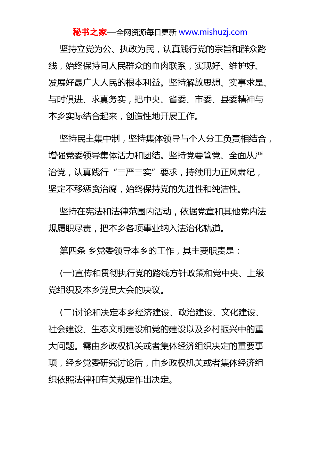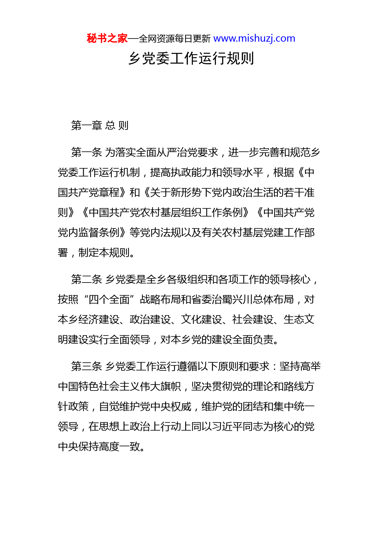秘书之家—全网资源每日更新www.mishuzj.com乡党委工作运行规则第一章总则第一条为落实全面从严治党要求,进一步完善和规范乡党委工作运行机制,提高执政能力和领导水平,根据《中国共产党章程》和《关于新形势下党内政治生活的若干准则》《中国共产党农村基层组织工作条例》《中国共产党党内监督条例》等党内法规以及有关农村基层党建工作部署,制定本规则。第二条乡党委是全乡各级组织和各项工作的领导核心,按照“四个全面”战略布局和省委治蜀兴川总体布局,对本乡经济建设、政治建设、文化建设、社会建设、生态文明建设实行全面领导,对本乡党的建设全面负责。第三条乡党委工作运行遵循以下原则和要求:坚持高举中国特色社会主义伟大旗帜,坚决贯彻党的理论和路线方针政策,自觉维护党中央权威,维护党的团结和集中统一领导,在思想上政治上行动上同以习近平同志为核心的党中央保持高度一致。秘书之家—全网资源每日更新www.mishuzj.com坚持立党为公、执政为民,认真践行党的宗旨和群众路线,始终保持同人民群众的血肉联系,实现好、维护好、发展好最广大人民的根本利益。坚持解放思想、实事求是、与时俱进、求真务实,把中央、省委、市委、县委精神与本乡实际结合起来,创造性地开展工作。坚持民主集中制,坚持集体领导与个人分工负责相结合,增强党委领导集体活力和团结。坚持党要管党、全面从严治党,认真践行“三严三实”要求,持续用力正风肃纪,坚定不移惩贪治腐,始终保持党的先进性和纯洁性。坚持在宪法和法律范围内活动,依据党章和其他党内法规履职尽责,把本乡各项事业纳入法治化轨道。第四条乡党委领导本乡的工作,其主要职责是:(一)宣传和贯彻执行党的路线方针政策和党中央、上级党组织及本乡党员大会的决议。(二)讨论和决定本乡经济建设、政治建设、文化建设、社会建设、生态文明建设和党的建设以及乡村振兴中的重大问题。需由乡政权机关或者集体经济组织决定的重要事项,经乡党委研究讨论后,由乡政权机关或者集体经济组织依照法律和有关规定作出决定。秘书之家—全网资源每日更新www.mishuzj.com(三)领导乡政权机关、群团组织和其他各类组织,加强指导和规范,支持和保证这些机关和组织依照国家法律法规以及各自章程履行职责。(四)加强乡党委自身建设和村党组织建设,以及其他隶属乡党委的党组织建设,抓好发展党员工作,加强党员队伍建设。维护和执行党的纪律,监督党员干部和其他任何工作人员严格遵守国家法律法规。(五)按照干部管理权限,负责对干部的教育、培训、选拔、考核和监督工作。做好人才服务和引进工作。(六)领导本乡的基层治理,加强社会主义民主法治建设和精神文明建设,加强社会治安综合治理,做好生态环保、美丽乡村建设、民生保障、乡村振兴、安全生产等工作。第二章组织和成员第五条乡党委由党员大会选举产生,每届任期五年。由书记、副书记、纪委书记、组织委员、武装部部长以及承担中心工作、担负重要职能的人大主席组成。第六条乡党委委员职数为7人,其中设书记1名、副书记2名。乡党委换届时,书记、副书记由新一届乡党委第秘书之家—全网资源每日更新www.mishuzj.com一次全体会议选举产生,并报县委审批。新当选的乡党委书记、副书记和委员一般应当任满一届。第七条马烈乡党委下设2个基层党总支。为促进经济社会协调发展,加强基层组织建设,经乡党委批准,每个村设2个党支部,建立横向到边、纵向到底的网格化管理体系。第三章职责第八条按照责权利相统一、人财事相配套要求,理顺与上级部门工作关系,做到权责相宜;做好驻乡单位的管理和工作调度,做到守土有责,守土尽责。第九条按照精简、统一、效能原则,调整优化内设机构设置,明确职责分工。建立党政办事机构。健全落实首问负责制、干部职工工作承诺、述职及业绩公示制度、AB岗补位制、干部请销假制度、同类错误反思制度等。推行为民服务一个窗口受理、一条龙服务、一站式办结,提高办事效率。第十条乡党员大会原则上每五年召开一次,主要任务是完成新一届党委、纪委领导班子的换届选举,讨论本乡党委职权范围的重大问题并形成决议。党员大会闭会后,每年可召开一次党员大会,由乡党委召集并主持,须有三分秘书之家—全网资源每日更新www.mishuzj.com之二以上代表参加,主要内容是听取党委、纪委工作报告,开展述职述廉及需在党员大会上完成的相关事项。第十一条乡党委书记主持党委全面工作,对党委工作负主要责任。党委副书记、乡长主持政府全面工作,在书记外出时,受书记委托主持全面工作。党委书记和乡长,不直接分管财务、工程项目、物资采购等工作,但要担负起监督管理的领导责任。党委副书记、宣传委员、统战委员负责党委日常工作,组织党委活动,协调其他党委委员的工作,协助书记抓基层党建工作,牵头协调处理突发应急事件。组织委员主要协助党委副书记,抓基层党建工作。乡党委其他委员根据分工负责有关工作,履行分管领域全面从严治党主体责任。第十二条乡党委建立职责清单制度,明确党委委员职责,并在一定范围内公开。第十三条健全落实党员及人大代表旁听乡党委会议制度,乡党委要及时向党员及人大代表通报有关情况,邀请列席有