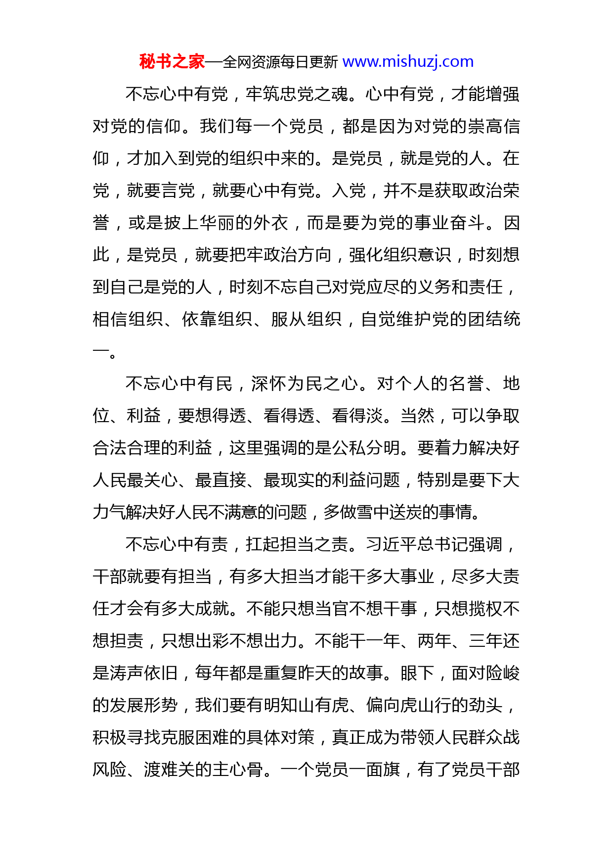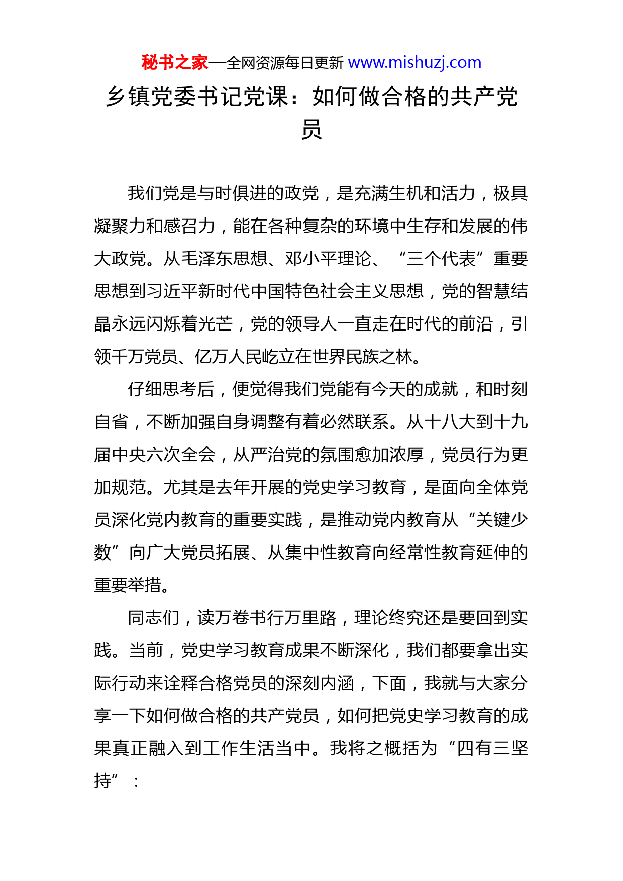 秘书之家—全网资源每日更新www.mishuzj.com乡镇党委书记党课:如何做合格的共产党员我们党是与时俱进的政党,是充满生机和活力,极具凝聚力和感召力,能在各种复杂的环境中生存和发展的伟大政党。从毛泽东思想、邓小平理论、“三个代表”重要思想到习近平新时代中国特色社会主义思想,党的智慧结晶永远闪烁着光芒,党的领导人一直走在时代的前沿,引领千万党员、亿万人民屹立在世界民族之林。仔细思考后,便觉得我们党能有今天的成就,和时刻自省,不断加强自身调整有着必然联系。从十八大到十九届中央六次全会,从严治党的氛围愈加浓厚,党员行为更加规范。尤其是去年开展的党史学习教育,是面向全体党员深化党内教育的重要实践,是推动党内教育从“关键少数”向广大党员拓展、从集中性教育向经常性教育延伸的重要举措。同志们,读万卷书行万里路,理论终究还是要回到实践。当前,党史学习教育成果不断深化,我们都要拿出实际行动来诠释合格党员的深刻内涵,下面,我就与大家分享一下如何做合格的共产党员,如何把党史学习教育的成果真正融入到工作生活当中。我将之概括为“四有三坚持”:秘书之家—全网资源每日更新www.mishuzj.com不忘心中有党,牢筑忠党之魂。心中有党,才能增强对党的信仰。我们每一个党员,都是因为对党的崇高信仰,才加入到党的组织中来的。是党员,就是党的人。在党,就要言党,就要心中有党。入党,并不是获取政治荣誉,或是披上华丽的外衣,而是要为党的事业奋斗。因此,是党员,就要把牢政治方向,强化组织意识,时刻想到自己是党的人,时刻不忘自己对党应尽的义务和责任,相信组织、依靠组织、服从组织,自觉维护党的团结统一。不忘心中有民,深怀为民之心。对个人的名誉、地位、利益,要想得透、看得透、看得淡。当然,可以争取合法合理的利益,这里强调的是公私分明。要着力解决好人民最关心、最直接、最现实的利益问题,特别是要下大力气解决好人民不满意的问题,多做雪中送炭的事情。不忘心中有责,扛起担当之责。习近平总书记强调,干部就要有担当,有多大担当才能干多大事业,尽多大责任才会有多大成就。不能只想当官不想干事,只想揽权不想担责,只想出彩不想出力。不能干一年、两年、三年还是涛声依旧,每年都是重复昨天的故事。眼下,面对险峻的发展形势,我们要有明知山有虎、偏向虎山行的劲头,积极寻找克服困难的具体对策,真正成为带领人民群众战风险、渡难关的主心骨。一个党员一面旗,有了党员干部秘书之家—全网资源每日更新www.mishuzj.com旗帜的作用,我们的事业就能成功。不忘心中有戒,严守纪律规矩。要正确行使权力,就要处理好公和私、情和法、利和法的关系;要始终严格要求自己,自觉弘扬和践行社会主义核心价值观,加强道德修养,追求健康情趣,把好权力关、金钱关、美色关,做到清清白白做人、干干净净做事、坦坦荡荡为官。发现自己有问题,就要立即改正,要做到闻过则喜,有则改之。习近平同志讲,要时刻反躬自省,就像古人讲的“吾日三省吾身”,自重、自省、自警、自励,洁身自好,存正祛邪,注重修身养德,增强防腐拒变的“免疫力”。下面,我总结了三个“良方”,与大家共勉:一是坚持勤学苦练,注重提升思想道德境界。一方面,要把读书学习作为一种生活习惯、一种工作方式、一种精神追求,多读书、常读书、读好书,重点学习时事政策理论、党章党规党纪、国家法律法规,以及古今中外优秀传统道德文化和社会主义荣辱观道德观价值观,从马列经典中坚定理想信念,从传统文化中涵养精神家园,从浩瀚书籍中开阔思维视野,用丰厚的文化知识陶冶道德情操、提升精神境界;另一方面,要注重深入实际、深入实践,自觉加入到全面构建社会主义和谐社会的队伍行列中去,主动向人民群众学习、向革命先辈学习、向先进模范学习、向身边的优秀典型学习,从中汲取道德营养、锤炼秘书之家—全网资源每日更新www.mishuzj.com道德意志、砥砺道德品行、提升道德境界。二是坚持克己自律,注重养成良好道德品行。一方面,要时刻注意筑牢思想道德防线,努力践行社会主义荣辱观、道德观和价值观,牢固树立正确的权力观、地位观和利益观,自觉遵章守纪,自觉接受监督,以谨慎之心对待权力、以淡泊之心对待名利、以警惕之心对待诱惑,老实做人、干净做事、清白做官,真正让权力在阳光下运行。另一方面,要时刻注意反躬自省、警醒自己,自重、自省、自警、自励,慎思、慎初、慎独、慎微,从大处着眼、从小处入手,从现在开始、从自己做起,从生活实践中学起、从小事小节中做起,真正做到不说错一句话、不做错一件事。。三是坚持身先力行,注重发挥引领示范作用。“村看村、户看户,群众看干部、党员看支部。”以身作则是共产党人的金号角。也就是说,党员干部的一言一行,对一个地方单位的风气具有明显的示范引导作用。作为合格的共产党员尤其是党员干部必须切实加强思想道德修养,时时、事事、处处注意以自己高尚的道德品行和人格力量为身边的群众做出榜样。在这里,给各位班子成员、村书记、主任、党员提一个要求,也是给一份承诺。对于自己的工作盘子要勤于思考、善于创新、敢于争优,我们不仅需要“执行者”,更秘书之家—全网资源每日更新www.mishuzj.com迫切