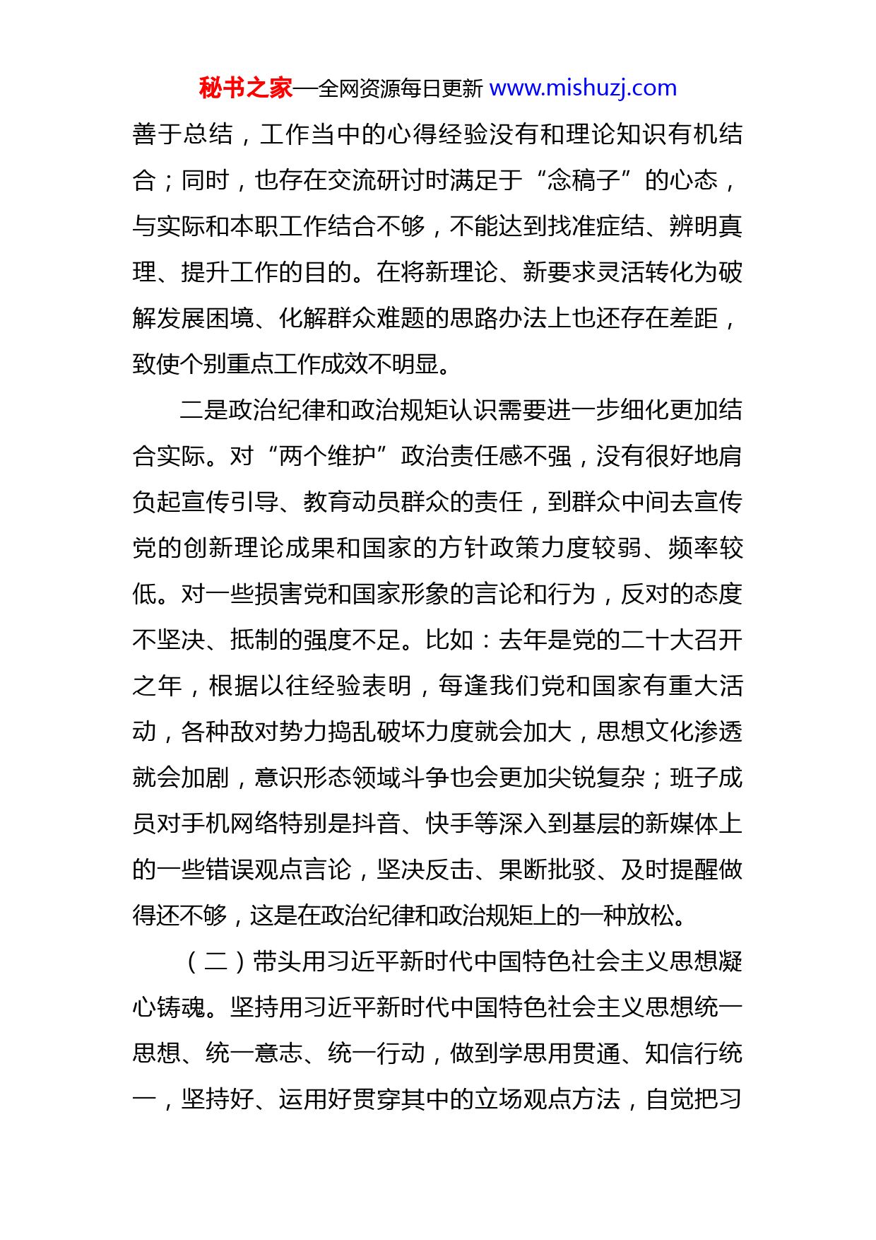 秘书之家—全网资源每日更新www.mishuzj.com乡镇街道2022年度民主生活会领导班子对照检查材料2022年,镇领导班子在“2021年度XX镇民主生活会”上从5个方面查摆问题XX条,通过逐项制定措施,广泛开展谈心谈话,认真听取有关方面意见建议,扎实推进整改工作有效开展,目前,XX条具体问题已全部整改到位。本次民主生活会,镇领导班子从6个方面入手,共查摆出问题16条,具体如下:一、检视查摆发现的问题(一)带头深刻领悟“两个确立”的决定性意义,增强“四个意识”、坚定“四个自信”、做到“两个维护”。严明政治纪律和政治规矩,提高政治判断力、政治领悟力、政治执行力,始终在政治立场、政治方向、政治原则、政治道路上同以习近平同志为核心的党中央保持高度一致方面一是对增强“四个意识”、坚定“四个自信”方面与实践结合不到位。一年来,镇党委先后组织召开党委理论中心组学习12次,但在增强“四个意识”、坚定“四个自信”方面与实践结合不到位。比如:党委理论学习中心组学习较多采用传统集中学习形式,形式固定古板,“照本宣科”多、心得分享少,也有一部分同志有心得经验但不秘书之家—全网资源每日更新www.mishuzj.com善于总结,工作当中的心得经验没有和理论知识有机结合;同时,也存在交流研讨时满足于“念稿子”的心态,与实际和本职工作结合不够,不能达到找准症结、辨明真理、提升工作的目的。在将新理论、新要求灵活转化为破解发展困境、化解群众难题的思路办法上也还存在差距,致使个别重点工作成效不明显。二是政治纪律和政治规矩认识需要进一步细化更加结合实际。对“两个维护”政治责任感不强,没有很好地肩负起宣传引导、教育动员群众的责任,到群众中间去宣传党的创新理论成果和国家的方针政策力度较弱、频率较低。对一些损害党和国家形象的言论和行为,反对的态度不坚决、抵制的强度不足。比如:去年是党的二十大召开之年,根据以往经验表明,每逢我们党和国家有重大活动,各种敌对势力捣乱破坏力度就会加大,思想文化渗透就会加剧,意识形态领域斗争也会更加尖锐复杂;班子成员对手机网络特别是抖音、快手等深入到基层的新媒体上的一些错误观点言论,坚决反击、果断批驳、及时提醒做得还不够,这是在政治纪律和政治规矩上的一种放松。(二)带头用习近平新时代中国特色社会主义思想凝心铸魂。坚持用习近平新时代中国特色社会主义思想统一思想、统一意志、统一行动,做到学思用贯通、知信行统一,坚持好、运用好贯穿其中的立场观点方法,自觉把习秘书之家—全网资源每日更新www.mishuzj.com近平新时代中国特色社会主义思想转化为坚定理想、锤炼党性和指导实践、推动工作的强大力量方面一是对习近平新时代中国特色社会主义思想还没有学用贯通、知行统一。镇领导班子在学习习近平新时代中国特色社会主义思想方面还存在学习质效不强、联系实际不深等问题,个别班子成员对党的创新理论所蕴含的新思想、新观点、新论断学习不全面、掌握不系统,往往是参加集中学习多、个人自主学习少,没有很好地学原文、读原著、悟原理,距离学懂、弄通、做实的要求仍有一定差距。同时一些同志认为基层工作惯性大,经验主义多,学习完理论知识后,总感觉理论高度过高,具体镇村工作当中用不上,没有做到学有所思、学有所用。比如:在以前的扶贫项目管理和维护上,只是遵循老一套的经营模式,没有充分将其充分融入乡村振兴战略,一些扶贫项目存在收益低、后期维护不到位的情况。二是将习近平新时代中国特色社会主义思想转化为坚定理想、锤炼党性和指导实践、推动工作的强大力量的程度有限。班子成员或多或少存在着重实践轻理论的情况,普遍存在工作达到上级要求的“合格线”就是把工作做好了的心态,这种心态一定程度上反映出基层党员干部理想信念不够坚定、工作推动不够有力,也说明了基层党员干部对习近平新时代中国特色社会主义思想学习不深入、认秘书之家—全网资源每日更新www.mishuzj.com识不到位、思考不深刻,无法有效转化应用的实际特点,还存在学用脱节的现象,眼界不宽广、思维不开拓,缺少管用有效的办法举措。比如:领导班子成员对联系网格和分管部门学用结合的督导不够,习惯在组织要求下,被动抄一抄、背一背,不动脑子,工作时不能充分运用学习成果指导工作实践,惯于凭经验、啃老本、走老路甚至放任顺其自然发展。在推进乡村振兴工作时,没有发挥好应有的带头作用,对推动乡村振兴过程中对一些棘手问题和困难预估不足,导致解决问题的办法不多、乡村振兴效果不佳。三是学习习近平新时代中国特色社会主义思想政治站位不高,学习形势单一。在学习贯彻习近平新时代中国特色社会主义思想、特别是在学习黄河国家战略方面,学习不深入、领悟不透彻,有时过多考虑客观条件,从发展大局考虑问题少。领导核心作用发挥不充分,谋划工作缺乏大局观、长远观、整体观,积极主动解决黄河流域生态保护和高质量发展问题的能动性不足。班子成员的学习以集中学习、对照文件学习的方式为主,座谈讨论较少,只满足于落实上级要求,方法比较单一,学习系统性、经常性、灵活性不够,缺乏互动交流,学习效果不理想。比如:由于理论学习欠缺,导致在推进黄河