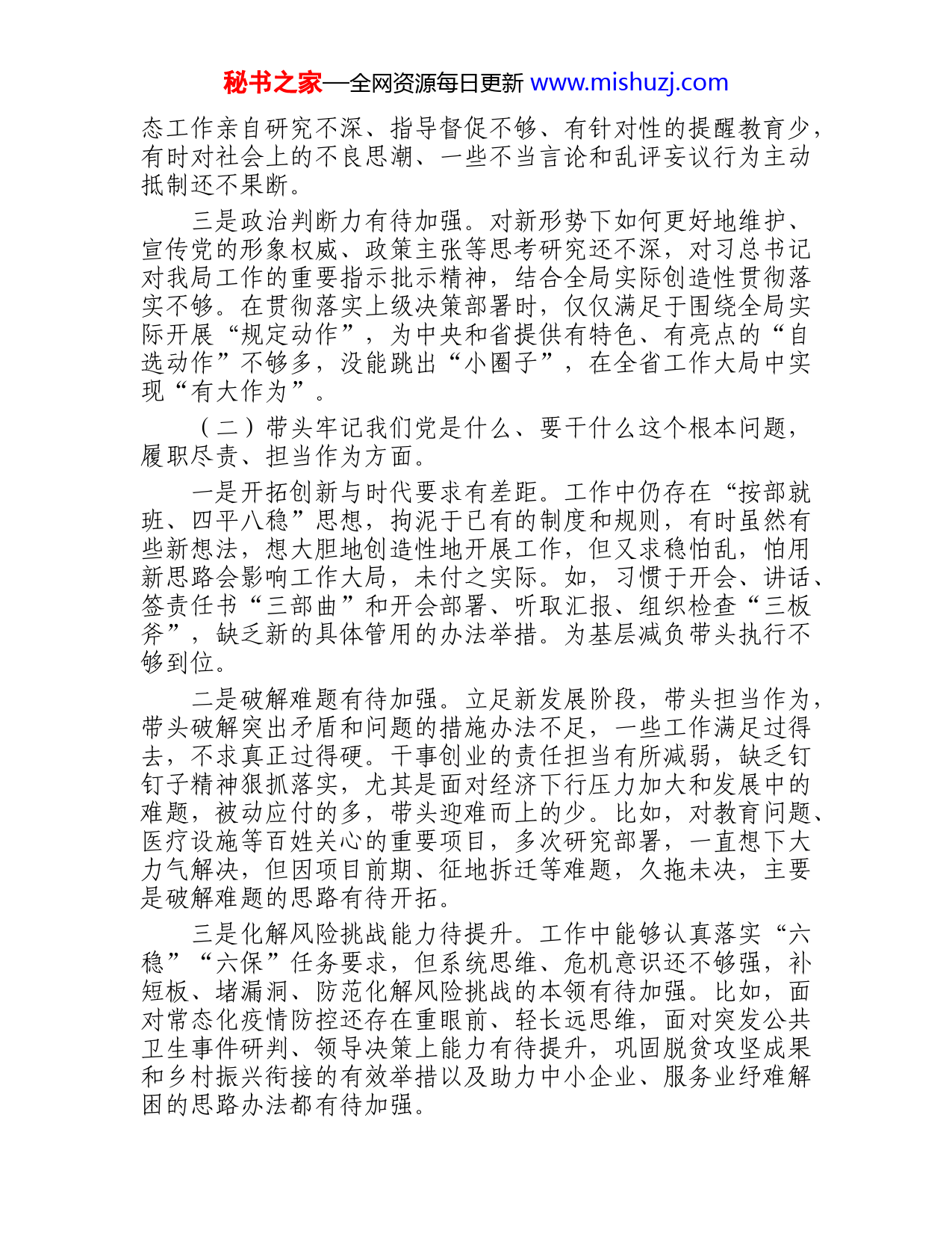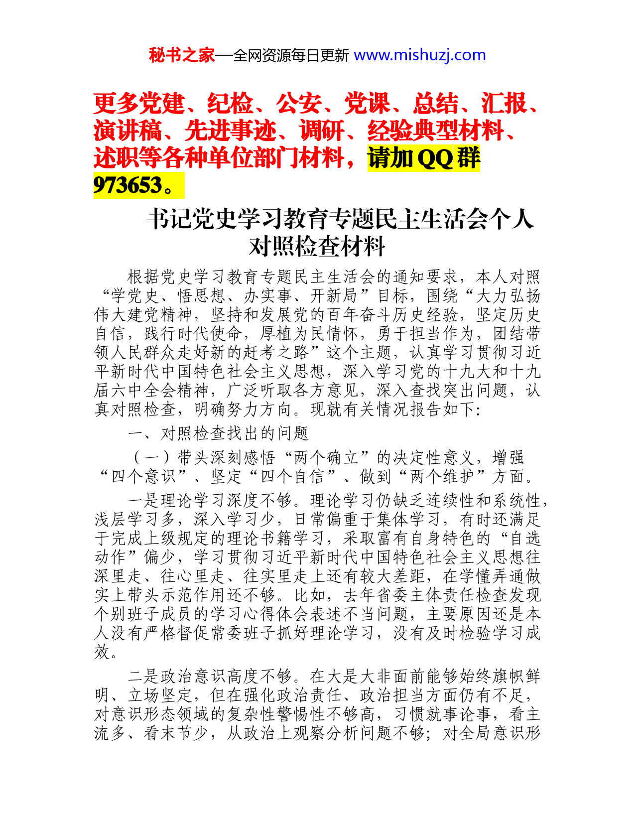 秘书之家—全网资源每日更新www.mishuzj.com更多党建、纪检、公安、党课、总结、汇报、演讲稿、先进事迹、调研、经验典型材料、述职等各种单位部门材料,请加QQ群973653。书记党史学习教育专题民主生活会个人对照检查材料根据党史学习教育专题民主生活会的通知要求,本人对照“学党史、悟思想、办实事、开新局”目标,围绕“大力弘扬伟大建党精神,坚持和发展党的百年奋斗历史经验,坚定历史自信,践行时代使命,厚植为民情怀,勇于担当作为,团结带领人民群众走好新的赶考之路”这个主题,认真学习贯彻习近平新时代中国特色社会主义思想,深入学习党的十九大和十九届六中全会精神,广泛听取各方意见,深入查找突出问题,认真对照检查,明确努力方向。现就有关情况报告如下:一、对照检查找出的问题(一)带头深刻感悟“两个确立”的决定性意义,增强“四个意识”、坚定“四个自信”、做到“两个维护”方面。一是理论学习深度不够。理论学习仍缺乏连续性和系统性,浅层学习多,深入学习少,日常偏重于集体学习,有时还满足于完成上级规定的理论书籍学习,采取富有自身特色的“自选动作”偏少,学习贯彻习近平新时代中国特色社会主义思想往深里走、往心里走、往实里走上还有较大差距,在学懂弄通做实上带头示范作用还不够。比如,去年省委主体责任检查发现个别班子成员的学习心得体会表述不当问题,主要原因还是本人没有严格督促常委班子抓好理论学习,没有及时检验学习成效。二是政治意识高度不够。在大是大非面前能够始终旗帜鲜明、立场坚定,但在强化政治责任、政治担当方面仍有不足,对意识形态领域的复杂性警惕性不够高,习惯就事论事,看主流多、看末节少,从政治上观察分析问题不够;对全局意识形秘书之家—全网资源每日更新www.mishuzj.com态工作亲自研究不深、指导督促不够、有针对性的提醒教育少,有时对社会上的不良思潮、一些不当言论和乱评妄议行为主动抵制还不果断。三是政治判断力有待加强。对新形势下如何更好地维护、宣传党的形象权威、政策主张等思考研究还不深,对习总书记对我局工作的重要指示批示精神,结合全局实际创造性贯彻落实不够。在贯彻落实上级决策部署时,仅仅满足于围绕全局实际开展“规定动作”,为中央和省提供有特色、有亮点的“自选动作”不够多,没能跳出“小圈子”,在全省工作大局中实现“有大作为”。(二)带头牢记我们党是什么、要干什么这个根本问题,履职尽责、担当作为方面。一是开拓创新与时代要求有差距。工作中仍存在“按部就班、四平八稳”思想,拘泥于已有的制度和规则,有时虽然有些新想法,想大胆地创造性地开展工作,但又求稳怕乱,怕用新思路会影响工作大局,未付之实际。如,习惯于开会、讲话、签责任书“三部曲”和开会部署、听取汇报、组织检查“三板斧”,缺乏新的具体管用的办法举措。为基层减负带头执行不够到位。二是破解难题有待加强。立足新发展阶段,带头担当作为,带头破解突出矛盾和问题的措施办法不足,一些工作满足过得去,不求真正过得硬。干事创业的责任担当有所减弱,缺乏钉钉子精神狠抓落实,尤其是面对经济下行压力加大和发展中的难题,被动应付的多,带头迎难而上的少。比如,对教育问题、医疗设施等百姓关心的重要项目,多次研究部署,一直想下大力气解决,但因项目前期、征地拆迁等难题,久拖未决,主要是破解难题的思路有待开拓。三是化解风险挑战能力待提升。工作中能够认真落实“六稳”“六保”任务要求,但系统思维、危机意识还不够强,补短板、堵漏洞、防范化解风险挑战的本领有待加强。比如,面对常态化疫情防控还存在重眼前、轻长远思维,面对突发公共卫生事件研判、领导决策上能力有待提升,巩固脱贫攻坚成果和乡村振兴衔接的有效举措以及助力中小企业、服务业纾难解困的思路办法都有待加强。秘书之家—全网资源每日更新www.mishuzj.com(三)带头践行以人民为中心的发展思想,确保党永远保持同人民群众的血肉联系方面。一是宗旨意识不牢固。全心全意为民服务宗旨意识不强烈,为民情怀不深厚,联系群众不密切,与先进典型相比,一切为了群众、一切依靠群众、一切服务群众践行不够,还未能真正与群众同甘共苦、患难与共。在想问题、办事情上,还没有完全从群众的需求和实际情况出发,回应群众新期盼还有较大差距。比如主观思想有所松懈、攻坚力度有所减退,缺乏持续巩固脱贫成效的措施和坚决防止返贫的韧劲。二是联系群众不紧密。平时深入基层开展调研不深入,调研还主要集中重点工作、项目建设,深入乡村一线直面群众、服务群众的少,与群众感情有所疏远;平日接待上访群众,多是把问题交办给主管部门、属地局(局、区),并嘱咐分管副局长督促办理,亲自跟踪解决问题力度不够,一些问题受制于政策因素,没能及时很好地解决。比如面对群众安征迁、矛盾纠纷、信访积案等工作,批示转办的多,亲自化解问题的少。三是为民务实精神欠缺。深入基层一线体察民情、了解实情的时间精力仍然较少,真正沉下身子深入一线解决民生短板、推进民生项目建设措施办法不多。如,来x局工作以来,尚未实现全局x个乡镇(街道)走访全覆盖;又如,对全局开展调研不均衡,对项目多的局(局、区)调研指导去得
