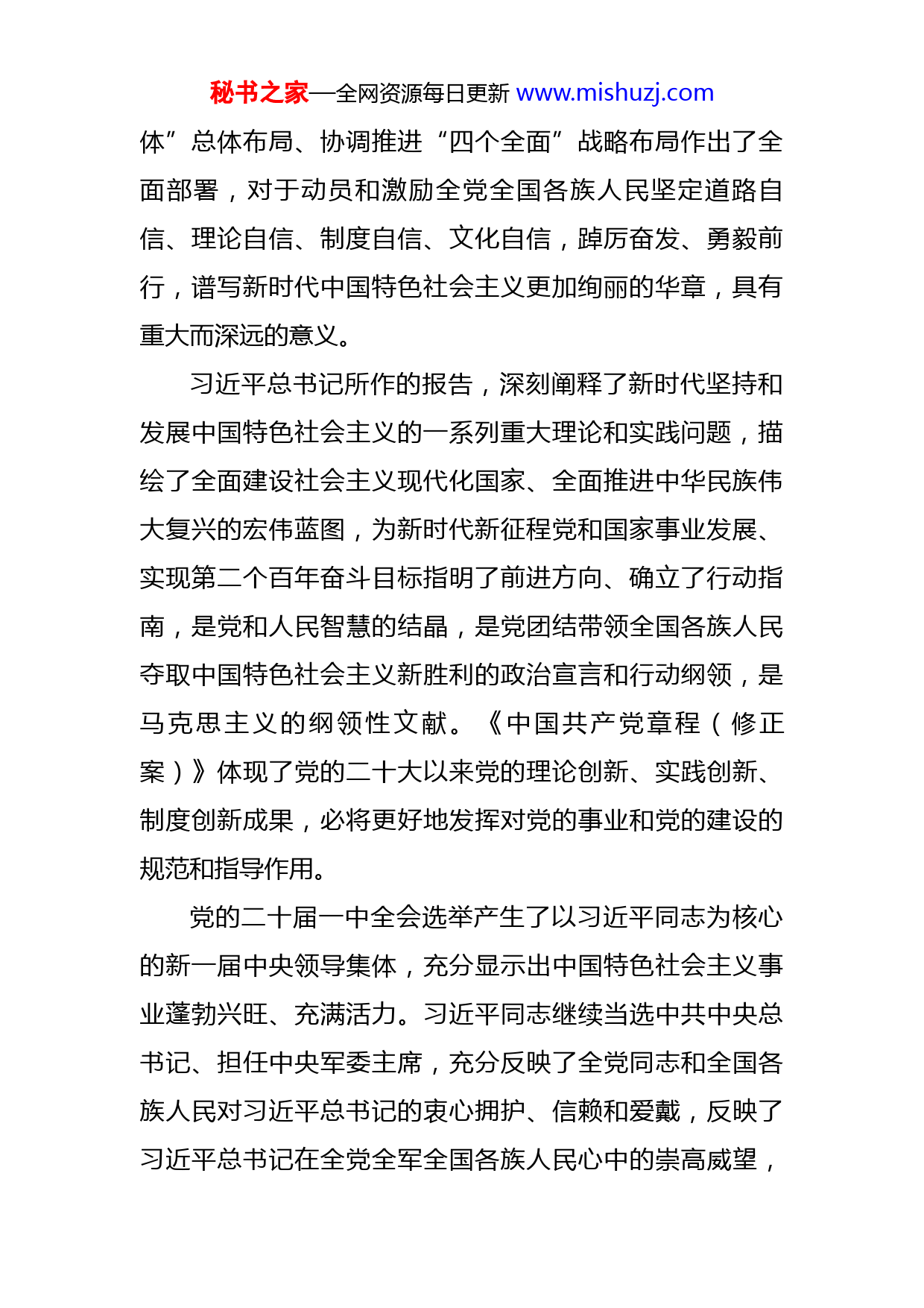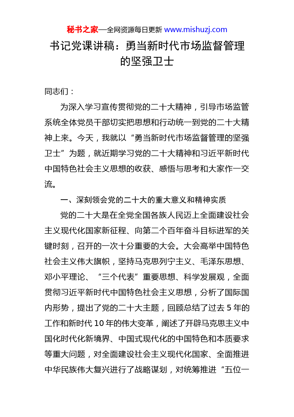 秘书之家—全网资源每日更新www.mishuzj.com书记党课讲稿:勇当新时代市场监督管理的坚强卫士同志们:为深入学习宣传贯彻党的二十大精神,引导市场监管系统全体党员干部切实把思想和行动统一到党的二十大精神上来。今天,我就以“勇当新时代市场监督管理的坚强卫士”为题,就近期学习党的二十大精神和习近平新时代中国特色社会主义思想的收获、感悟与思考和大家作一交流。一、深刻领会党的二十大的重大意义和精神实质党的二十大是在全党全国各族人民迈上全面建设社会主义现代化国家新征程、向第二个百年奋斗目标进军的关键时刻,召开的一次十分重要的大会。大会高举中国特色社会主义伟大旗帜,坚持马克思列宁主义、毛泽东思想、邓小平理论、“三个代表”重要思想、科学发展观,全面贯彻习近平新时代中国特色社会主义思想,分析了国际国内形势,提出了党的二十大主题,回顾总结了过去5年的工作和新时代10年的伟大变革,阐述了开辟马克思主义中国化时代化新境界、中国式现代化的中国特色和本质要求等重大问题,对全面建设社会主义现代化国家、全面推进中华民族伟大复兴进行了战略谋划,对统筹推进“五位一秘书之家—全网资源每日更新www.mishuzj.com体”总体布局、协调推进“四个全面”战略布局作出了全面部署,对于动员和激励全党全国各族人民坚定道路自信、理论自信、制度自信、文化自信,踔厉奋发、勇毅前行,谱写新时代中国特色社会主义更加绚丽的华章,具有重大而深远的意义。习近平总书记所作的报告,深刻阐释了新时代坚持和发展中国特色社会主义的一系列重大理论和实践问题,描绘了全面建设社会主义现代化国家、全面推进中华民族伟大复兴的宏伟蓝图,为新时代新征程党和国家事业发展、实现第二个百年奋斗目标指明了前进方向、确立了行动指南,是党和人民智慧的结晶,是党团结带领全国各族人民夺取中国特色社会主义新胜利的政治宣言和行动纲领,是马克思主义的纲领性文献。《中国共产党章程(修正案)》体现了党的二十大以来党的理论创新、实践创新、制度创新成果,必将更好地发挥对党的事业和党的建设的规范和指导作用。党的二十届一中全会选举产生了以习近平同志为核心的新一届中央领导集体,充分显示出中国特色社会主义事业蓬勃兴旺、充满活力。习近平同志继续当选中共中央总书记、担任中央军委主席,充分反映了全党同志和全国各族人民对习近平总书记的衷心拥护、信赖和爱戴,反映了习近平总书记在全党全军全国各族人民心中的崇高威望,秘书之家—全网资源每日更新www.mishuzj.com反映了亿万人民紧跟党的核心、人民领袖开创更加美好未来的共同心声和坚定决心。大会作出的决策部署、取得的丰硕成果,必将对新时代党和国家事业发展、推进中华民族伟大复兴历史进程,对夺取中国特色社会主义新胜利,产生重大而深远的影响。学习宣传贯彻党的二十大精神是当前和今后一个时期全党全国的首要政治任务。全体干部职工要以强烈的政治责任感和使命感认真学习宣传贯彻党的二十大精神,深刻领会、准确把握党的二十大报告中的重要思想、重要观点、重大战略、重大举措,自觉在思想上政治上行动上同以习近平同志为核心的党中央保持高度一致,坚定坚决落实党中央和省市区委各项决策部署,用实际行动当好“两个确立”的坚定捍卫者和忠实践行者,确保市场监管系统各项工作始终方向正确、行稳致远。二、准确把握党的二十大的政治定位和思想内涵1.深刻领会党的二十大的主题。高举中国特色社会主义伟大旗帜,全面贯彻习近平新时代中国特色社会主义思想,弘扬伟大建党精神,自信自强、守正创新,踔厉奋发、勇毅前行,为全面建设社会主义现代化国家、全面推进中华民族伟大复兴而团结奋斗。这个主题是大会的灵魂,是党和国家事业发展的总纲,鲜明昭示了我们党在新征程上举什么旗、走什么路、以什么样的精神状态、朝着秘书之家—全网资源每日更新www.mishuzj.com什么样的目标继续前进的重大问题,在前进道路上,务必不忘初心、牢记使命,务必谦虚谨情、艰苦奋斗,务必敢干斗争、善于斗争,为实现新时代新征程党的中心任务团结奋斗。2.深刻领会过去5年的工作和新时代10年的伟大变革。党的十九大以来的5年,极不寻常、极不平凡。新时代10年的伟大变革,在党史、新中国史、改革开放史、社会主义发展史、中华民族发展史上具有里程碑意义。中国XX党在革命性锻造中更加坚强有力,中国人民焕发出更为强烈的历史自觉和主动精神,实现中华民族伟大复兴进入了不可逆转的历史进程,科学社会主义在二十一世纪的中国焕发出新的蓬勃生机。3.深刻领会“两个确立”的决定性意义。党的二十大深刻指出,新时代十年的伟大变革,是在以习近平同志为核心的党中央坚强领导下、在习近平新时代中国特色社会主义思想指引下全党全国各族人民团结奋斗取得的。党确立习近平同志党中央的核心、全党的核心地位,确立习近平新时代中国特色社会主义思想的指导地位,反映了全党全军全国各族人民共同心愿,对新时代党和国家事业发展、对推进中华民族伟大复兴历史进程具有决定性意义。事实证明,“两个确立”是新时代最大政治成果、最重要历史经验、最客观实践结论。秘书之家