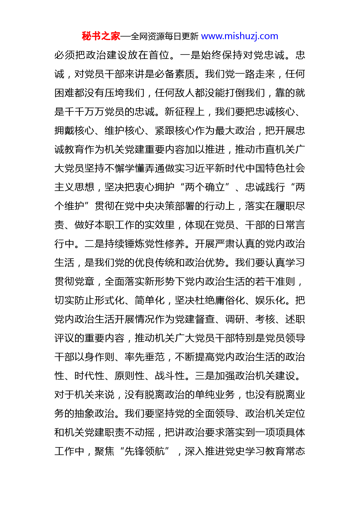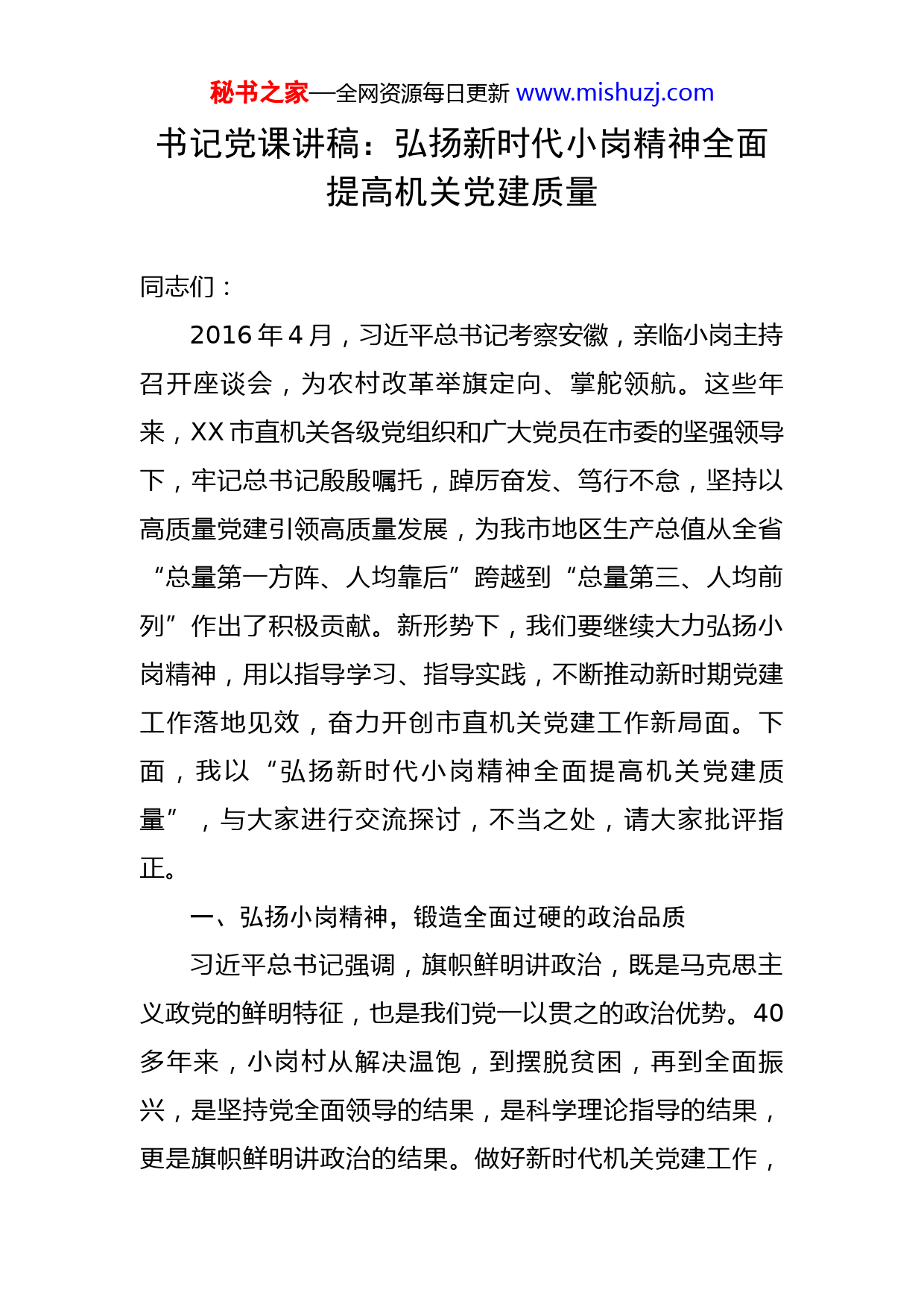 秘书之家—全网资源每日更新www.mishuzj.com书记党课讲稿:弘扬新时代小岗精神全面提高机关党建质量同志们:2016年4月,习近平总书记考察安徽,亲临小岗主持召开座谈会,为农村改革举旗定向、掌舵领航。这些年来,XX市直机关各级党组织和广大党员在市委的坚强领导下,牢记总书记殷殷嘱托,踔厉奋发、笃行不怠,坚持以高质量党建引领高质量发展,为我市地区生产总值从全省“总量第一方阵、人均靠后”跨越到“总量第三、人均前列”作出了积极贡献。新形势下,我们要继续大力弘扬小岗精神,用以指导学习、指导实践,不断推动新时期党建工作落地见效,奋力开创市直机关党建工作新局面。下面,我以“弘扬新时代小岗精神全面提高机关党建质量”,与大家进行交流探讨,不当之处,请大家批评指正。一、弘扬小岗精神,锻造全面过硬的政治品质习近平总书记强调,旗帜鲜明讲政治,既是马克思主义政党的鲜明特征,也是我们党一以贯之的政治优势。40多年来,小岗村从解决温饱,到摆脱贫困,再到全面振兴,是坚持党全面领导的结果,是科学理论指导的结果,更是旗帜鲜明讲政治的结果。做好新时代机关党建工作,秘书之家—全网资源每日更新www.mishuzj.com必须把政治建设放在首位。一是始终保持对党忠诚。忠诚,对党员干部来讲是必备素质。我们党一路走来,任何困难都没有压垮我们,任何敌人都没能打倒我们,靠的就是千千万万党员的忠诚。新征程上,我们要把忠诚核心、拥戴核心、维护核心、紧跟核心作为最大政治,把开展忠诚教育作为机关党建重要内容加以推进,推动市直机关广大党员坚持不懈学懂弄通做实习近平新时代中国特色社会主义思想,坚决把衷心拥护“两个确立”、忠诚践行“两个维护”贯彻在党中央决策部署的行动上,落实在履职尽责、做好本职工作的实效里,体现在党员、干部的日常言行中。二是持续锤炼党性修养。开展严肃认真的党内政治生活,是我们党的优良传统和政治优势。我们要认真学习贯彻党章,全面落实新形势下党内政治生活的若干准则,切实防止形式化、简单化,坚决杜绝庸俗化、娱乐化。把党内政治生活开展情况作为党建督查、调研、考核、述职评议的重要内容,推动机关广大党员干部特别是党员领导干部以身作则、率先垂范,不断提高党内政治生活的政治性、时代性、原则性、战斗性。三是加强政治机关建设。对于机关来说,没有脱离政治的单纯业务,也没有脱离业务的抽象政治。我们要坚持党的全面领导、政治机关定位和机关党建职责不动摇,把讲政治要求落实到一项项具体工作中,聚焦“先锋领航”,深入推进党史学习教育常态秘书之家—全网资源每日更新www.mishuzj.com化长效化,大力建设讲政治、守纪律、负责任、有效率的模范机关,确保党中央决策部署和省委、市委工作要求在市直机关有效贯彻落实。二、弘扬小岗精神,培育敢为人先的创新能力习近平总书记指出,只有敢于走别人没走过的路,才能收获别样的风景。40年前,小岗人民冲破“谈包色变”的思想束缚、突破了“两个不许”的政策限制、打破了“一大二公”的平均主义,敢闯敢试,引领农村改革的风气之先。当前,XX市直机关有XXX个基层党组织,X万名党员,工作对象多,情况各异,也需要我们聚焦新时代机关党建的新形势新情况,积极探索机关党建工作新途径新办法。一是推进理念思路创新。思想是行动的先导,没有创新的思路,就不可能开创新局面。面对新情况新任务,我们必须与时俱进,确保我们的工作更有针对性,特别是要盯紧党建工作中存在的短板问题,牢固树立目标导向、问题导向、结果导向,有的放矢抓创新。比如为加强党内监督,我们建立了落实全面从严治党责任研判会商等机制,抓早抓小,确保把问题解决在萌芽状态。为规范基层党组织活动开展,丰富内容,提升质量,增强效果,我们面向市直机关公布了首批党支部主题党日基地,建立了市直党建工作联系片等制度,让基层党组织有了更多的学习交流平台。二是尊重基层首创精神。当前市直机关党组织秘书之家—全网资源每日更新www.mishuzj.com类型多,有机关、事业、国企、非公等等,具体到一个单位,工作性质、党员情况也各异。在抓具体的工作中,需要给基层保留一定的可操作性空间,鼓励基层结合实际探索创新,细化务实管用的具体举措,创造性抓好落实。结合“星级党支部”创评、优秀“党支部工作法”展评等,总结提炼创新经验和典型做法,加大推广力度,让基层党组织学有榜样。三是坚持继承创新并举。在继承的基础上创新,在创新的前提下发展,处理好继承和创新的关系,是促进党建工作常抓常新,充满生机和活力的有效途径。“三微”“党纪一小时”是我们近年来精心打造的宣讲教育品牌,在市直机关党员教育工作中发挥了较好作用,这些好的做法,我们通过制度的形式加以巩固,确保作用一直发挥下去。四是创新自身工作机制。全面从严治党必须从自身做起,从日常各项工作严起。在内部管理中,我们牢记习近平总书记“打铁必须自身硬”的殷切嘱托,进一步增强全面从严治党永远在路上的政治自觉,创新日常工作机制,建立了加强政治机关建设、深化学习型机关建设、重要制度理论文稿研讨等制度,推动工委机关各项工作提质增效。三、弘扬小岗精神,树牢干事担事的优良作风习近平总书记指出,要