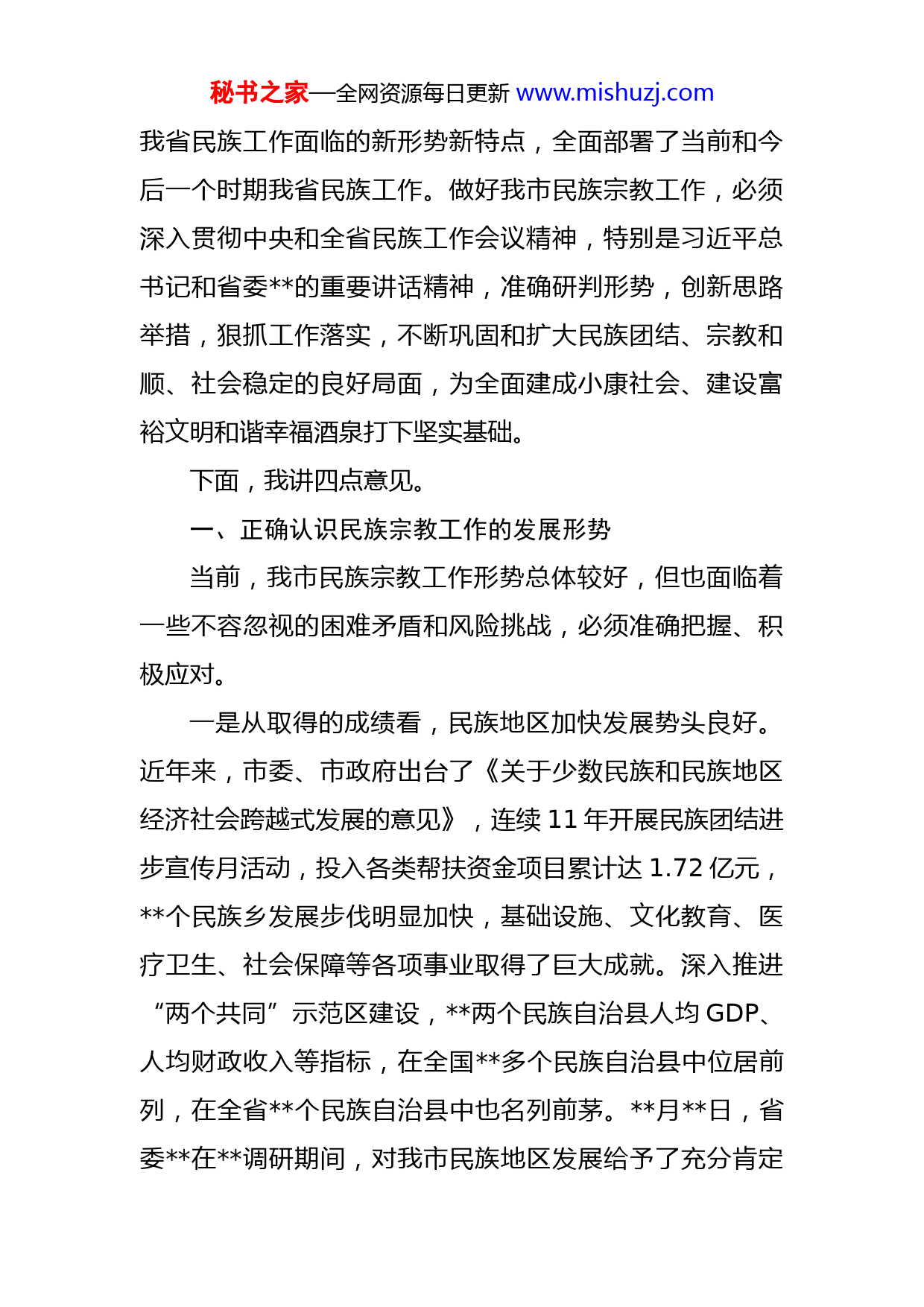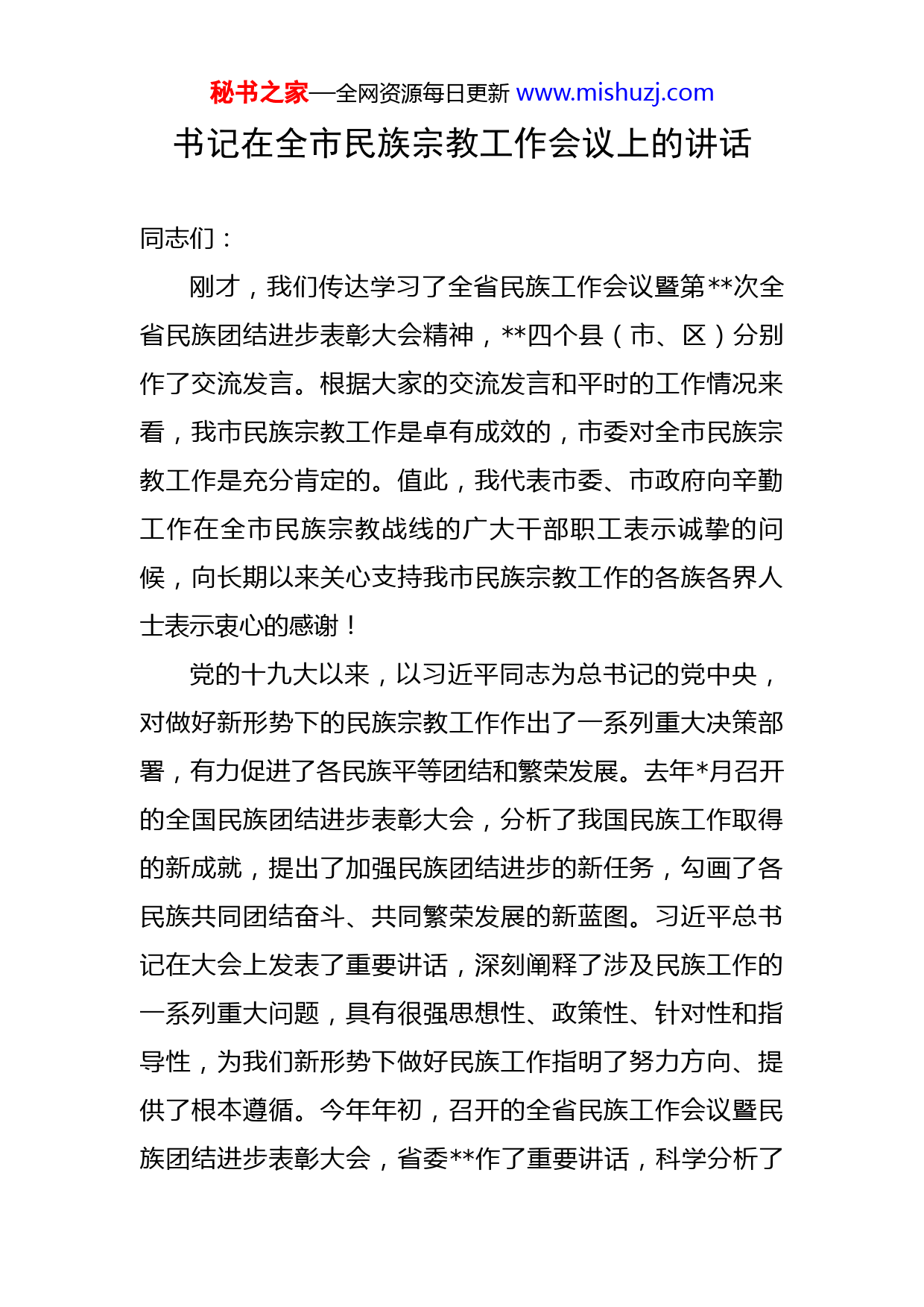 秘书之家—全网资源每日更新www.mishuzj.com书记在全市民族宗教工作会议上的讲话同志们:刚才,我们传达学习了全省民族工作会议暨第次全省民族团结进步表彰大会精神,四个县(市、区)分别作了交流发言。根据大家的交流发言和平时的工作情况来看,我市民族宗教工作是卓有成效的,市委对全市民族宗教工作是充分肯定的。值此,我代表市委、市政府向辛勤工作在全市民族宗教战线的广大干部职工表示诚挚的问候,向长期以来关心支持我市民族宗教工作的各族各界人士表示衷心的感谢!党的十九大以来,以习近平同志为总书记的党中央,对做好新形势下的民族宗教工作作出了一系列重大决策部署,有力促进了各民族平等团结和繁荣发展。去年月召开的全国民族团结进步表彰大会,分析了我国民族工作取得的新成就,提出了加强民族团结进步的新任务,勾画了各民族共同团结奋斗、共同繁荣发展的新蓝图。习近平总书记在大会上发表了重要讲话,深刻阐释了涉及民族工作的一系列重大问题,具有很强思想性、政策性、针对性和指导性,为我们新形势下做好民族工作指明了努力方向、提供了根本遵循。今年年初,召开的全省民族工作会议暨民族团结进步表彰大会,省委作了重要讲话,科学分析了秘书之家—全网资源每日更新www.mishuzj.com我省民族工作面临的新形势新特点,全面部署了当前和今后一个时期我省民族工作。做好我市民族宗教工作,必须深入贯彻中央和全省民族工作会议精神,特别是习近平总书记和省委的重要讲话精神,准确研判形势,创新思路举措,狠抓工作落实,不断巩固和扩大民族团结、宗教和顺、社会稳定的良好局面,为全面建成小康社会、建设富裕文明和谐幸福酒泉打下坚实基础。下面,我讲四点意见。一、正确认识民族宗教工作的发展形势当前,我市民族宗教工作形势总体较好,但也面临着一些不容忽视的困难矛盾和风险挑战,必须准确把握、积极应对。一是从取得的成绩看,民族地区加快发展势头良好。近年来,市委、市政府出台了《关于少数民族和民族地区经济社会跨越式发展的意见》,连续11年开展民族团结进步宣传月活动,投入各类帮扶资金项目累计达1.72亿元,个民族乡发展步伐明显加快,基础设施、文化教育、医疗卫生、社会保障等各项事业取得了巨大成就。深入推进“两个共同”示范区建设,两个民族自治县人均GDP、人均财政收入等指标,在全国多个民族自治县中位居前列,在全省个民族自治县中也名列前茅。月日,省委在调研期间,对我市民族地区发展给予了充分肯定秘书之家—全网资源每日更新www.mishuzj.com和高度评价,也对两个民族自治县的发展也提出了明确要求。二是从存在的问题看,民族地区瓶颈制约仍然突出。中央和省市先后制定出台了一系列扶持民族地区加快发展的政策措施,推动实施了一大批基础设施项目和民生工程,民族地区面貌发生了翻天覆地的变化。但制约民族地区发展的瓶颈问题还没有得到根本解决,基础设施条件仍然落后,教育、医疗专业人员缺乏,社会事业发展相对滞后。个民族乡其中个是移民乡,人均纯收入只有全市农民平均水平的1/3,目前还有3万多少数民族群众处于低收入水平,成为制约我市建成的最大短板。三是从发展的机遇看,民族地区扶持政策相互叠加。国家实施“一带一路”战略以来,为西部地区特别是民族地区加快发展带来了千载难逢的重大机遇。去年,党中央、国务院出台了《关于加强和改进新形势下民族工作的意见》,在转移支付、产业发展、基础设施、教育医疗等方面,提出了一系列含金量较高的差别化支持政策。省委、省政府编制实施了《全省民族地区经济社会发展规划》,并在全省“6873”交通突破行动中明确向少数民族地区倾斜。可以说,民族地区正处在政策叠加期、发展黄金期,必须抢抓机遇、加速发展。四是从面临的挑战看,民族地区稳定风险不容忽视。秘书之家—全网资源每日更新www.mishuzj.com我市民族地区大局总体平稳、宗教关系持续和谐。但必须清醒地看到,受国内外因素的影响,维护民族地区和谐稳定的压力依然很大。在民族领域,境外敌对势力利用民族问题实施西化分化的图谋从未改变,而我市恰好处在四省区交界处,地理位置十分特殊,维稳风险时刻存在。特别是今年将举办博览会,我们既面临着重大的发展机遇,同时也面临着严峻的维稳形势。在宗教领域,境外宗教势力渗透加剧,搞非法宗教、地下活动越来越隐蔽,打击处理难度不断加大。这些问题处理不好,就可能影响社会大局稳定,必须引起我们高度重视。二、准确把握民族宗教工作的基本要领党的十九大以来,习近平总书记就民族宗教工作作出了一系列重要论述,提出了一系列新思想、新论断、新要求。我们一定要认真学习领会,准确把握做好民族宗教工作的基本要领。一要把握好政治方向。各级党委、政府要牢牢把握民族宗教工作的正确政治方向,具体来说就是习近平总书记强调的“八个坚持”。即:坚持在中国共产党的领导下,坚持中国特色社会主义道路,坚持维护祖国统一,坚持各民族一律平等,坚持和完善民族区域自治制度,坚持各民族共同团结奋斗、共同繁荣发展,坚持打牢中华民族共同体的思想基础,坚持依法治国,加强各民族交往交流交秘书之家—全网资源每日更新www.mishuzj.com融,促进各民族和睦共处