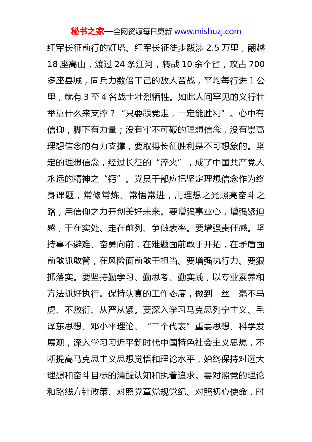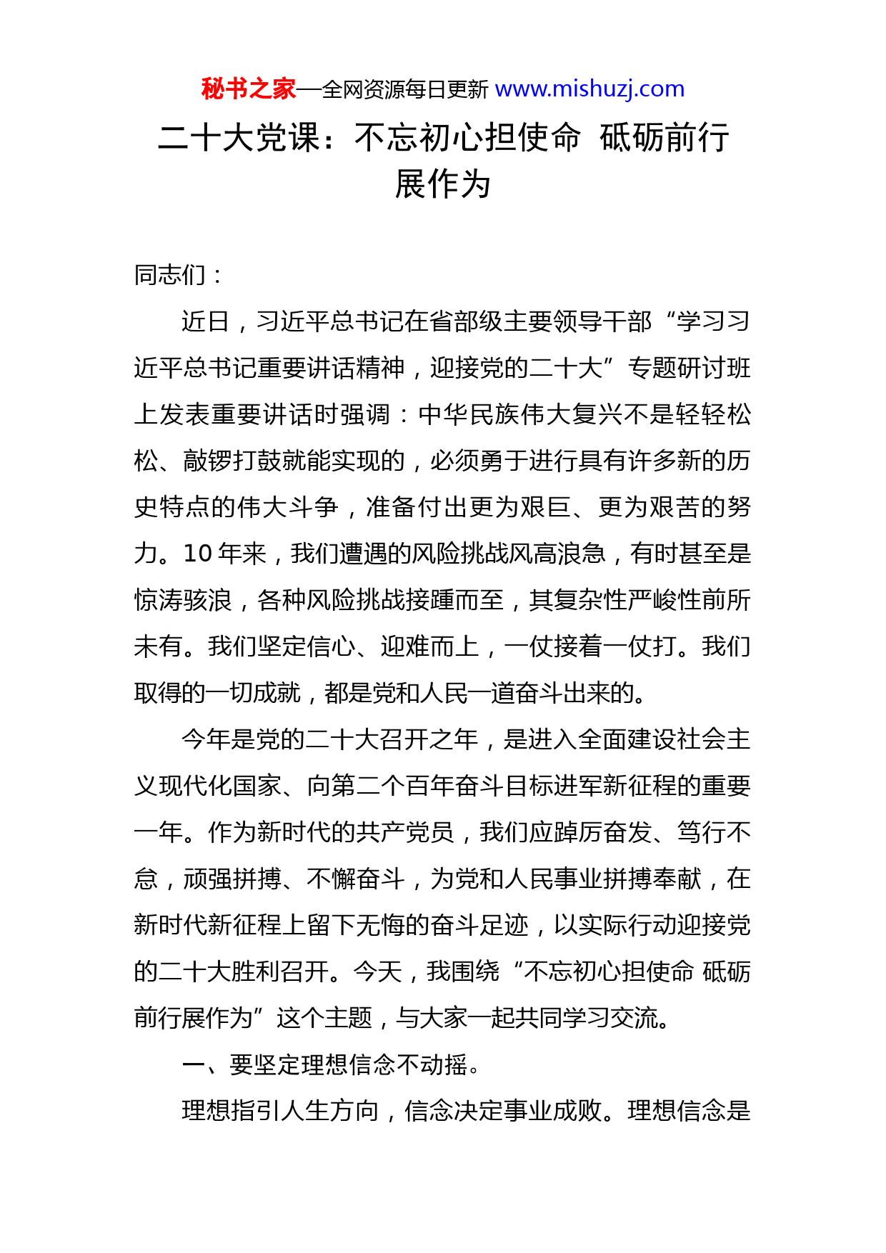 秘书之家—全网资源每日更新www.mishuzj.com二十大党课:不忘初心担使命砥砺前行展作为同志们:近日,习近平总书记在省部级主要领导干部“学习习近平总书记重要讲话精神,迎接党的二十大”专题研讨班上发表重要讲话时强调:中华民族伟大复兴不是轻轻松松、敲锣打鼓就能实现的,必须勇于进行具有许多新的历史特点的伟大斗争,准备付出更为艰巨、更为艰苦的努力。10年来,我们遭遇的风险挑战风高浪急,有时甚至是惊涛骇浪,各种风险挑战接踵而至,其复杂性严峻性前所未有。我们坚定信心、迎难而上,一仗接着一仗打。我们取得的一切成就,都是党和人民一道奋斗出来的。今年是党的二十大召开之年,是进入全面建设社会主义现代化国家、向第二个百年奋斗目标进军新征程的重要一年。作为新时代的共产党员,我们应踔厉奋发、笃行不怠,顽强拼搏、不懈奋斗,为党和人民事业拼搏奉献,在新时代新征程上留下无悔的奋斗足迹,以实际行动迎接党的二十大胜利召开。今天,我围绕“不忘初心担使命砥砺前行展作为”这个主题,与大家一起共同学习交流。一、要坚定理想信念不动摇。理想指引人生方向,信念决定事业成败。理想信念是秘书之家—全网资源每日更新www.mishuzj.com红军长征前行的灯塔。红军长征徒步跋涉2.5万里,翻越18座高山,渡过24条江河,转战10余个省,攻占700多座县城,同兵力数倍于己的敌人苦战,平均每行进1公里,就有3至4名战士壮烈牺牲。如此人间罕见的义行壮举靠什么来支撑?“只要跟党走,一定能胜利”。心中有信仰,脚下有力量;没有牢不可破的理想信念,没有崇高理想信念的有力支撑,要取得长征胜利是不可想象的。坚定的理想信念,经过长征的“淬火”,成了中国共产党人永远的精神之“钙”。党员干部应把坚定理想信念作为终身课题,常修常炼、常悟常进,用理想之光照亮奋斗之路,用信仰之力开创美好未来。要增强事业心,增强紧迫感,干在实处、走在前列、争做表率。要增强责任感。坚持事不避难、奋勇向前,在难题面前敢于开拓,在矛盾面前敢抓敢管,在风险面前敢于担当。要增强执行力。要狠抓落实。要坚持勤学习、勤思考、勤实践,以专业素养和方法抓好执行。保持认真的工作态度,做到一丝一毫不马虎、不敷衍、从严从紧。要深入学习马克思列宁主义、毛泽东思想、邓小平理论、“三个代表”重要思想、科学发展观,深入学习习近平新时代中国特色社会主义思想,不断提高马克思主义思想觉悟和理论水平,始终保持对远大理想和奋斗目标的清醒认知和执着追求。要对照党的理论和路线方针政策、对照党章党规党纪、对照初心使命,时秘书之家—全网资源每日更新www.mishuzj.com刻自重自省,检视自己的理想信念和思想言行,经常查找差距和不足,纠偏差、强弱项、补短板,为崇高理想信念而不懈奋斗。二、要勇于担当作为不含糊。习近平总书记在庆祝中国共产主义青年团成立100周年大会上的重要讲话中强调,“实现中国梦是一场历史接力赛,当代青年要在实现民族复兴的赛道上奋勇争先”。新时代的中国青年必须担负起时代重任,创造时代赋予的新的历史意义,才能为建设中国特色社会主义注入新的青春活力,为实现第二个百年奋斗目标加入新的生机色彩,为实现中华民族伟大复兴的中国梦接续新的力量。新时期,新任务,压力与挑战并存,全党必须始终牢记,只有植根人民、造福人民,党才能始终立于不败之地;坚持以人为本、执政为民,始终保持党同人民群众的血肉联系,才是永恒的哲理与魅力。俗话说:“在其位,谋其政;任其职,尽其责。”这是对担当精神最好的诠释。正所谓“为官避事生平耻”,敢于担当,就是面对大是大非要敢于亮剑,坚持原则;面对矛盾时敢于迎难而上,敢于承担责任、坚守使命;面对全面深化改革难题,要有知难而进、抓铁有痕、踏石留印的精神,努力寻找克服困难的具体措施,绝不能被挫折所吓倒;面对金钱、名利、地位的诱惑,敢于真正撑起心中的一片清廉,不忘初心,不忘本秘书之家—全网资源每日更新www.mishuzj.com心,抵制诱惑;面对危机时敢于挺身而出、冲锋在前,真正成为带领群众战风险、渡难关的主心骨。要坚持“立说立行”“事不过夜”工作作风,以时不我待、只争朝夕的责任感、紧迫感,以一刻也不耽误的状态冲在前干在前,做到不懈怠、不犹豫、不低头、不观望、不拖拉,争当改革发展的促进派、实干家,保持战略定力,发扬钉钉子精神,一锤接着一锤敲、一件接着一件办、一步接着一步走、一年接着一年干,用担当作为托起中国梦。三、要坚持正风肃纪不逾越。“欲知平直,则必准绳;欲知方圆,则必规矩;人主欲自知,则必直士”纪律与规矩是一根带电的“高压线”,是一张公正的“通行证”,守纪律讲规矩是对党员干部的基本要求。规矩,每名党员都要明白,纪严于法、纪在法前,纪律是“紧箍咒”“高压线”,也是“防护衣”“护身符”,必须从内心里敬法畏纪,做到心有所畏、言有所戒、行有所止。要强化纪律观念,对党章、条令条例、政策规定等,要经常学、反复学,不断增强法纪意识,坚决克服侥幸心理,时刻把个人言谈举止置于纪律规定的约束之中。要敬畏纪律规定,谨小慎微、谨行慎独,自觉把守纪律讲规矩作为党性的重要考验、忠诚度的重要检验,经常对照自己、检查自己、警醒自己,多算算政治