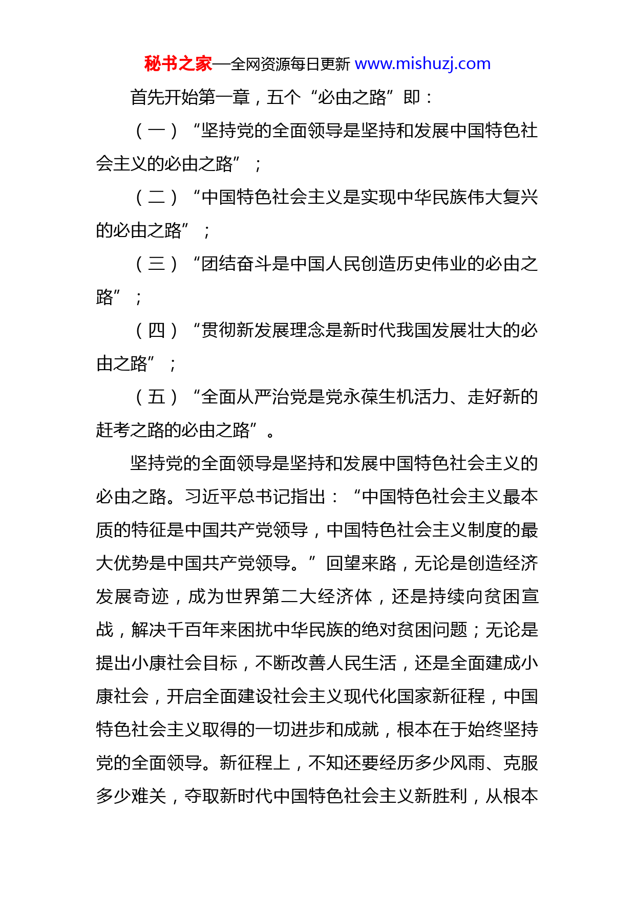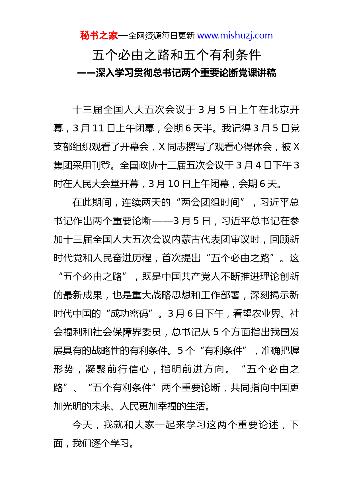 秘书之家—全网资源每日更新www.mishuzj.com五个必由之路和五个有利条件——深入学习贯彻总书记两个重要论断党课讲稿十三届全国人大五次会议于3月5日上午在北京开幕,3月11日上午闭幕,会期6天半。我记得3月5日党支部组织观看了开幕会,X同志撰写了观看心得体会,被X集团采用刊登。全国政协十三届五次会议于3月4日下午3时在人民大会堂开幕,3月10日上午闭幕,会期6天。在此期间,连续两天的“两会团组时间”,习近平总书记作出两个重要论断——3月5日,习近平总书记在参加十三届全国人大五次会议内蒙古代表团审议时,回顾新时代党和人民奋进历程,首次提出“五个必由之路”。这“五个必由之路”,既是中国共产党人不断推进理论创新的最新成果,也是重大战略思想和工作部署,深刻揭示新时代中国的“成功密码”。3月6日下午,看望农业界、社会福利和社会保障界委员,总书记从5个方面指出我国发展具有的战略性的有利条件。5个“有利条件”,准确把握形势,凝聚前行信心,指明前进方向。“五个必由之路”、“五个有利条件”两个重要论断,共同指向中国更加光明的未来、人民更加幸福的生活。今天,我就和大家一起来学习这两个重要论述,下面,我们逐个学习。秘书之家—全网资源每日更新www.mishuzj.com首先开始第一章,五个“必由之路”即:(一)“坚持党的全面领导是坚持和发展中国特色社会主义的必由之路”;(二)“中国特色社会主义是实现中华民族伟大复兴的必由之路”;(三)“团结奋斗是中国人民创造历史伟业的必由之路”;(四)“贯彻新发展理念是新时代我国发展壮大的必由之路”;(五)“全面从严治党是党永葆生机活力、走好新的赶考之路的必由之路”。坚持党的全面领导是坚持和发展中国特色社会主义的必由之路。习近平总书记指出:“中国特色社会主义最本质的特征是中国共产党领导,中国特色社会主义制度的最大优势是中国共产党领导。”回望来路,无论是创造经济发展奇迹,成为世界第二大经济体,还是持续向贫困宣战,解决千百年来困扰中华民族的绝对贫困问题;无论是提出小康社会目标,不断改善人民生活,还是全面建成小康社会,开启全面建设社会主义现代化国家新征程,中国特色社会主义取得的一切进步和成就,根本在于始终坚持党的全面领导。新征程上,不知还要经历多少风雨、克服多少难关,夺取新时代中国特色社会主义新胜利,从根本秘书之家—全网资源每日更新www.mishuzj.com上讲还是要靠党的全面领导这个“定海神针”。只要坚定不移坚持党的全面领导、维护党中央权威和集中统一领导,就一定能够确保全党全国拥有团结奋斗的强大政治凝聚力、发展自信心,集聚起守正创新、共克时艰的强大力量,形成风雨来袭时全体人民最可靠的主心骨。中国特色社会主义是实现中华民族伟大复兴的必由之路。中国特色社会主义,是当代中国发展进步的旗帜,是改革开放以来党的全部理论和实践的主题,是党和人民历尽千辛万苦、付出巨大代价取得的根本成就。党的十八大以来,以XXX同志为核心的党中央,统揽伟大斗争、伟大工程、伟大事业、伟大梦想,推动中国特色社会主义进入新时代,中华民族迎来了从站起来、富起来到强起来的伟大飞跃,在世界百年未有之大变局中创造了“风景这边独好”的发展局面。事实雄辩地证明:中国特色社会主义是根植于中国大地、反映中国人民意愿、适应中国和时代发展进步要求的科学社会主义。这条路,走得通、走得对、走得好。只有这条道路而没有别的道路,能够引领中国进步、增进人民福祉、实现民族复兴。随着新时代坚持和发展中国特色社会主义的伟大实践不断向前,这条道路必将越走越宽广。新征程上,只要始终不渝走中国特色社会主义道路,就一定能够不断实现人民对美好生活的向往,不断推进全体人民共同富裕。秘书之家—全网资源每日更新www.mishuzj.com团结奋斗是中国人民创造历史伟业的必由之路。“万夫一力,天下无敌。”XXX总书记指出:“一百年来,党和人民取得的一切成就都是团结奋斗的结果,团结奋斗是中国共产党和中国人民最显著的精神标识。”革命战争年代,我们党坚持紧紧依靠群众、广泛发动群众,与人民同甘共苦、团结奋斗,取得新民主主义革命胜利。社会主义革命和建设时期,党领导和实现了全国各族人民的大团结,把一切积极因素调动起来,为社会主义建设服务。改革开放和社会主义现代化建设新时期,党充分激发蕴藏在人民群众中的创造伟力,团结带领人民大胆地试、勇敢地改,干出了一片新天地。中国特色社会主义进入新时代,党的团结统一达到新的高度,各民族像石榴籽一样紧紧抱在一起,党心军心民心空前凝聚振奋。新征程上,只要在党的领导下全国各族人民团结一心、众志成城,敢于斗争、善于斗争,就一定能够战胜前进道路上的一切困难挑战,继续创造令人刮目相看的新的奇迹。全面从严治党是党永葆生机活力、走好新的赶考之路的必由之路。办好中国的事情,关键在党、关键在全面从严治党。我们党能够从最初的50多名党员发展到今天的9500多万名党员,战胜一个又一个困难,取得一个又一个胜利,关键在于始终坚持党要管党、全面从严治党不放松,在推动社会革命的同时进行彻底的自我革命。党的十秘书之家—全网资源每日更新www.mishuzj.com八大以来,以XXX
